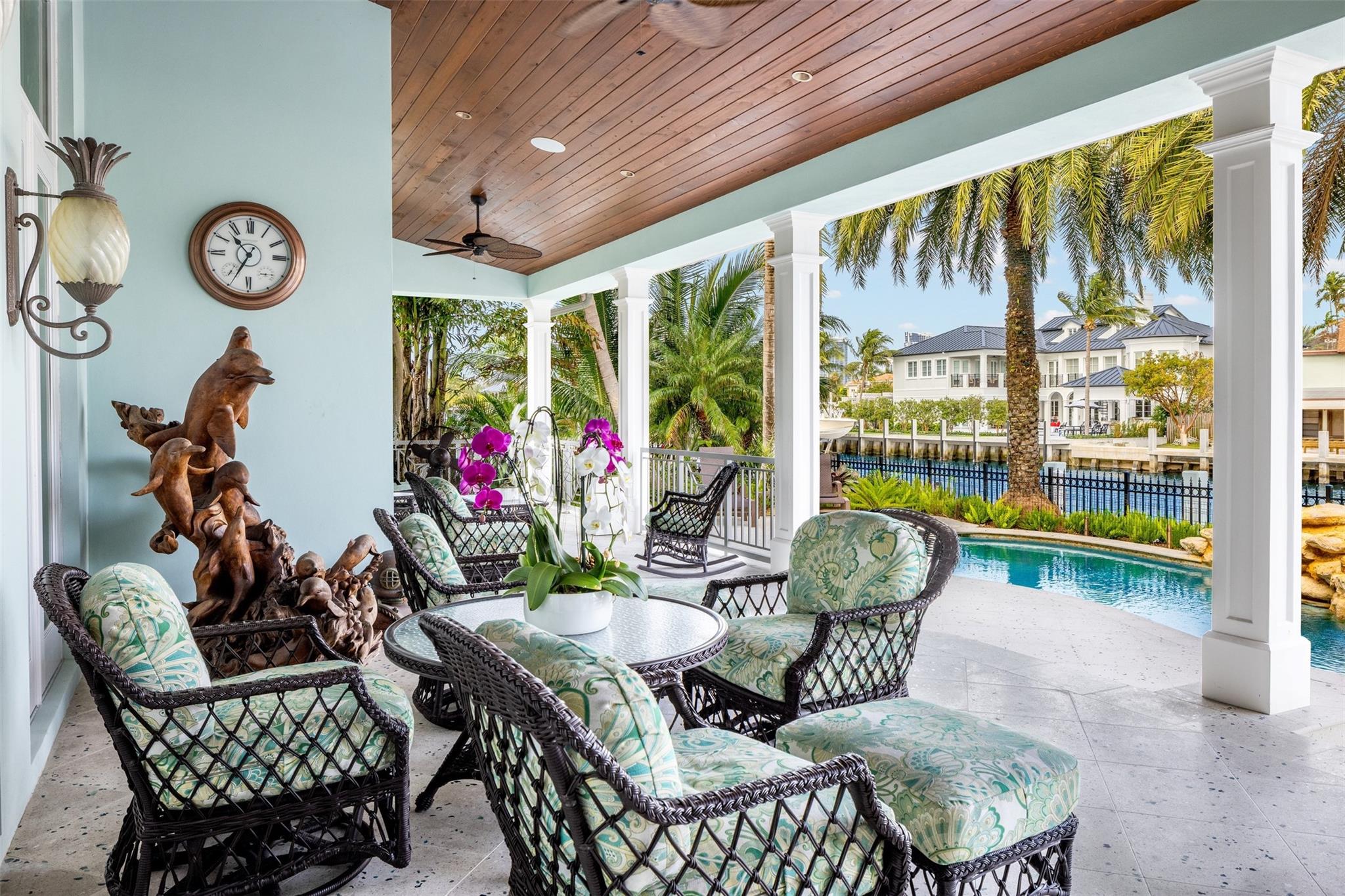 Embrace unparalleled sophistication in this meticulously crafted Rio Vista Isles waterfront estate, built to exacting standards. Featuring 7 beds, 6.5 baths and 120′ of prime WF, it is only minutes away from the inlet, catering effortlessly to the avid boater. Its timeless Key West architecture harmonizes with lush landscaping for privacy, while offering stunning Intracoastal Waterway views. Inside, find stunning stained glass windows, an elevator, 700-bottle wine room, & 2 downstairs VIP suites. The upstairs oversized primary suite boasts a yoga room, private balcony, and dual spa-like bathrooms with connected shower. Outside, find a tropical pool with cascading waterfall & spa, a vast covered veranda, & 45 KW whole-home generator. No expense has been spared in this Rio Vista masterpiece!