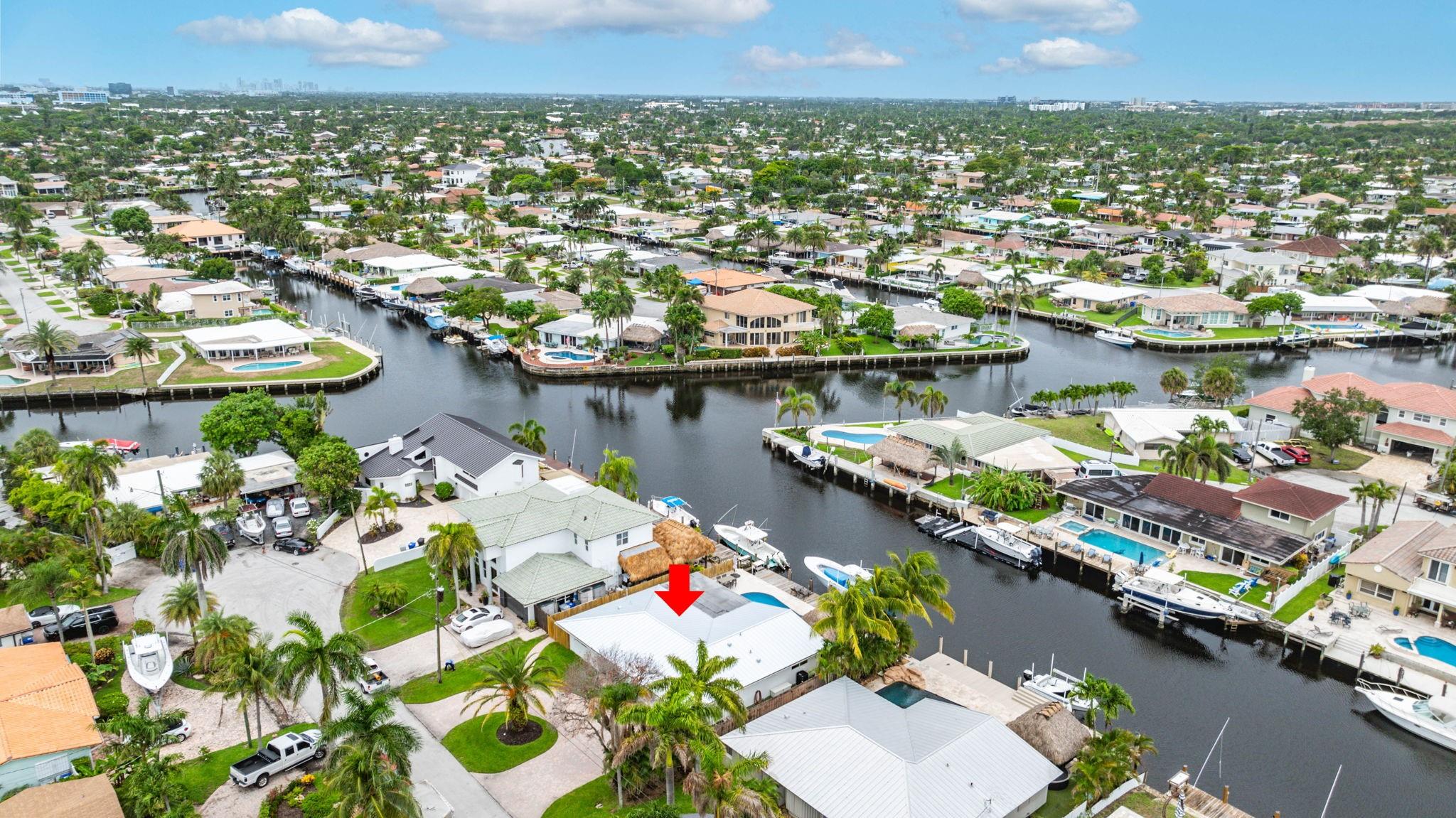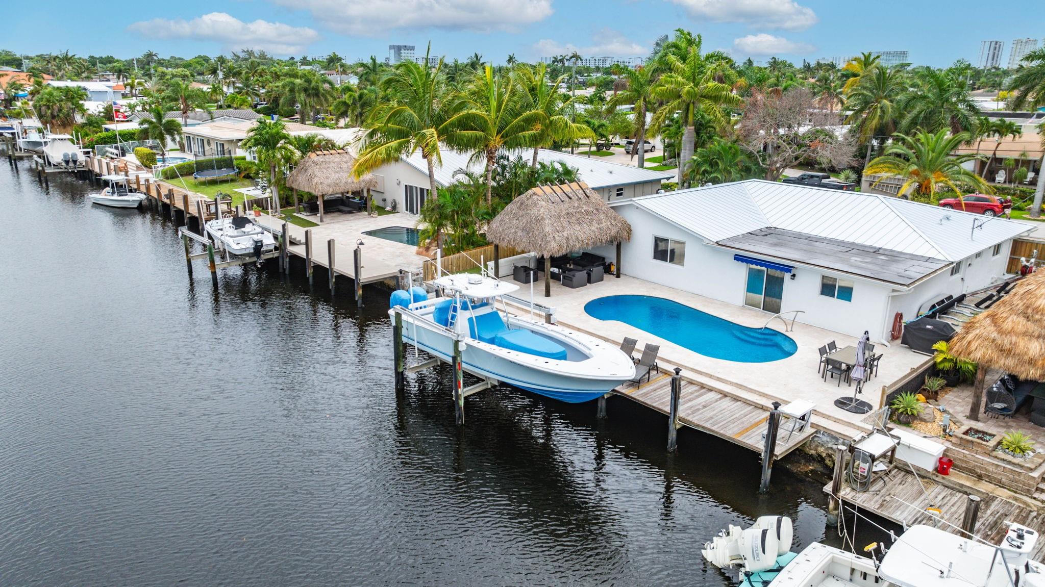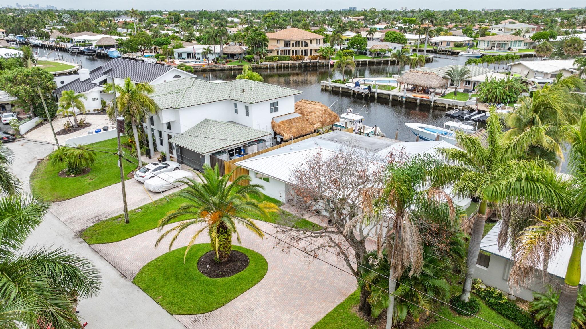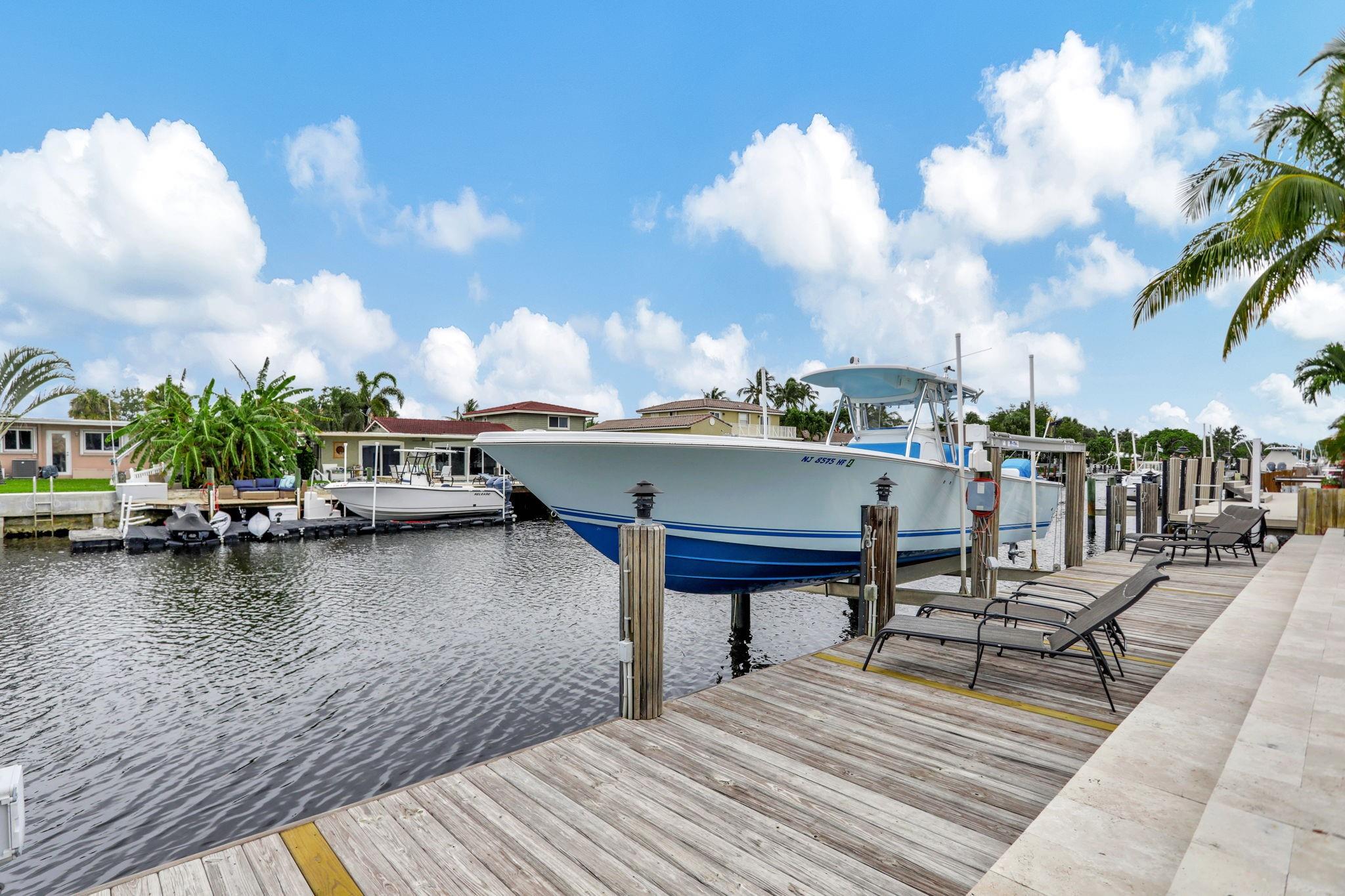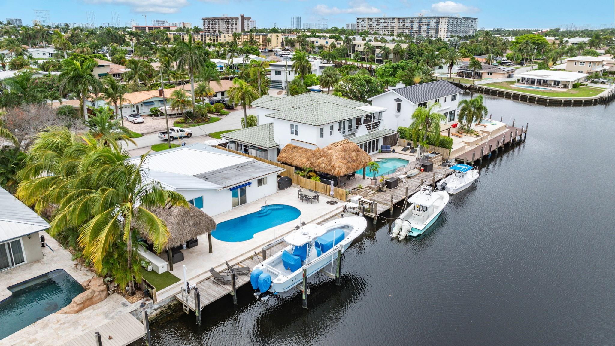 Spacious 3/2 SPLIT floor plan with 2 CAR GARAGE Living room AND den. One fixed bridge (Federal highway) Located at the end of the street near cul-de-sac. Master has walk in closet and updated bath. NEW METAL ROOF, STUCCO AND PAINT 2024. Flat roof 4 years old. Other recent updates include IMPACT WINDOWS and DOORS, Electric, A/C, POOL-piles-travertine pavers, washer-dryer, updated guest bath AND Pipelining 2016 with warranty. SALTWATER POOL has HEATER and CHILLER. Tankless water heater (2022). Enjoy the view or watch tv from under the Tiki Hut. Shower off before hopping in the pool with the outdoor shower. Newer dock and boat 12,000 lb. boat lift(2017)