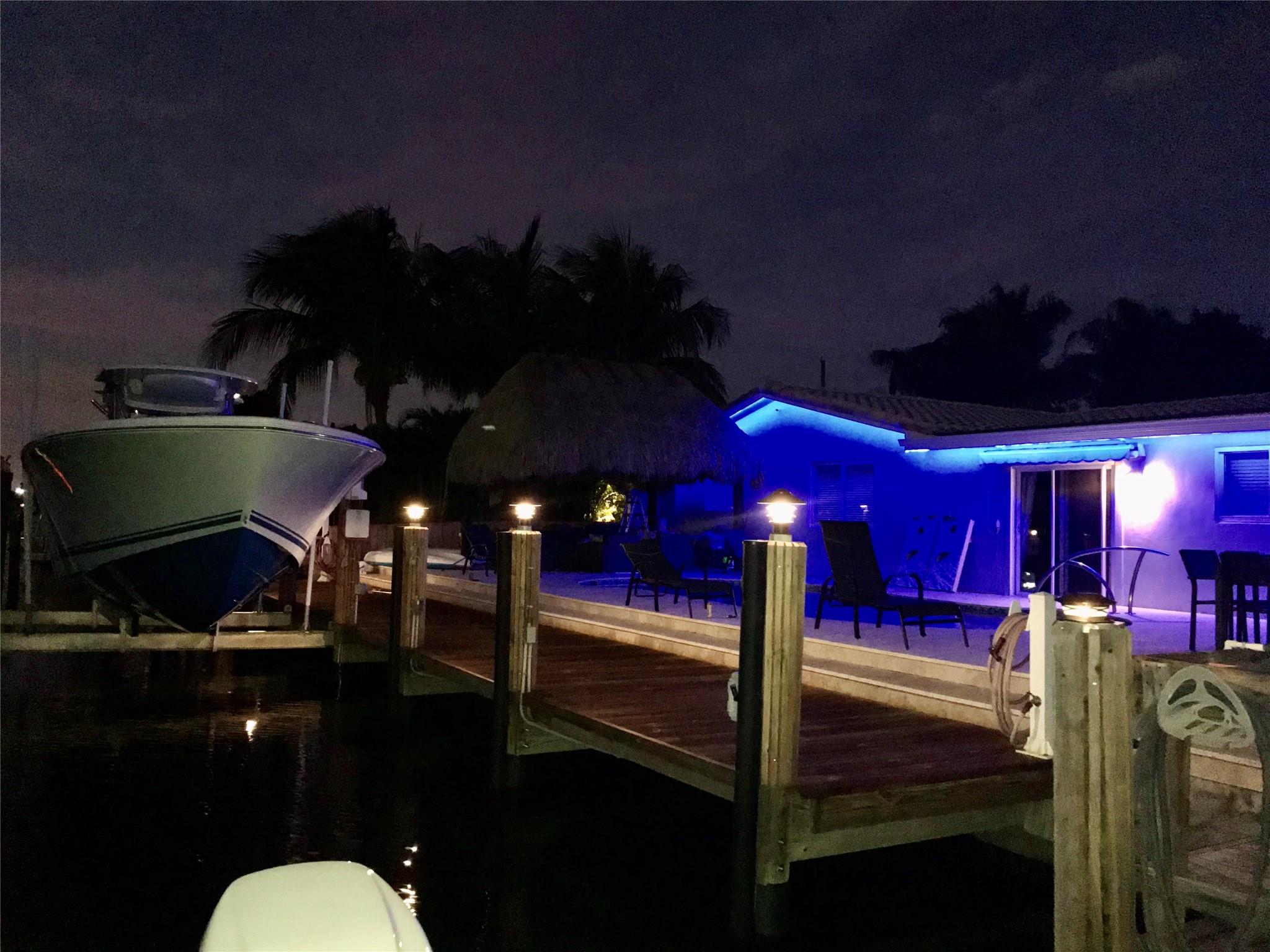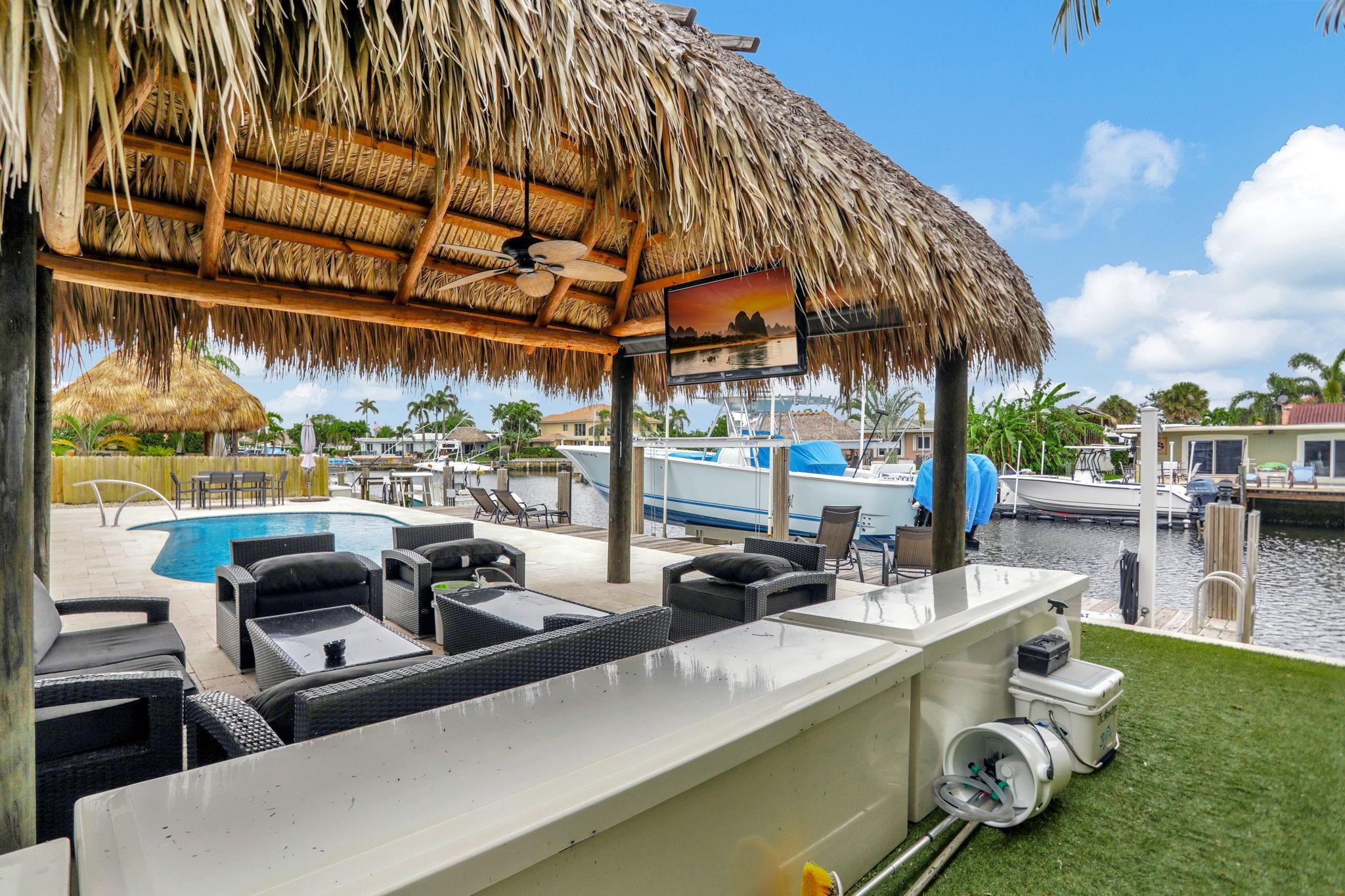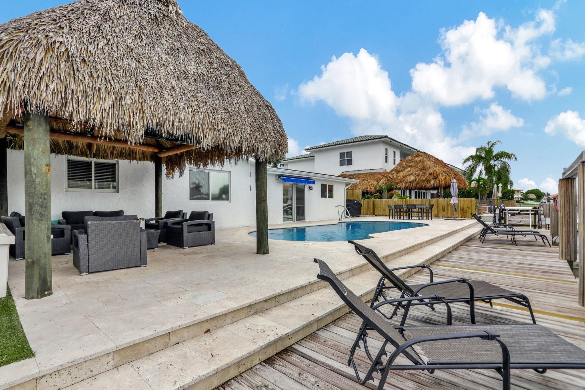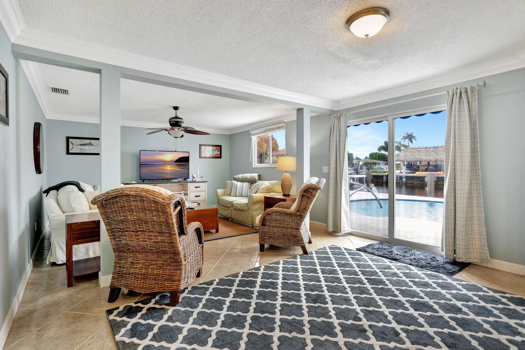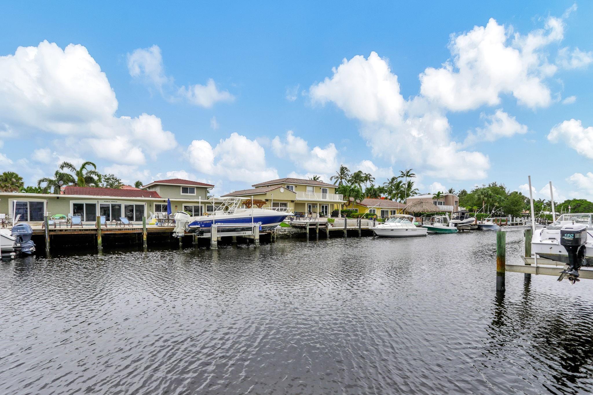 Spacious 3/2 SPLIT floor plan with 2 CAR GARAGE Living room AND den. One fixed bridge (Federal highway) Located at the end of the street near cul-de-sac. Master has walk in closet and updated bath. NEW METAL ROOF, STUCCO AND PAINT 2024. Flat roof 4 years old. Other recent updates include IMPACT WINDOWS and DOORS, Electric, A/C, POOL-piles-travertine pavers, washer-dryer, updated guest bath AND Pipelining 2016 with warranty. SALTWATER POOL has HEATER and CHILLER. Tankless water heater (2022). Enjoy the view or watch tv from under the Tiki Hut. Shower off before hopping in the pool with the outdoor shower. Newer dock and boat 12,000 lb. boat lift(2017)
