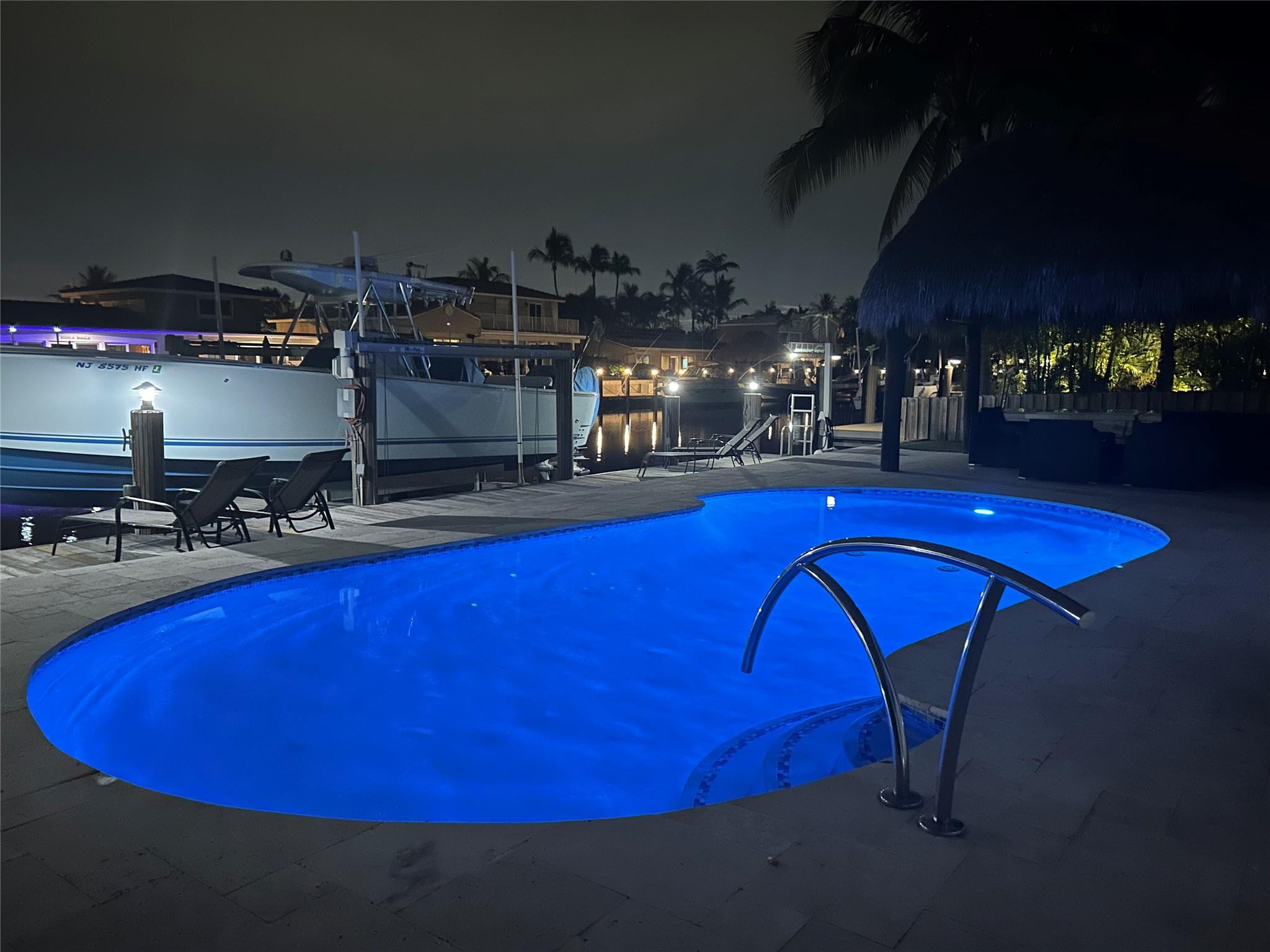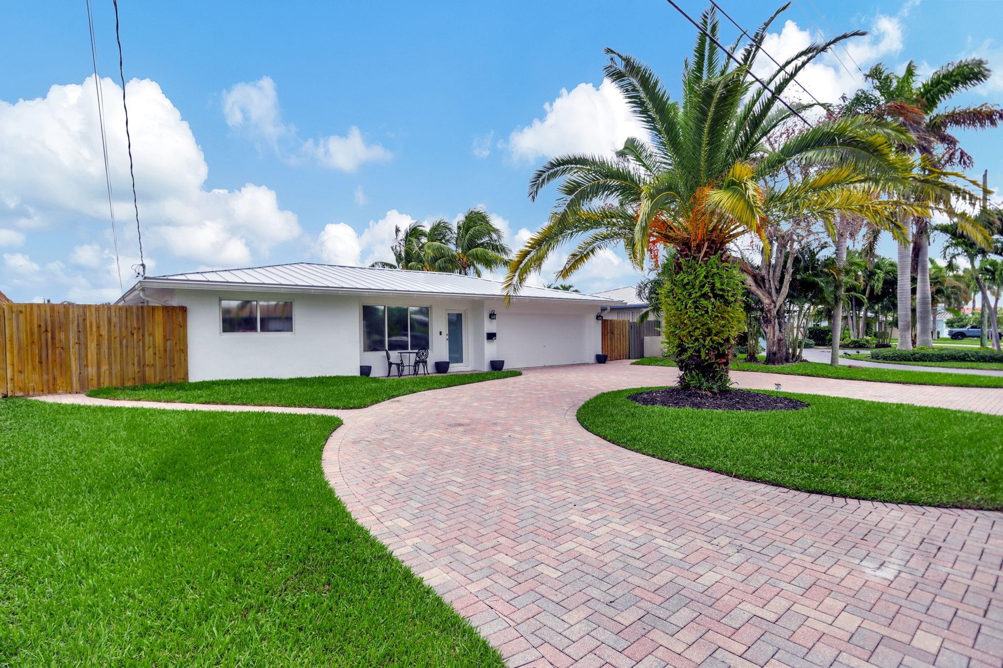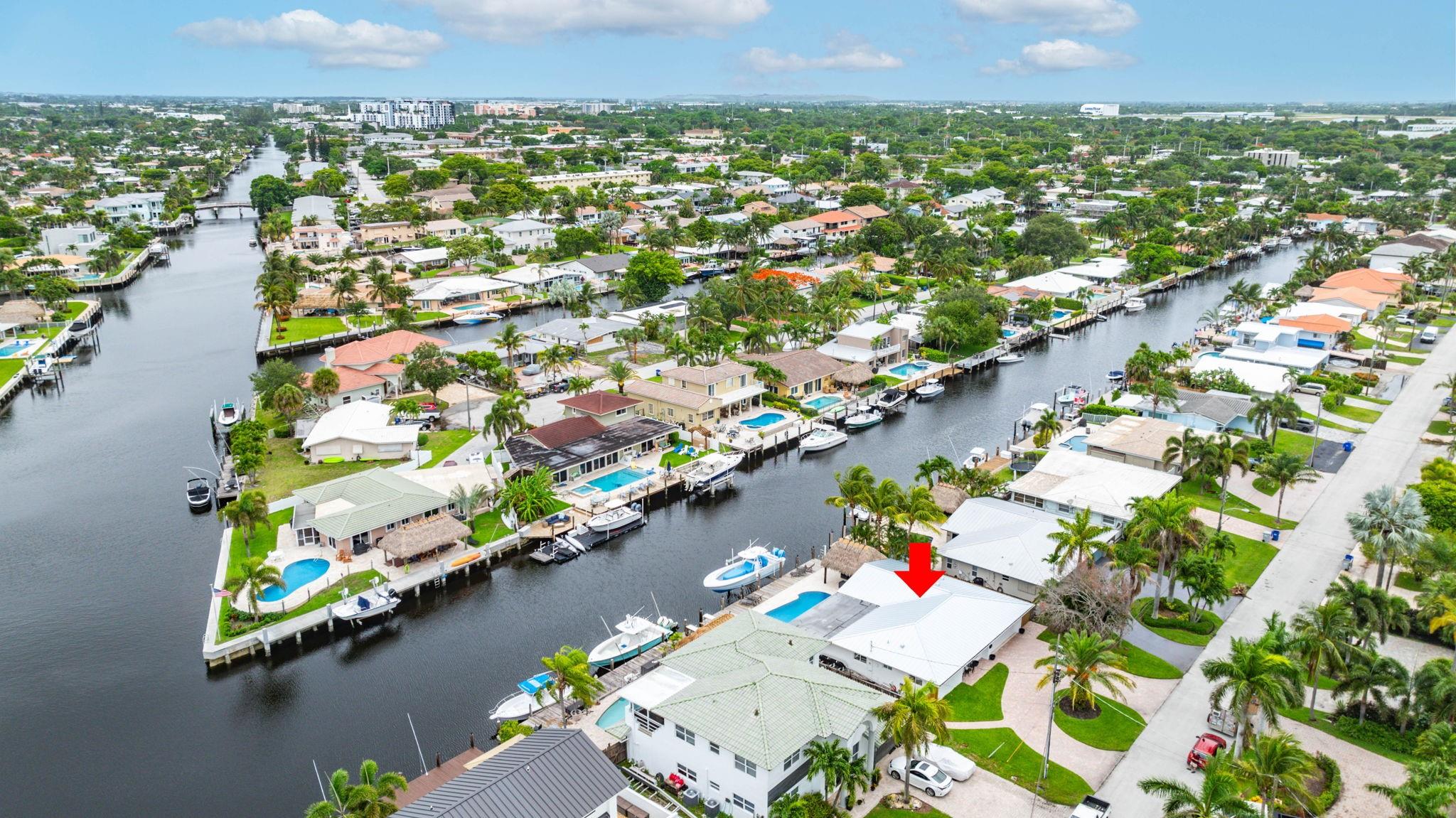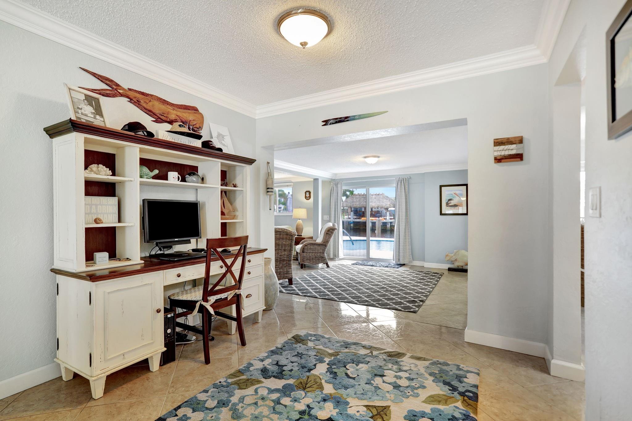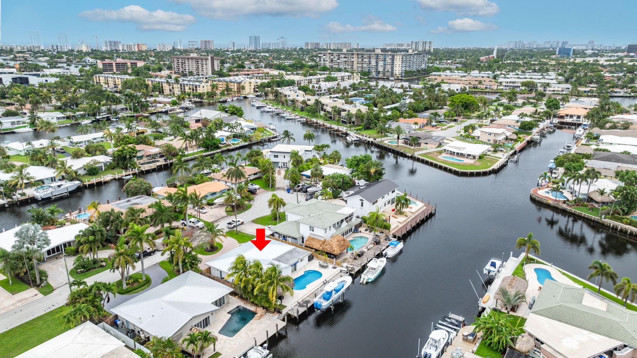 Spacious 3/2 SPLIT floor plan with 2 CAR GARAGE Living room AND den. One fixed bridge (Federal highway) Located at the end of the street near cul-de-sac. Master has walk in closet and updated bath. NEW METAL ROOF, STUCCO AND PAINT 2024. Flat roof 4 years old. Other recent updates include IMPACT WINDOWS and DOORS, Electric, A/C, POOL-piles-travertine pavers, washer-dryer, updated guest bath AND Pipelining 2016 with warranty. SALTWATER POOL has HEATER and CHILLER. Tankless water heater (2022). Enjoy the view or watch tv from under the Tiki Hut. Shower off before hopping in the pool with the outdoor shower. Newer dock and boat 12,000 lb. boat lift(2017)