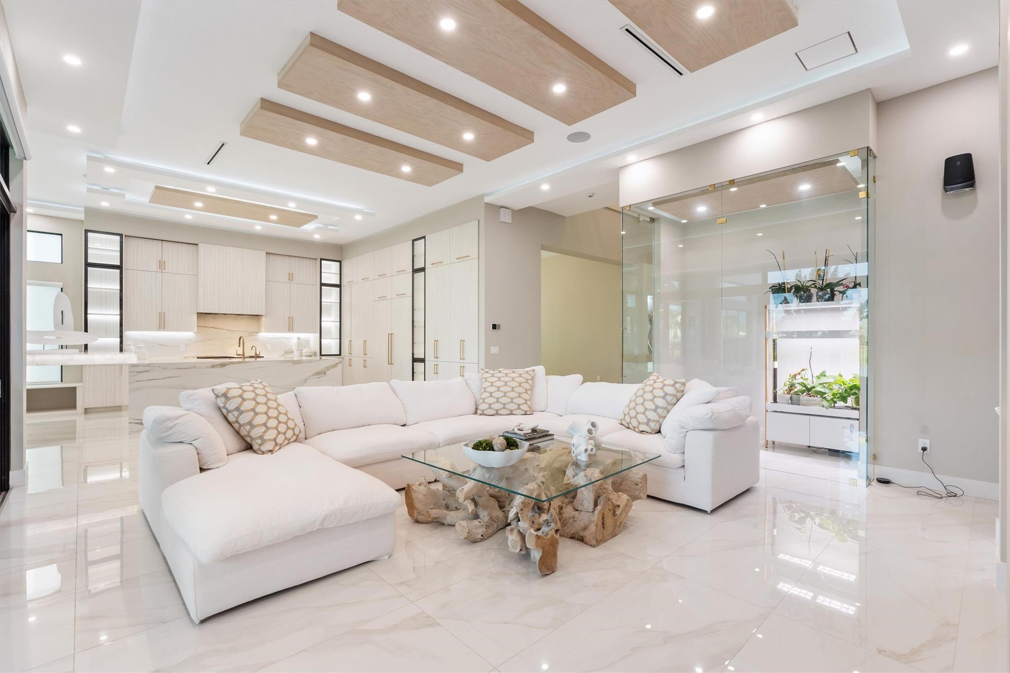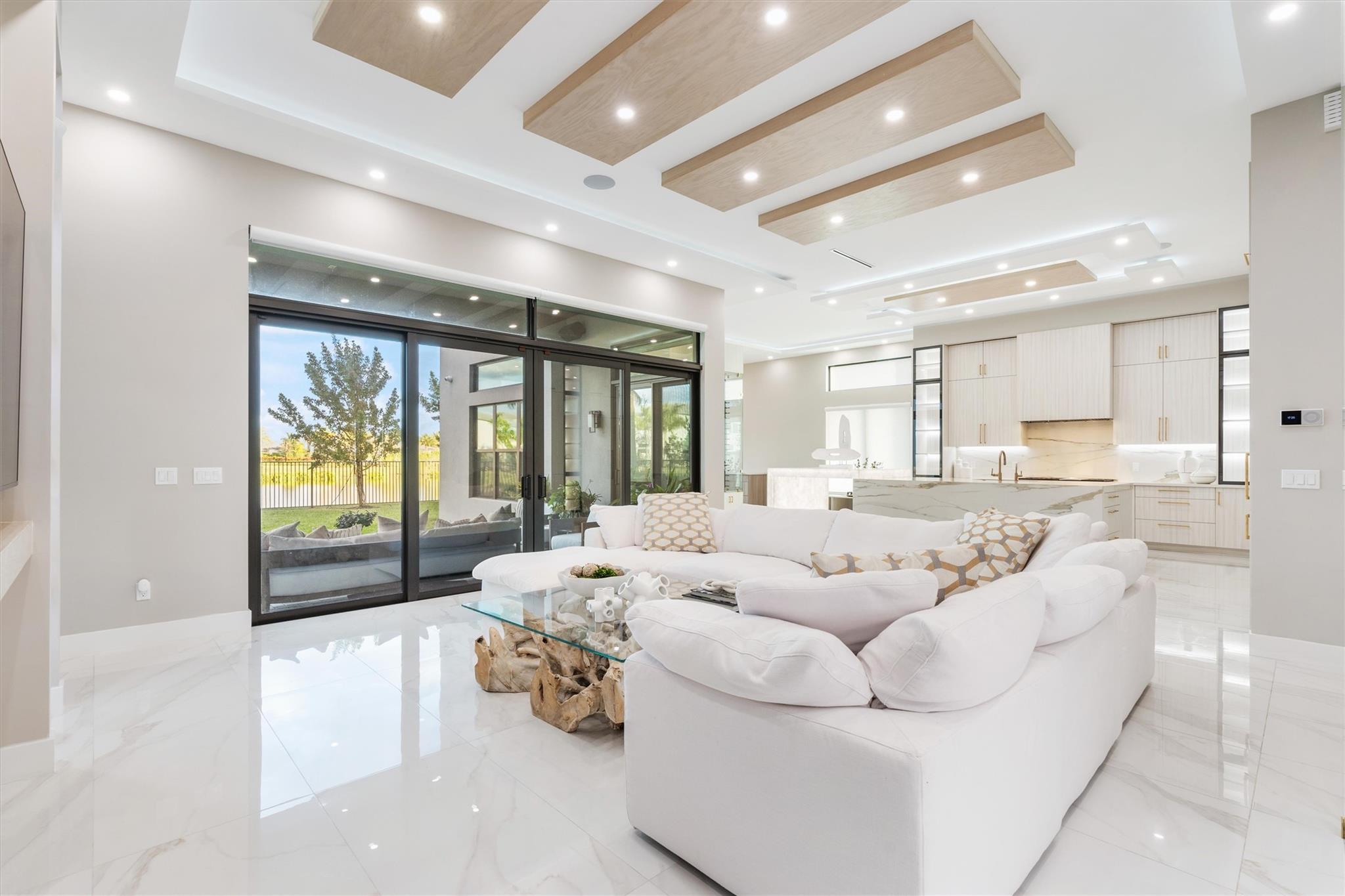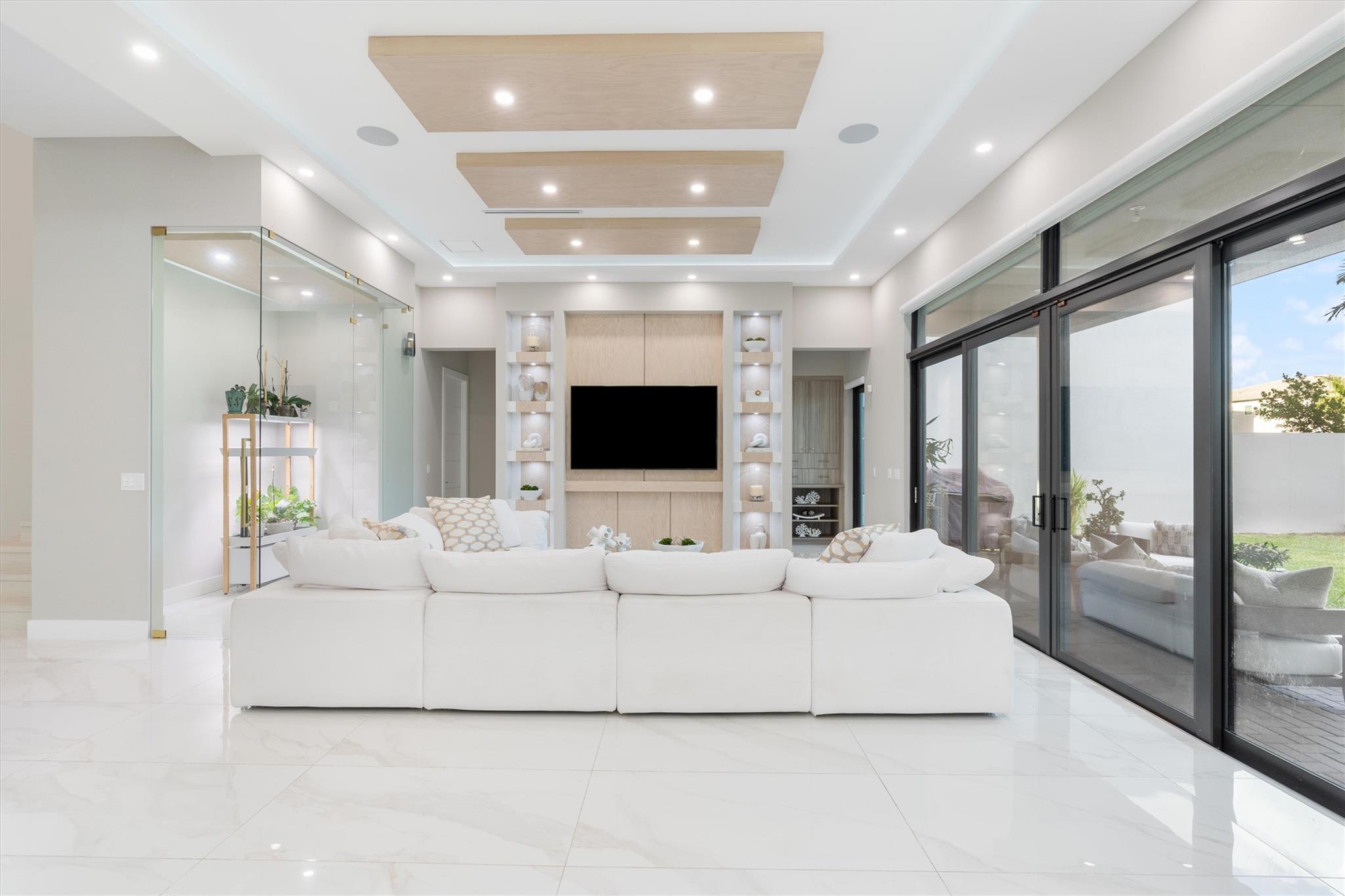 compliments the open floorplan, creating a elegant living space. The gourmet kitchen offers Sub-Zero & Wolf appliances, porcelain countertops, Cristallo Quartzite island are a dream. Brimming with natural light from countless walls of windows, the main living space connects to the covered patio, providing the