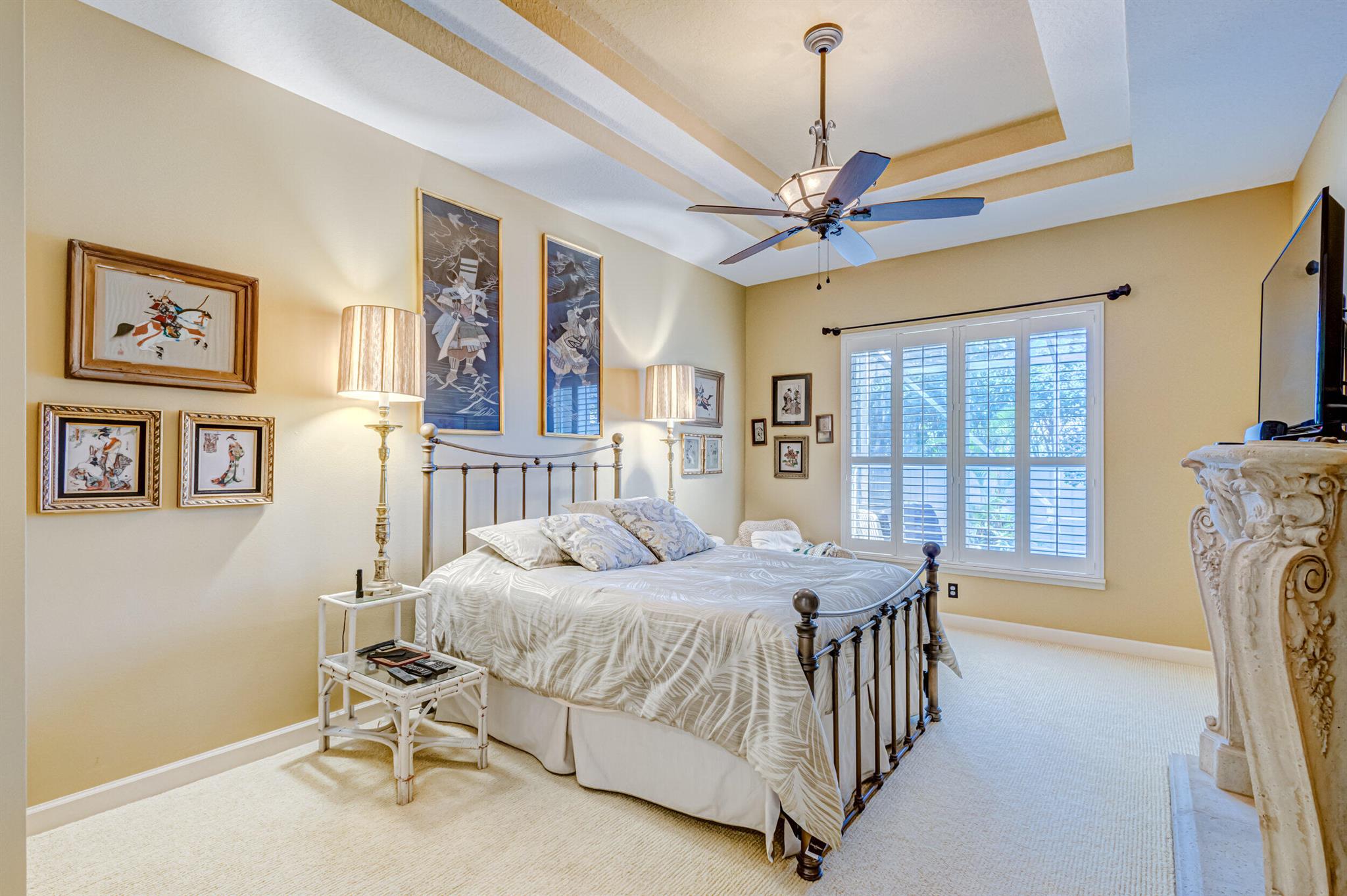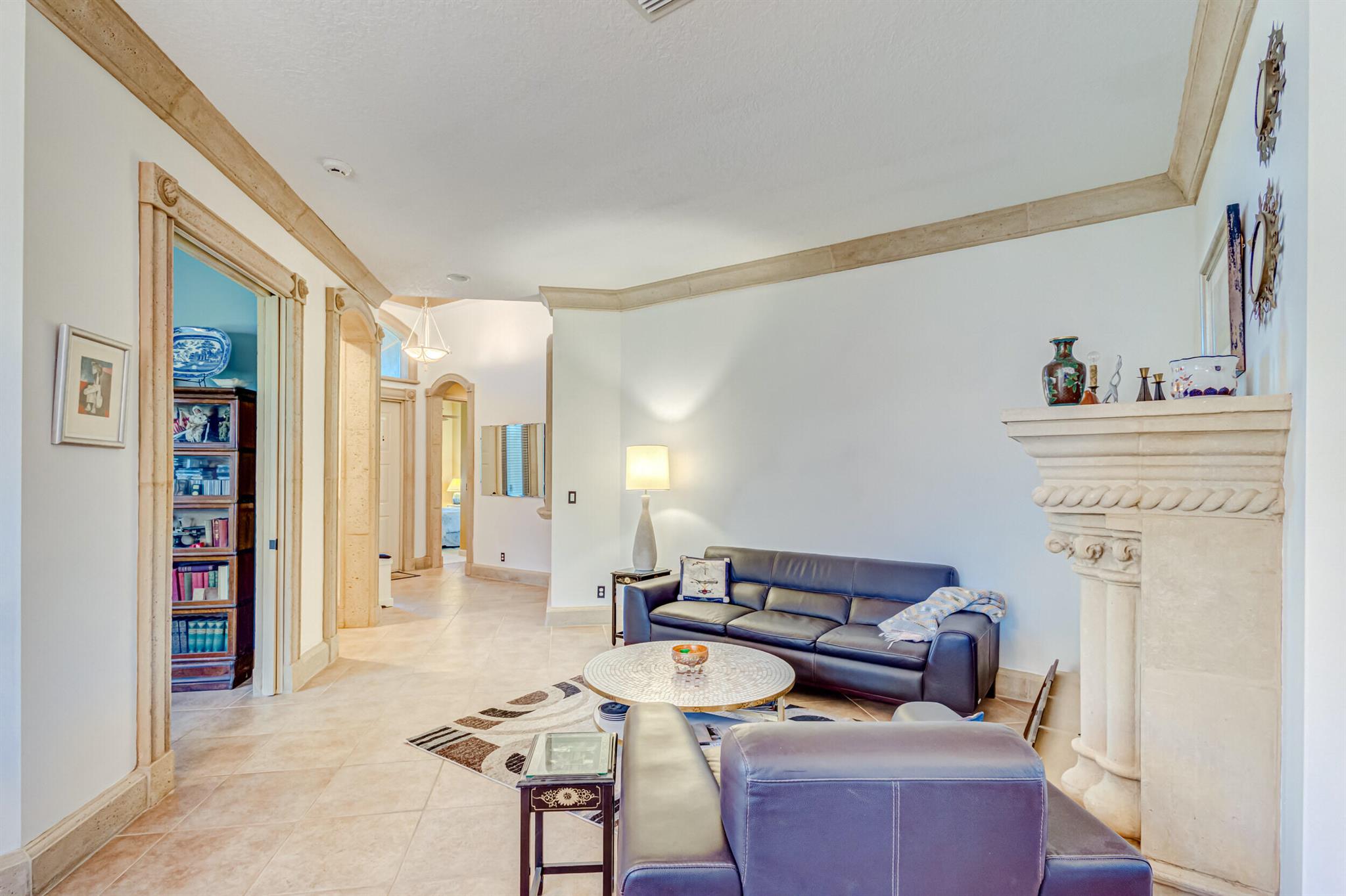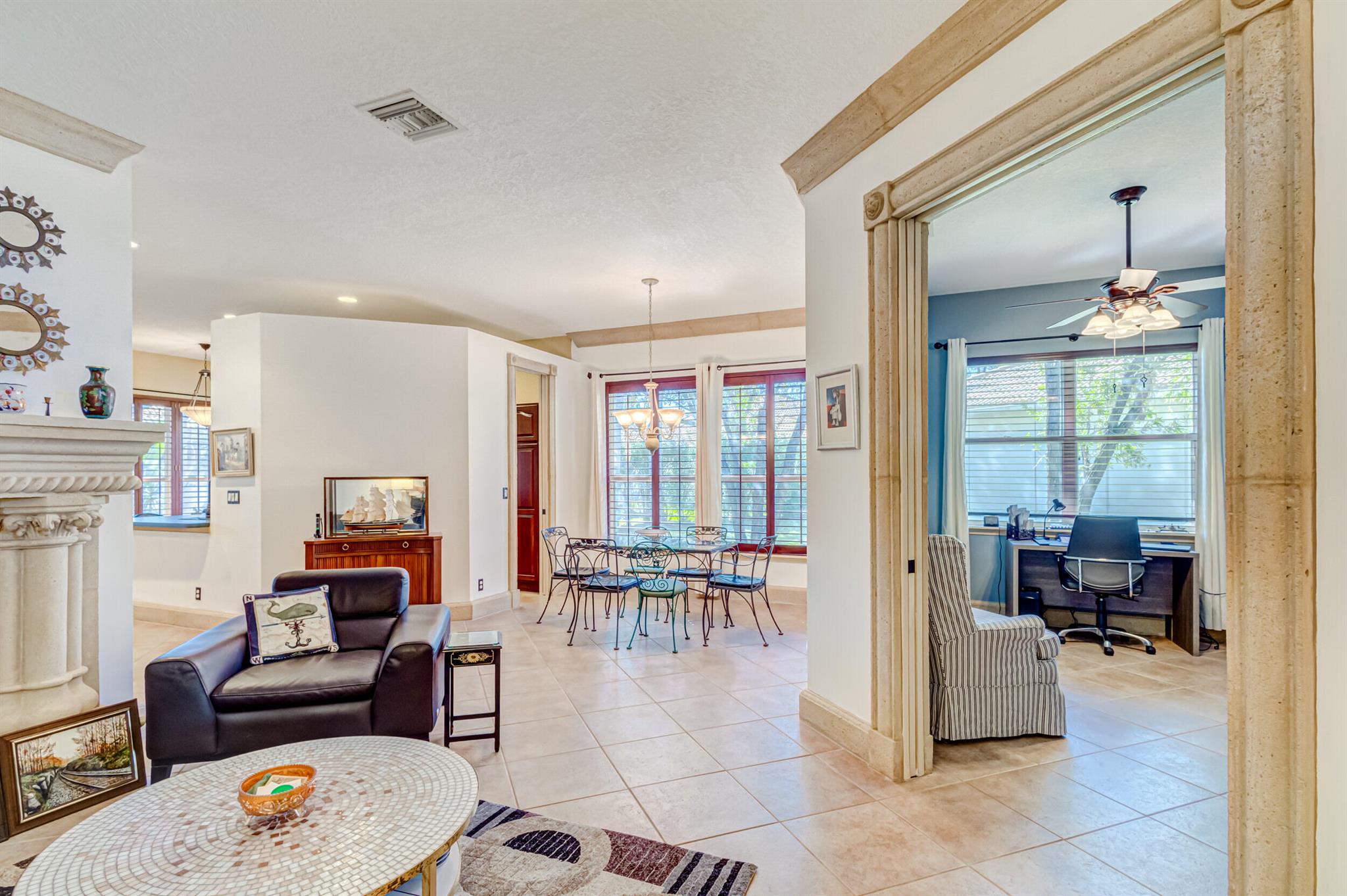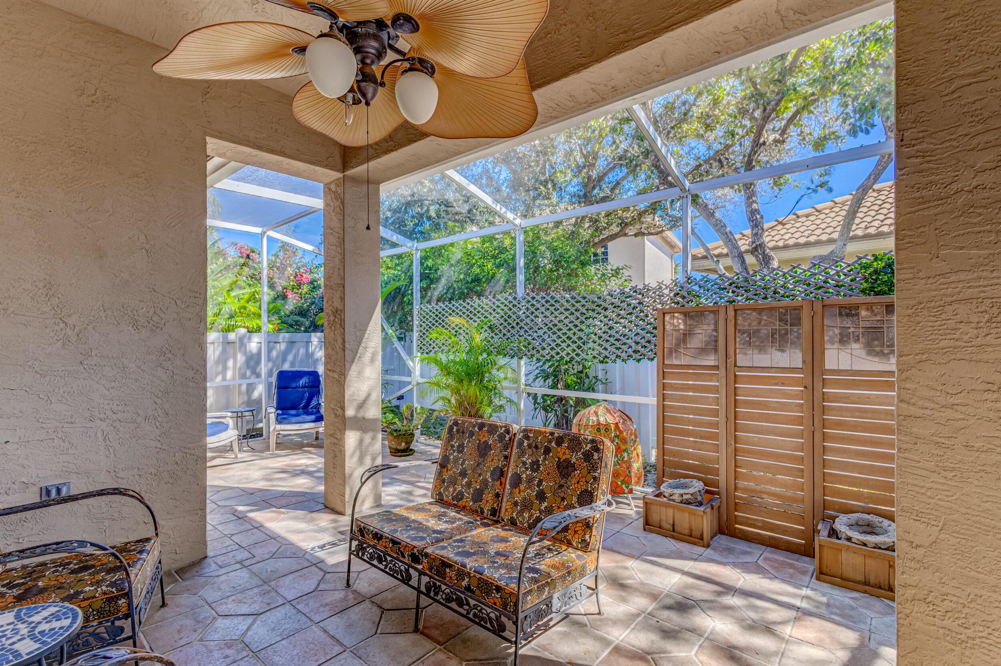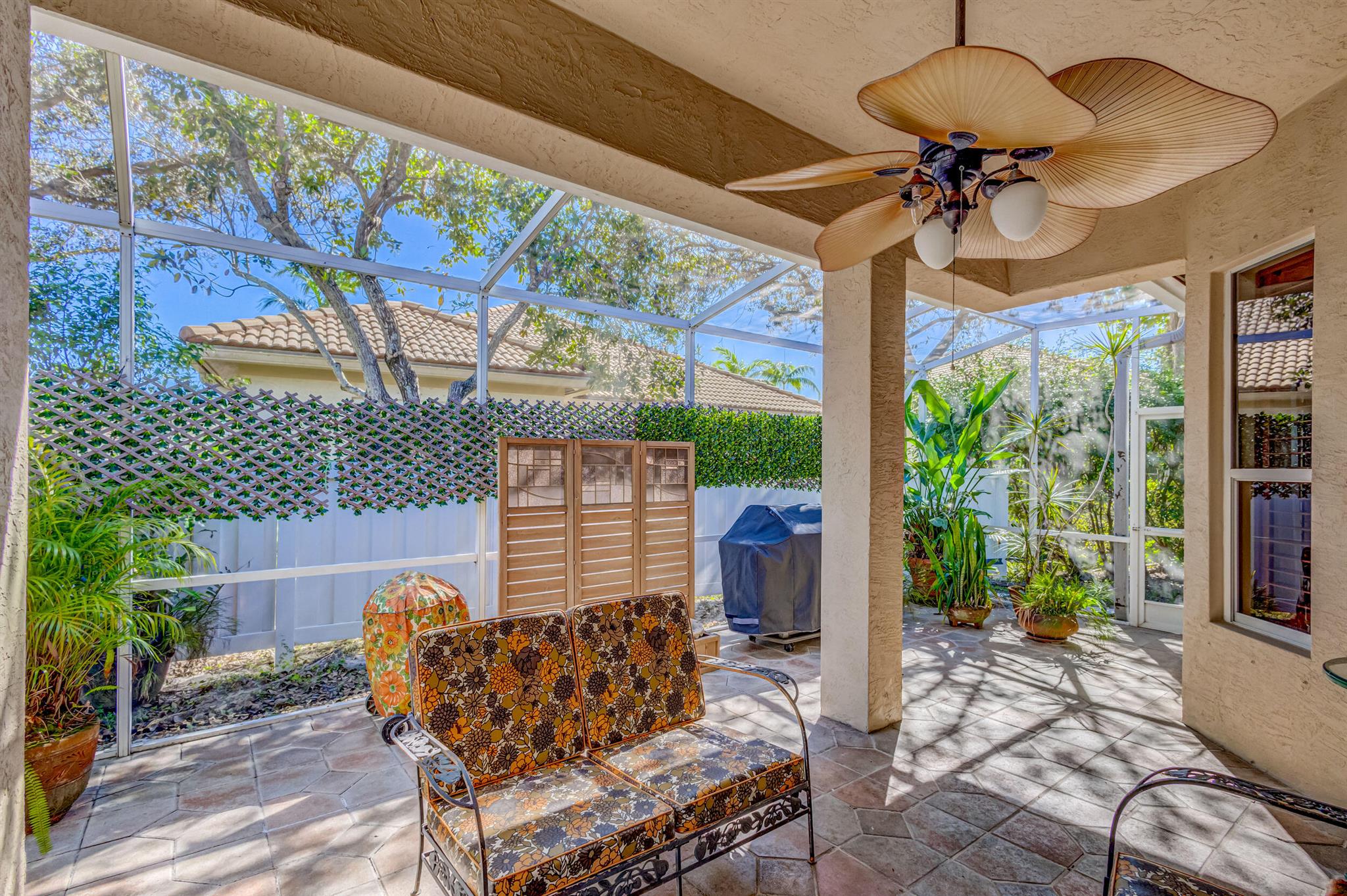 Immaculate single-family home nestled in a quiet cul-de-sac, featuring 2 bedrooms, 2 bathrooms, and a 2-car garage with a den adorned with exquisite cement molding. The well-designed layout includes split bedrooms and well maintained kitchen open up to the living room space. The master bedroom is spacious and boasts numerous upgrades such as plantation shutters, decorative fireplace, a double tray ceiling, and expansive double walk-in closets. The property sits on a larger lot with a generous side yard. Enjoy outdoor living on the huge lanai in the back for your morning tea and coffee. Not to mention this desirable guard gated Community includes lawn care, irrigation maintenance, 24/7 staffed gate, monitored home security, Basic CATV, WiFi and Broadband, award winning clubhouse with large