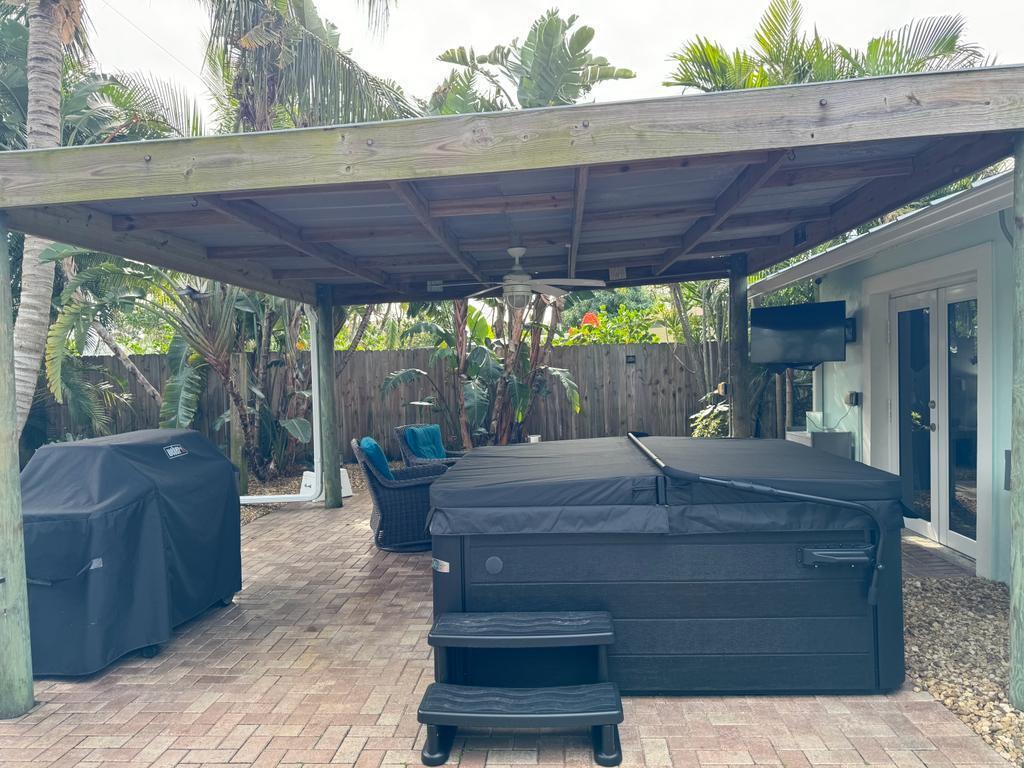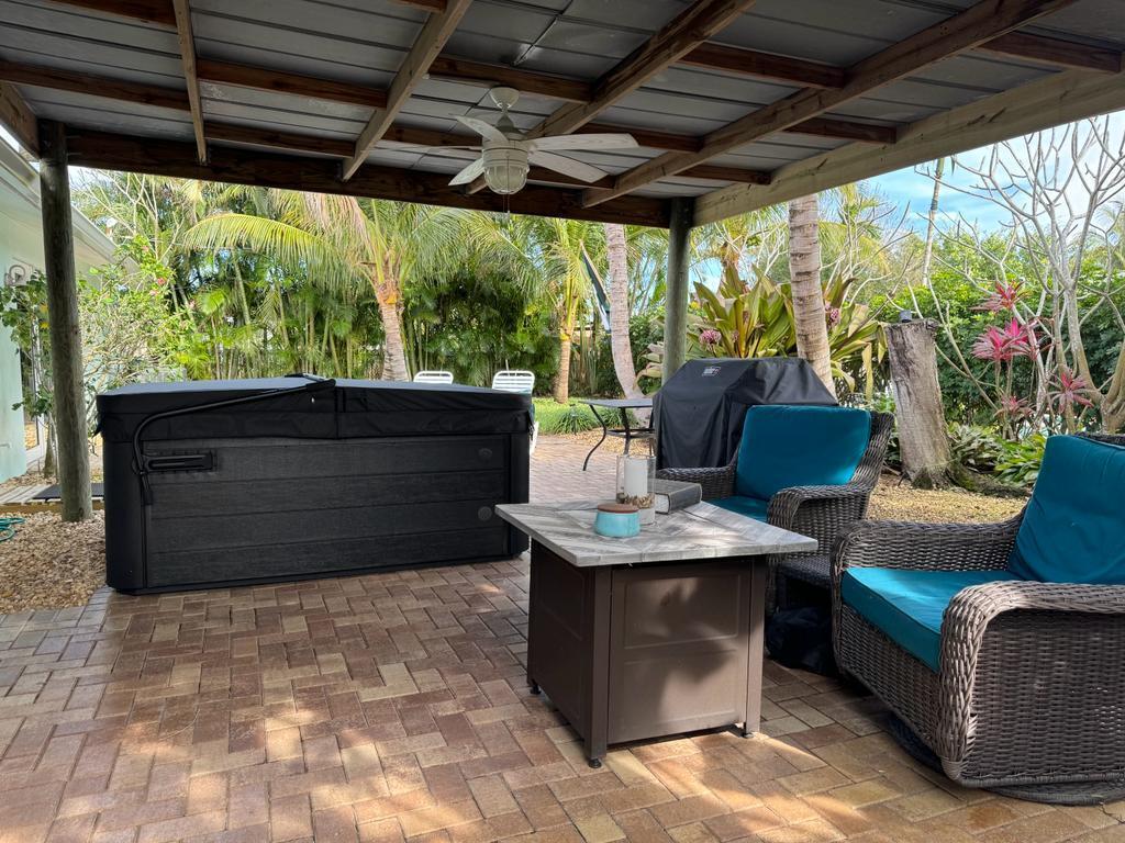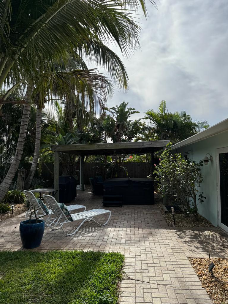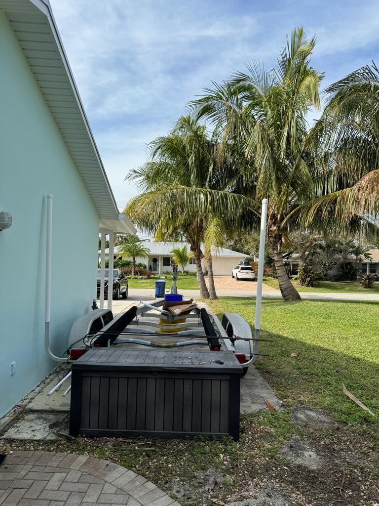 Spacious 2 bedrooms and 2 bathrooms CBS single family home features a new metal roof, installed June 2022, impact windows, newer central air conditioning and water heater. Ceramic tile throughout and vinyl plank flooring in the bedrooms. Granite countertops and stainless-steel appliances. Impact French doors to the backyard. Wired for speakers inside and out. Tropical backyard with room for a pool and large 16 x 16 covered patio. One car garage. Large laundry room. Boat storage on the side of the home is a huge plus. No homeowner’s association. Hot tub included. Minutes to beaches, restaurants and all that Tequesta and Jupiter have to offer.