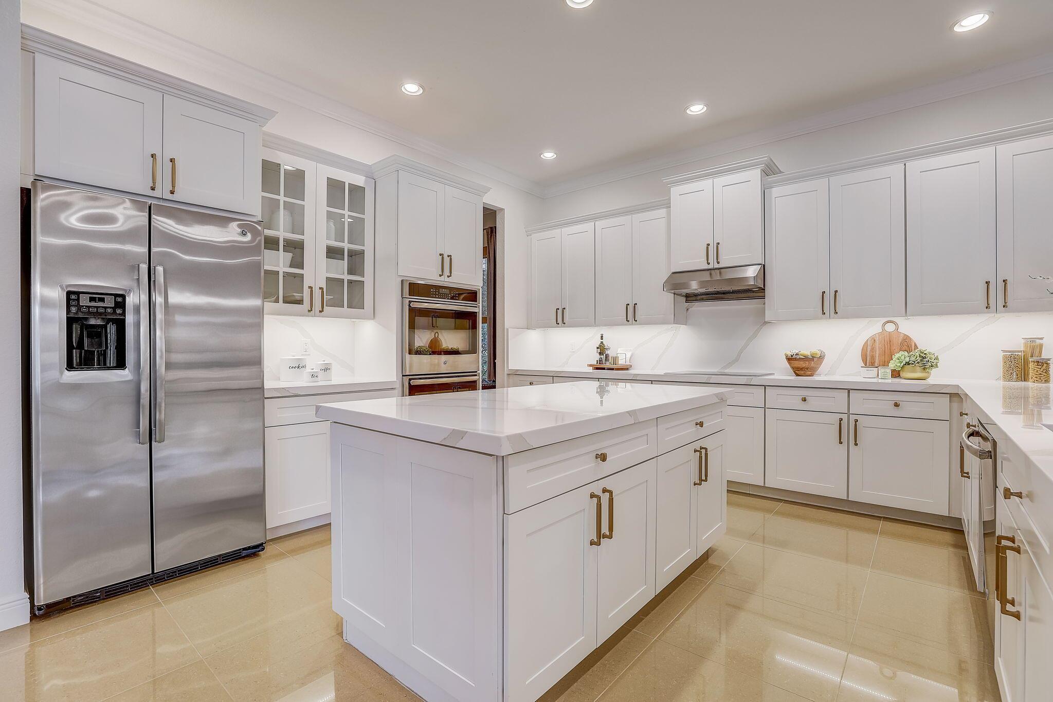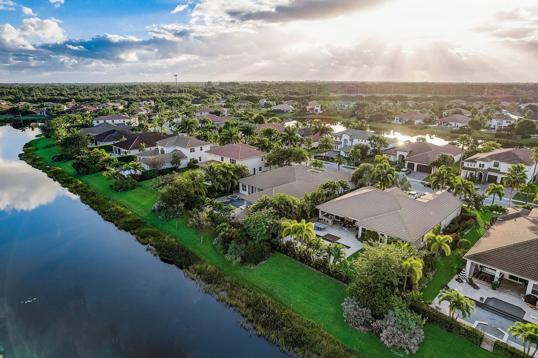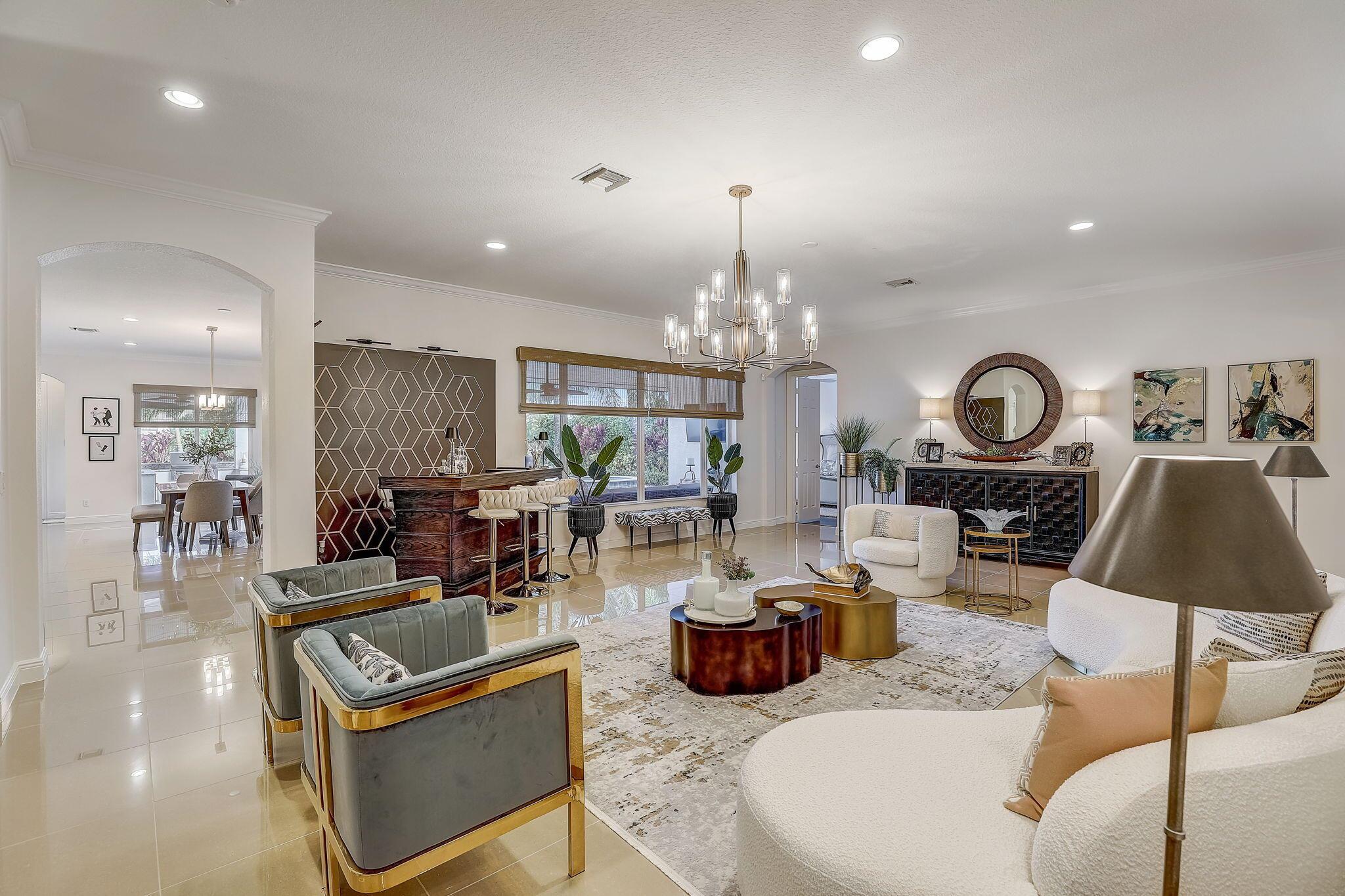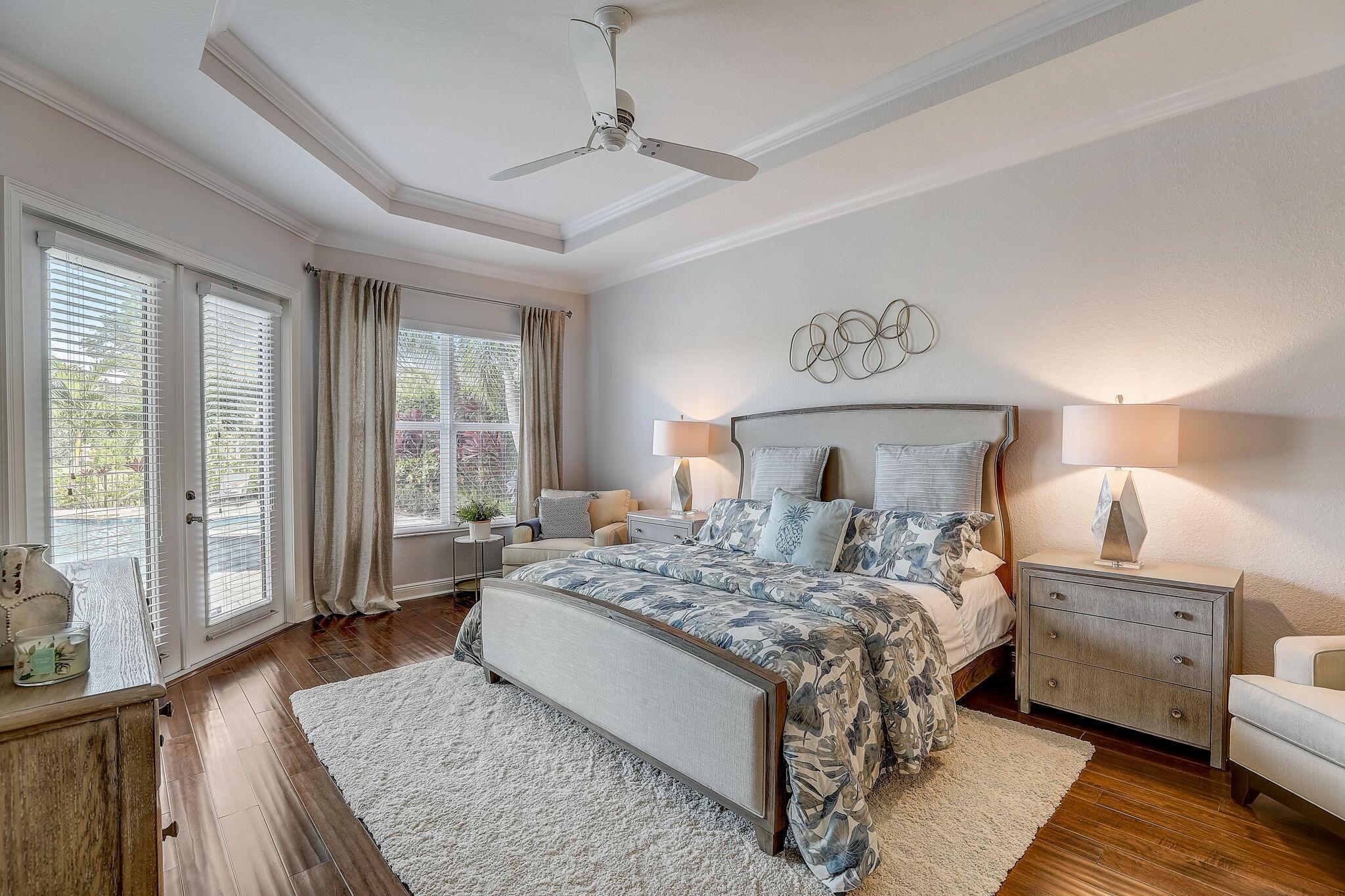 Stunningly elegant contemporary design exudes throughout this 5-bedroom 4-bath lakefront home situated on a .30-acre lot in the gated community of Rialto. Glistening 24-inch porcelain tile flooring in the living areas and wood floors in BRs complimented by crown molding and custom draperies and lighting throughout the living areas. A chef’s dream open kitchen featuring shaker cabinetry, wrap around quartz countertops, center island, and newer Wolf induction cooktop with custom vented hood, SS appliances & double wall ovens overlooking the great room. Hardwood flooring & En-suite bathrooms in 3 of the 5 bedrooms. Luxurious oversized Master bedroom features coffered ceilings 2 walk-in closets with double French doors offering direct access to the lanai & the tranquil spa/pool area.