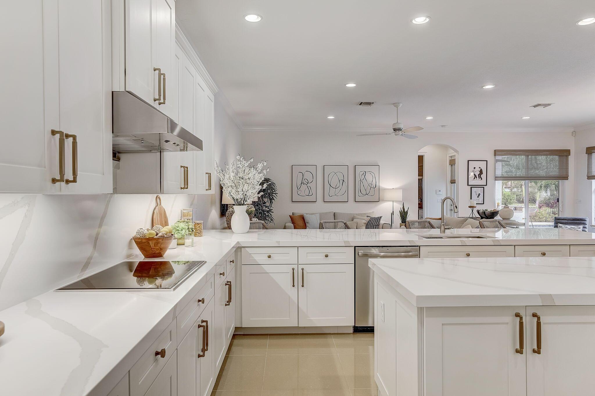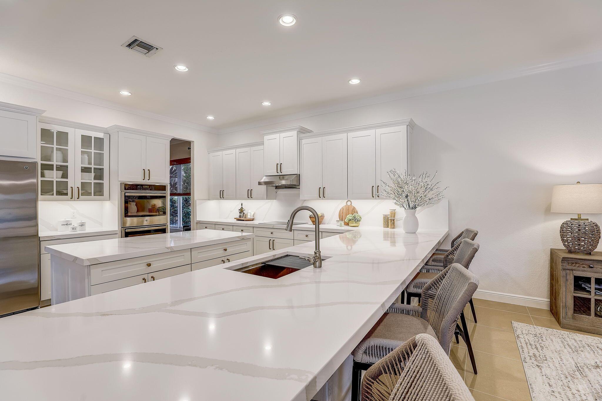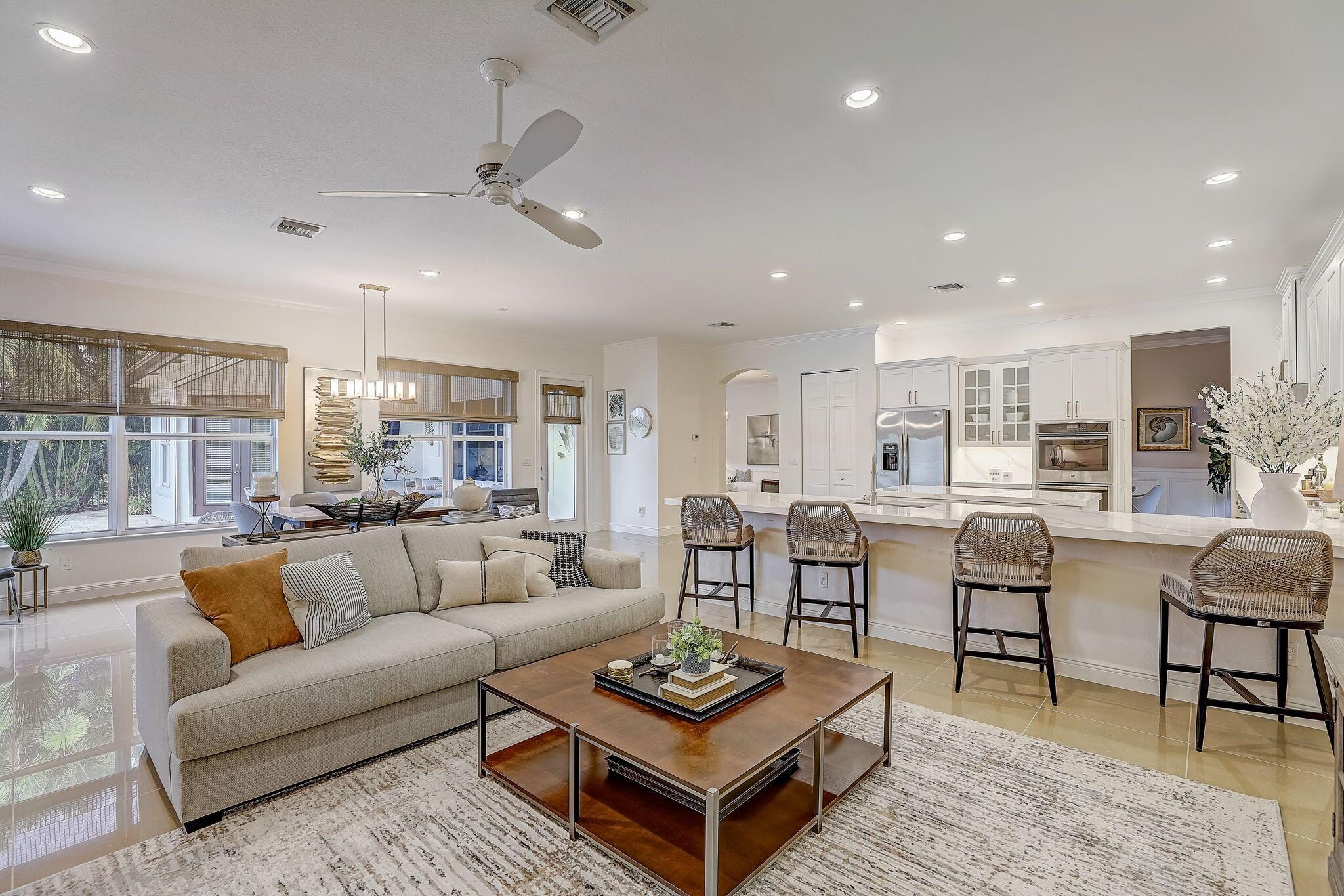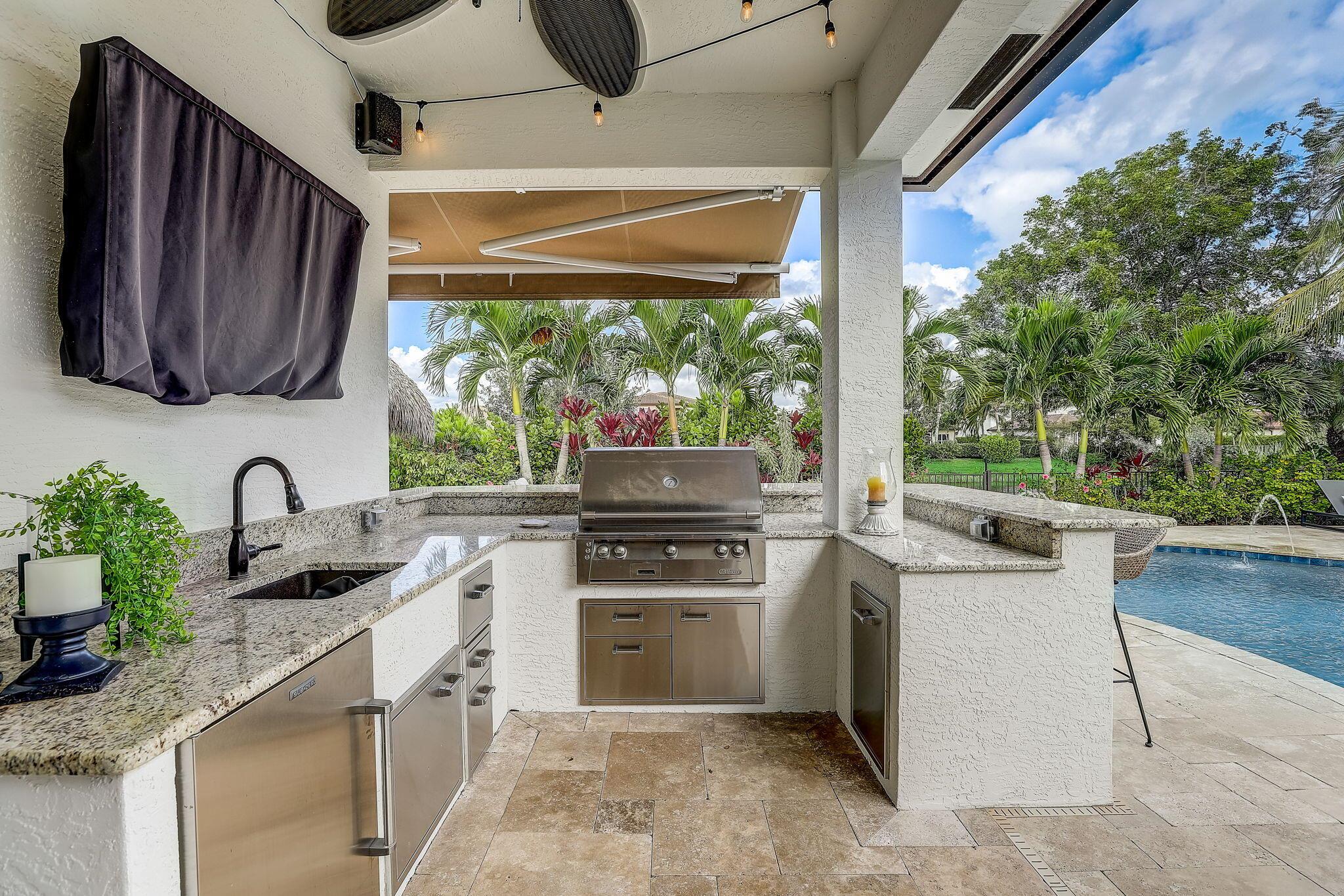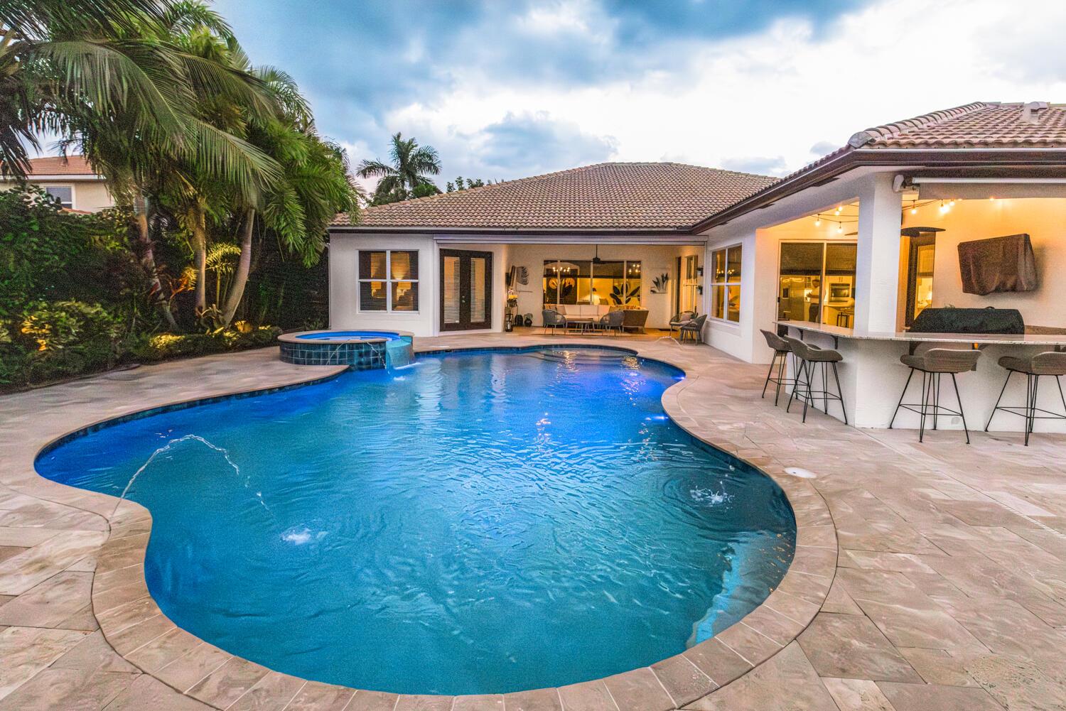 Stunningly elegant contemporary design exudes throughout this 5-bedroom 4-bath lakefront home situated on a .30-acre lot in the gated community of Rialto. Glistening 24-inch porcelain tile flooring in the living areas and wood floors in BRs complimented by crown molding and custom draperies and lighting throughout the living areas. A chef’s dream open kitchen featuring shaker cabinetry, wrap around quartz countertops, center island, and newer Wolf induction cooktop with custom vented hood, SS appliances & double wall ovens overlooking the great room. Hardwood flooring & En-suite bathrooms in 3 of the 5 bedrooms. Luxurious oversized Master bedroom features coffered ceilings 2 walk-in closets with double French doors offering direct access to the lanai & the tranquil spa/pool area.