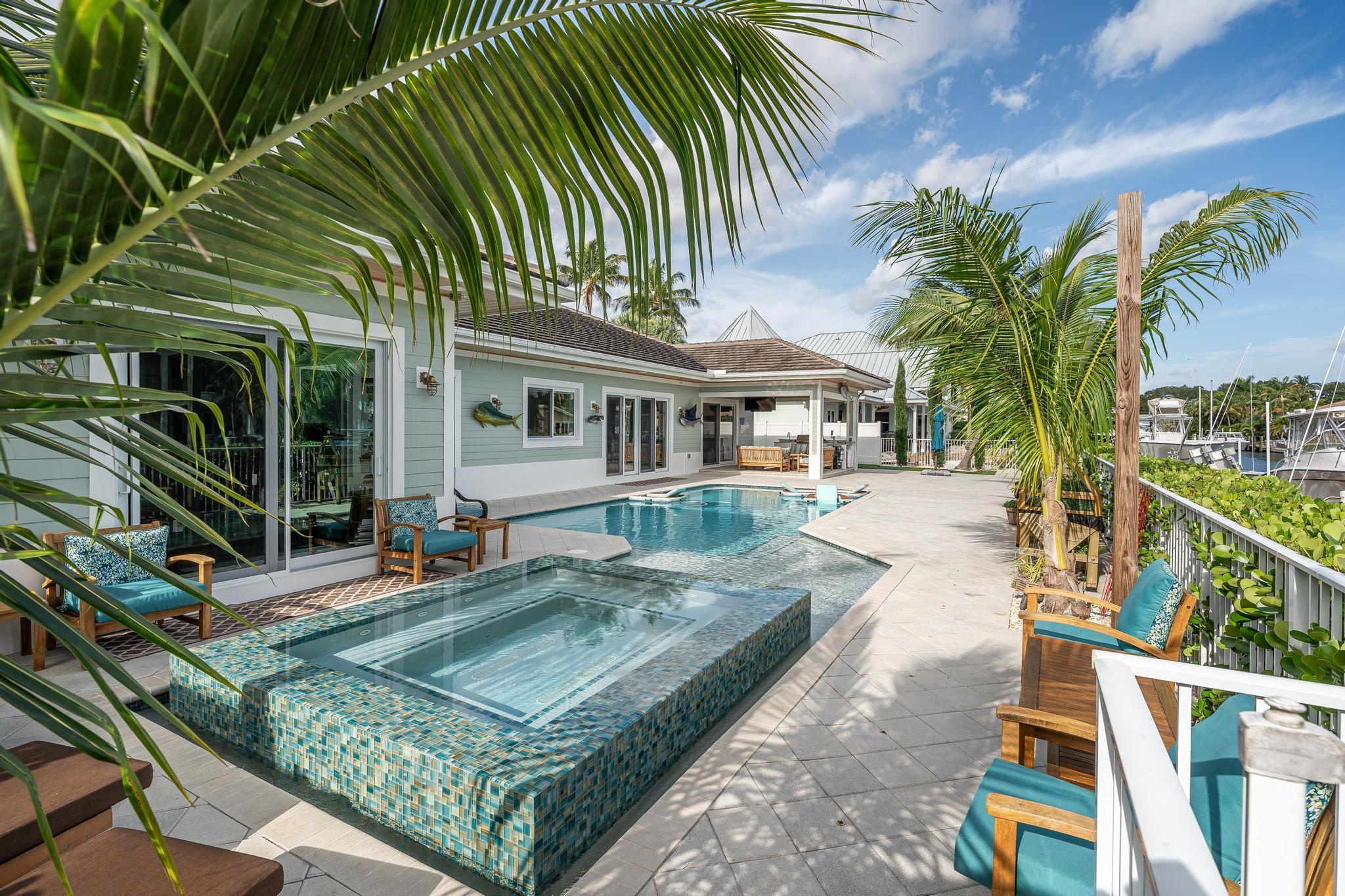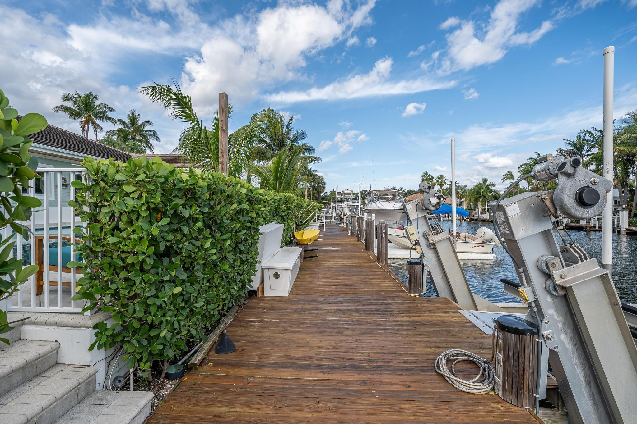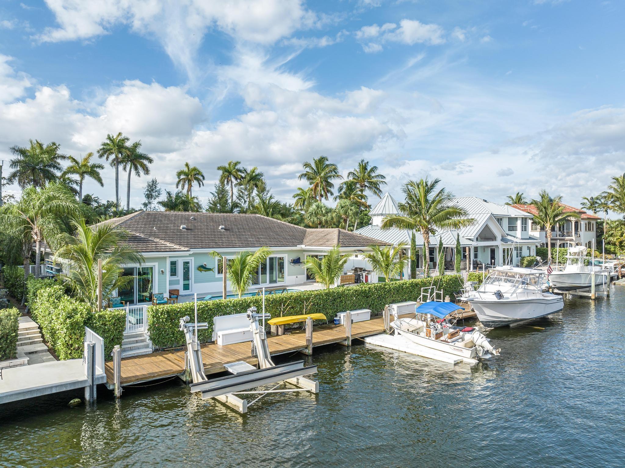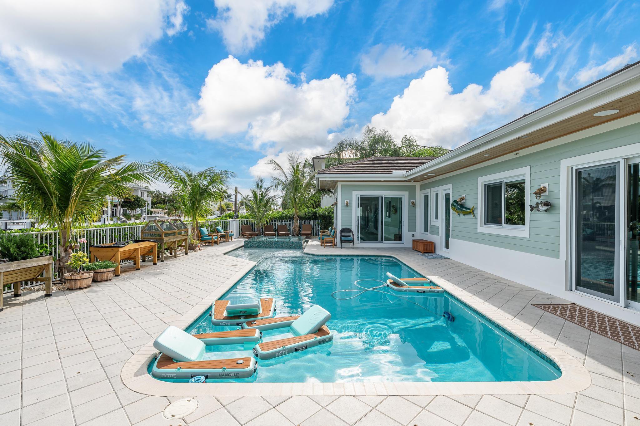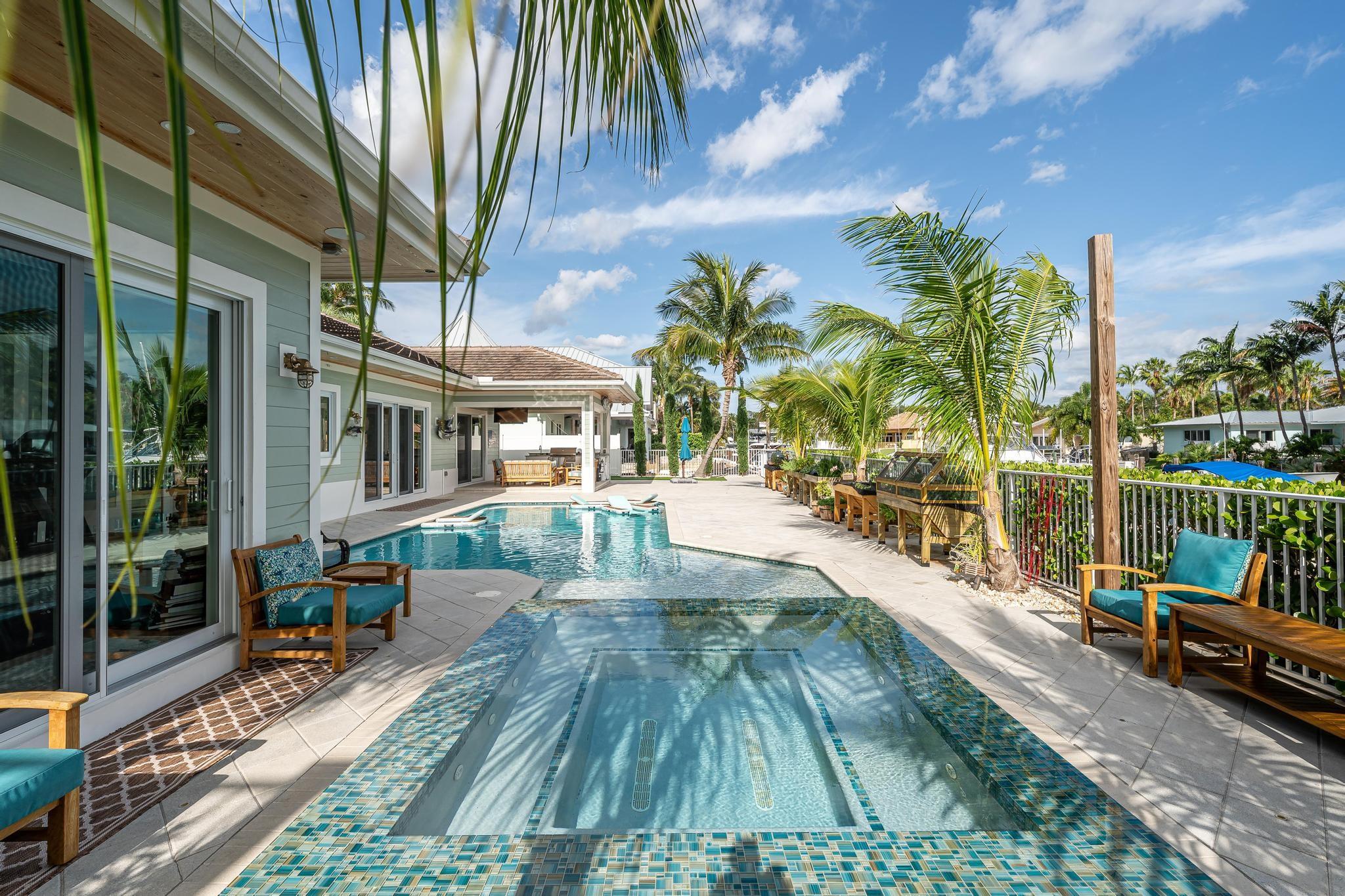 The property boasts a remarkable 110’ of waterfront complete with a private dock and a high-end boat lift. The home is 2940 square feet under air and designed with 10’ high ceilings throughout, creating a spacious and inviting atmosphere. It features 3 large bedrooms and 4 modern bathrooms. The heart of the home is its open floor plan, which beautifully integrates the living, dining, and kitchen areas, perfect for entertaining and family gatherings. The outdoor area is equally impressive, with a covered patio, a relaxing hot tub, and a heated pool. Also equipped with a standby generator with an automatic switch, a water filter and softener system, impact windows and doors with LowE for energy efficiency. Located just 5 minutes from the ocean and with no fixed bridges.