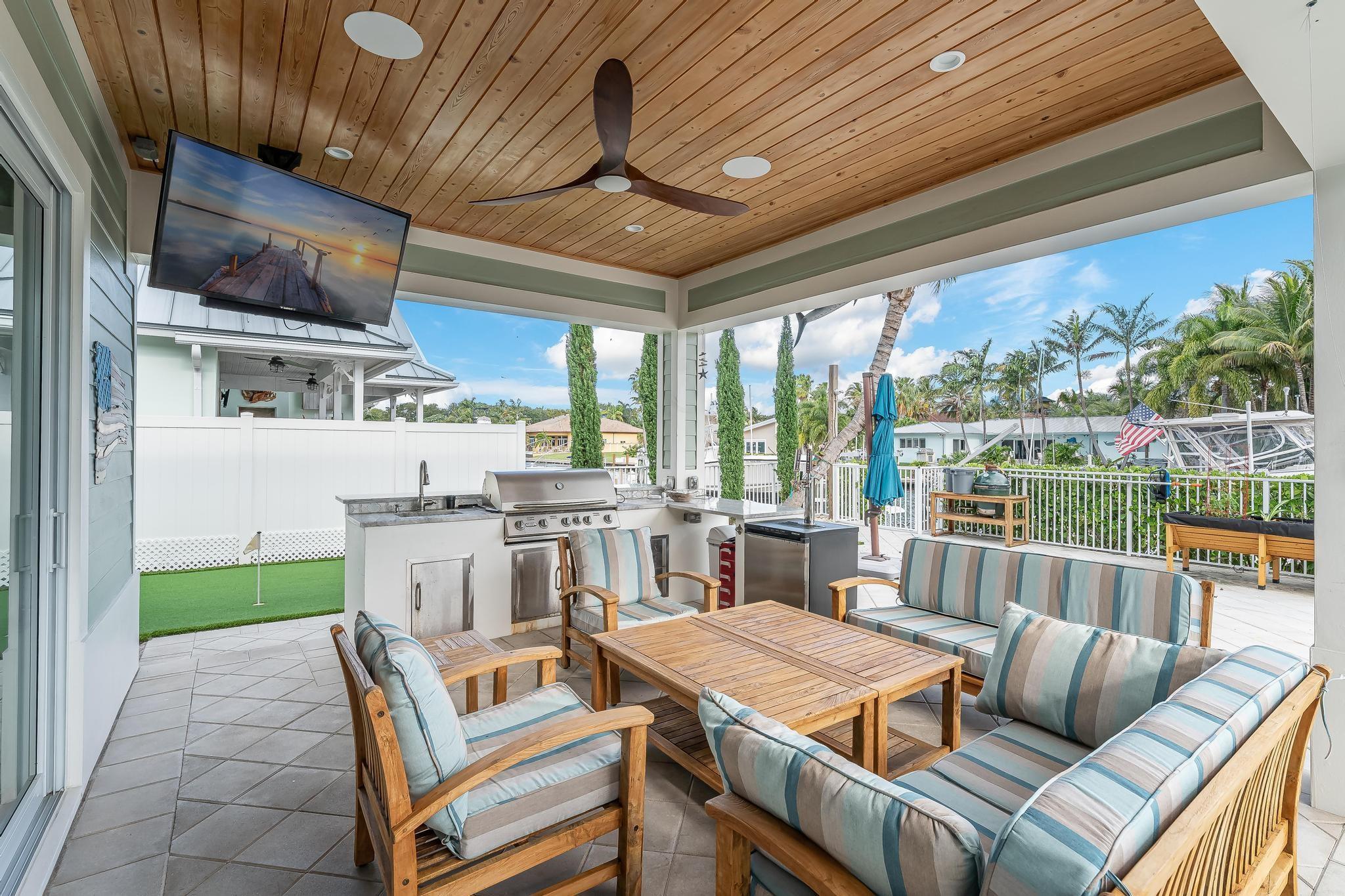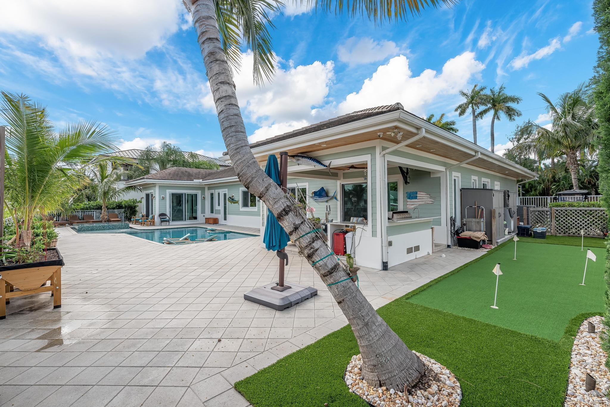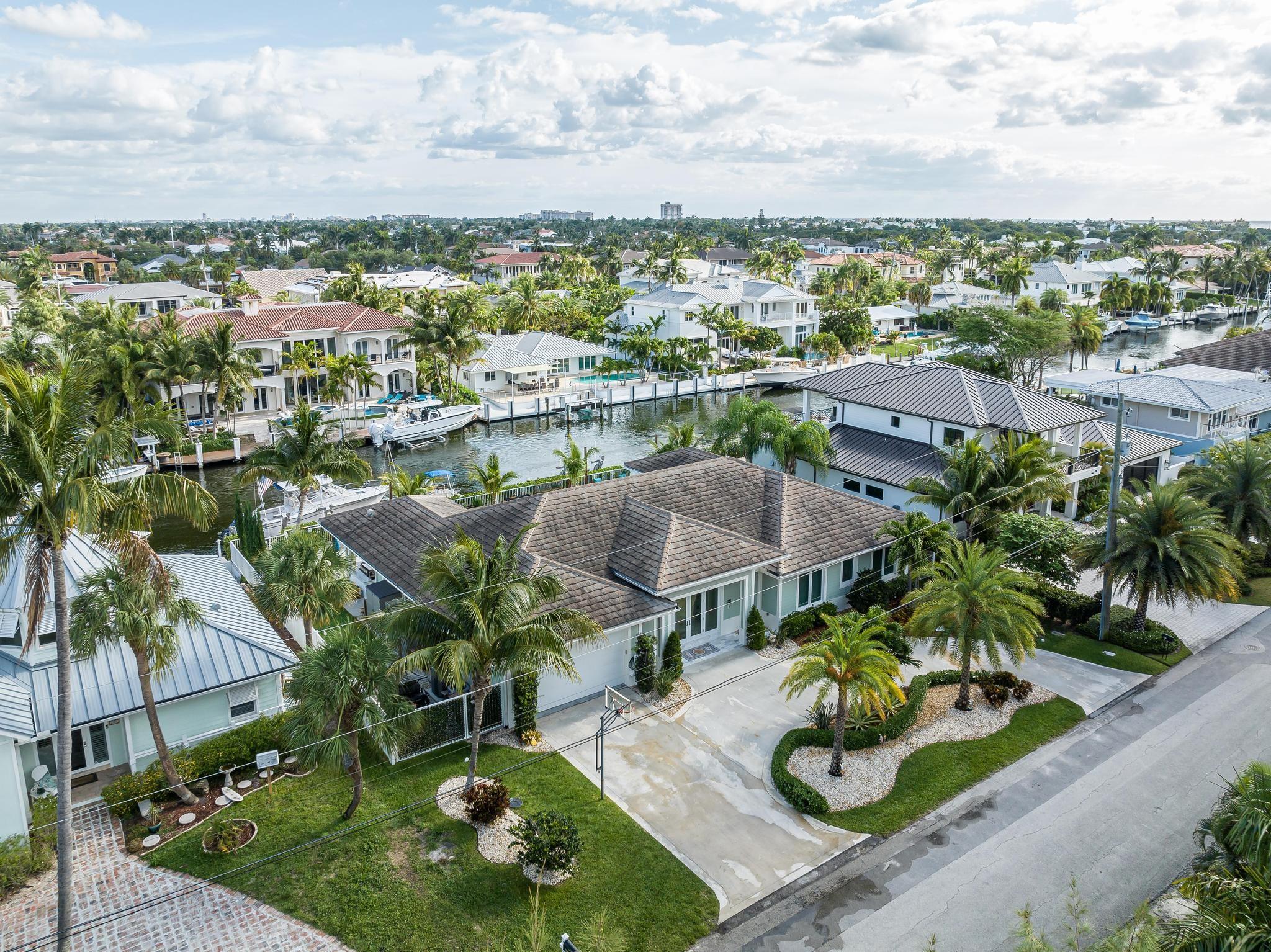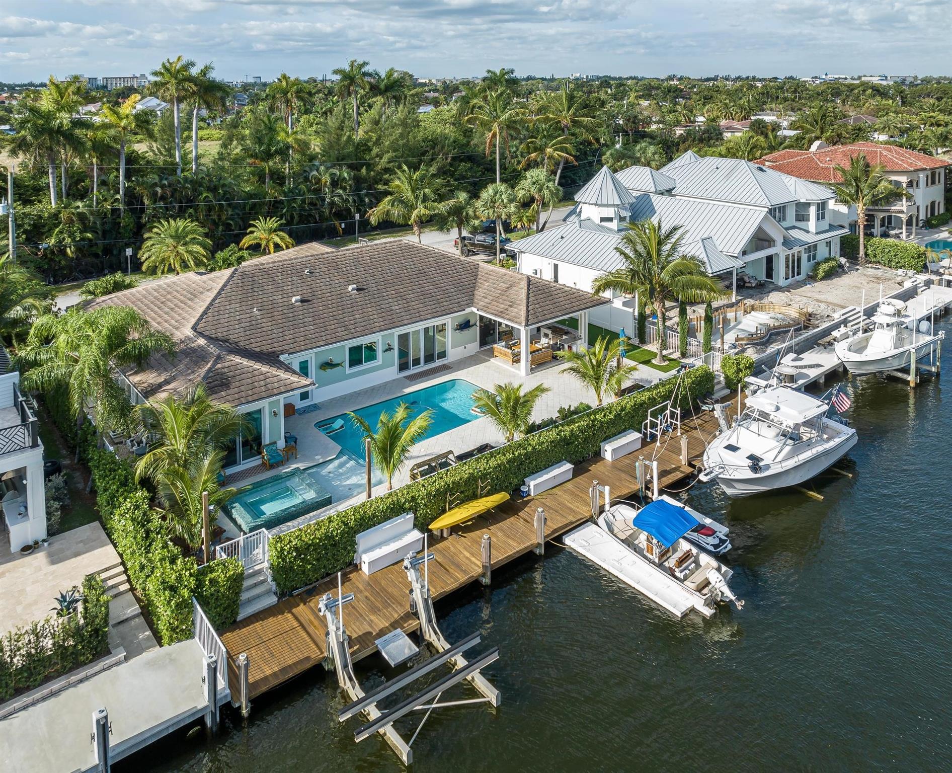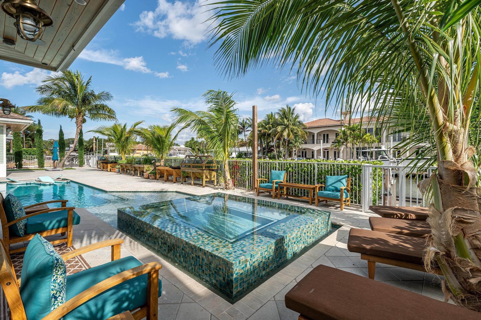 The property boasts a remarkable 110’ of waterfront complete with a private dock and a high-end boat lift. The home is 2940 square feet under air and designed with 10’ high ceilings throughout, creating a spacious and inviting atmosphere. It features 3 large bedrooms and 4 modern bathrooms. The heart of the home is its open floor plan, which beautifully integrates the living, dining, and kitchen areas, perfect for entertaining and family gatherings. The outdoor area is equally impressive, with a covered patio, a relaxing hot tub, and a heated pool. Also equipped with a standby generator with an automatic switch, a water filter and softener system, impact windows and doors with LowE for energy efficiency. Located just 5 minutes from the ocean and with no fixed bridges.