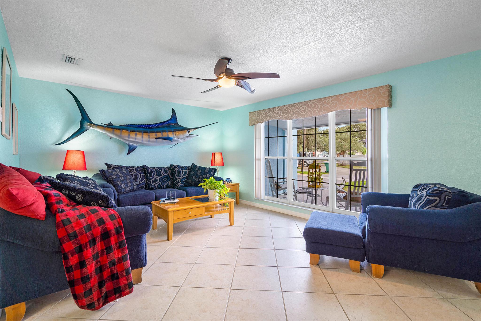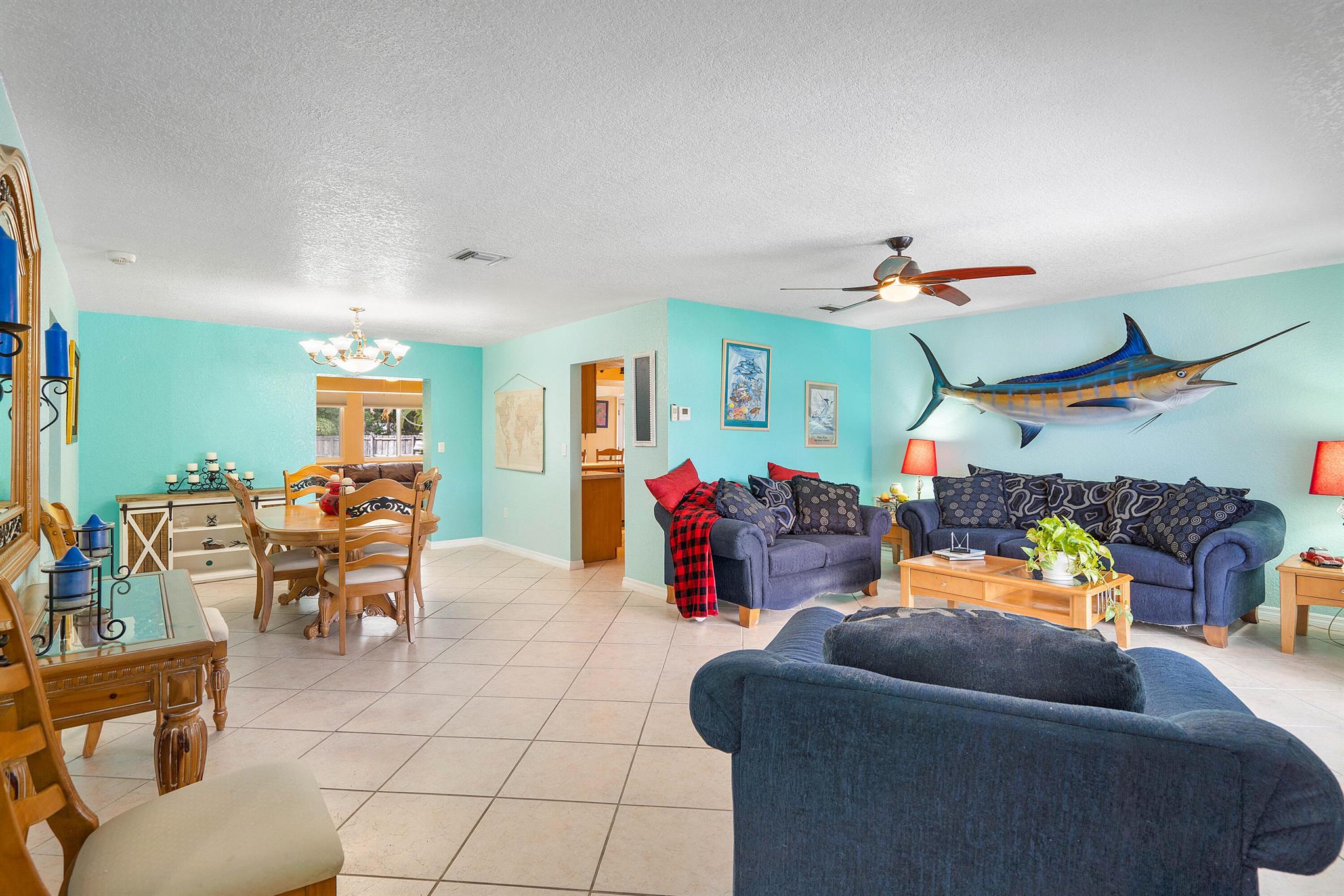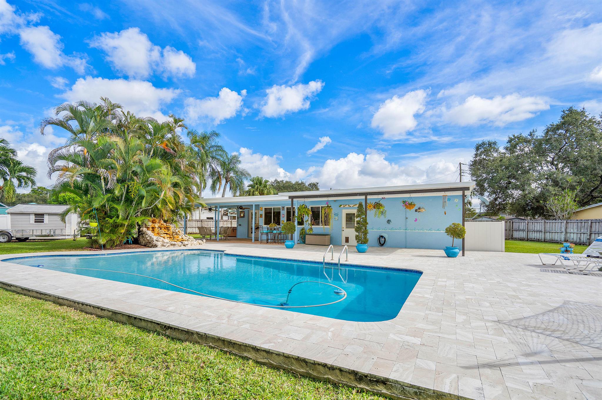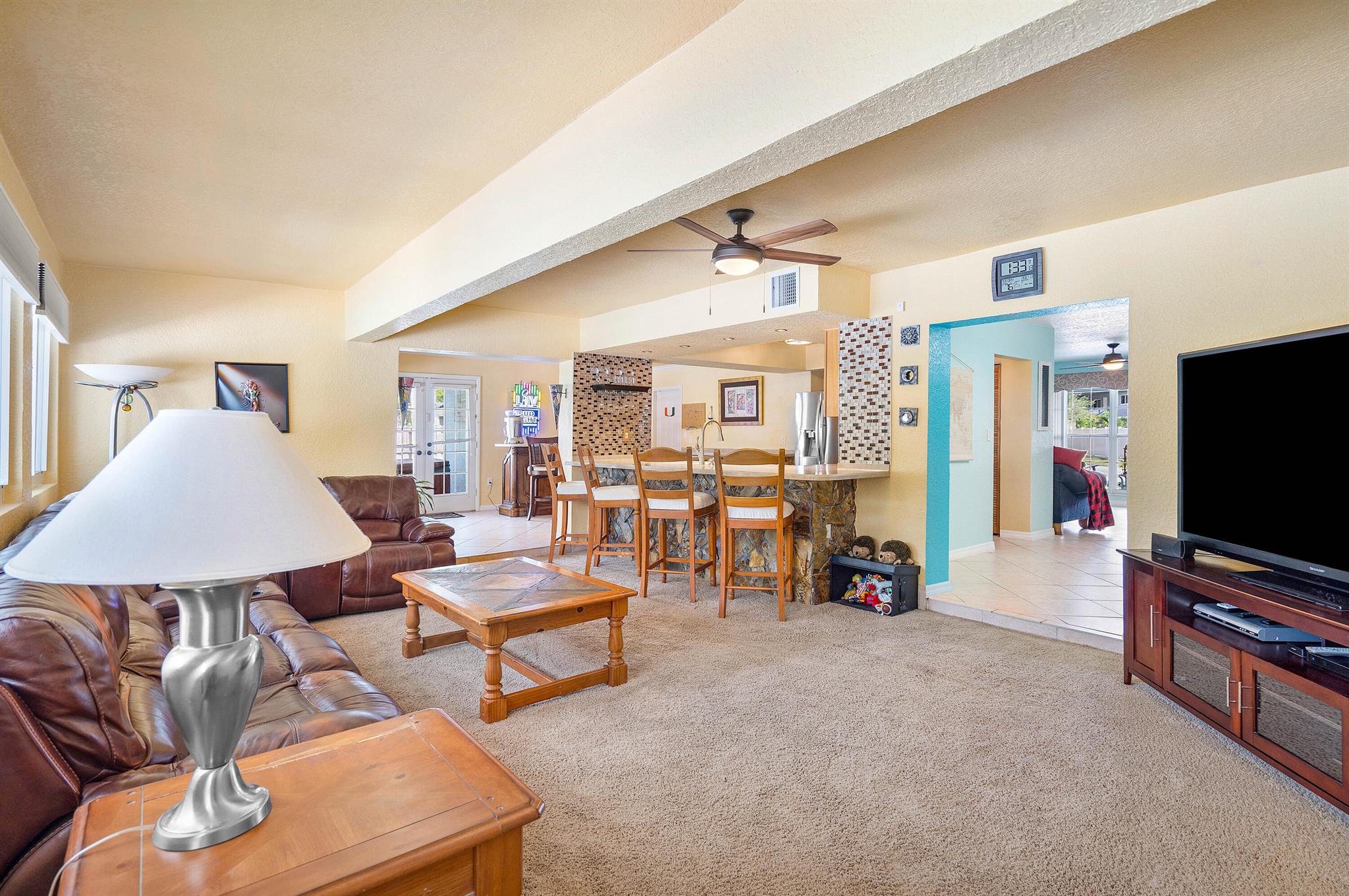 Discover your dream home in the coveted Cooper Colony Estates! This splendid single-family pool home boasts 3 bedrooms, 2 bathrooms, and a 2-car garage. Nestled on over 1/3 of an acre, this gem features 130 feet of waterfront canal with a private dock – a paradise for water enthusiasts. No HOA fees! Step inside to experience luxury with diagonally laid tile throughout the main living area. The oversized living room is adorned with upgraded features, including a fan, baseboards, and expansive windows that flood the space with natural light. The master bedroom is a retreat with upgraded wood-look laminate floors, a fan, crown molding, and ample closet space. The master bathroom is equally impressive, featuring a solid wood vanity, framed mirror, upgraded light fixture, and a beautiful tiled