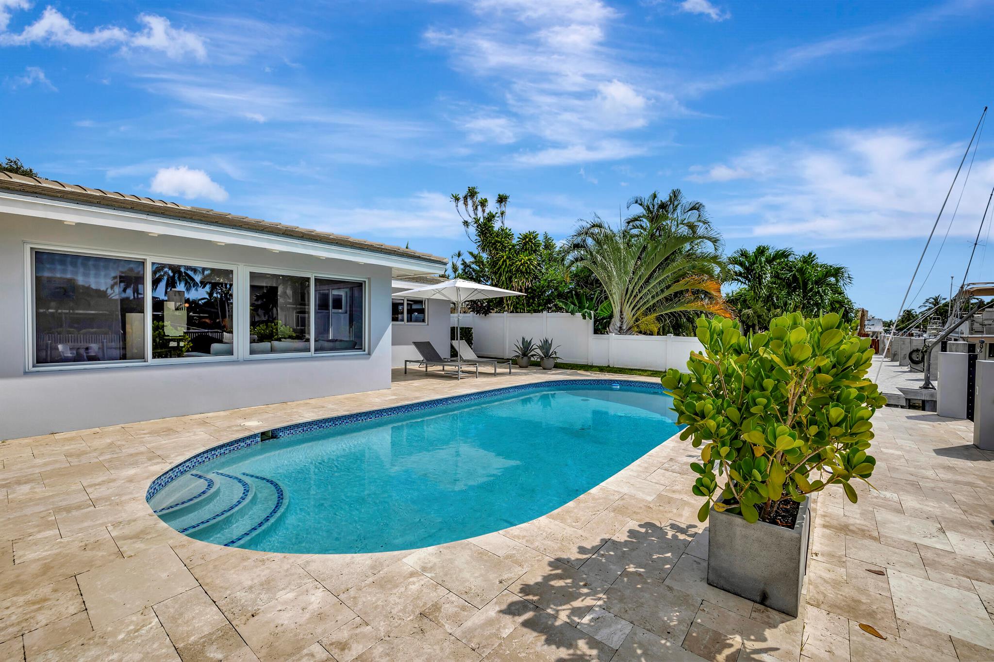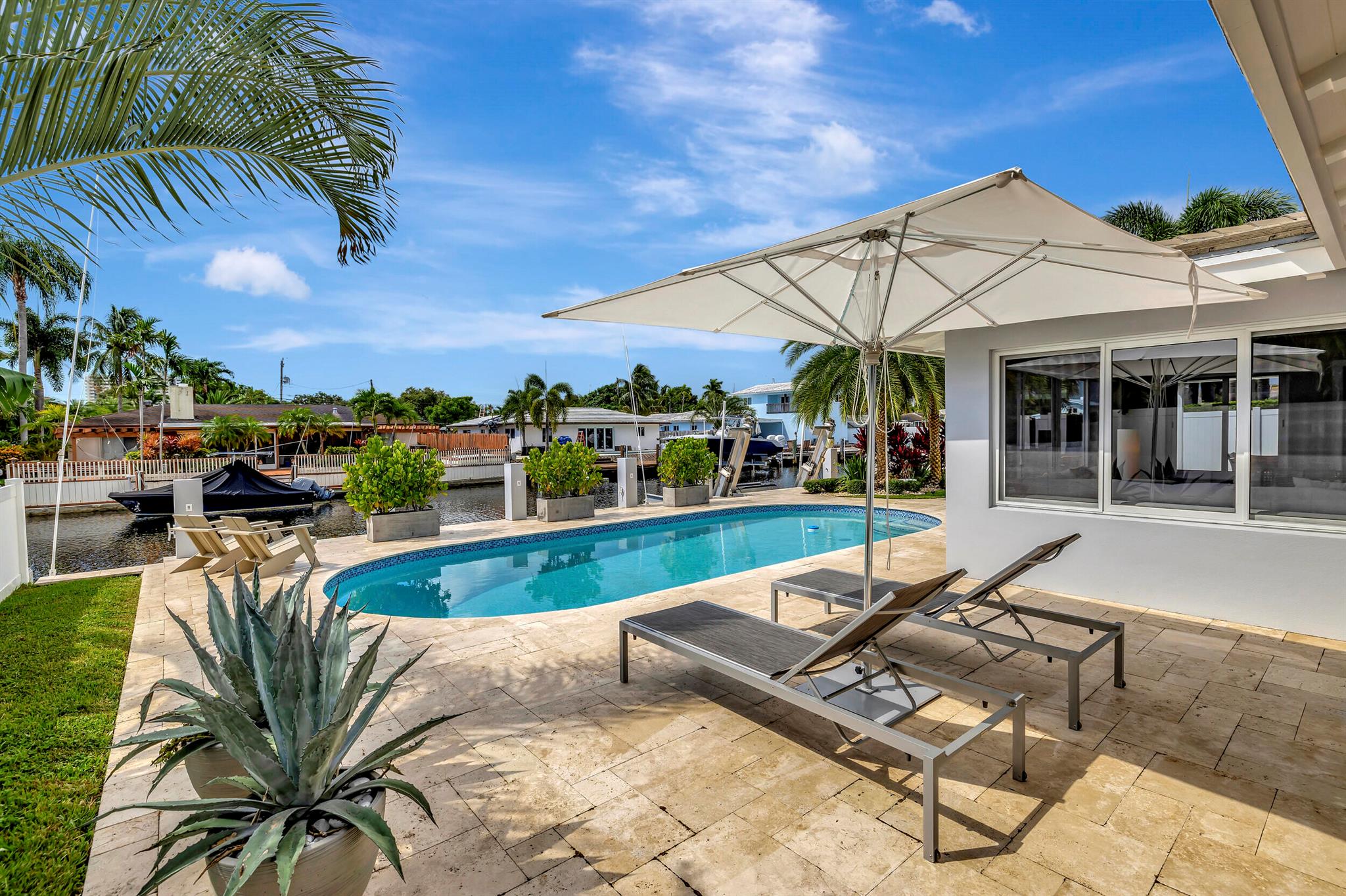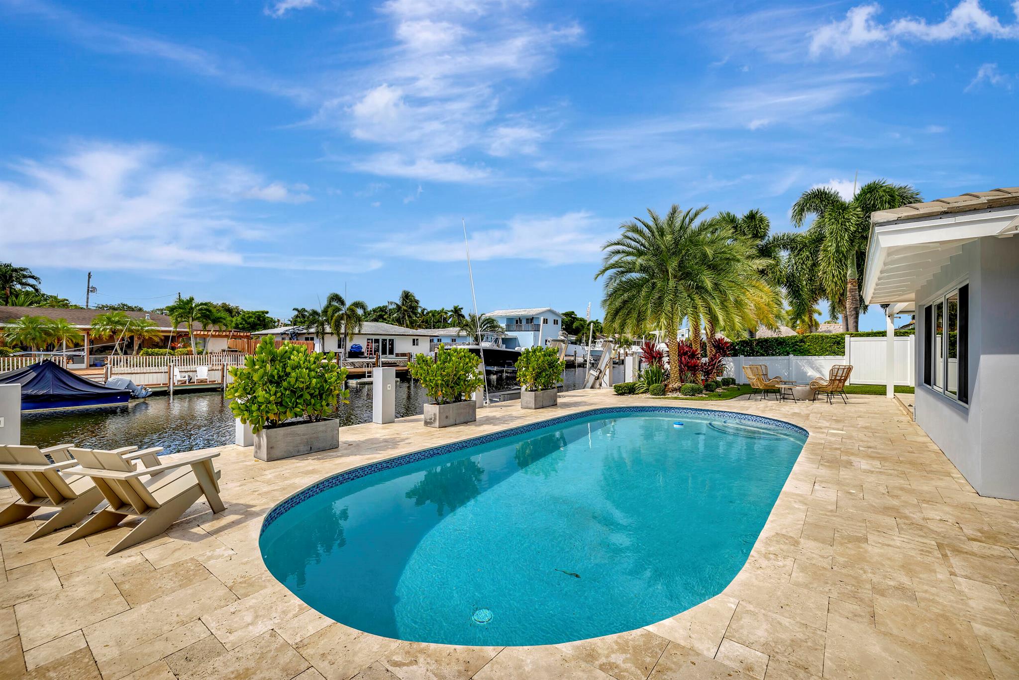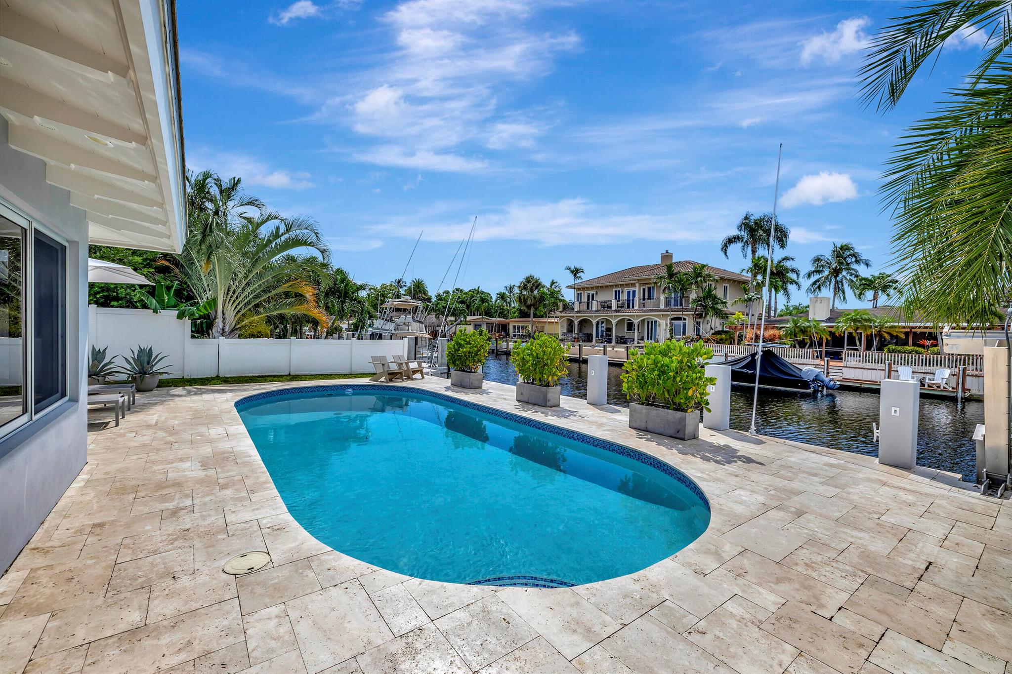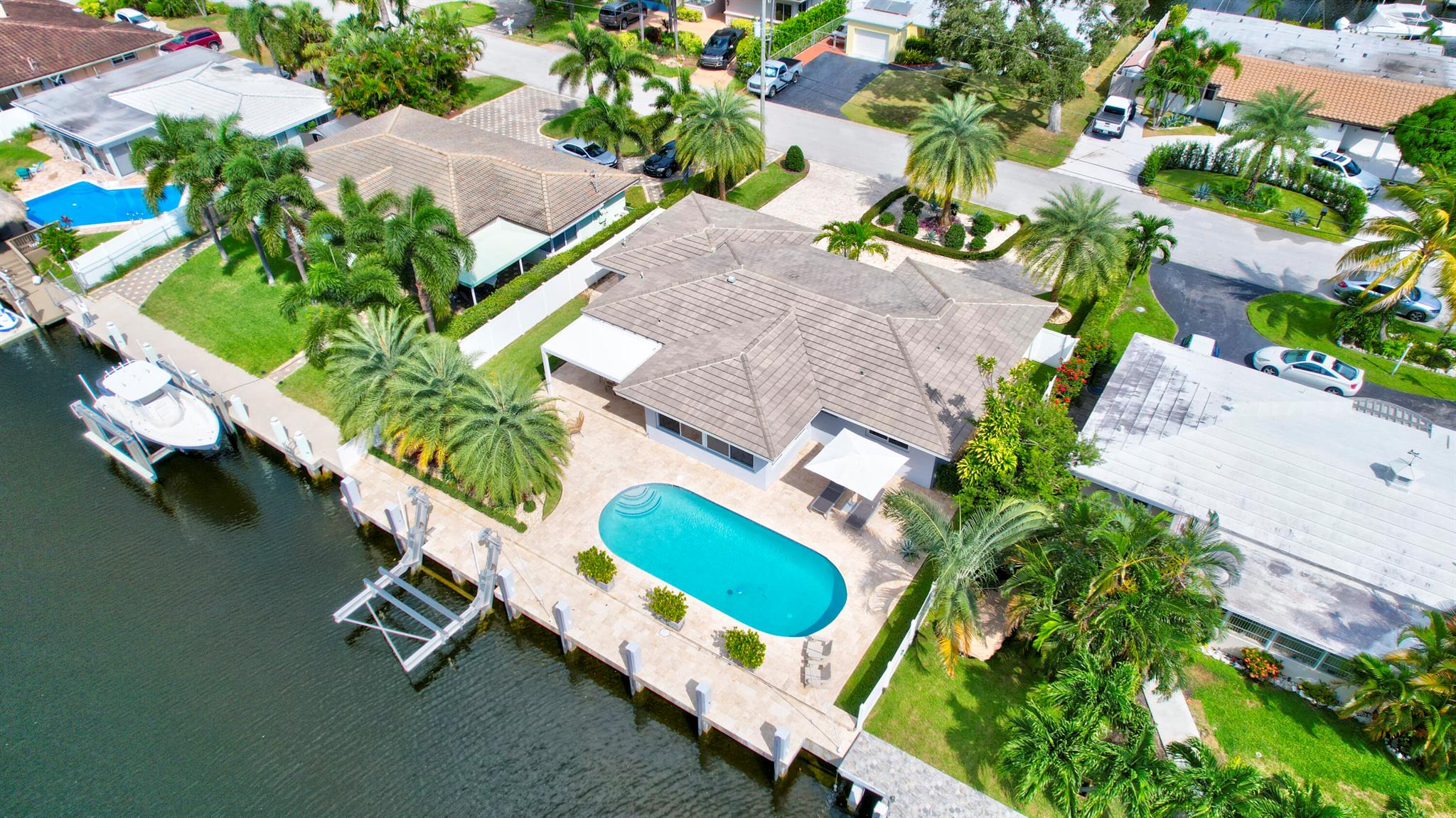 Welcome to this beautiful waterfront home in Pompano Isles. No fixed bridges, 75 ft of Waterfrontage,25 k Boat Lift & direct access to Intracoastal, Hillsboro Inlet, and the Ocean. This spacious 2 bed 2 bath home is decorated with a midcentury modern flair. (furniture is negotiable) The house has newer roof and Euro Tech impact glass throughout. The living space is an open concept with 2 living areas to enjoy entertaining. Big windows which make the living space light, bright, and airy. They overlook the beautiful free form pool, lush landscaping, and canal. The outdoor space is covered in travertine, perfect for entertaining and has a covered patio that you can take advantage of the outdoors. House has 50A electrical service with 2 hose bibs and 2 120V outlet. It is a MUST see!