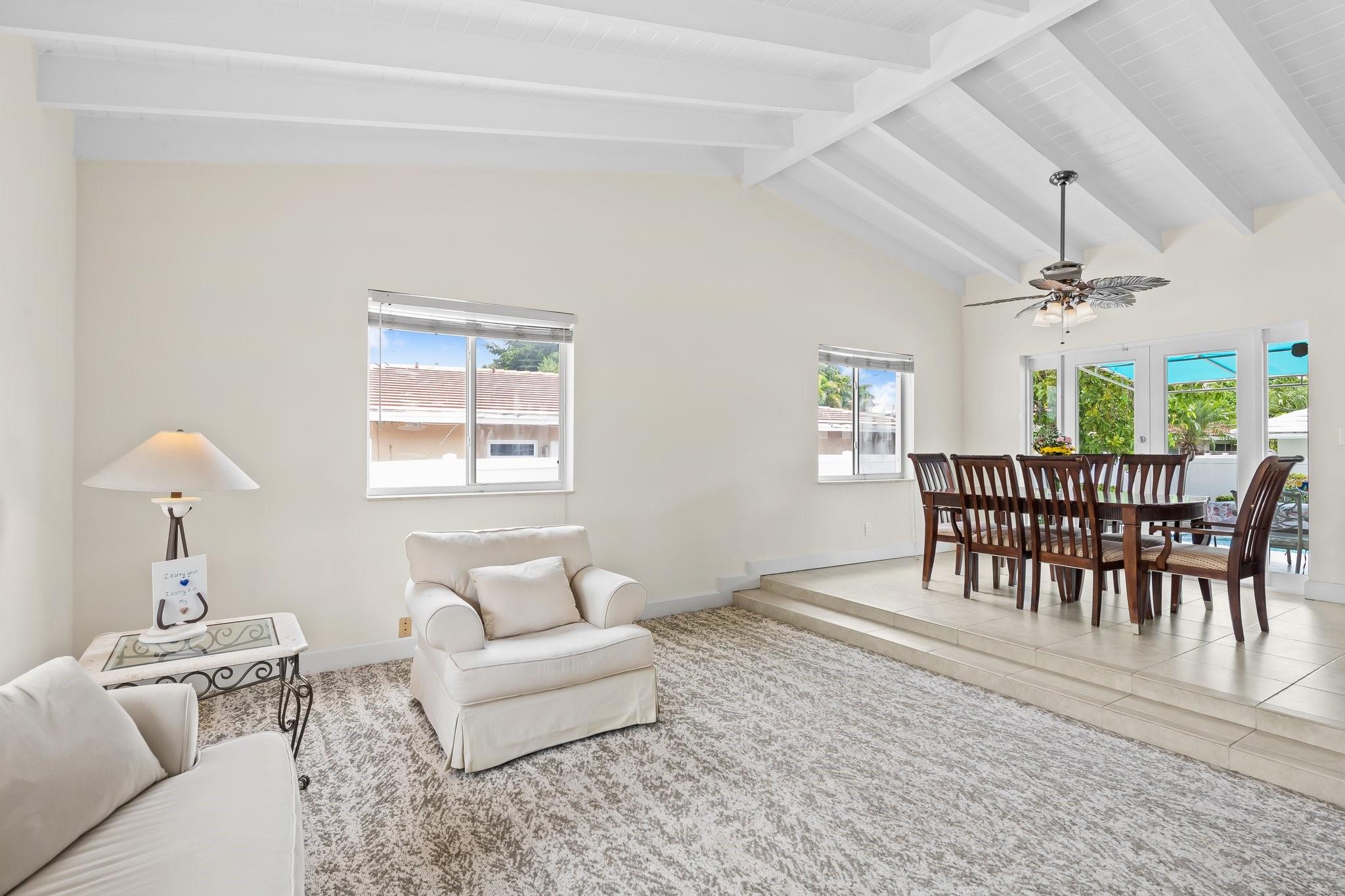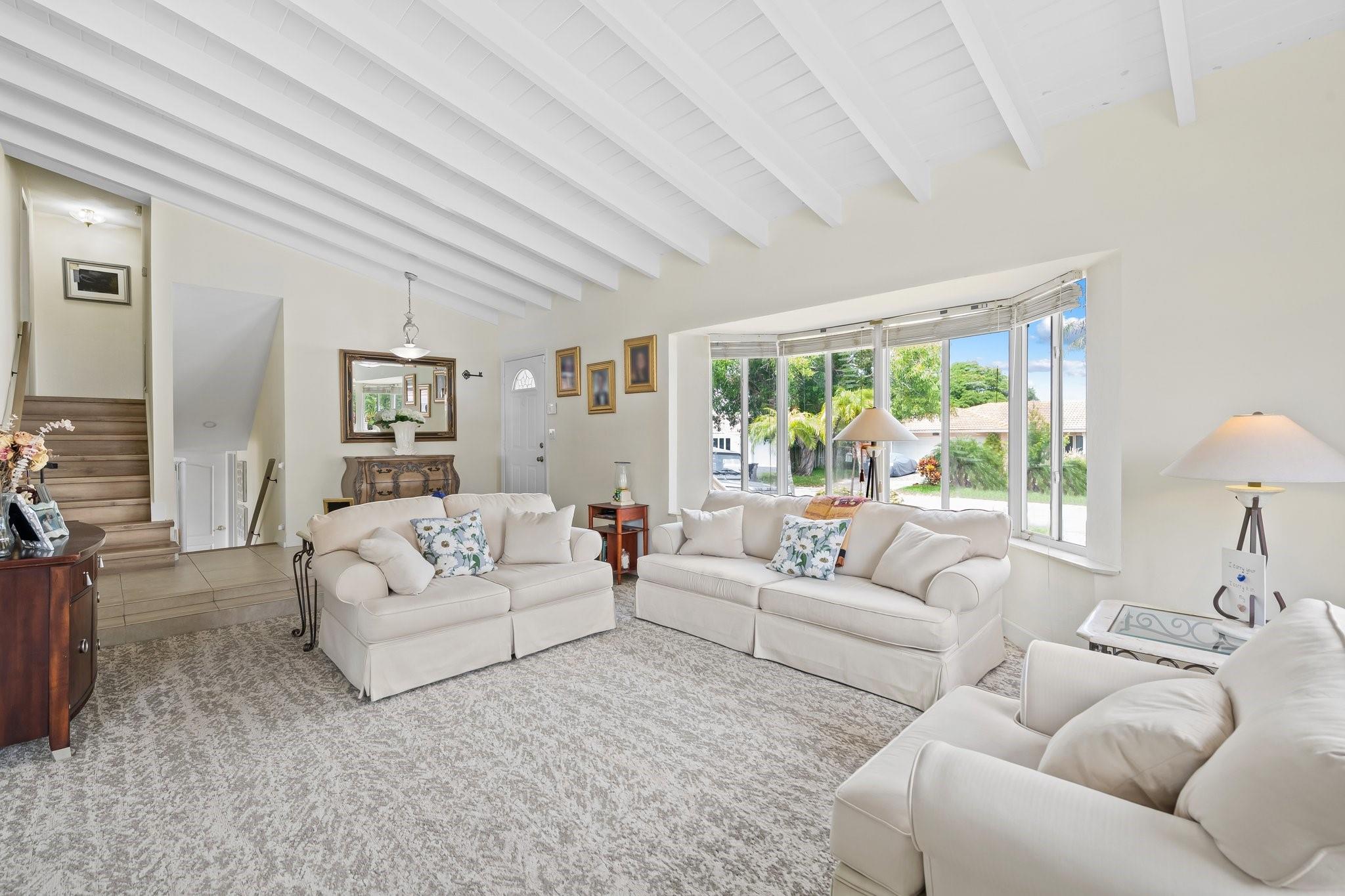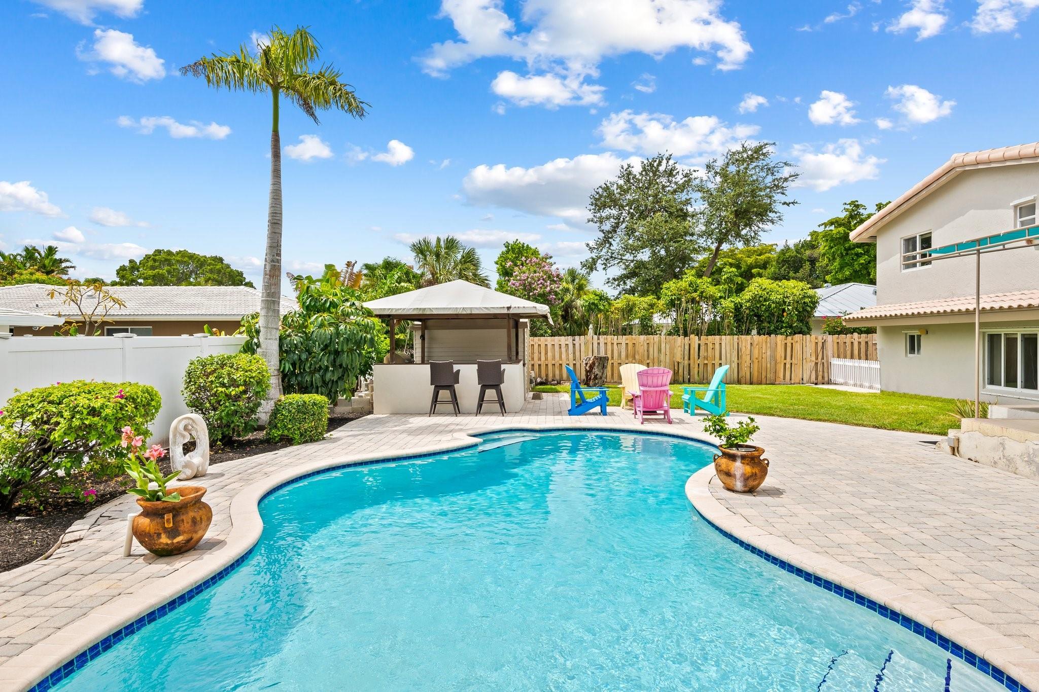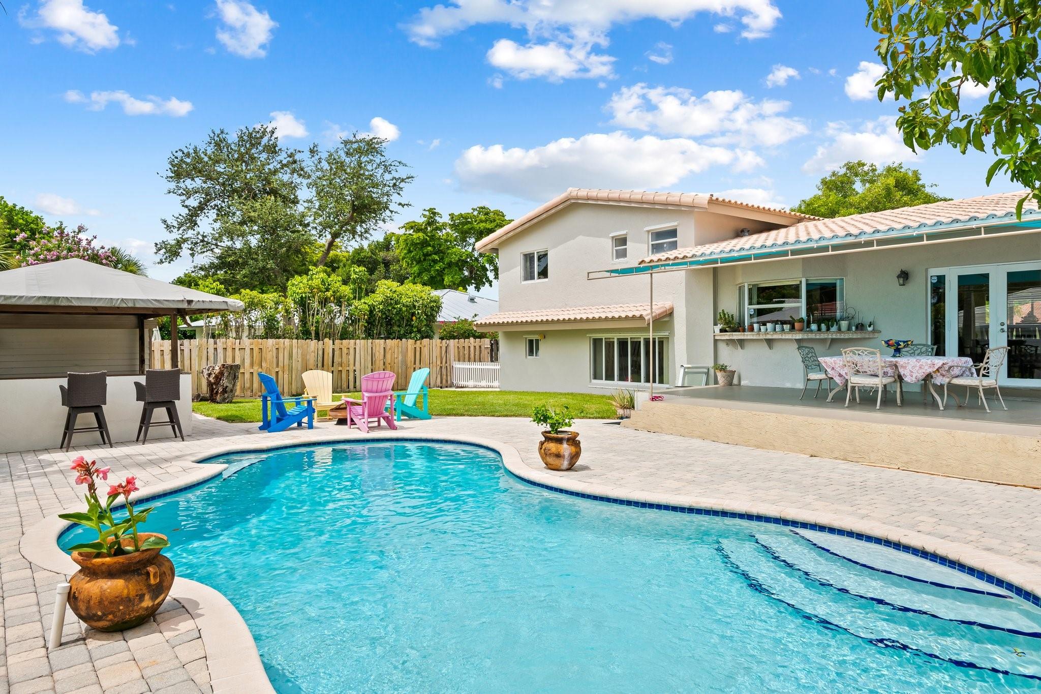 Welcome to your sanctuary in Coral Ridge Country Club Estates! 4 bedrooms, 3 bath tri-level home offers 2,240 sq ft of living space. The second level features a family area with vaulted, wood beam ceilings and a bay window offering an abundance of natural light. Kitchen is equipped with stainless steel appliances and granite countertops opens to an outdoor oasis with a pool. First level includes two bedrooms & shared bath, sitting area and laundry room. Third level boasts the primary suite with jetted tub and an additional bedroom. Enjoy a circular driveway, hurricane shutters, walking distance to Cardinal Gibbons High School, Christ Church, beaches and Lauderdale-by-the-Sea’s dining and shopping.