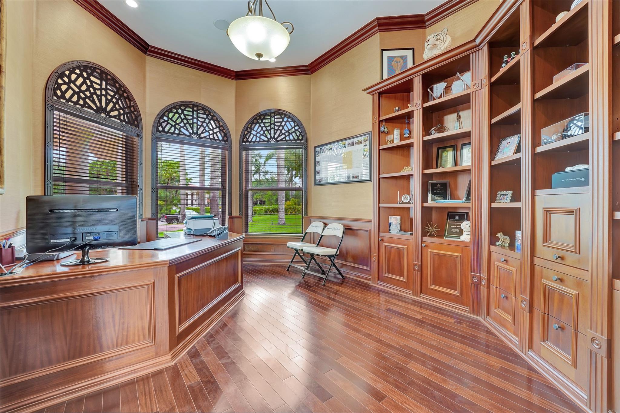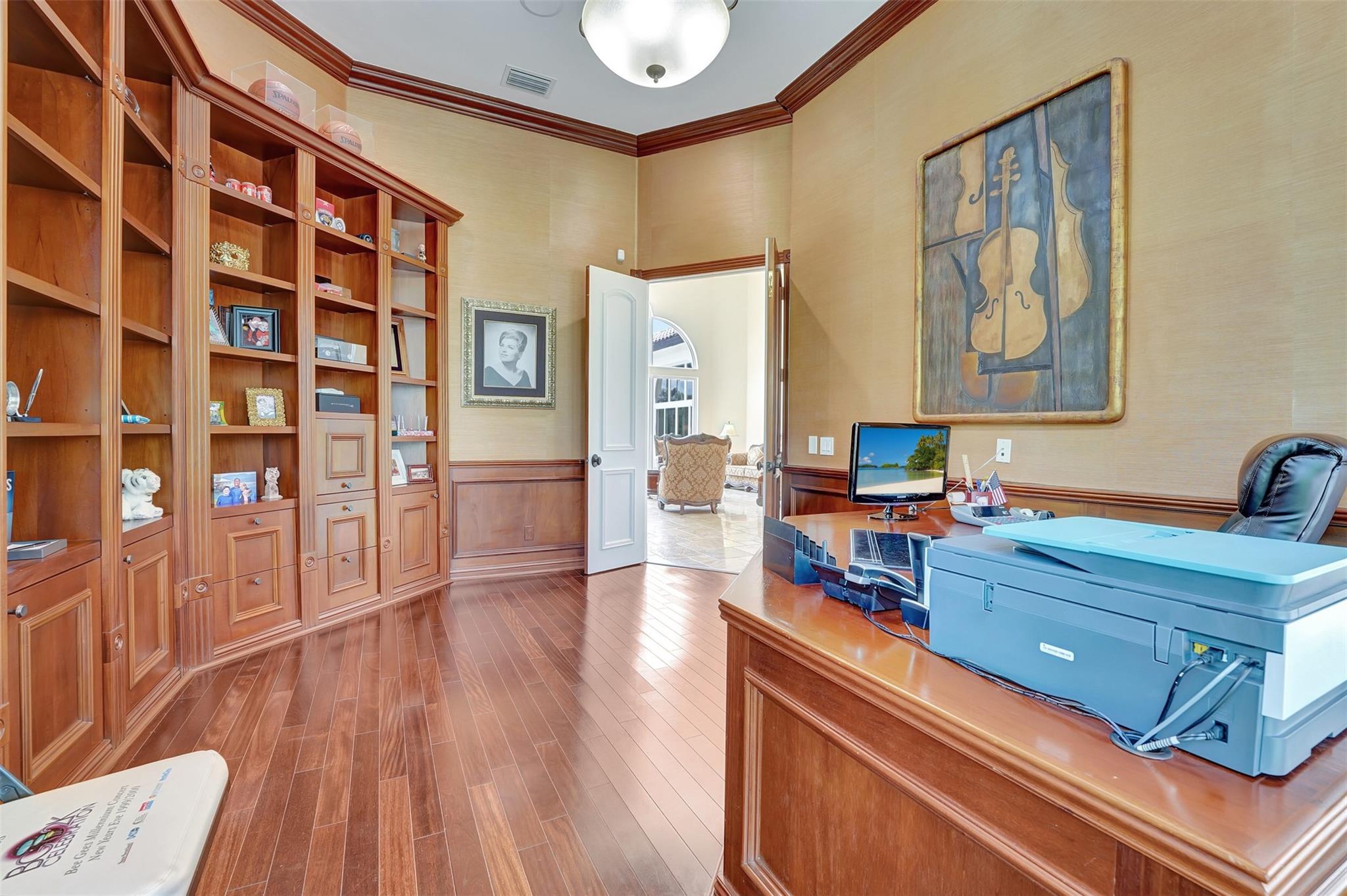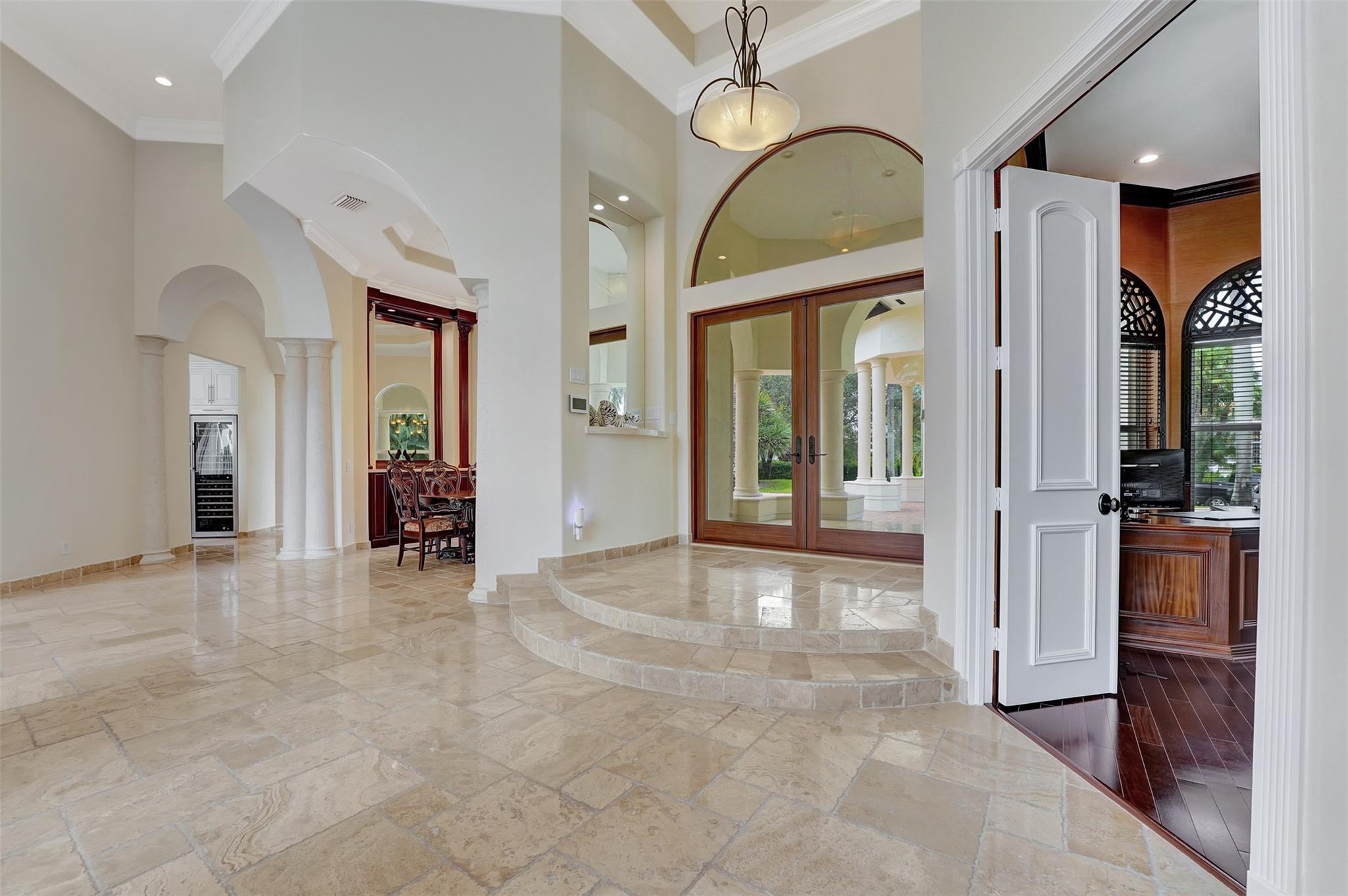 Exquisite luxury home within prestigious Windmill Ranch Estates. Grand entrance into the beautifully detailed & recently completed 7-figure remodel inside and out, w/ expansive lake views, lush landscaping, resort pool, & mature palm trees adorn this property. Unique masterpiece has fine craftsmanship, exquisite finishes, high volume ceilings, Jerusalem Stone, real wood floors, private office, outfitted bar, & formal dining. Gourmet kitchen, granite tops, custom cabinetry, massive center island & breakfast area. Lavish master suite w/ large walk-in closets & resort style master bath w/ oversized Jacuzzi Tub, dual showers with full Steam. Cabana bath w/spa sauna & shower. Fully equipped Summer kitchen gazebo seats 20+. Oversized 3 car garage w/ marble floors, & expansive driveway.