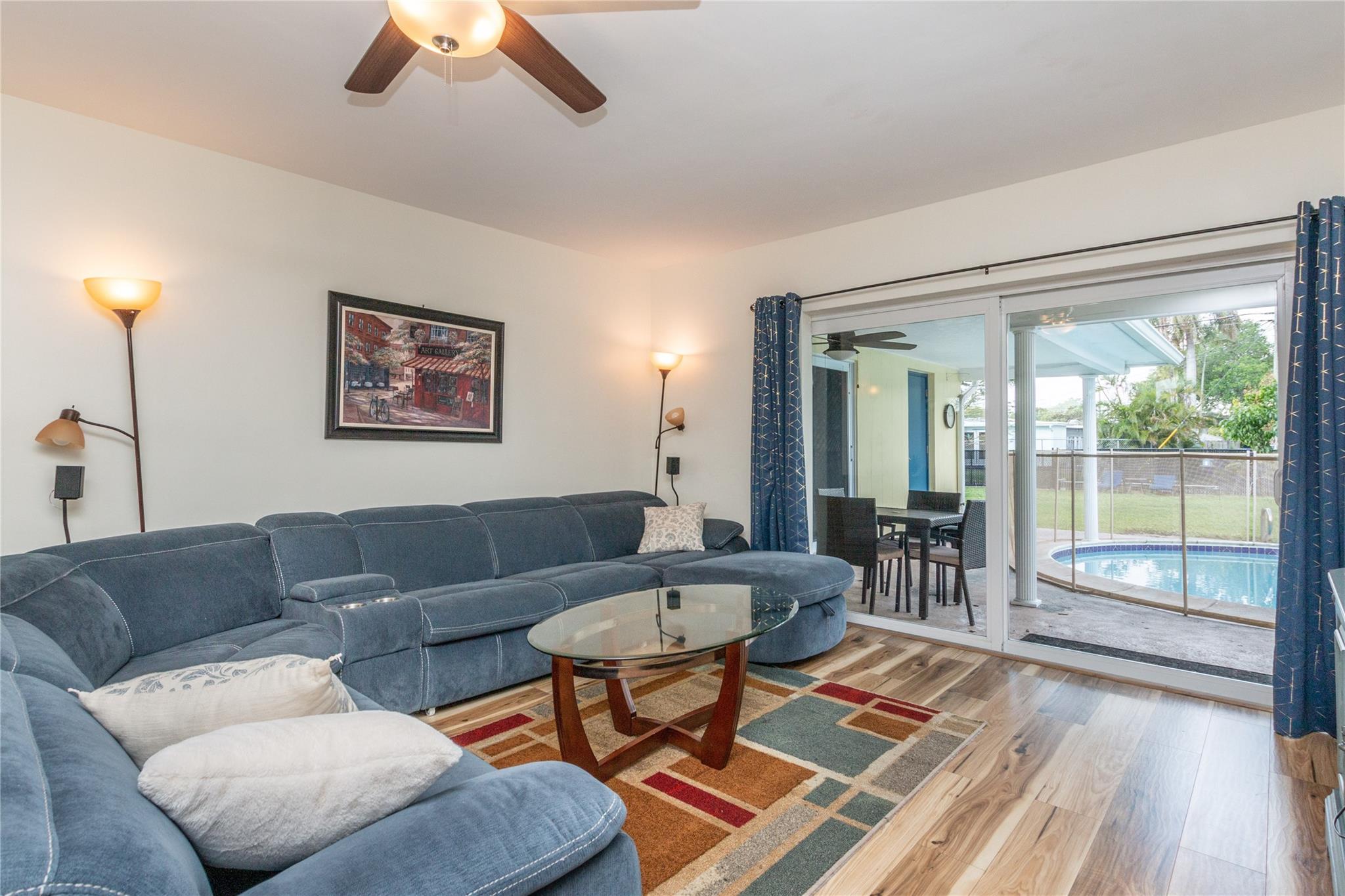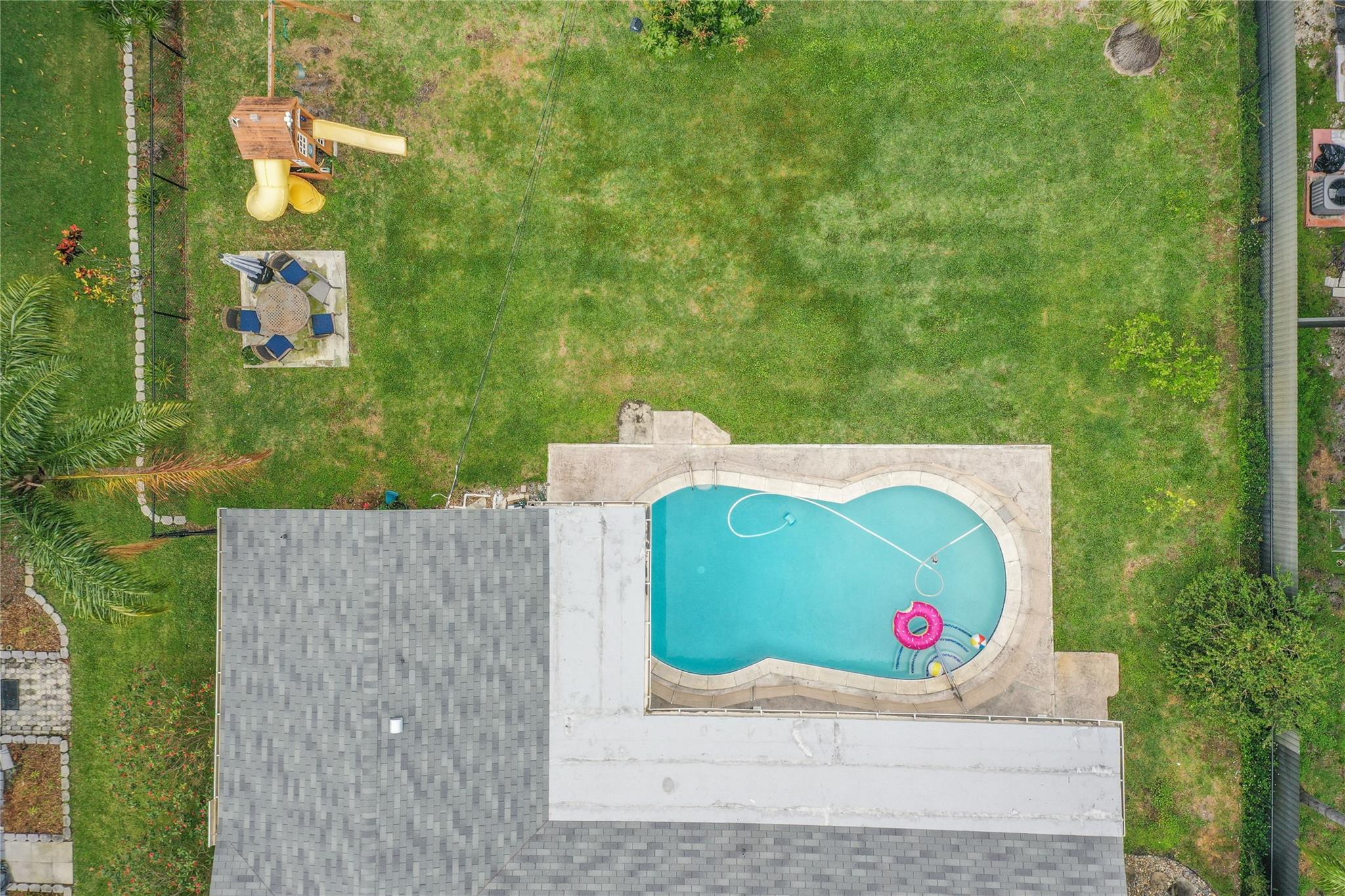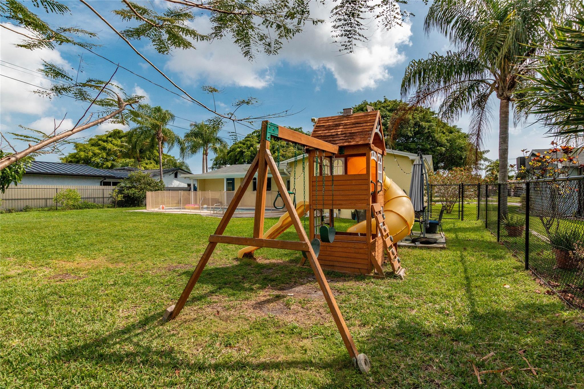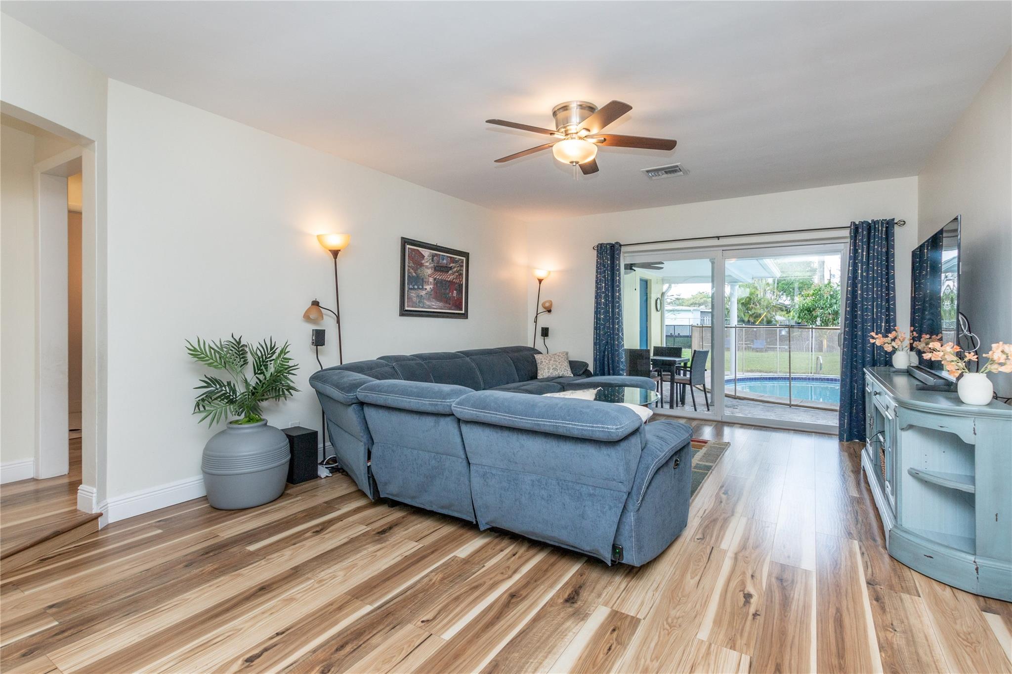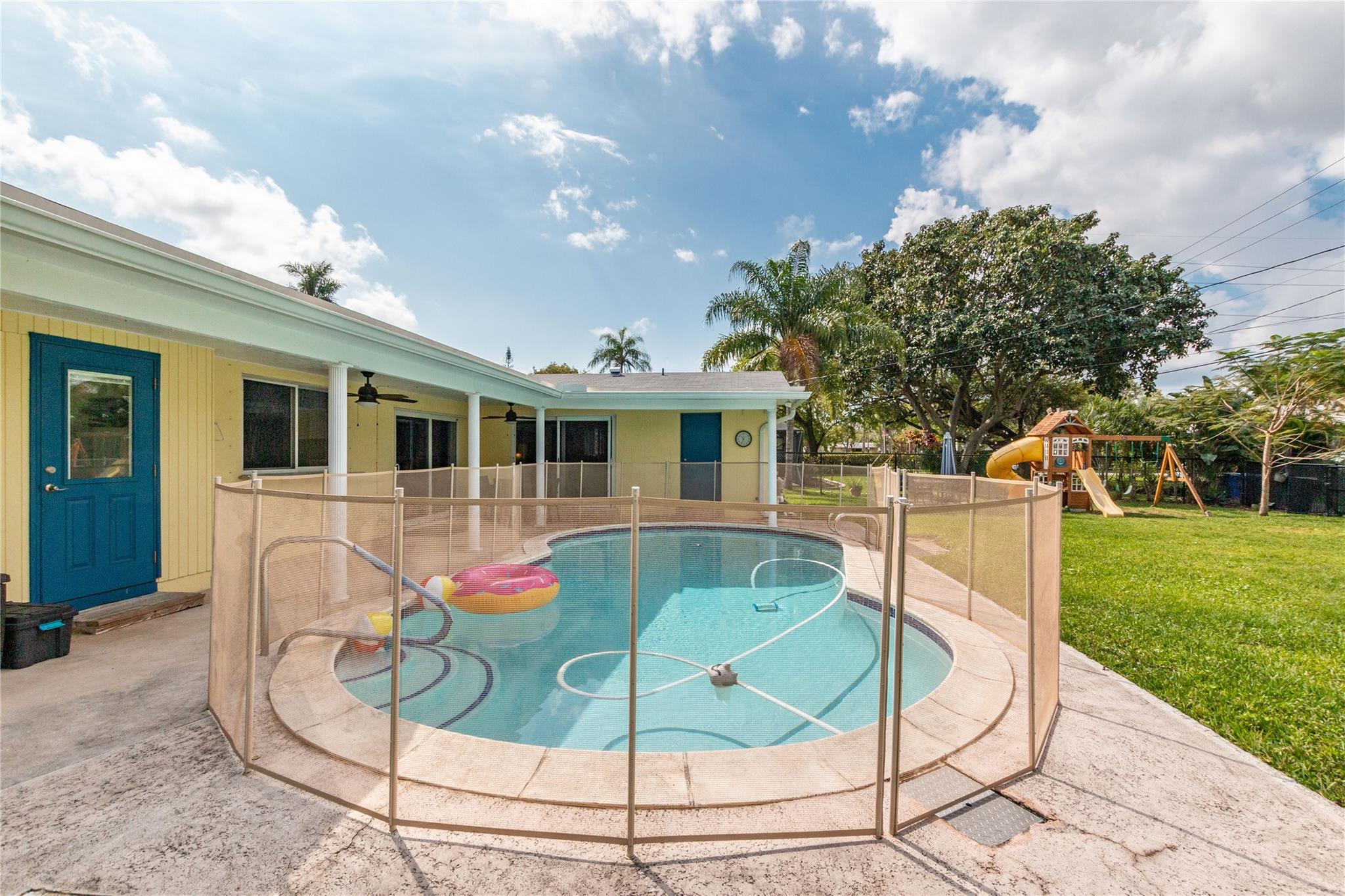 Stunning 3/3 home that sits on a massive 10,600 square foot lot! Property features luxury water resistant wood based laminate throughout the home, Totally renovated bathrooms, Impact windows and doors, New Kitchen with Stainless Steel Appliances. New Roof installed 2022, Newer AC unit 2020. New Circular Driveway 2022. Beautiful Patio area overlooking large yard and POOL! 1 Car Garage! The 3rd bathroom in the garage, if in law suite is desired, it would be an easy conversion to 1/1 which would make the house a 4/3. (Converting the garage to 4th bedroom)