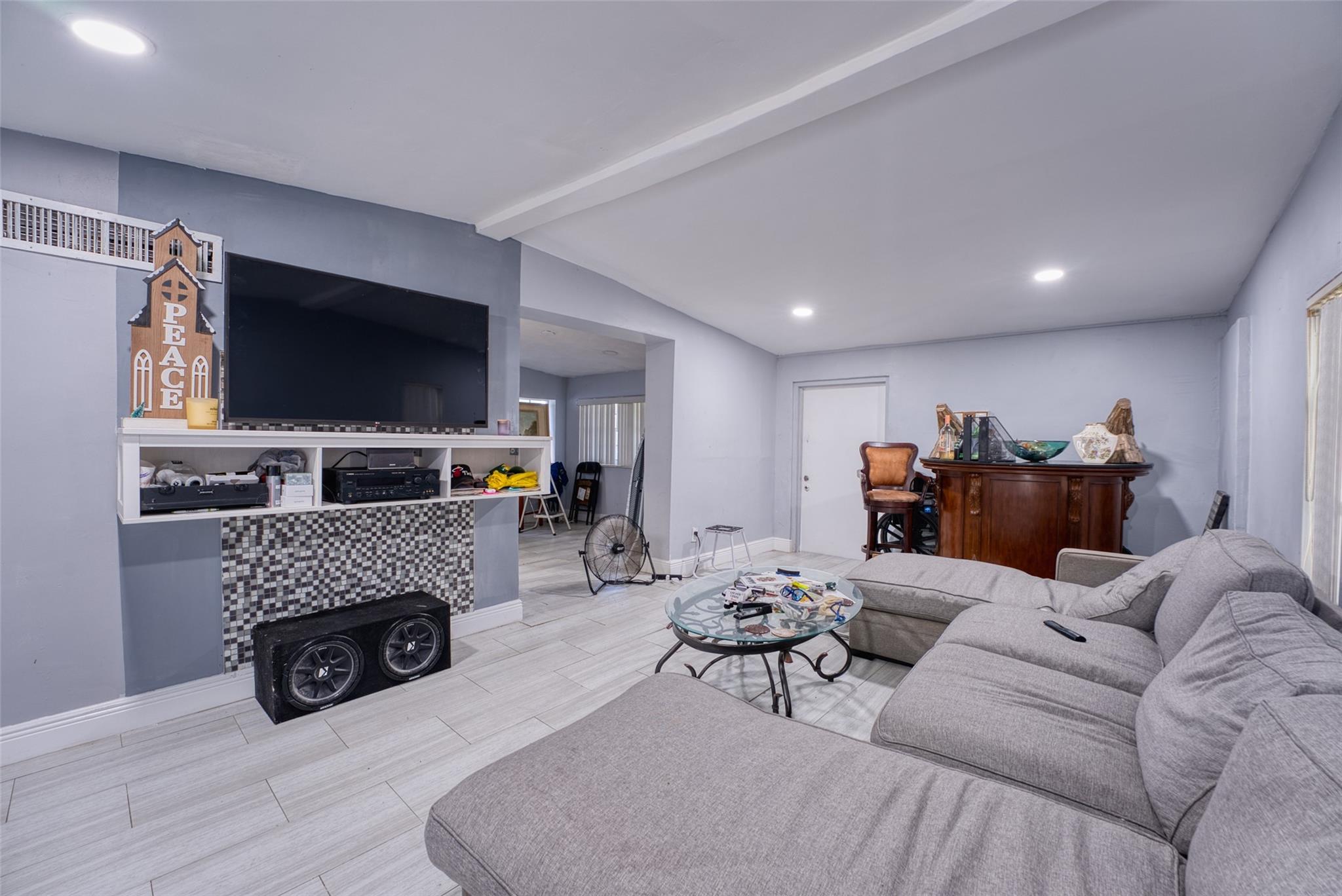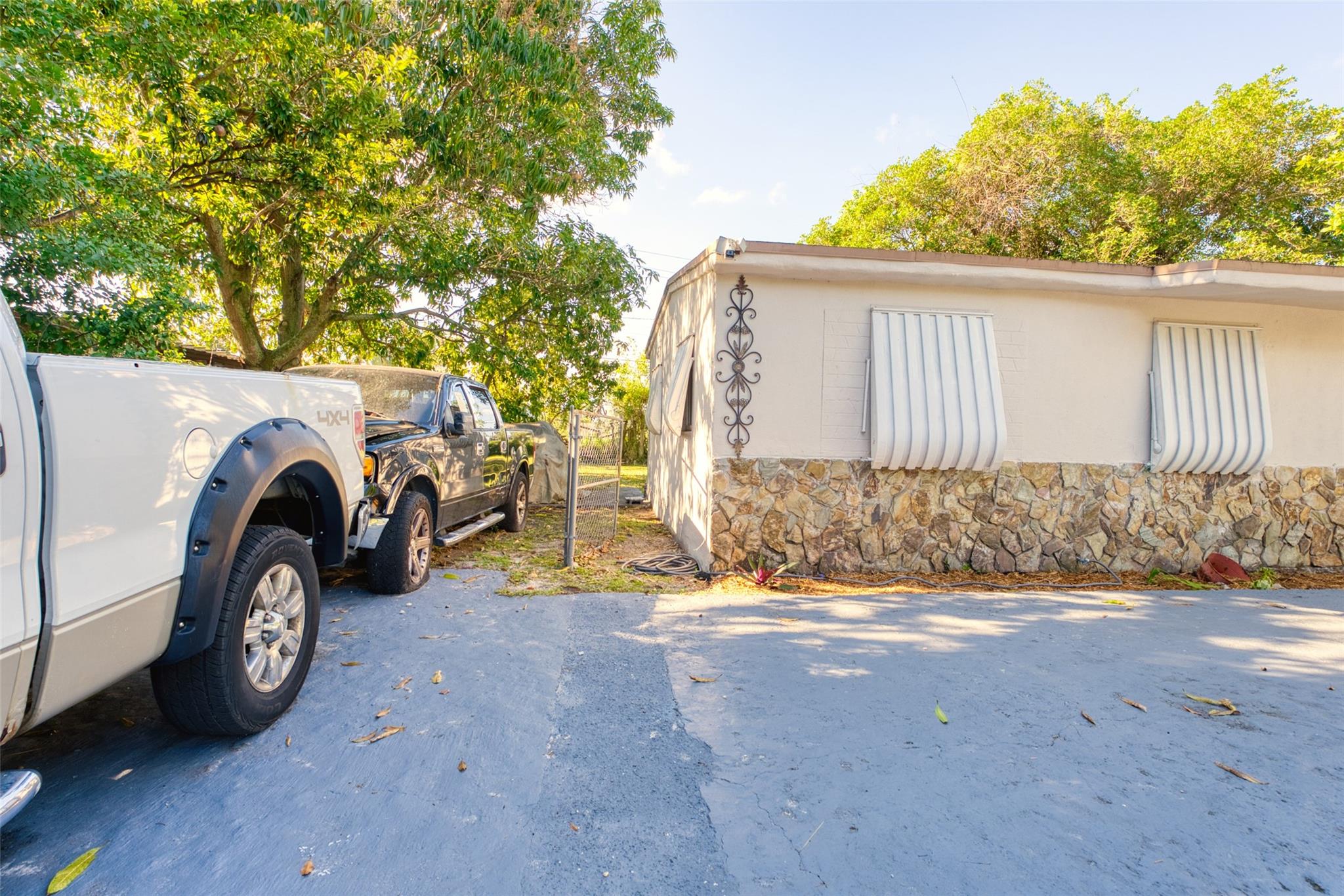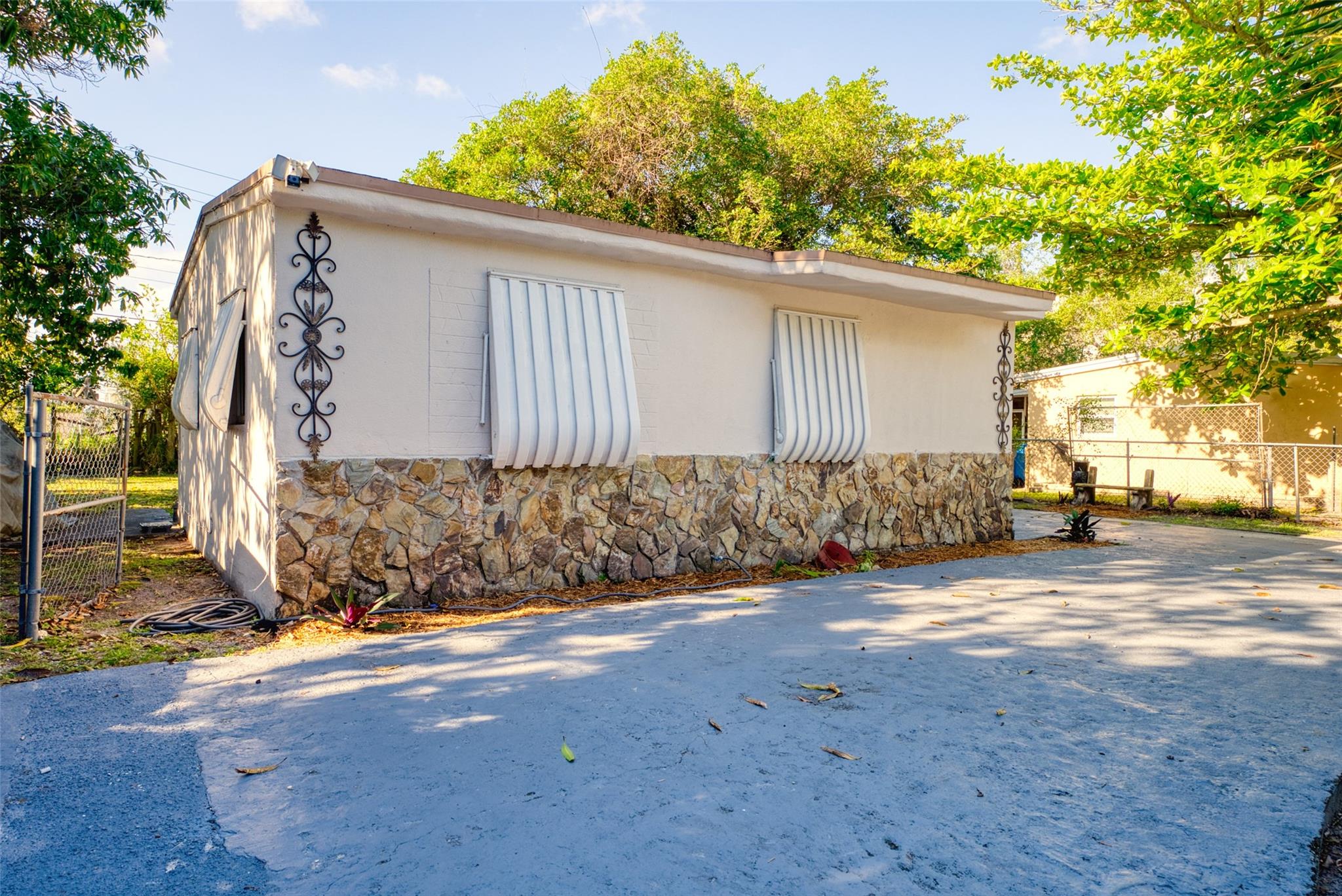 5 fruit trees, cameras, flood lights, upgraded kitchen an bathroom with new pvc plumbing, bathroom has built in bluestone speakers for your enjoyment, upgraded central ac, new construction light throughout, full entertainment center in living room, some impact windows throughout, plush landscaping, big backyard with and side parking for a possible boat or rv, back enclosed patio, circular driveway fits 6 car easy, and a iron gate.