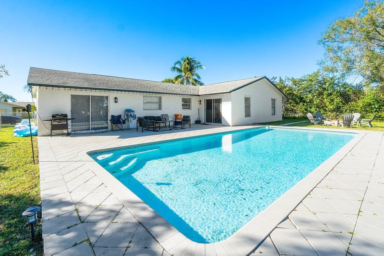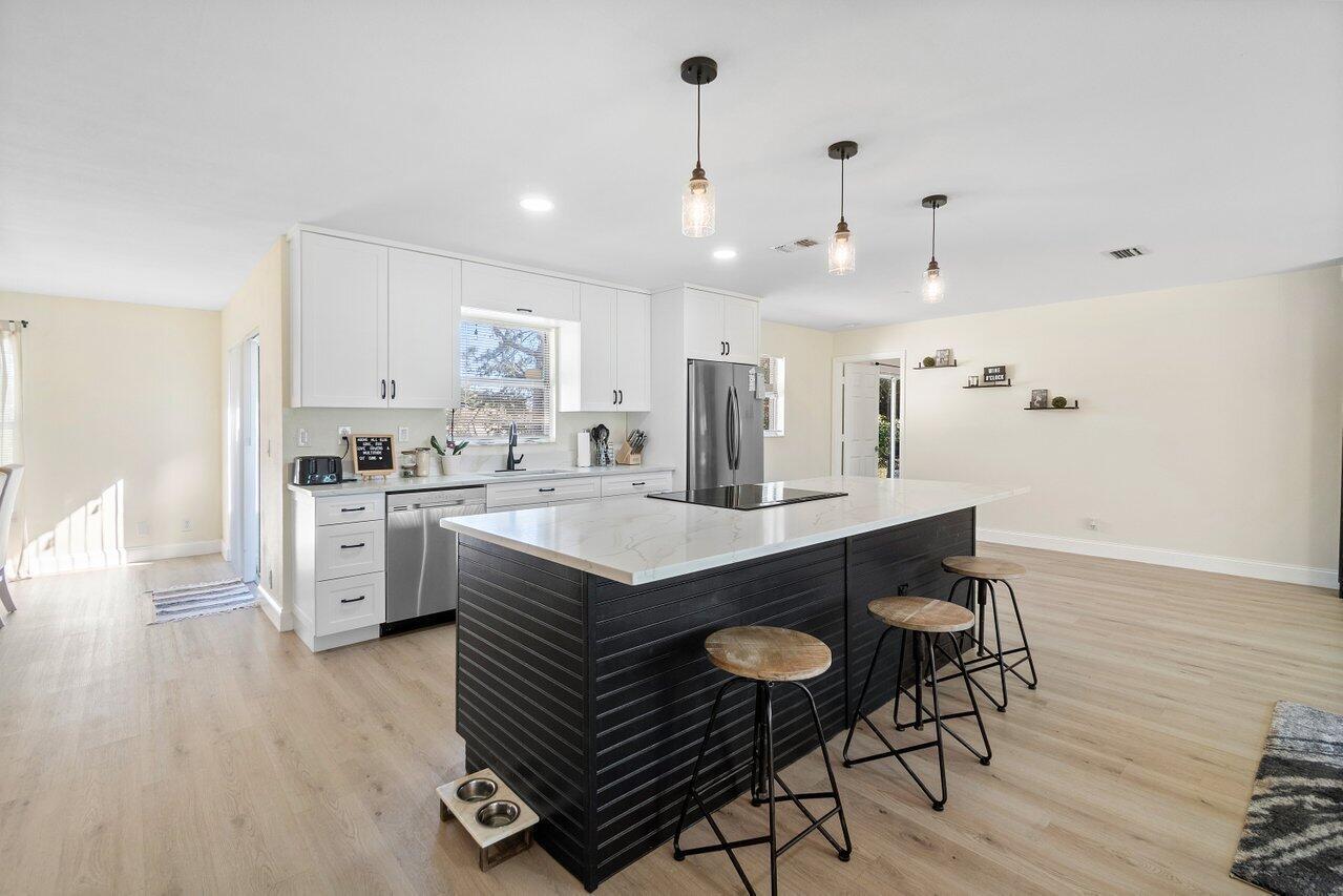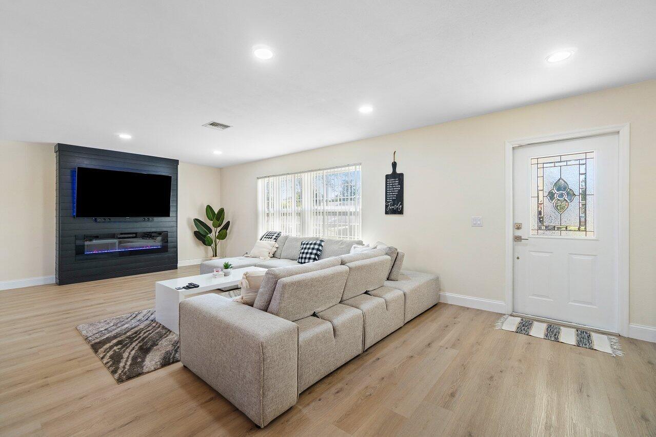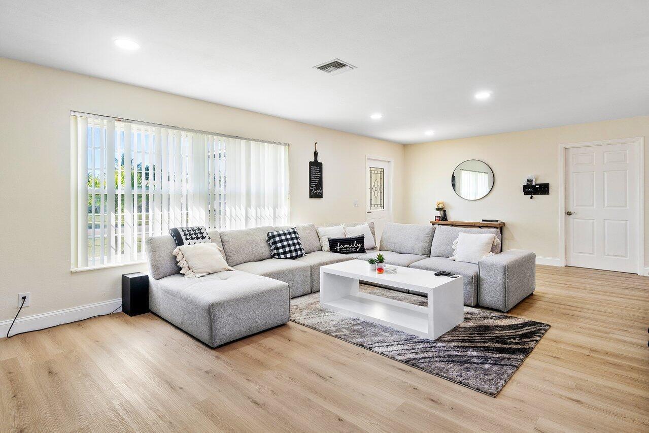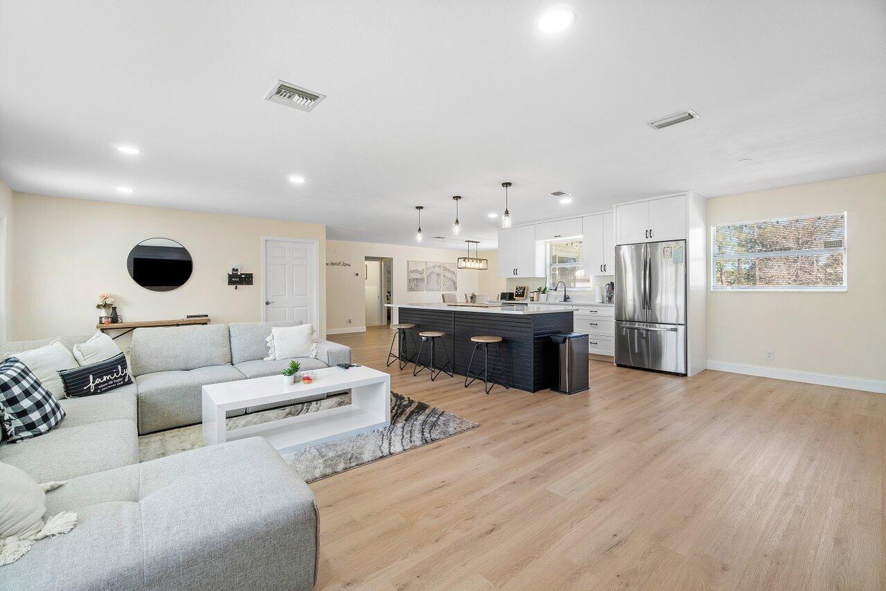 A fully remodeled 3/2 gem that exudes a modern feel. Located close to amazing parks, schools, and just 15 mins from downtown West Palm Beach. Enjoy an open concept split bedroom floor plan, complete with a gorgeous kitchen featuring an island with cooktop, white shaker cabinets & quartz countertops. The living area features a built-in entertainment unit, recessed lighting throughout, and wood laminate floors. This home offers both style and functionality. The spacious master suite boasts a walk-in closet and spa like en suite. Plus, a finished garage adds extra versatility. Nestled within an expansive lot, this residence boasts a large pool and is situated on a canal with a spacious backyard. NO HOA. Really a great home that you don’t want to miss out on!