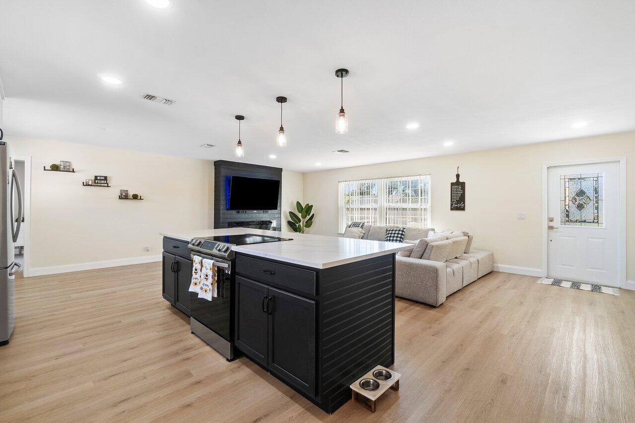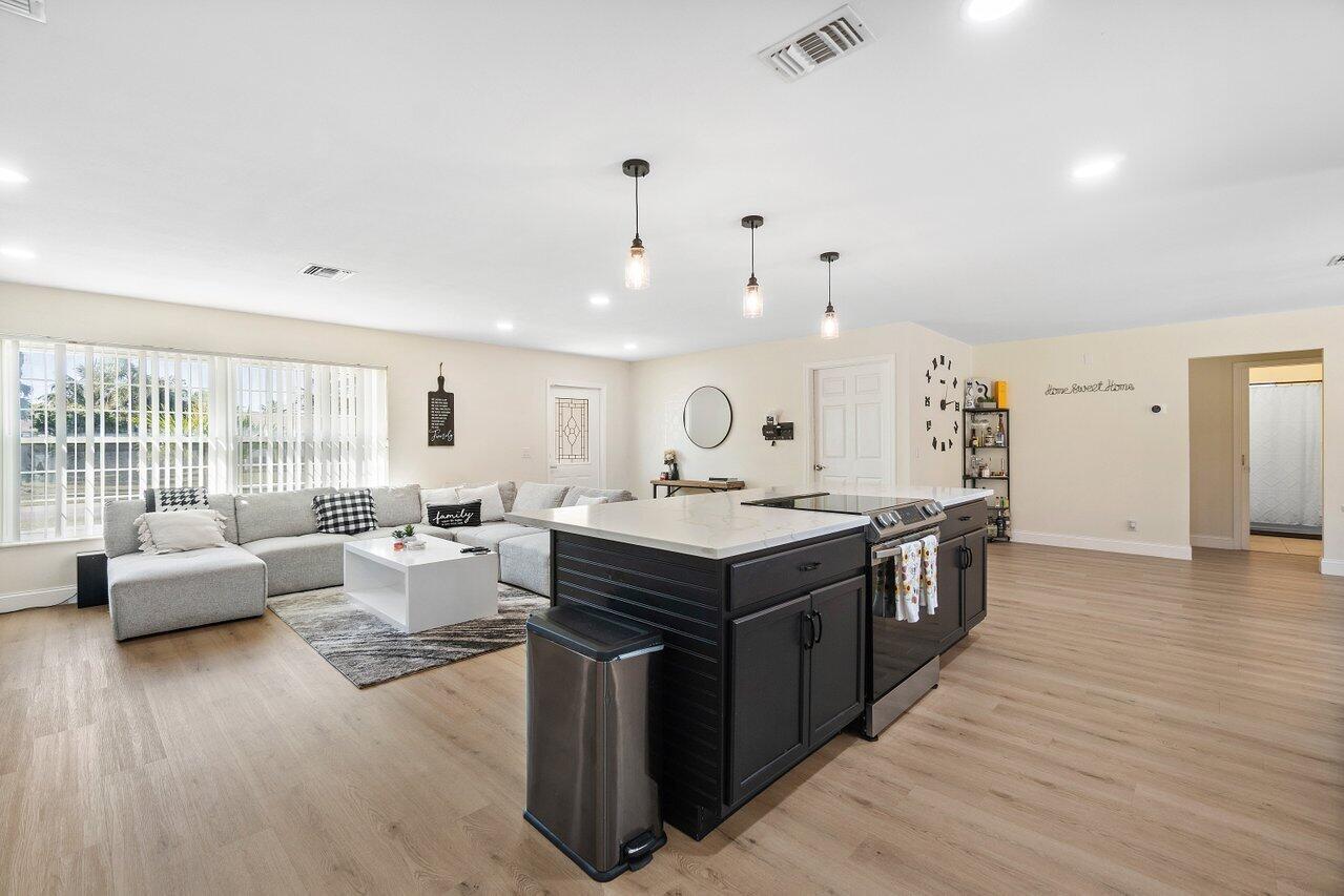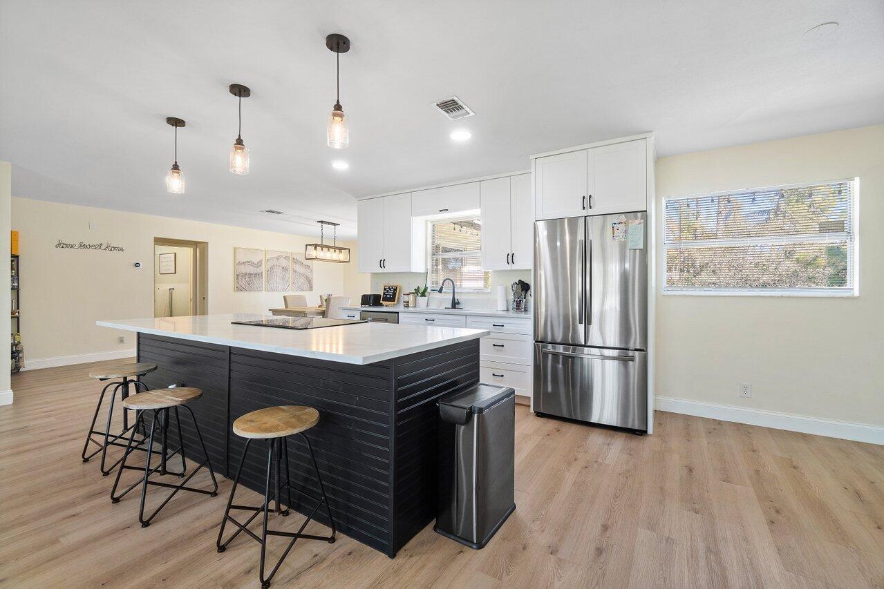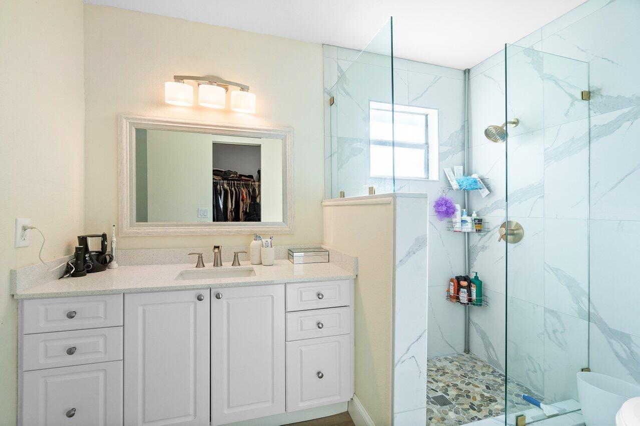 A fully remodeled 3/2 gem that exudes a modern feel. Located close to amazing parks, schools, and just 15 mins from downtown West Palm Beach. Enjoy an open concept split bedroom floor plan, complete with a gorgeous kitchen featuring an island with cooktop, white shaker cabinets & quartz countertops. The living area features a built-in entertainment unit, recessed lighting throughout, and wood laminate floors. This home offers both style and functionality. The spacious master suite boasts a walk-in closet and spa like en suite. Plus, a finished garage adds extra versatility. Nestled within an expansive lot, this residence boasts a large pool and is situated on a canal with a spacious backyard. NO HOA. Really a great home that you don’t want to miss out on!