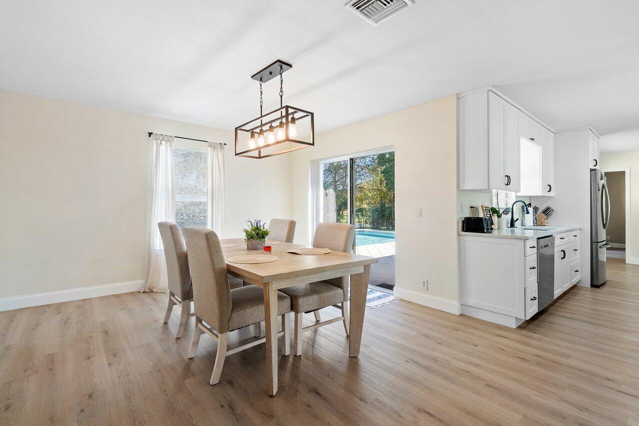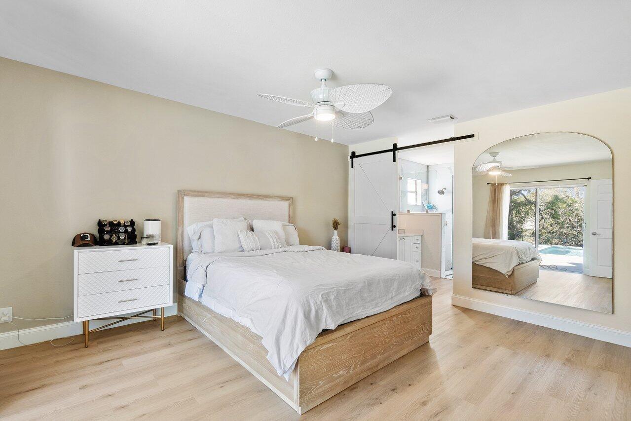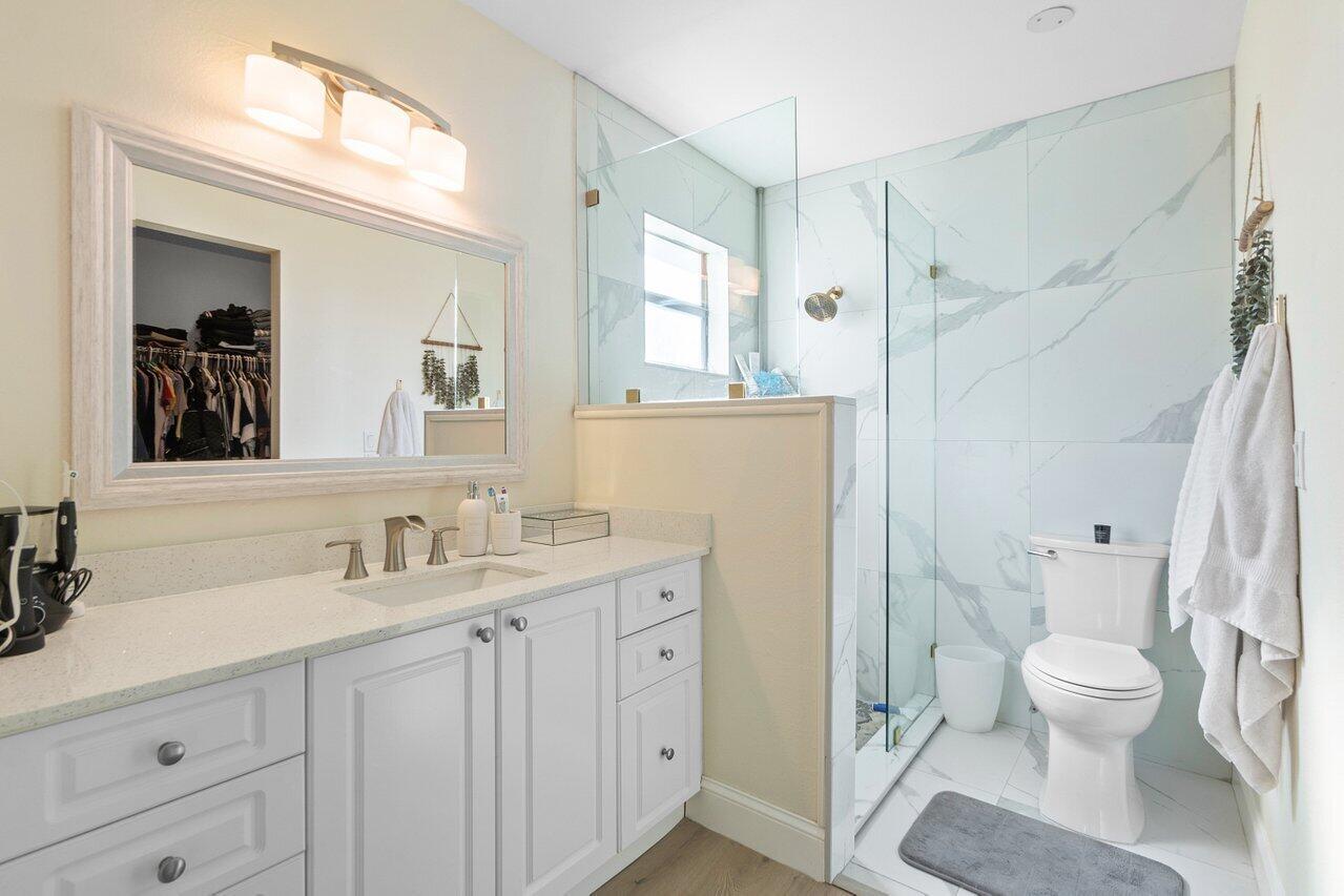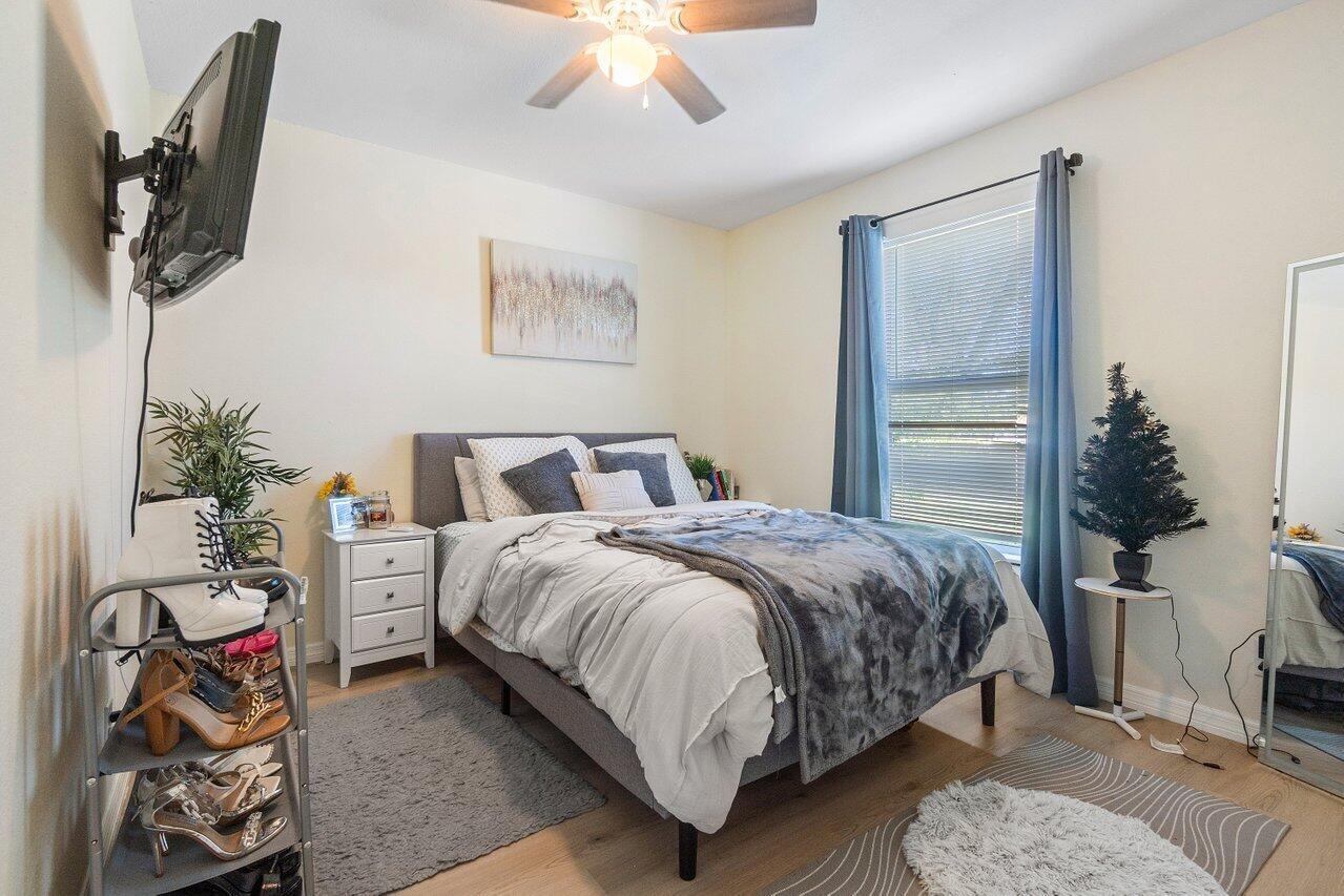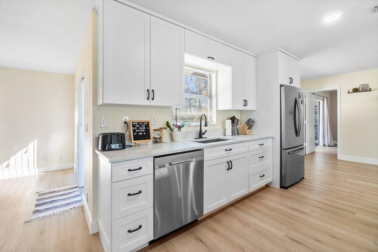 A fully remodeled 3/2 gem that exudes a modern feel. Located close to amazing parks, schools, and just 15 mins from downtown West Palm Beach. Enjoy an open concept split bedroom floor plan, complete with a gorgeous kitchen featuring an island with cooktop, white shaker cabinets & quartz countertops. The living area features a built-in entertainment unit, recessed lighting throughout, and wood laminate floors. This home offers both style and functionality. The spacious master suite boasts a walk-in closet and spa like en suite. Plus, a finished garage adds extra versatility. Nestled within an expansive lot, this residence boasts a large pool and is situated on a canal with a spacious backyard. NO HOA. Really a great home that you don’t want to miss out on!