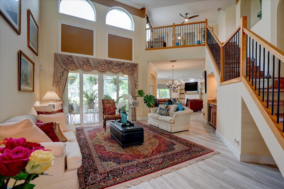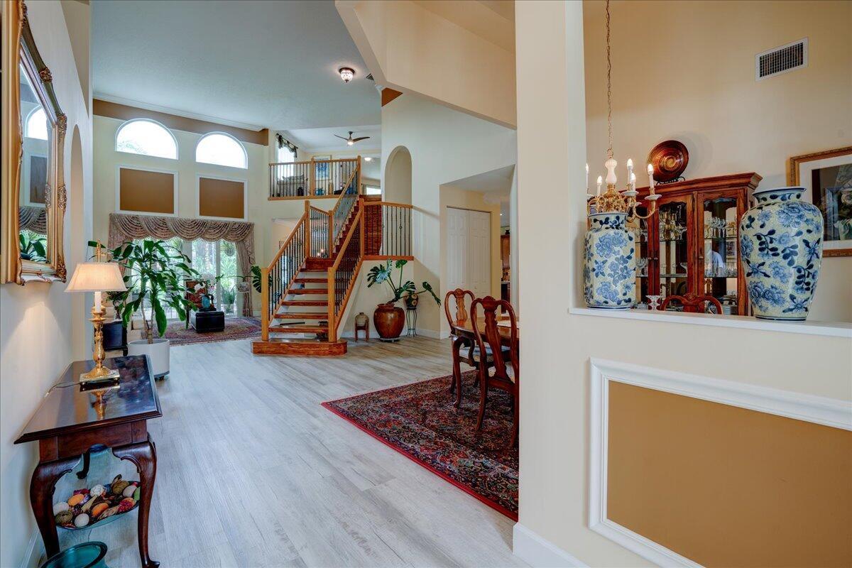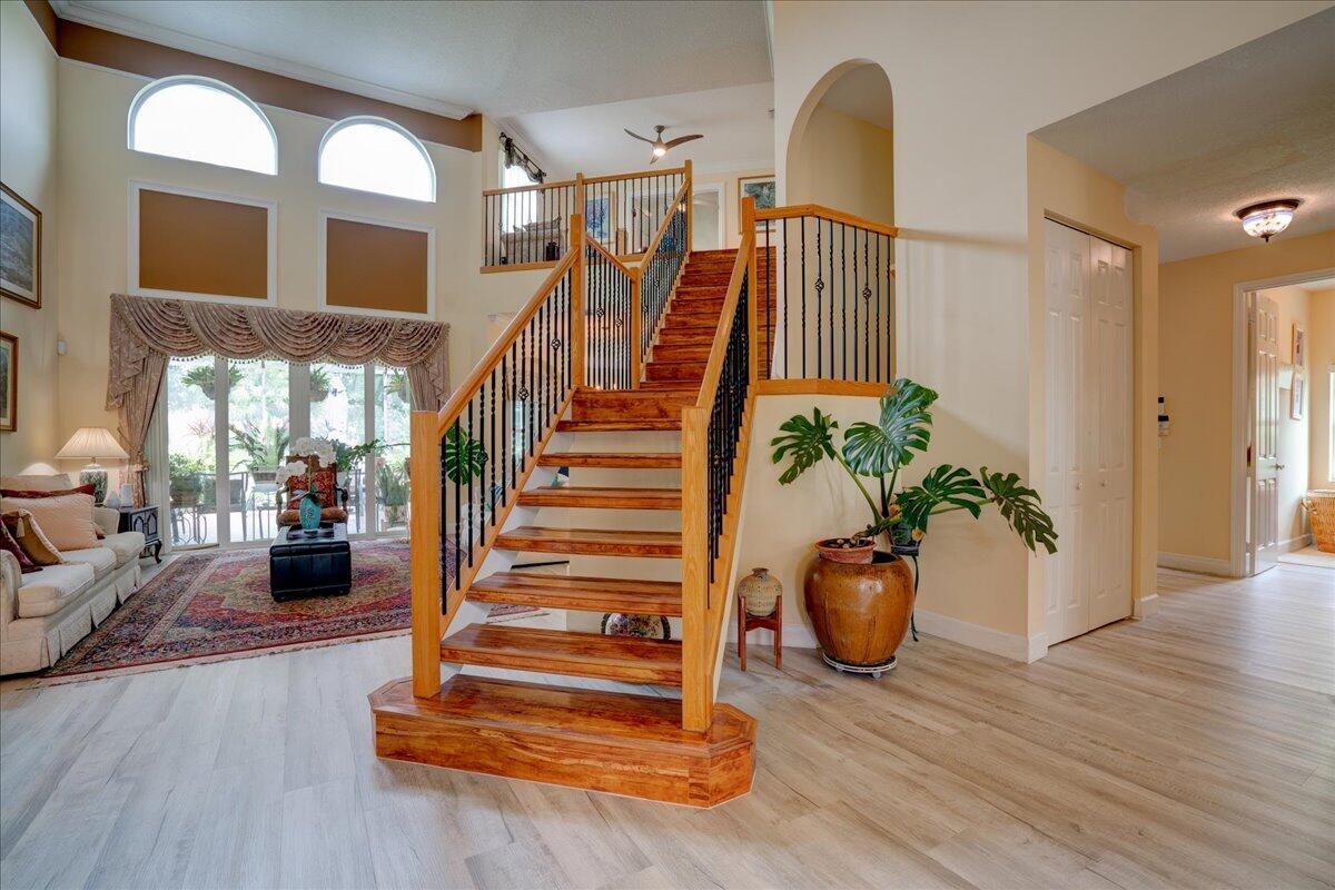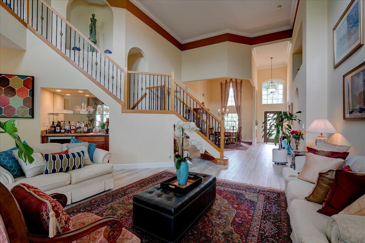 This gorgeous lakefront estate home within the gated community of Stonehaven is a must see. Immediately upon entry you will be in awe by the 20ft ceilings through the main areas of the first floor. The open grand wrought iron staircase has 2 entrances, leading to a huge landing loft area on the second floor. The kitchen is impressive, stainless steel appliances, solid wood cabinetry, granite countertops with a wet bar. The backyard is a paradise with mature fruit trees and plenty of space for entertaining. Did I mention NEW ROOF (8/24), New exterior paint, a 500 gallon Propane Underground tank supplying Whole house Standby Generac generator, Propane Gas stove, Smart sprinkler system supplied from the Lake and so many more Upgrades that cannot be listed. The low HOA fee includes Internet