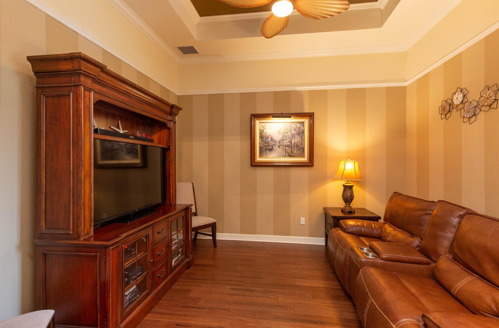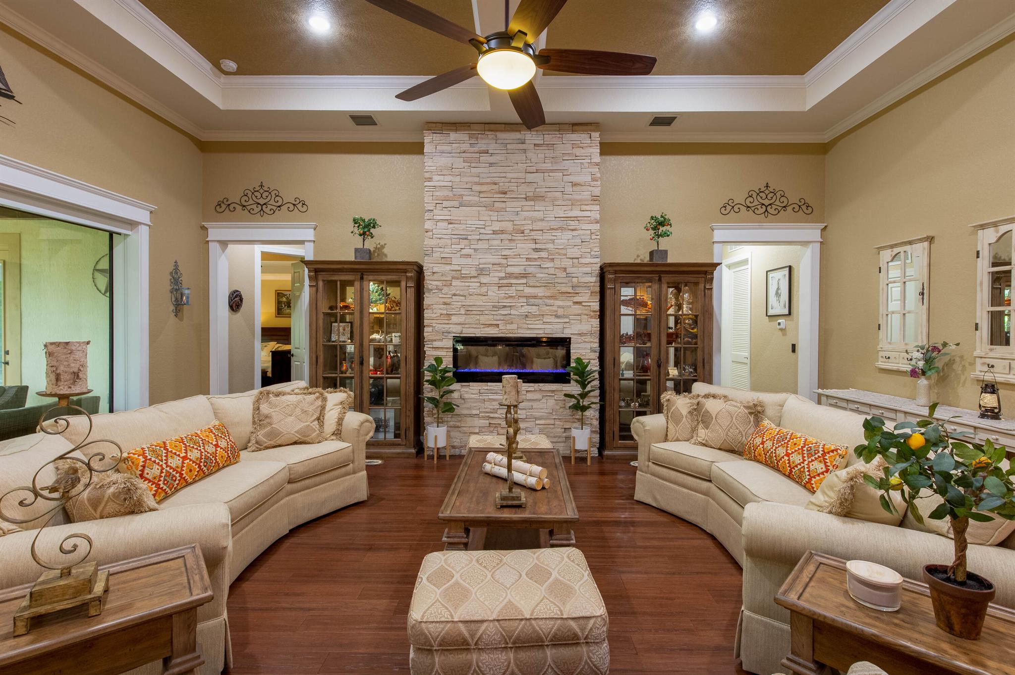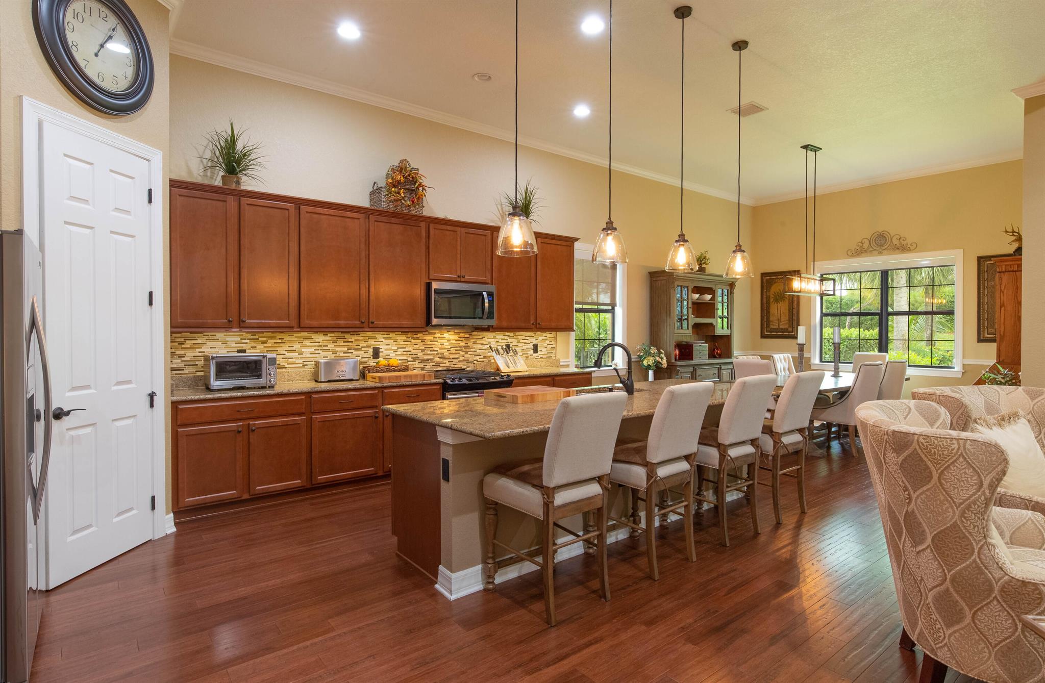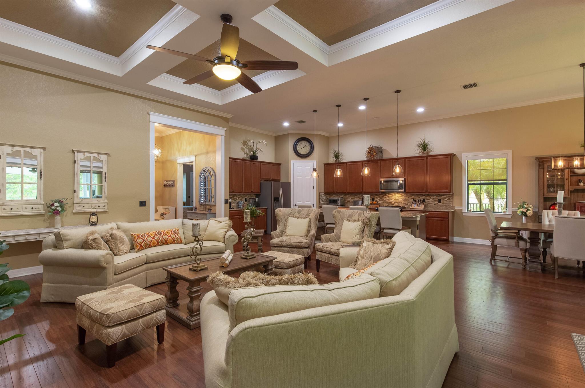 Discover this stunning home in one of Wellington’s most sought-after neighborhoods Castellina, featuring the highly popular Dartmouth model, now available for discerning buyers. Nestled on a serene lot surrounded by nature, this property offers a peaceful retreat.The home boasts a fantastic floor plan, welcoming you with a custom grand entrance unique to this model. Inside, you’ll find an office/den and an open living area with a custom-designed coffered ceiling. The open-concept kitchen is perfect for entertaining, equipped with granite countertops, a beautiful backsplash, upscale cabinets, stainless steel appliances, and a gas cooktop. The space overlooks a striking natural stone wall with an electric fireplace, adding to the home’s charm.