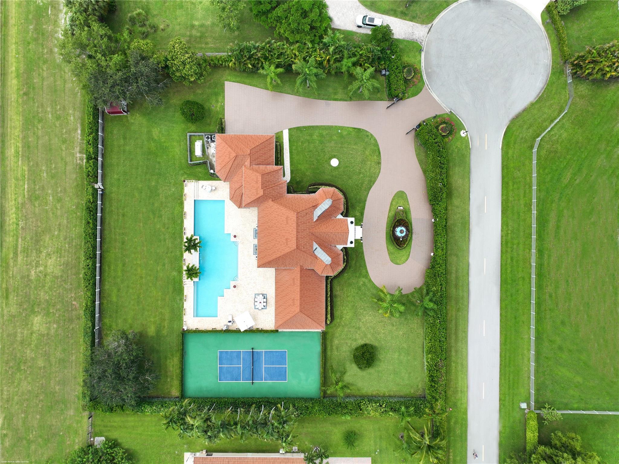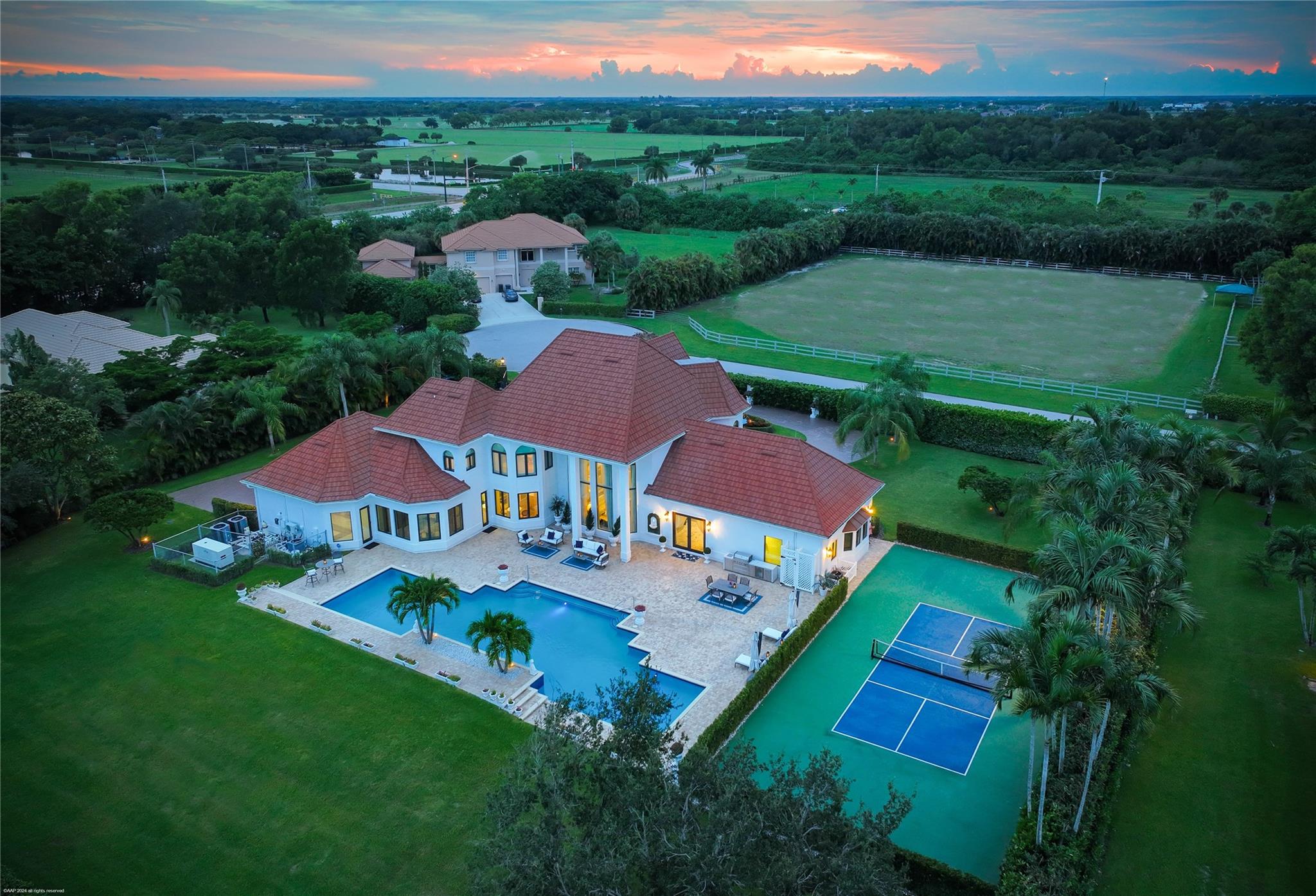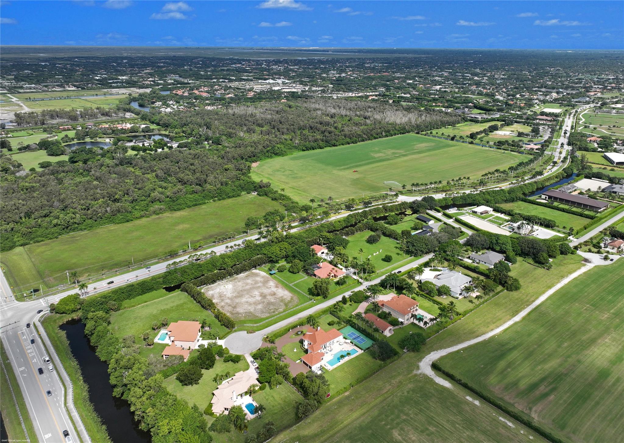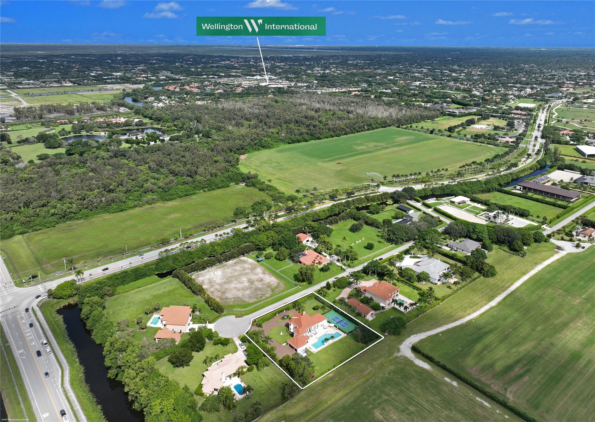 Open floor plan, 30 ft vaulted ceilings for endless views of Polo fields. OMEGA Kitchen, waterfall marble island, built in Thermador appliances. Features 4 bedrooms, 4.5 fully remodeled baths, and 5 car garage. Presidential wood paneled office with fireplace. Oversized saltwater heated pool. Fully paved 3500 sq ft. pool deck with seating for 20. Full Outdoor Kitchen, steel shed, full size Pickle Ball Court. Smart home, Audio Video System, Alarm, Sonos surround sound, and much more!