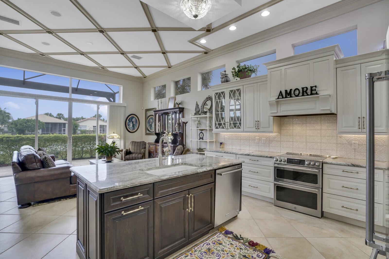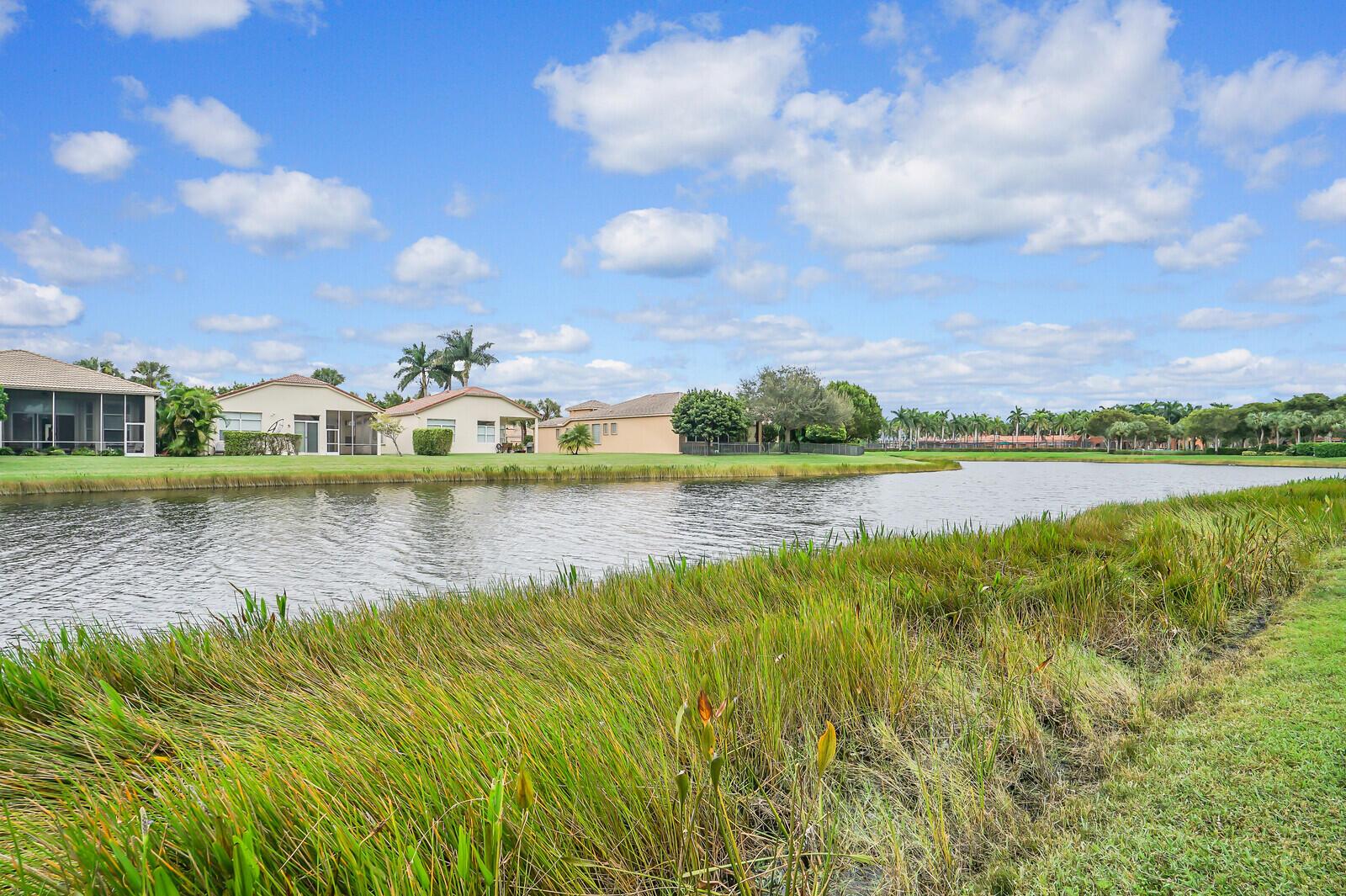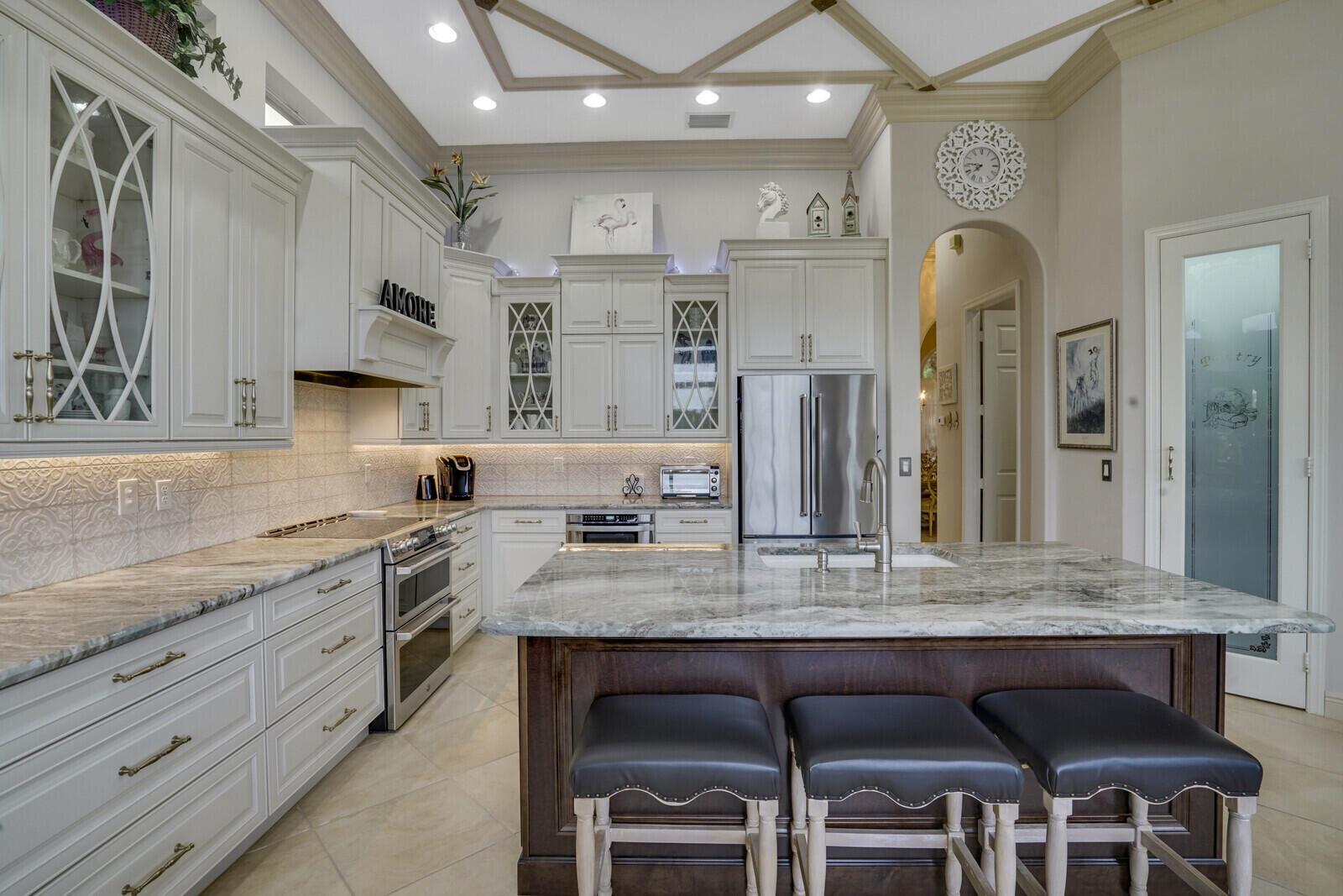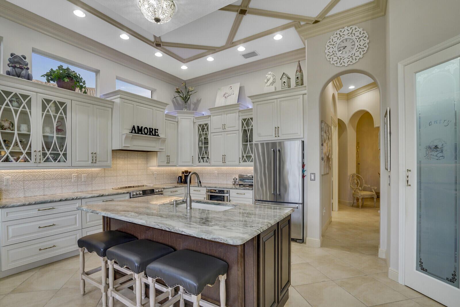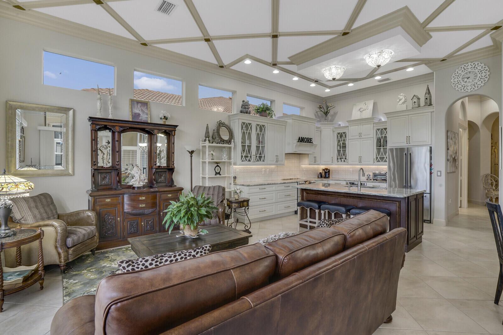 This beautiful 3-bedroom, plus office, 2.5-bathroom lakefront Montego Estate model home offers a spacious and thoughtfully designed layout. With over 2,800 sq. ft. of living space, this home features quality finishes and an open floor plan, perfect for modern living. Neutral tile flooring laid on the diagonal, high-volume ceilings, and elegant crown molding create a bright and welcoming atmosphere. The recently renovated kitchen is the heart of the home, showcasing granite countertops, a center island, upgraded appliances, and tall upper cabinets with detailed moldings. The kitchen flows seamlessly into the sunlit family room, making it an ideal space for entertaining or relaxing. The private master suite boasts coffered ceilings, custom-built walk-in closets, and a luxurious master bath.
