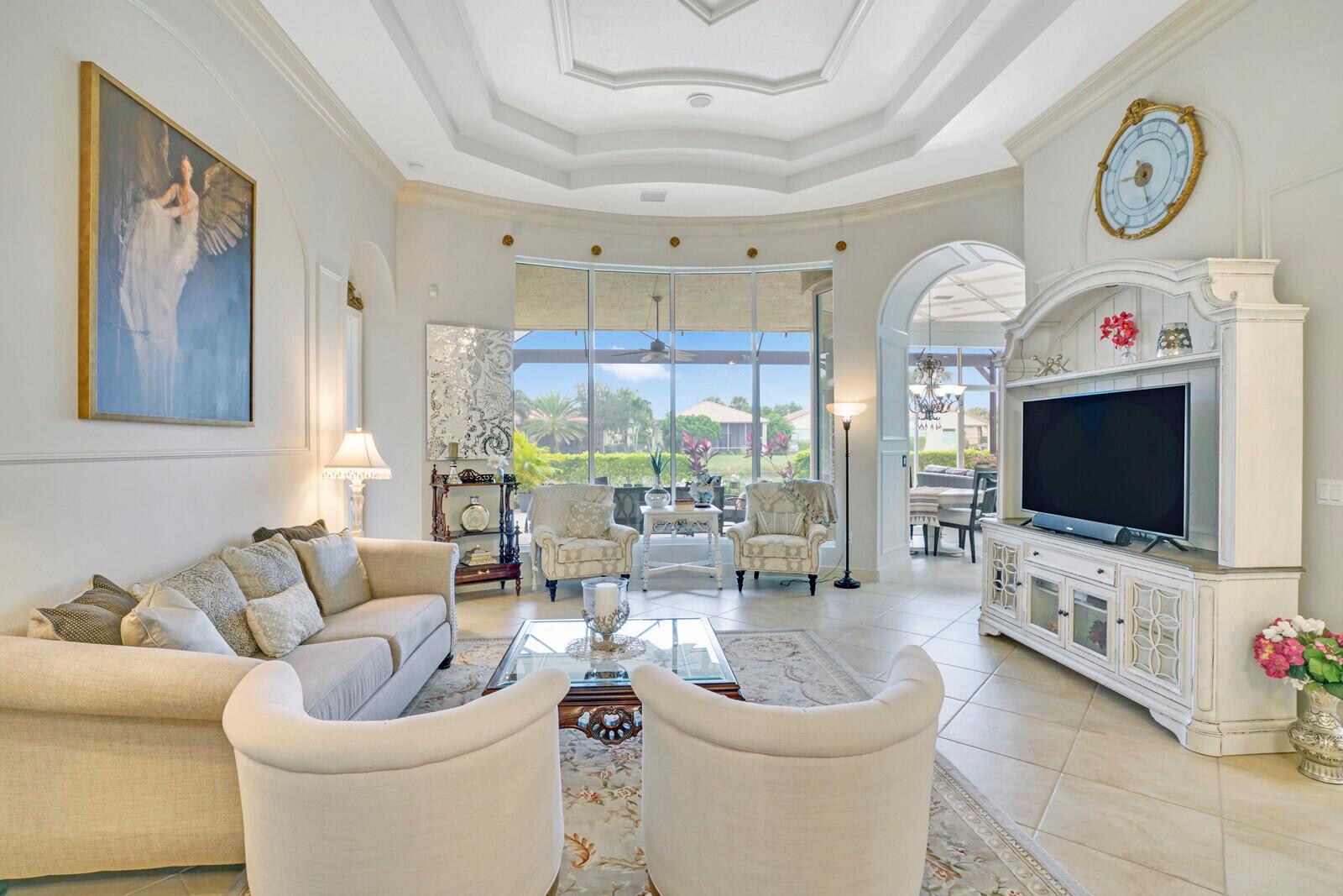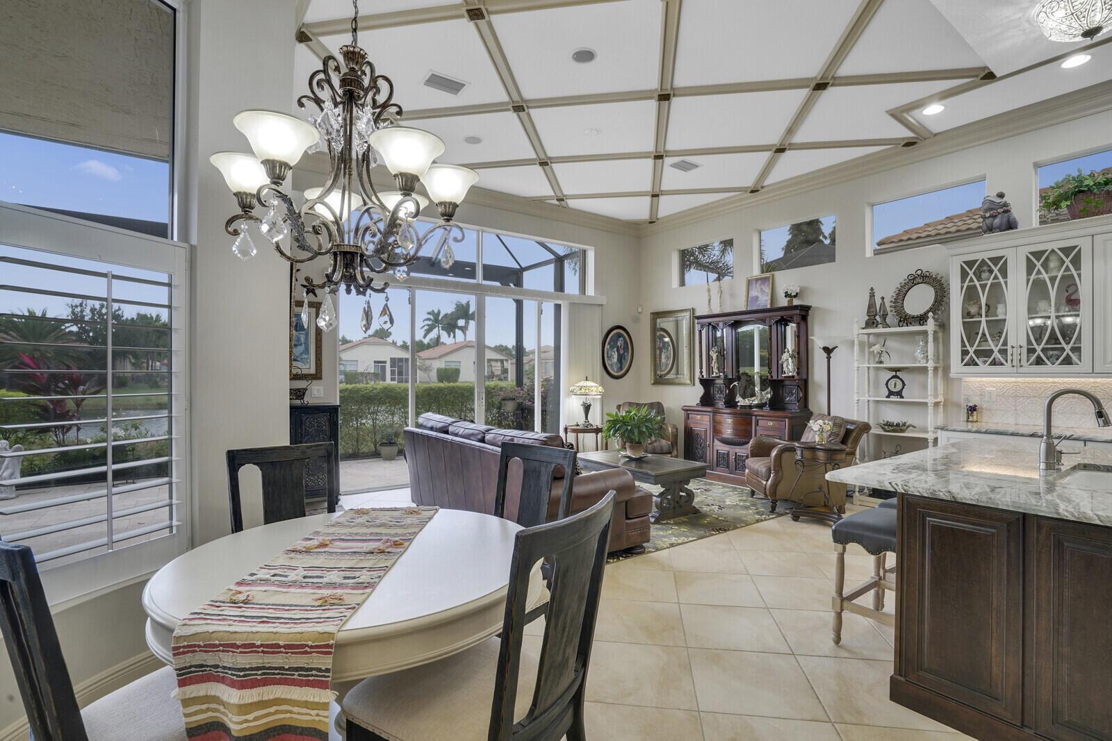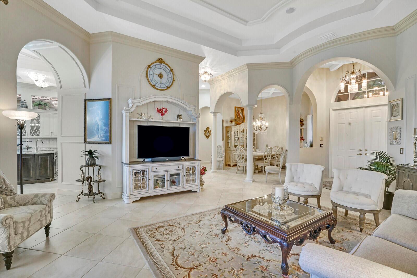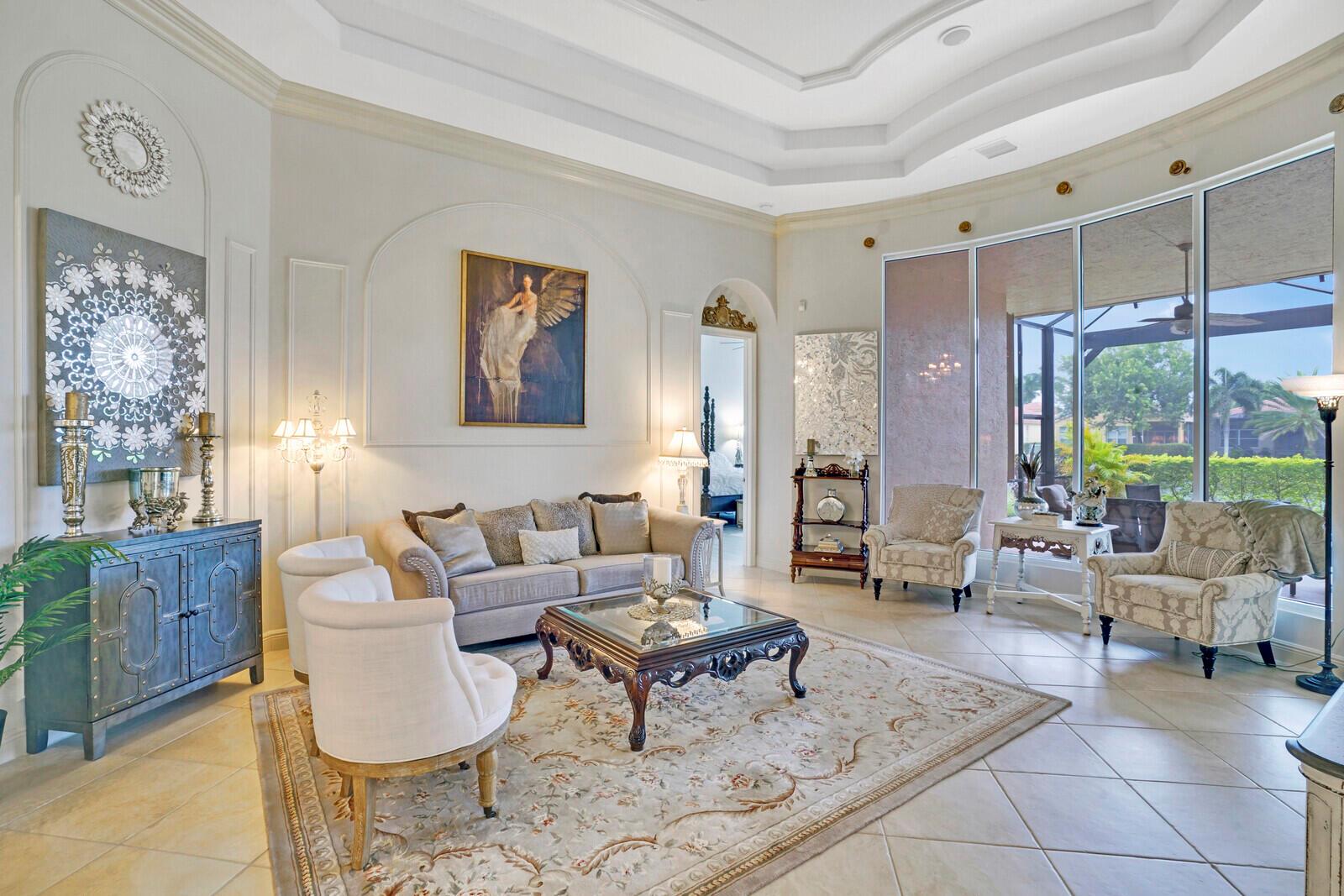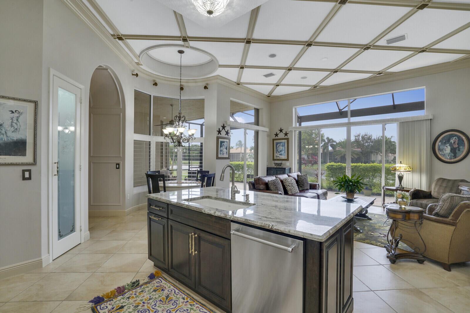 This beautiful 3-bedroom, plus office, 2.5-bathroom lakefront Montego Estate model home offers a spacious and thoughtfully designed layout. With over 2,800 sq. ft. of living space, this home features quality finishes and an open floor plan, perfect for modern living. Neutral tile flooring laid on the diagonal, high-volume ceilings, and elegant crown molding create a bright and welcoming atmosphere. The recently renovated kitchen is the heart of the home, showcasing granite countertops, a center island, upgraded appliances, and tall upper cabinets with detailed moldings. The kitchen flows seamlessly into the sunlit family room, making it an ideal space for entertaining or relaxing. The private master suite boasts coffered ceilings, custom-built walk-in closets, and a luxurious master bath.