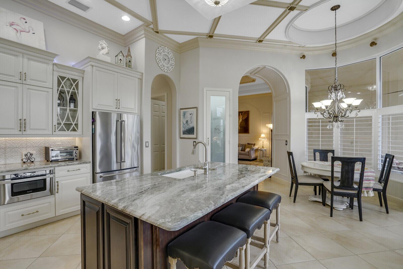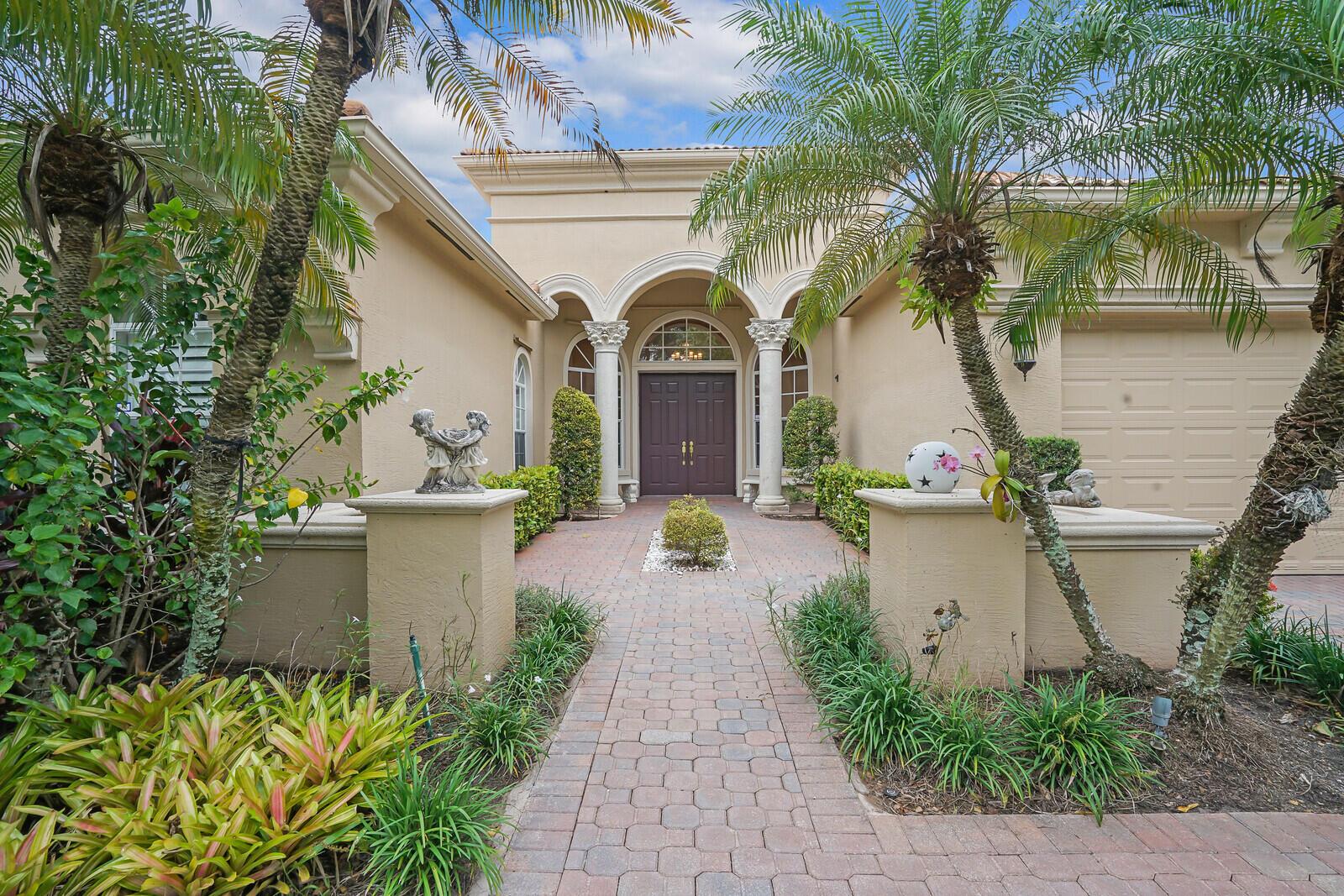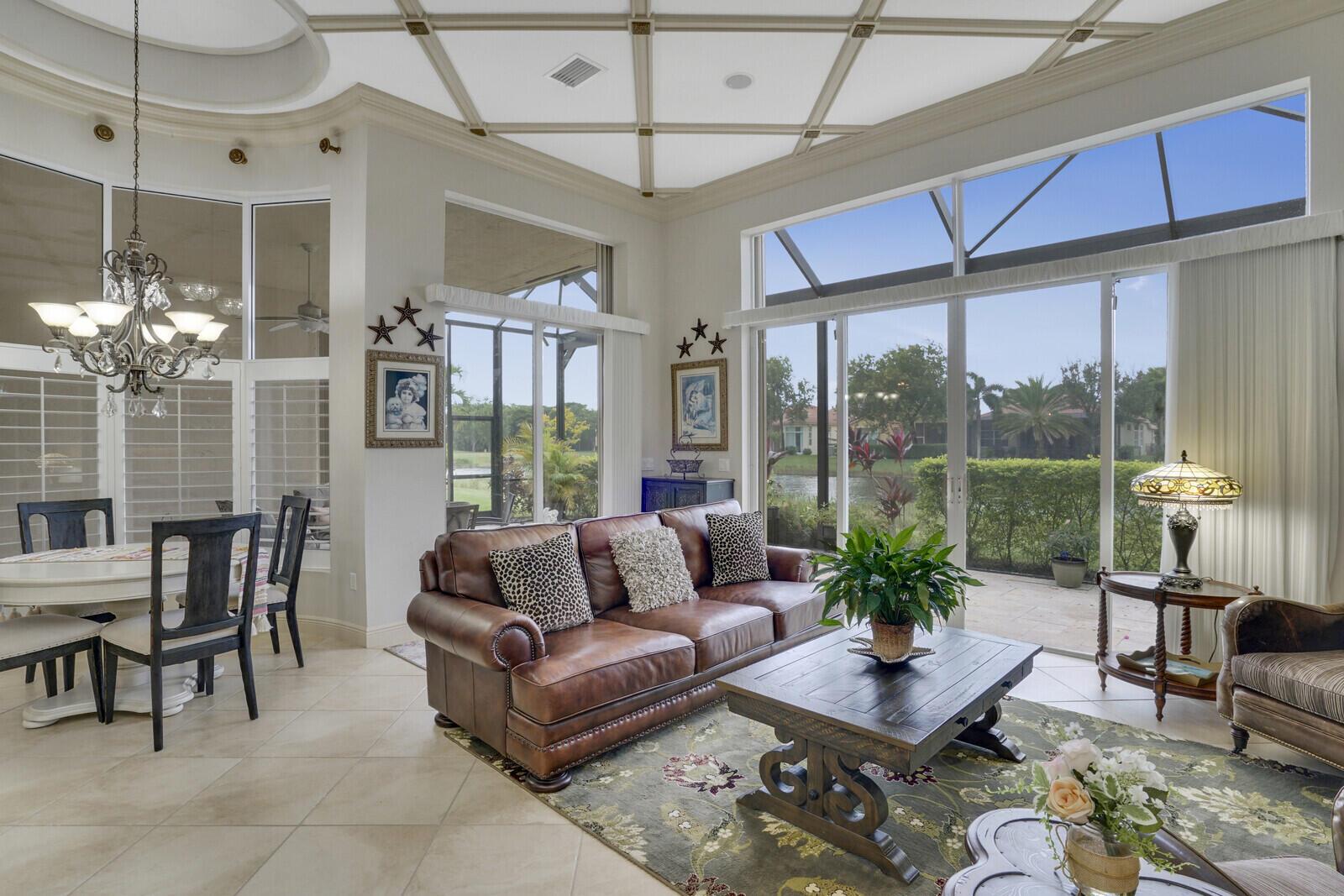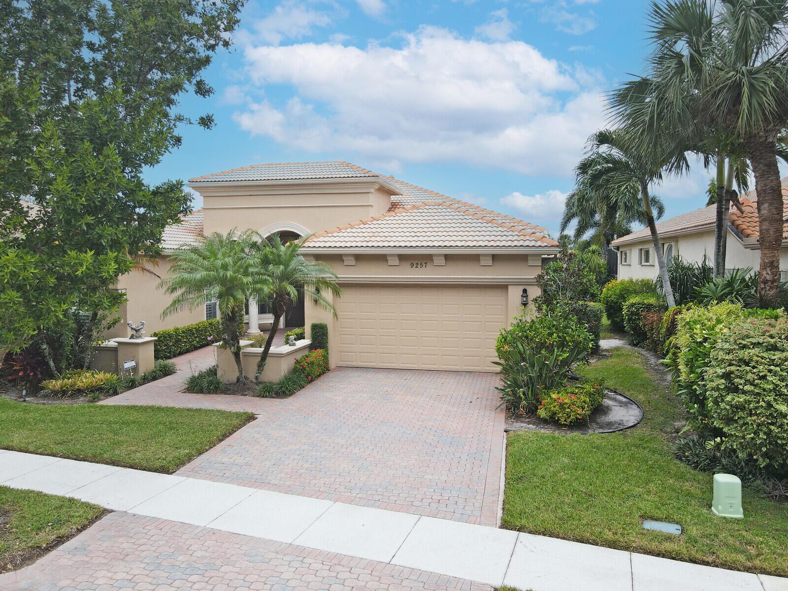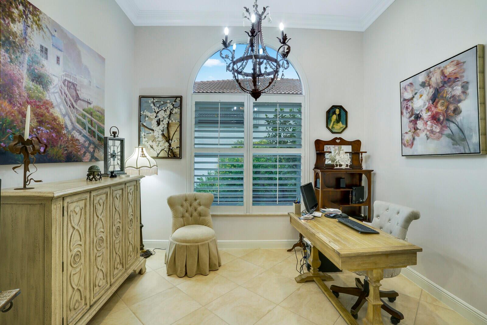 This beautiful 3-bedroom, plus office, 2.5-bathroom lakefront Montego Estate model home offers a spacious and thoughtfully designed layout. With over 2,800 sq. ft. of living space, this home features quality finishes and an open floor plan, perfect for modern living. Neutral tile flooring laid on the diagonal, high-volume ceilings, and elegant crown molding create a bright and welcoming atmosphere. The recently renovated kitchen is the heart of the home, showcasing granite countertops, a center island, upgraded appliances, and tall upper cabinets with detailed moldings. The kitchen flows seamlessly into the sunlit family room, making it an ideal space for entertaining or relaxing. The private master suite boasts coffered ceilings, custom-built walk-in closets, and a luxurious master bath.