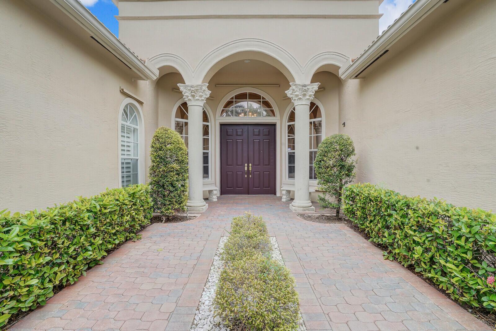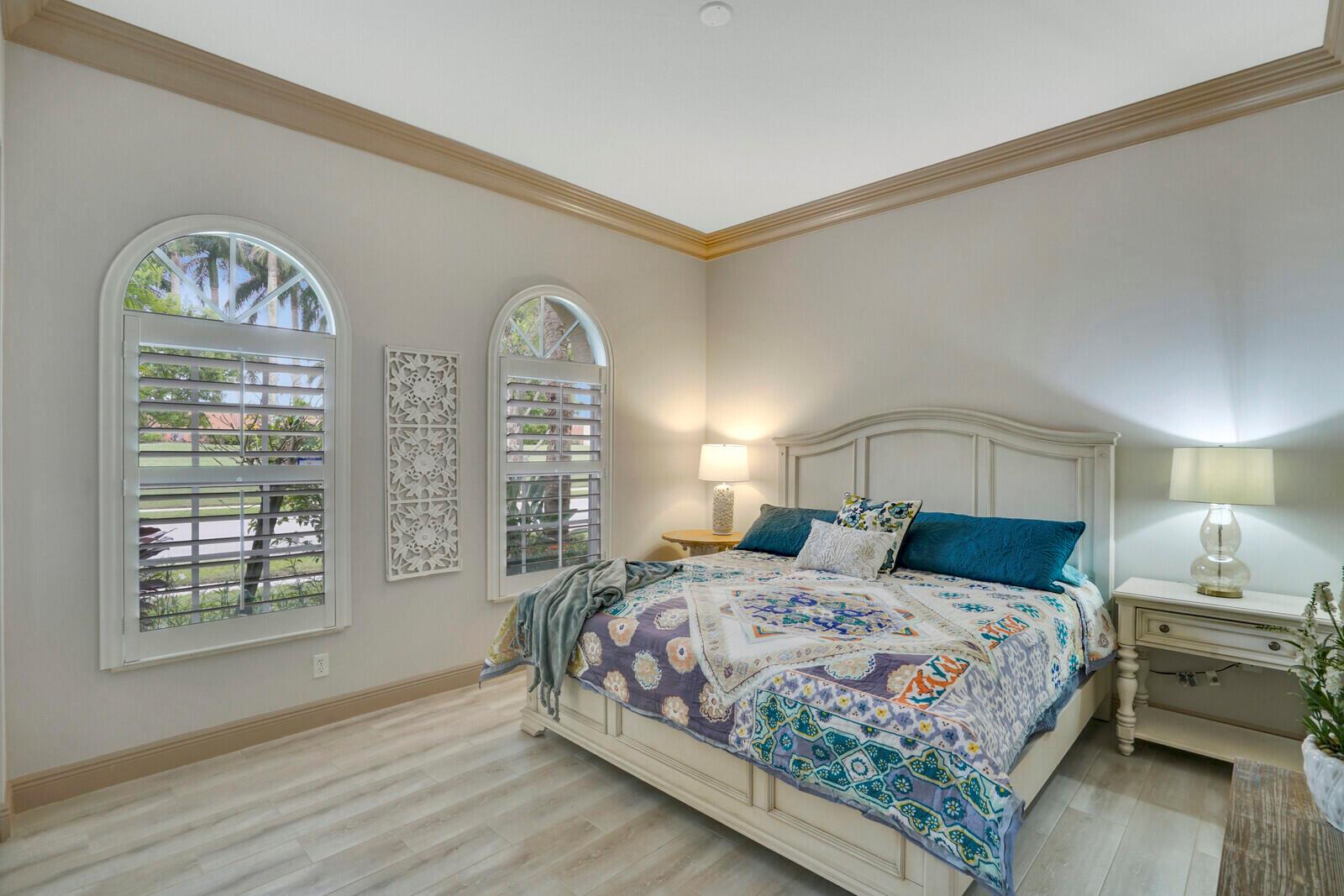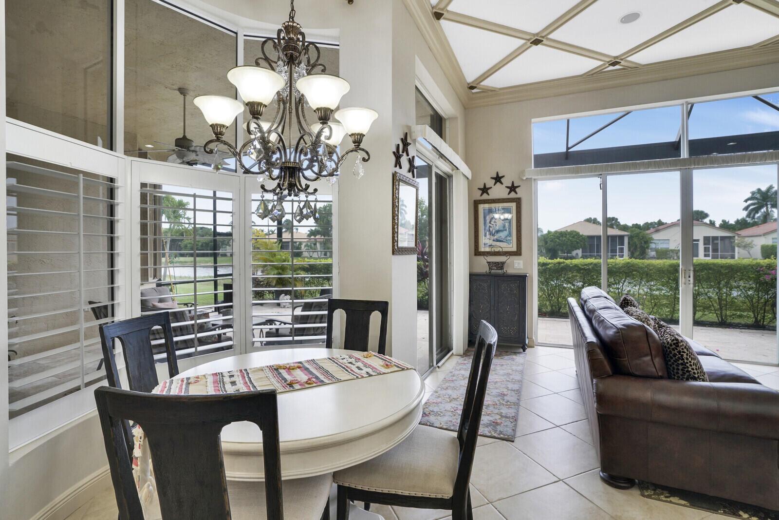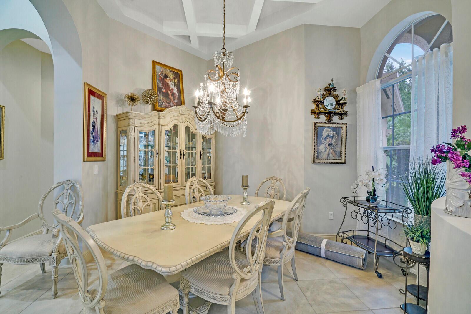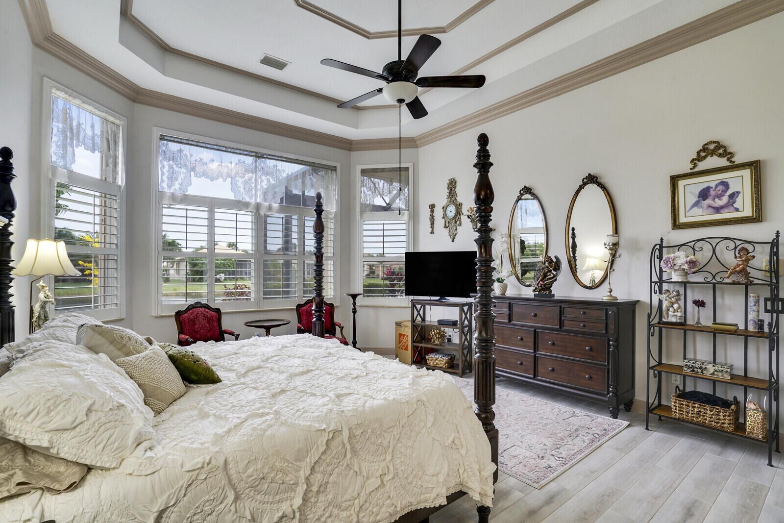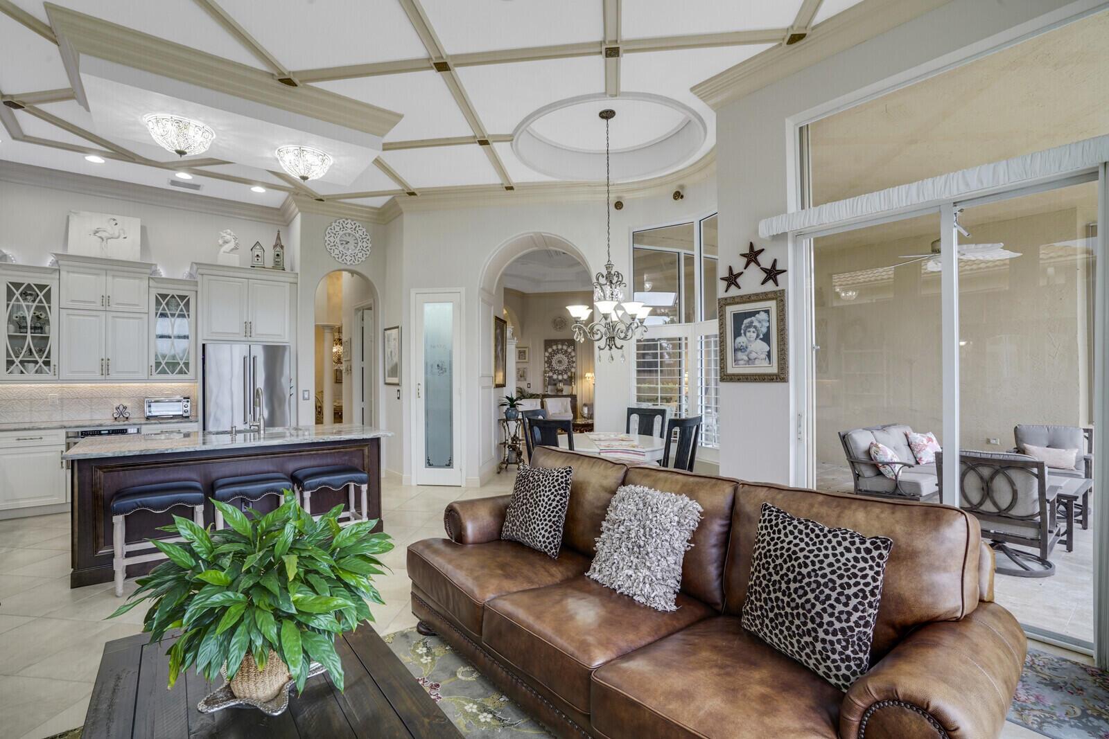 This beautiful 3-bedroom, plus office, 2.5-bathroom lakefront Montego Estate model home offers a spacious and thoughtfully designed layout. With over 2,800 sq. ft. of living space, this home features quality finishes and an open floor plan, perfect for modern living. Neutral tile flooring laid on the diagonal, high-volume ceilings, and elegant crown molding create a bright and welcoming atmosphere. The recently renovated kitchen is the heart of the home, showcasing granite countertops, a center island, upgraded appliances, and tall upper cabinets with detailed moldings. The kitchen flows seamlessly into the sunlit family room, making it an ideal space for entertaining or relaxing. The private master suite boasts coffered ceilings, custom-built walk-in closets, and a luxurious master bath.