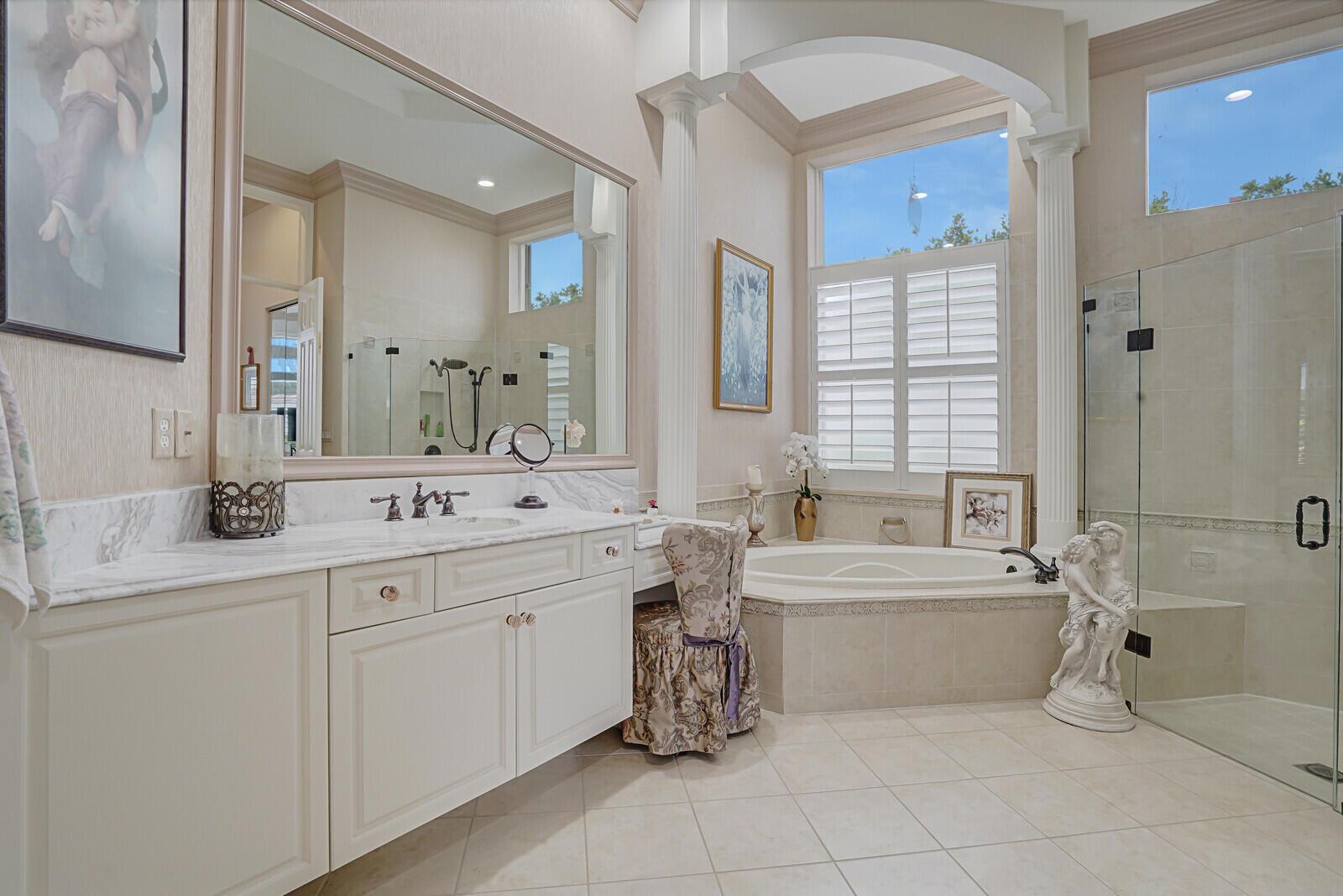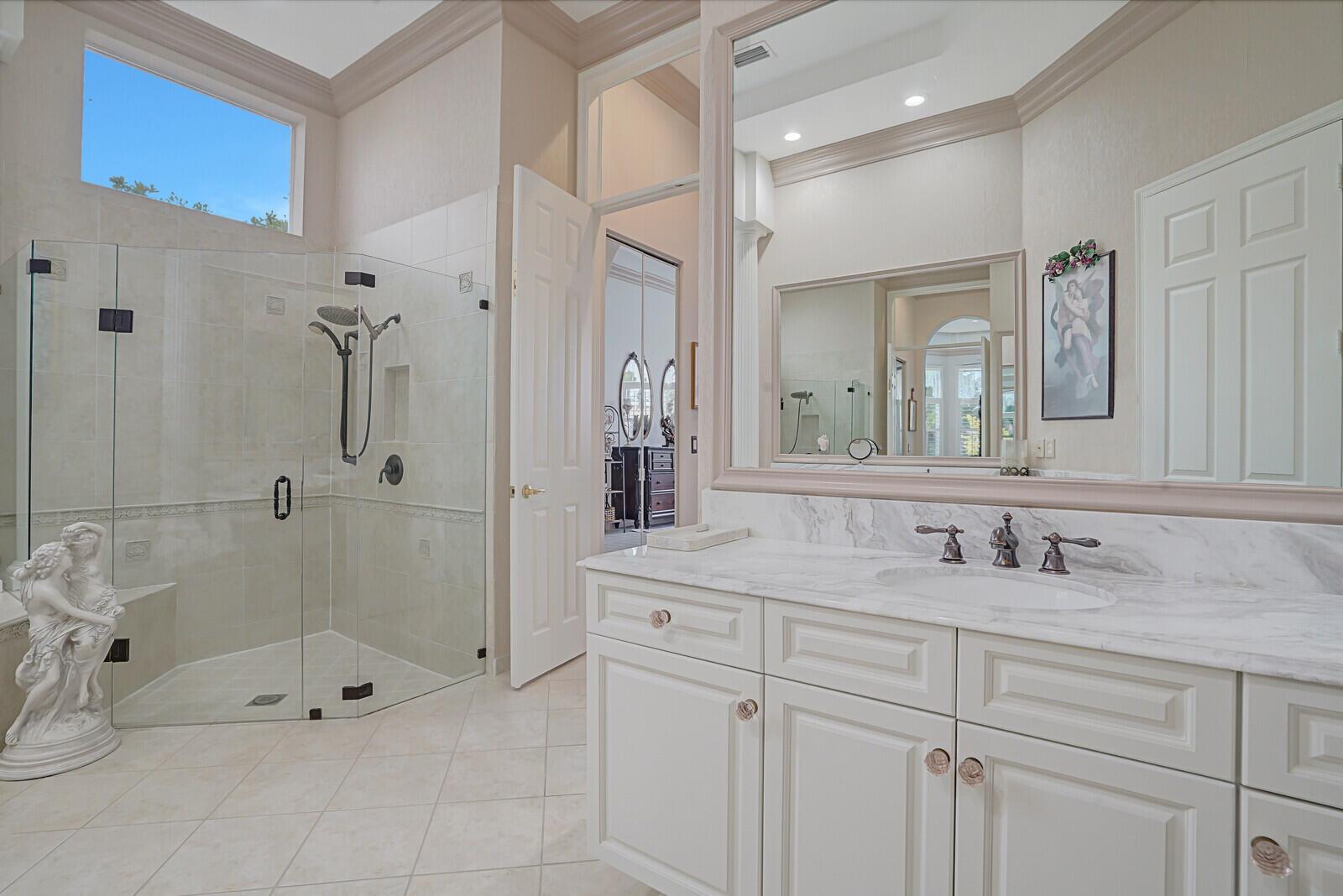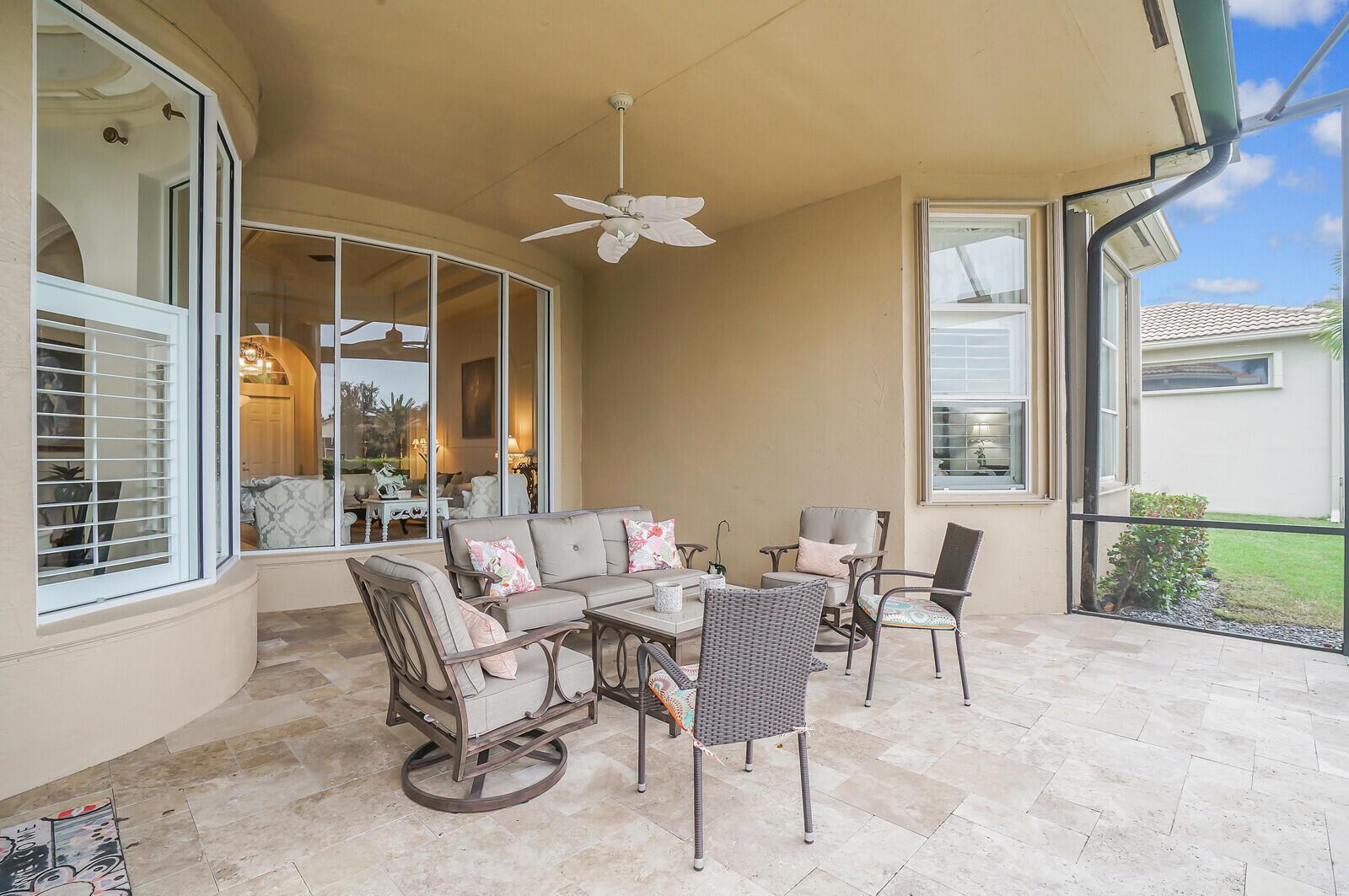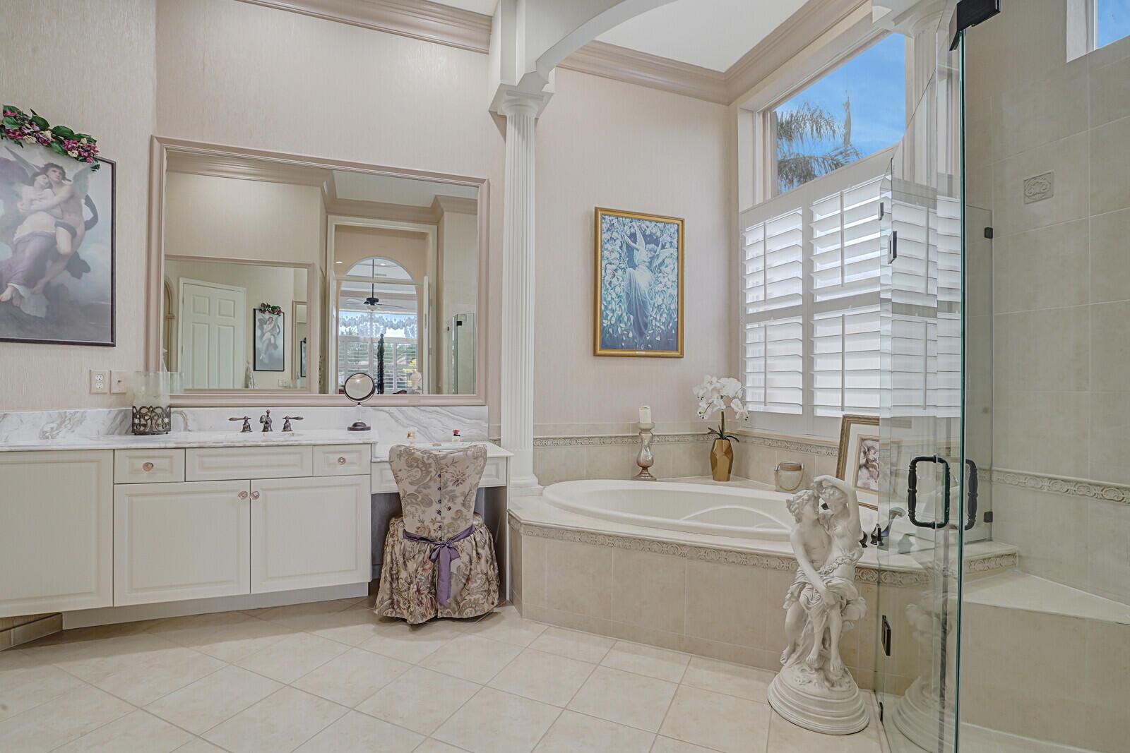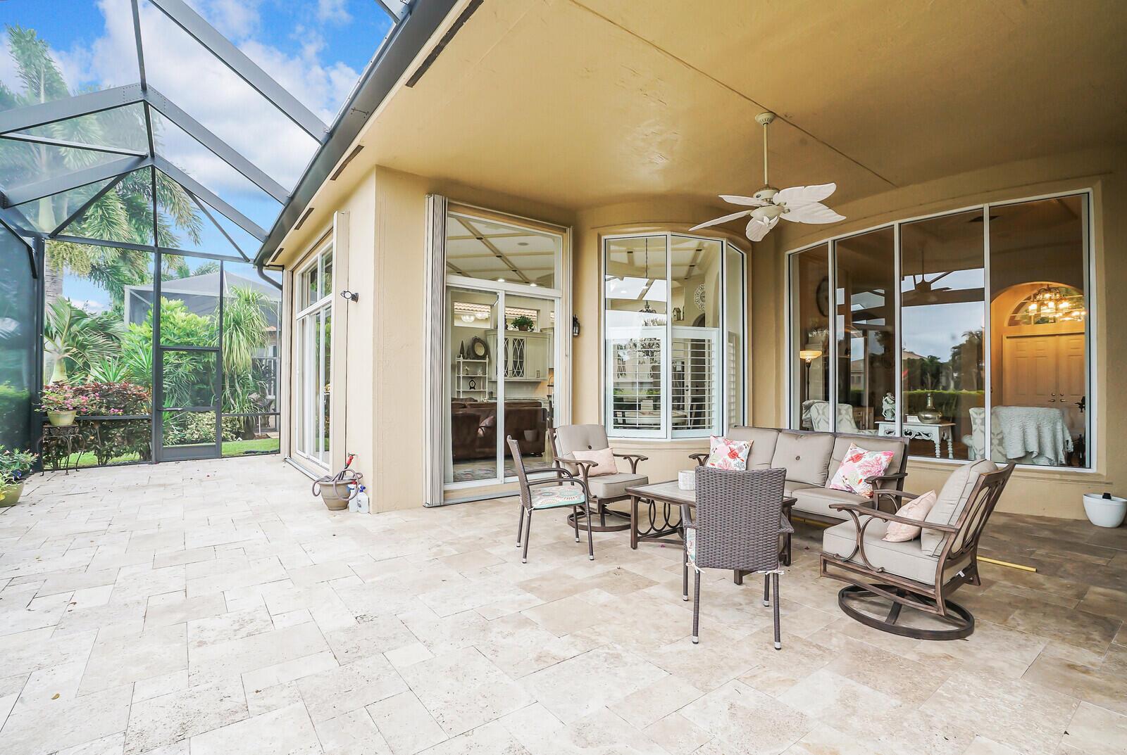 This beautiful 3-bedroom, plus office, 2.5-bathroom lakefront Montego Estate model home offers a spacious and thoughtfully designed layout. With over 2,800 sq. ft. of living space, this home features quality finishes and an open floor plan, perfect for modern living. Neutral tile flooring laid on the diagonal, high-volume ceilings, and elegant crown molding create a bright and welcoming atmosphere. The recently renovated kitchen is the heart of the home, showcasing granite countertops, a center island, upgraded appliances, and tall upper cabinets with detailed moldings. The kitchen flows seamlessly into the sunlit family room, making it an ideal space for entertaining or relaxing. The private master suite boasts coffered ceilings, custom-built walk-in closets, and a luxurious master bath.