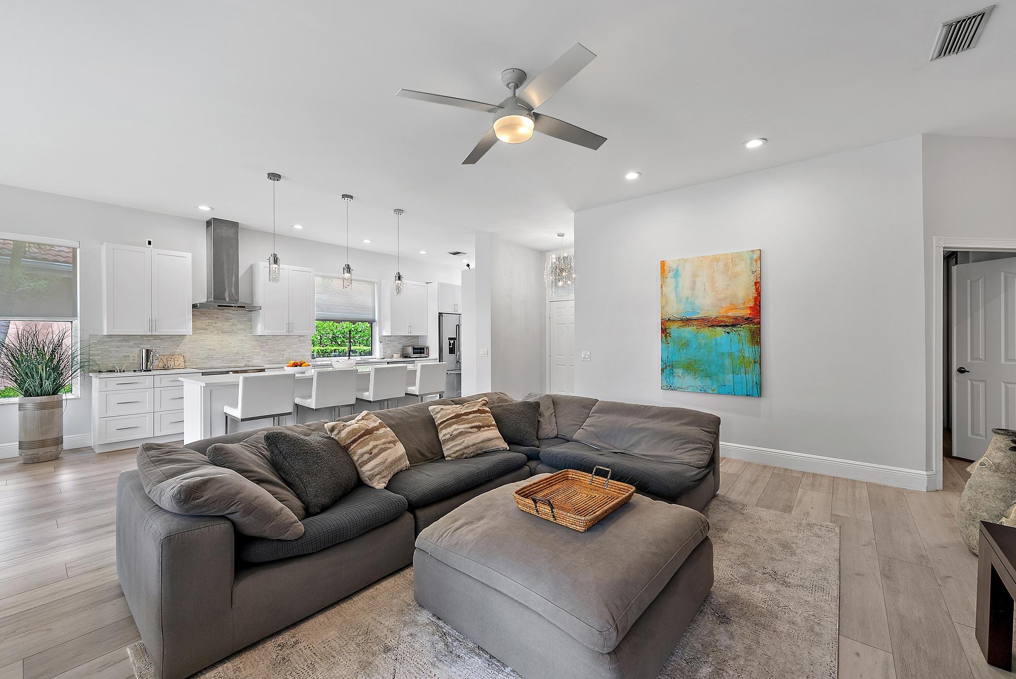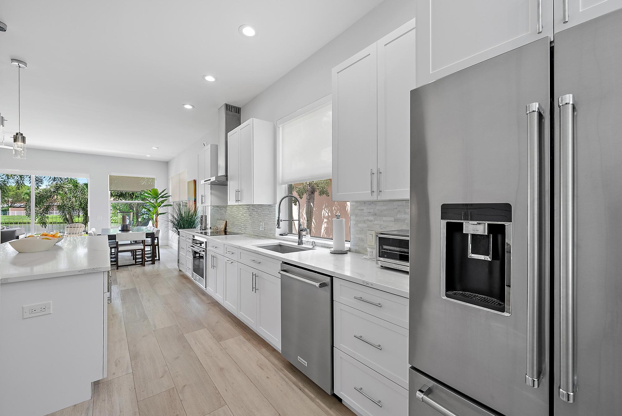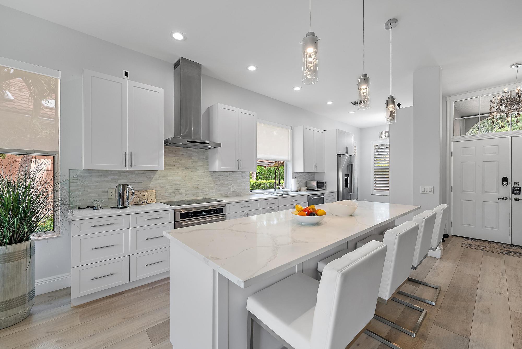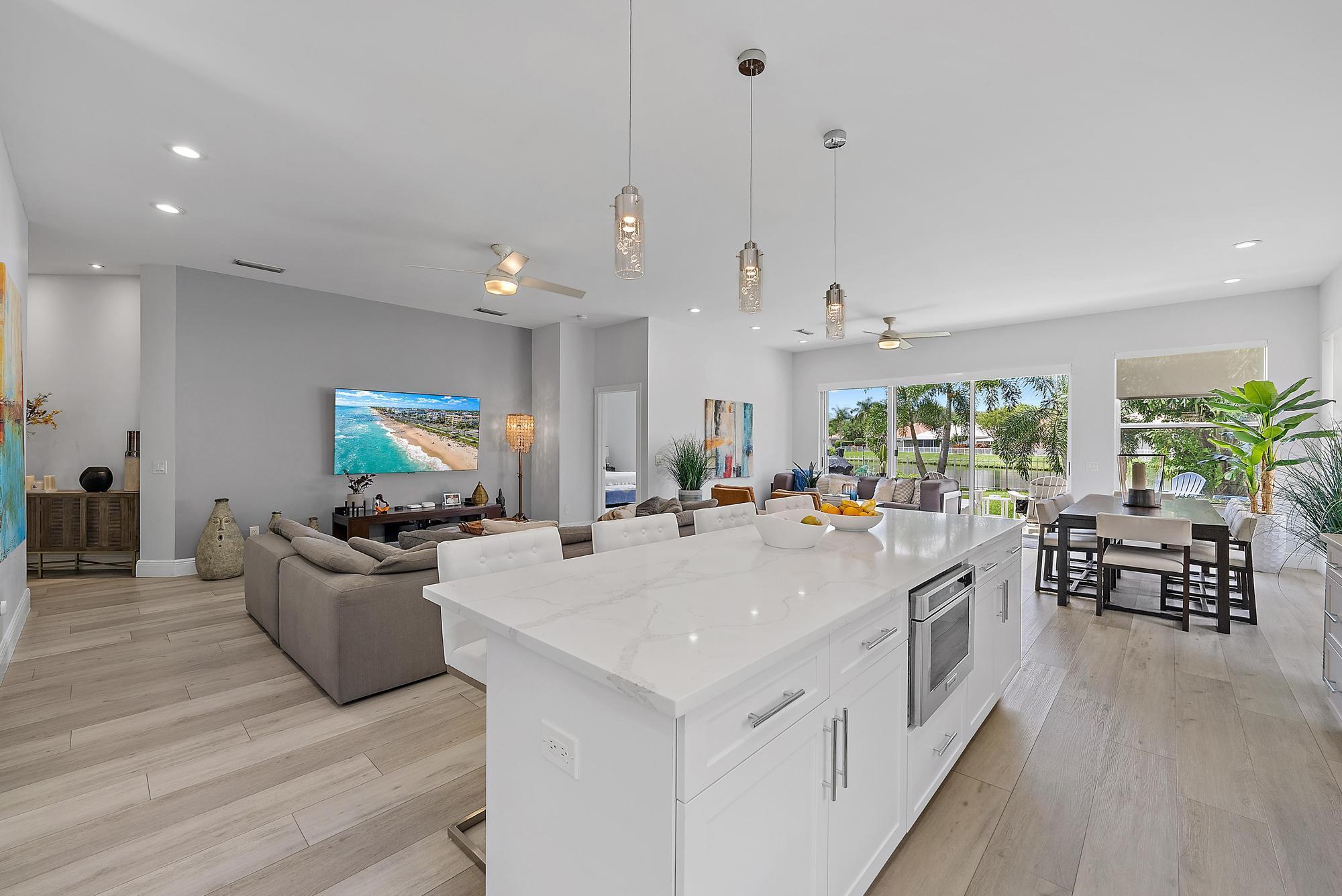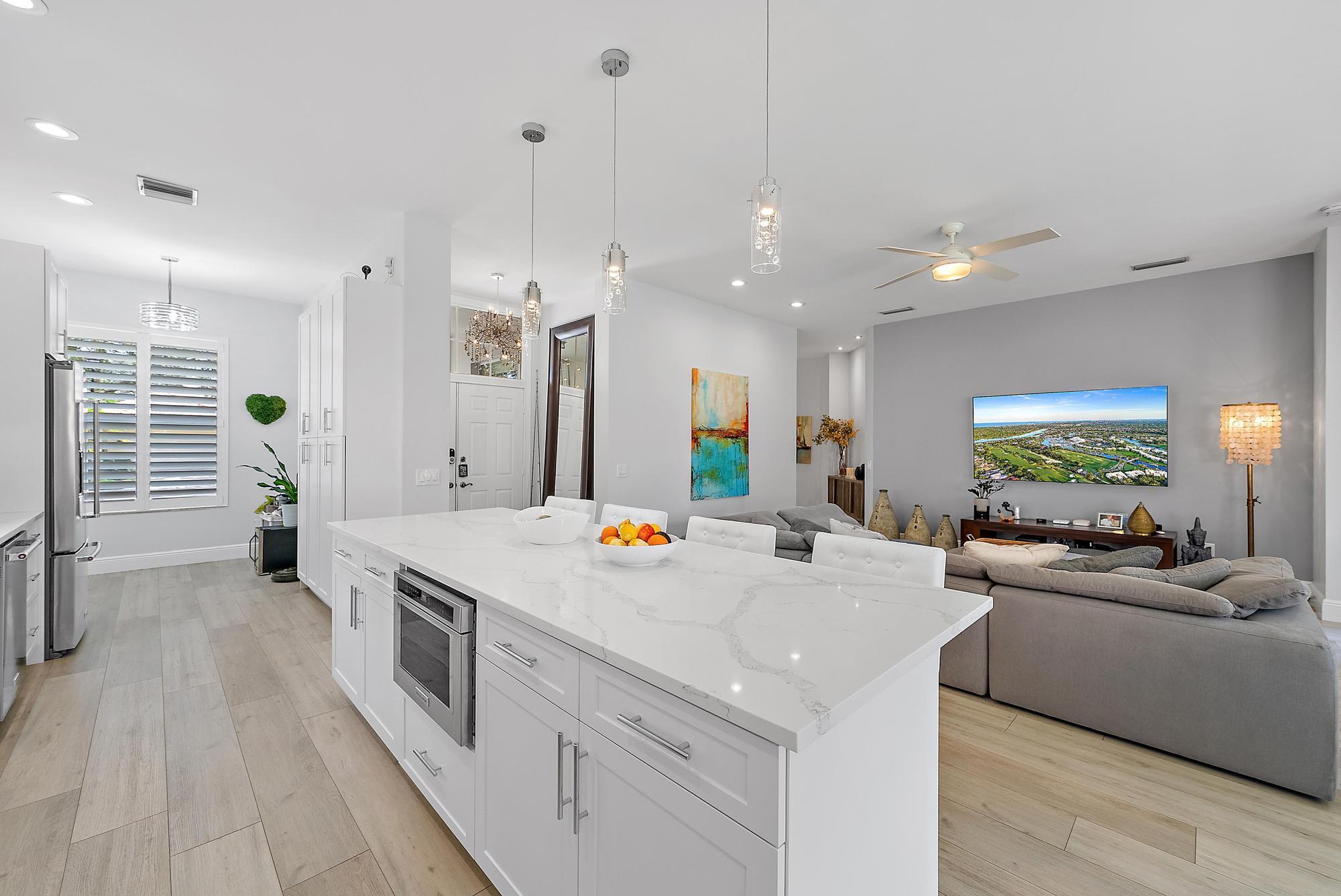 Nestled in the heart of Jupiter, this exquisite Divosta home is perfectly positioned on a beautiful lakefront lot. This expansive home offers 3 spacious bedrooms and 2 luxurious bathrooms, all within 1,975 square feet of thoughtfully designed living space. Upon entering, the bright and open layout greets you with modern vinyl flooring throughout and tile in the bathrooms. The home has been thoughtfully updated to feature smooth ceilings, providing a sleek, modern look, while plumbing and electrical systems have also been upgraded for added convenience.The open-concept kitchen is perfect for both everyday living and entertaining. It seamlessly connects to the family, living, and dining areas, creating a harmonious flow.