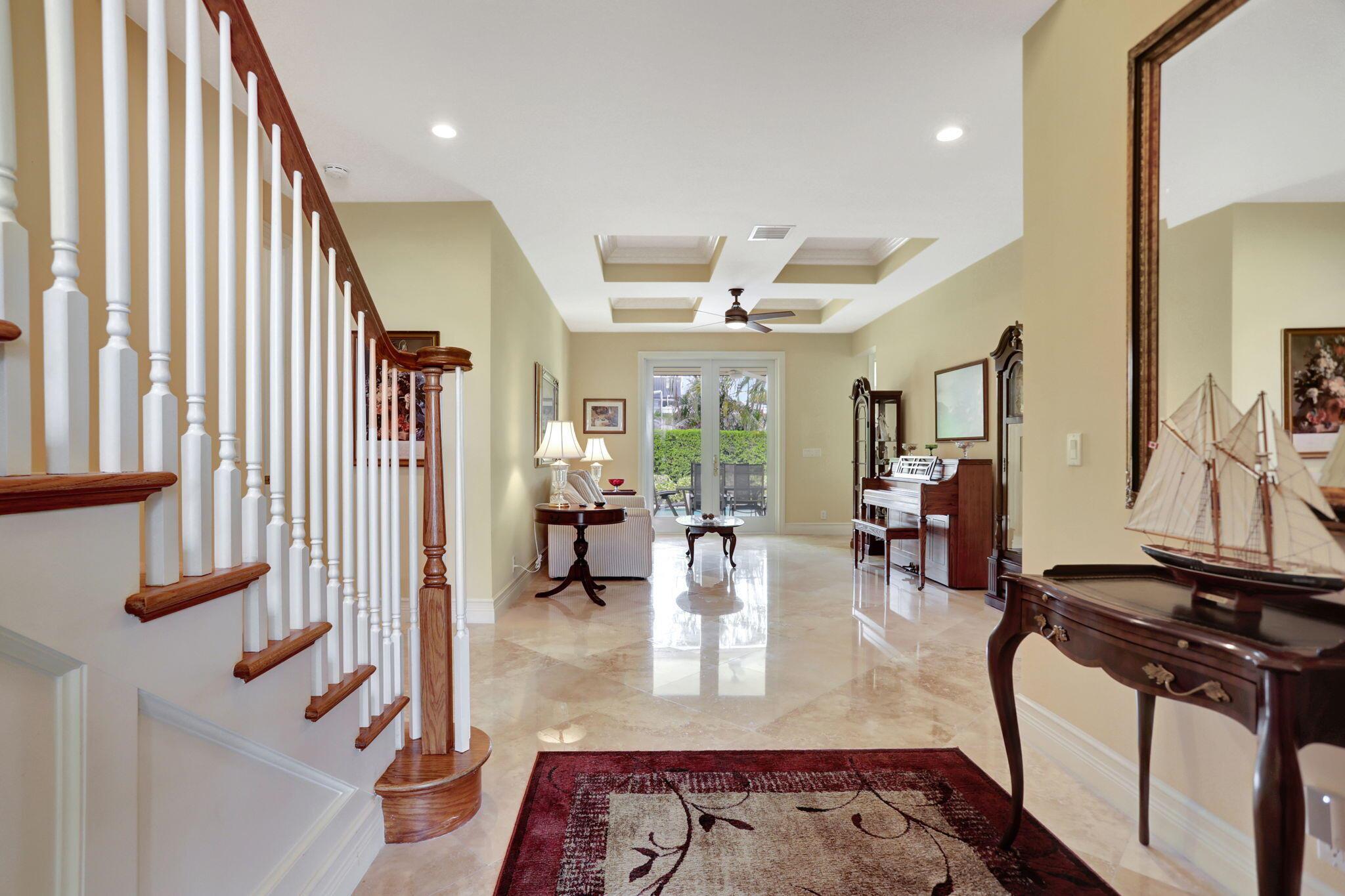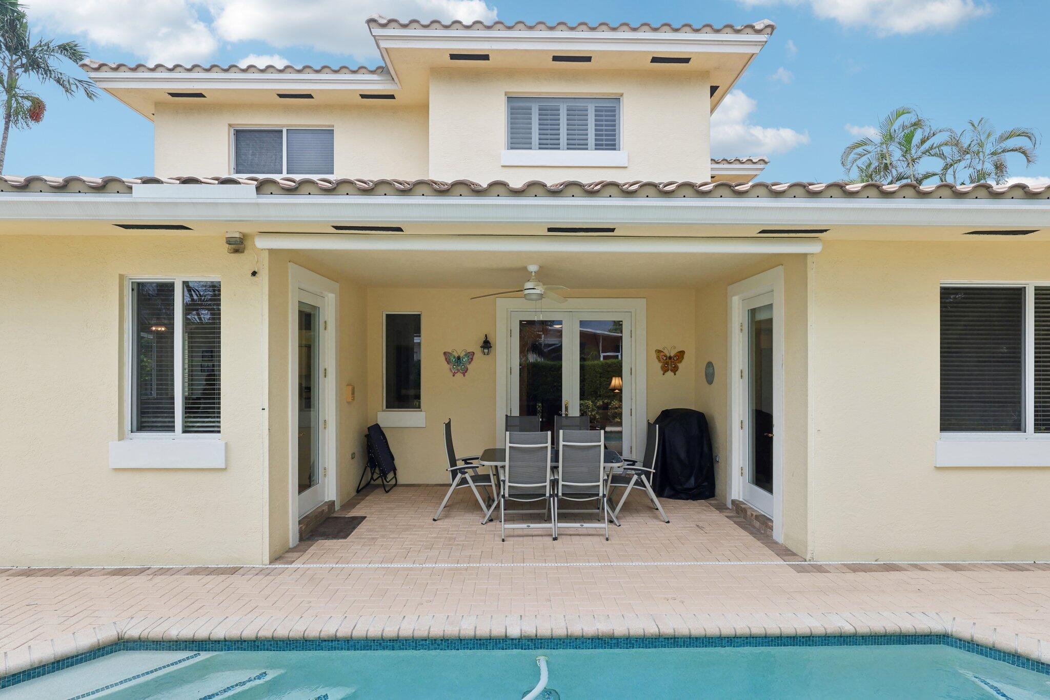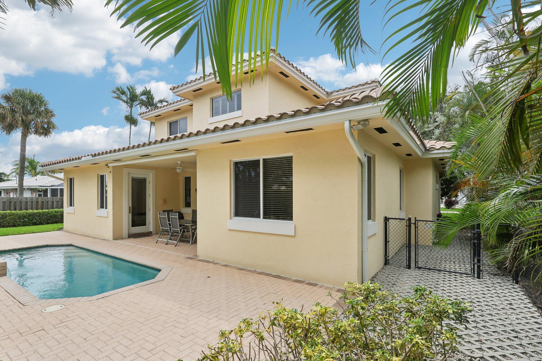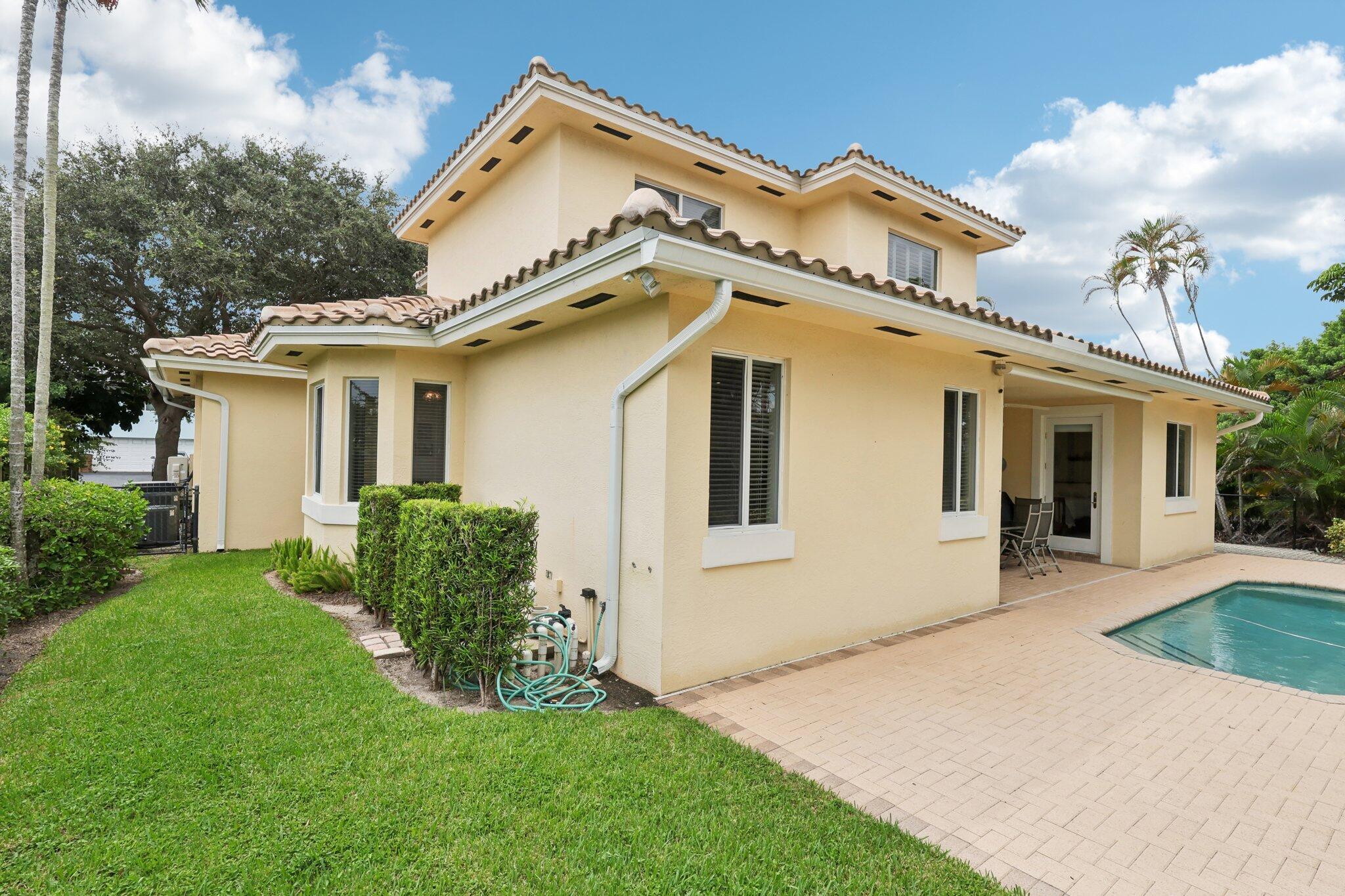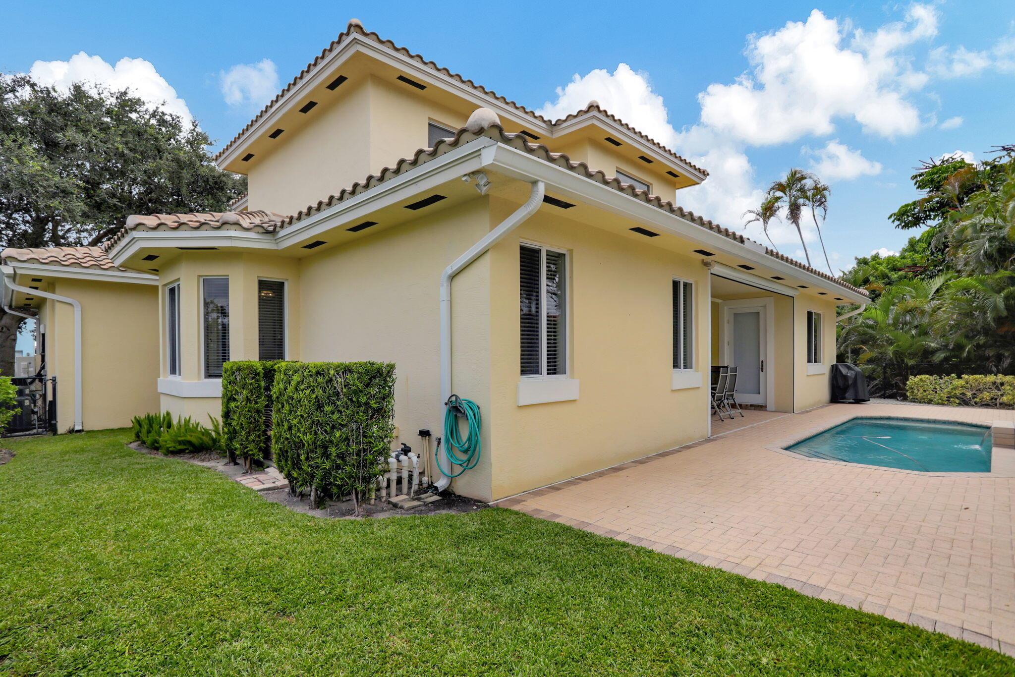 Location, location, location and traditional 2001 built pool home are winning combination for this beautiful home in The Cove that shows like new. Gorgeous polished marble on the lower level , hardwood stairs & wood floors upstairs,high ceilings, 8 foot doors , custom kitchen 42” cabinets w/ granite top, stainless steel appliances, primary bedroom suite downstairs, w walk in his n her closets, large bathroom with builtin vanity, covered patio overlooks the updated pool with waterfall & features phantom motorized screen enclosure. Upstairs features 2 large bedrooms w/ shared jack n jill updated bathroom & balcony. Large bonus room could be media, playroom or office Impact windows, impact patio doors downstairs,Roof 2023, 2 AC 2020/2017, fenced yard and pool w/ waterfall feature,