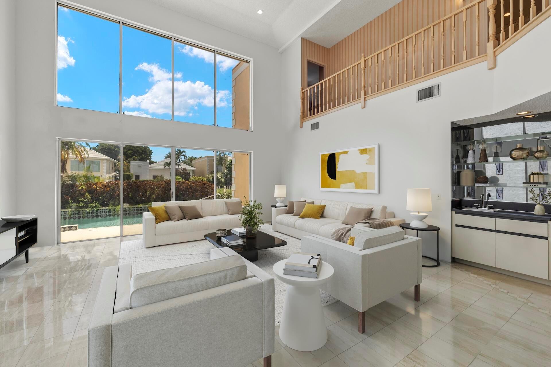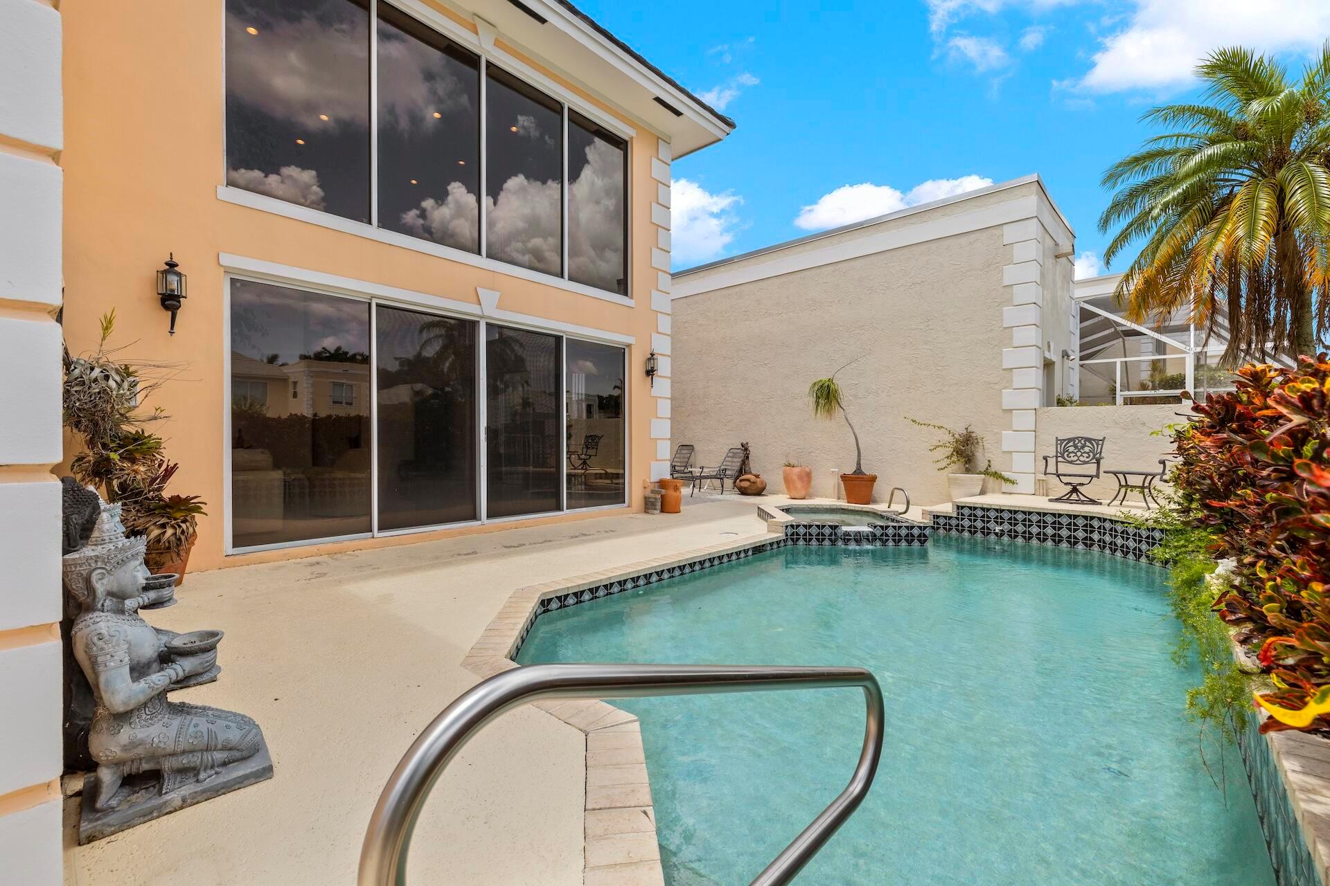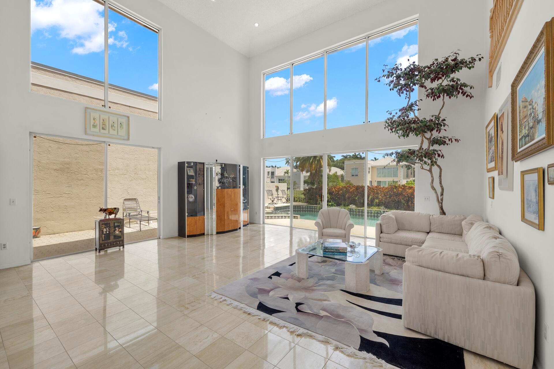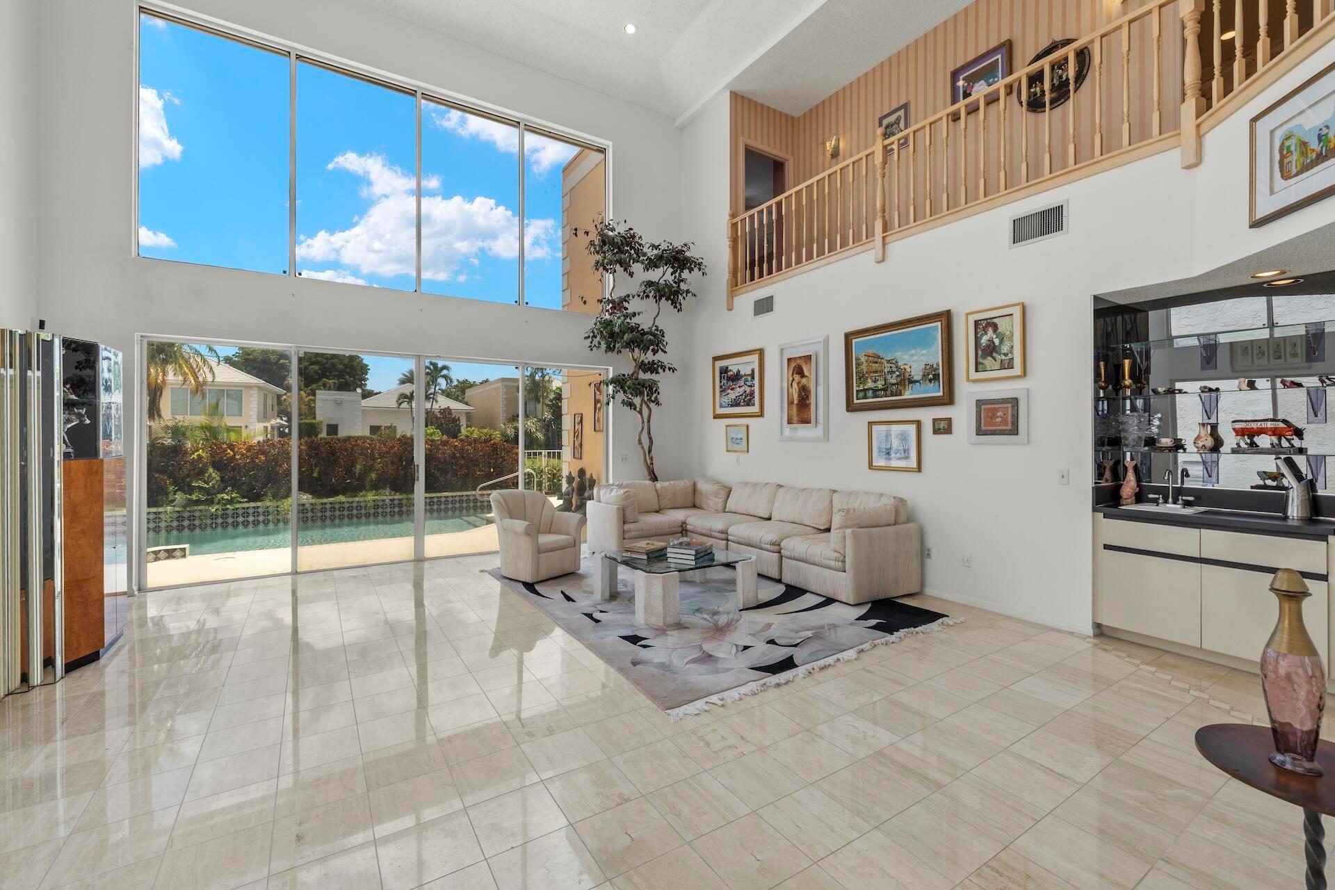 SELLING AS IS! MAJOR PRICE DROP! Ready to bring your vision to life?! This charming 3-bed, 2.1-bath home in the coveted Palms at Boca Pointe is ready for the next owner to make it their own. Built in the 1980s, this spacious property features a newer roof, soaring 20+ ft ceilings, and floor-to-ceiling windows that fill the home with natural light. Two primary suites, one on each level, offer privacy and convenience. The ground-floor suite opens to a backyard oasis with an in-ground pool and spa, plus hookups for a heater. One of the largest lots and floor plans within the community, located in Boca Pointe. One of the unique country clubs in South Florida where membership is optional. Get in now to turn this blank canvas into a true masterpiece that you can call your own!