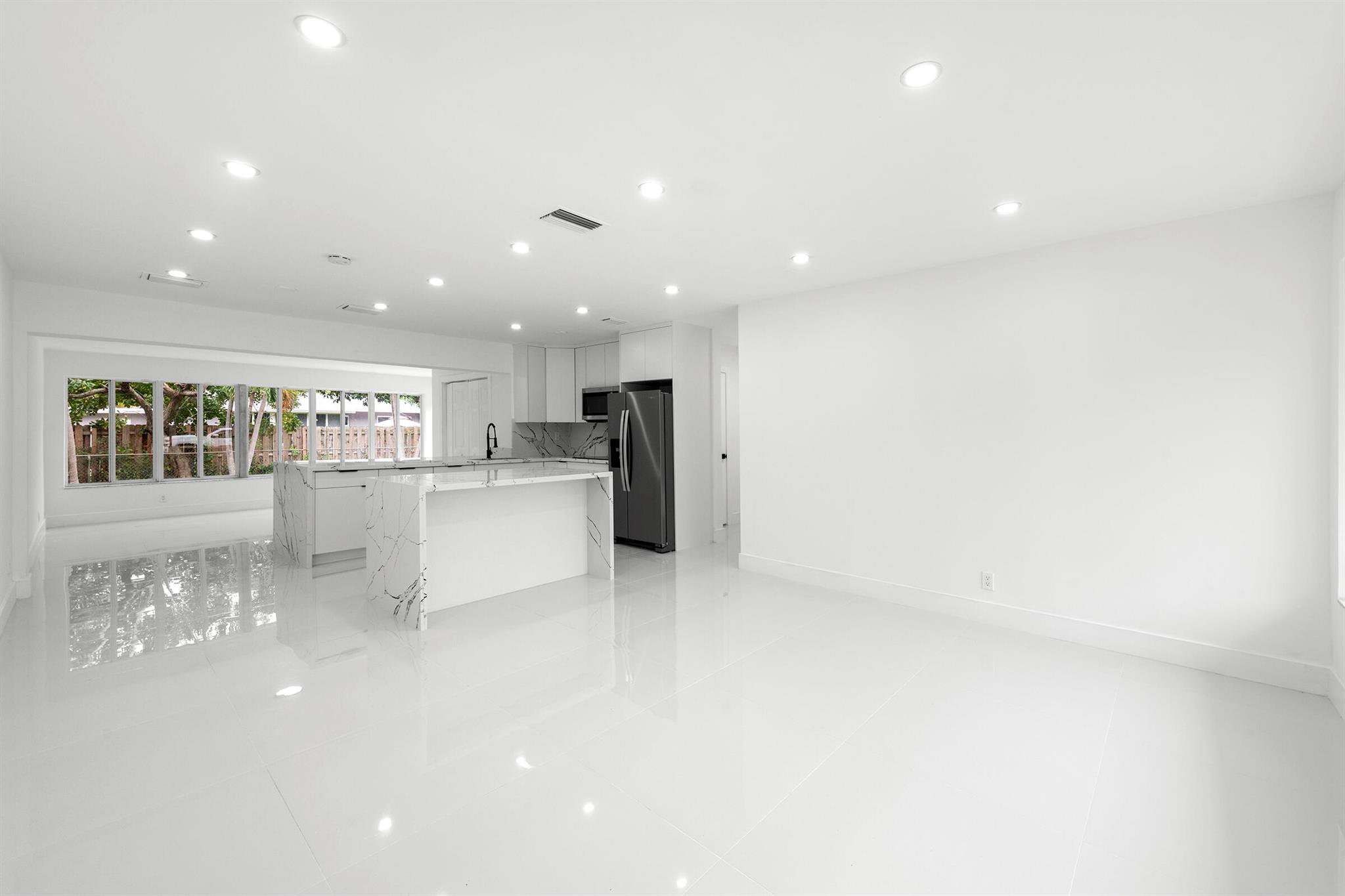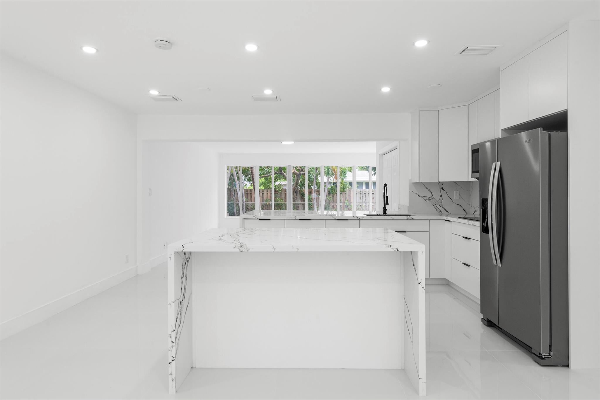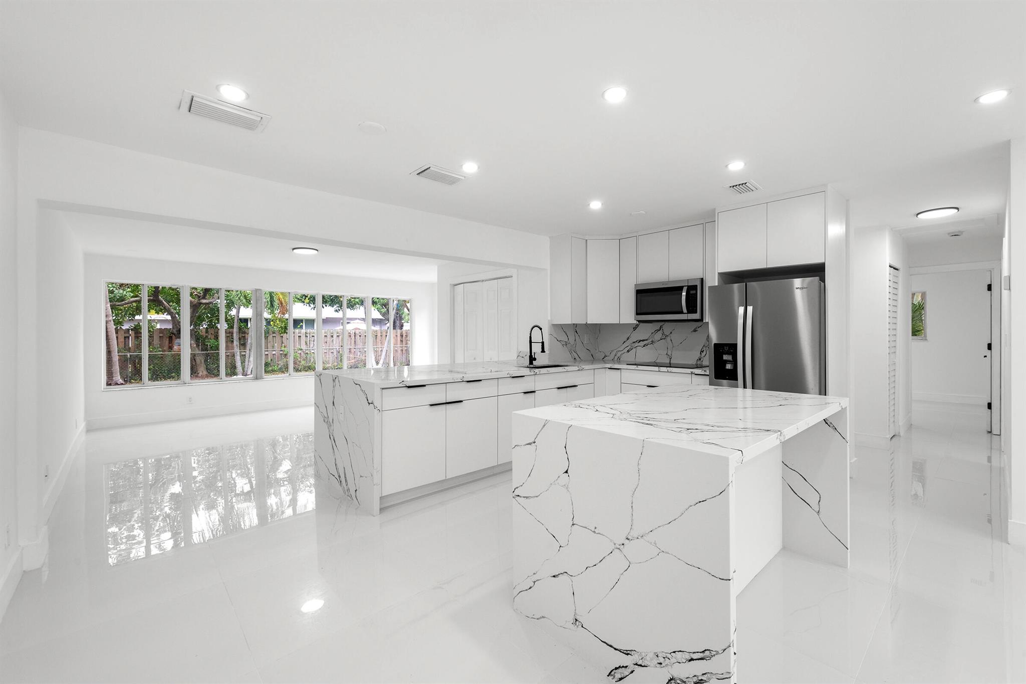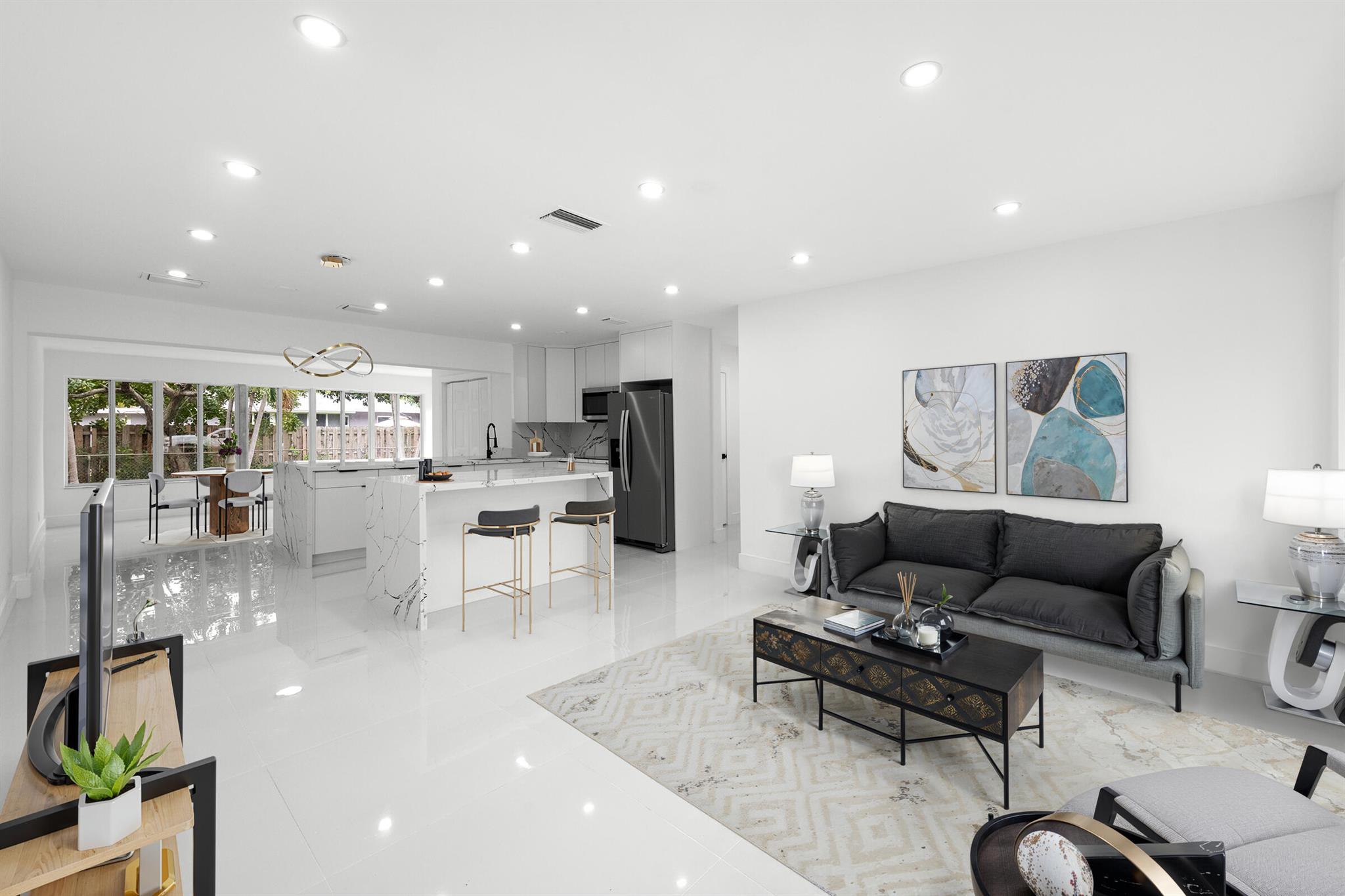 Discover this fully remodeled 3-bedroom, 2-bathroom home featuring a private pool and an open-concept design perfect for modern living. The chef’s kitchen boasts a central island and peninsula ideal for hosting friends and family, quartz countertops, sleek white gloss cabinets, and brand-new stainless steel appliances. The bathrooms have been completely updated with elegant floor-to-ceiling tiles, while the entire home features white porcelain flooring, creating a bright and welcoming atmosphere.Set on a spacious lot, the backyard is a true oasis with a cozy covered patio and a large pool, perfect for enjoying South Florida’s sunny climate year-round. Some pictures has been virtually staged.