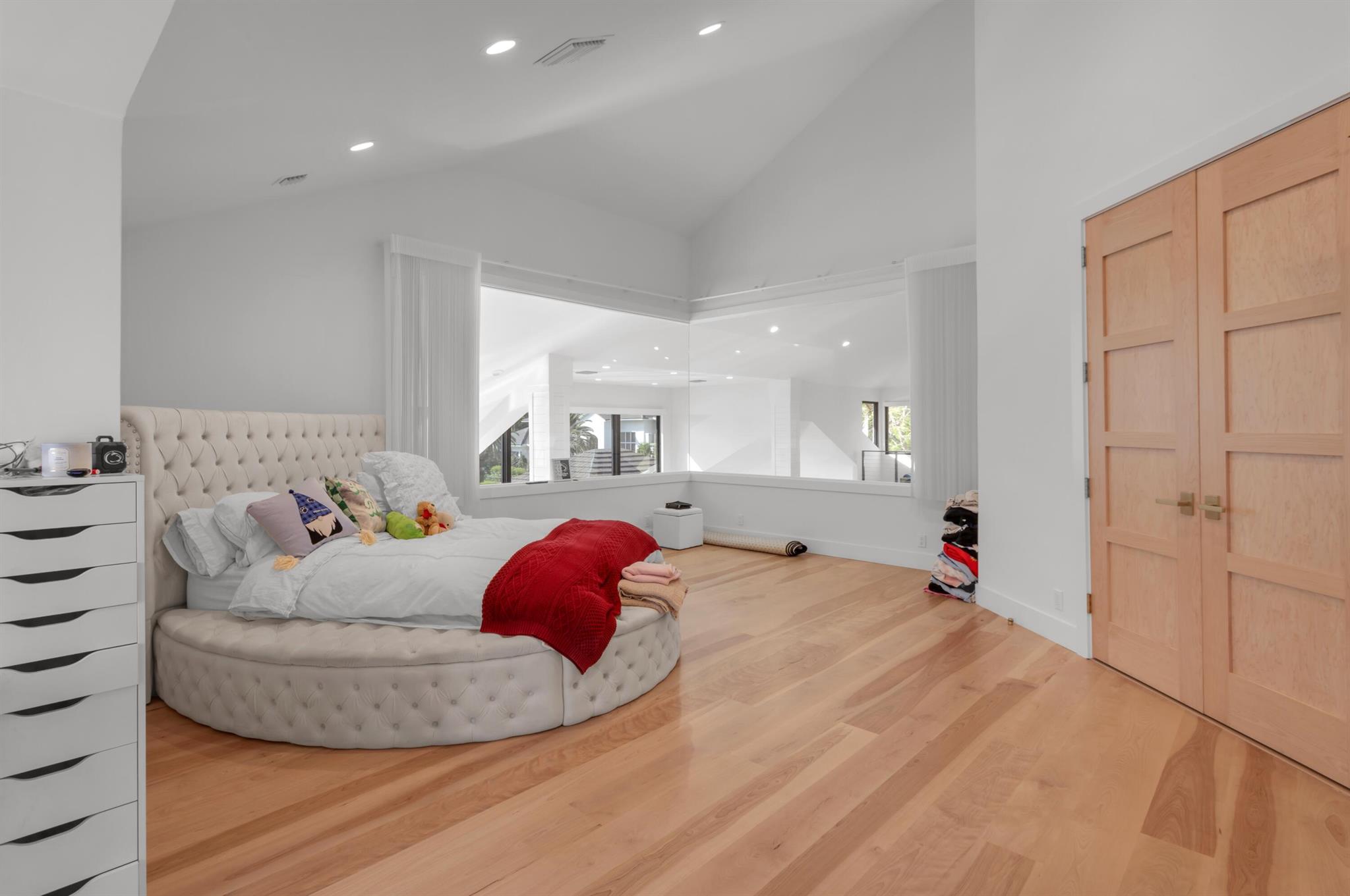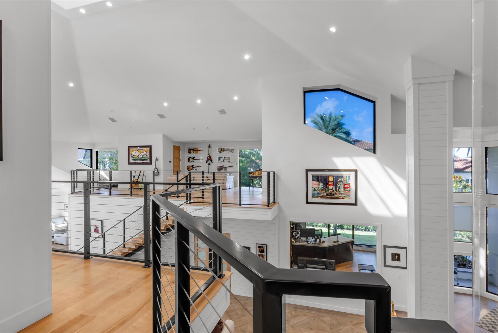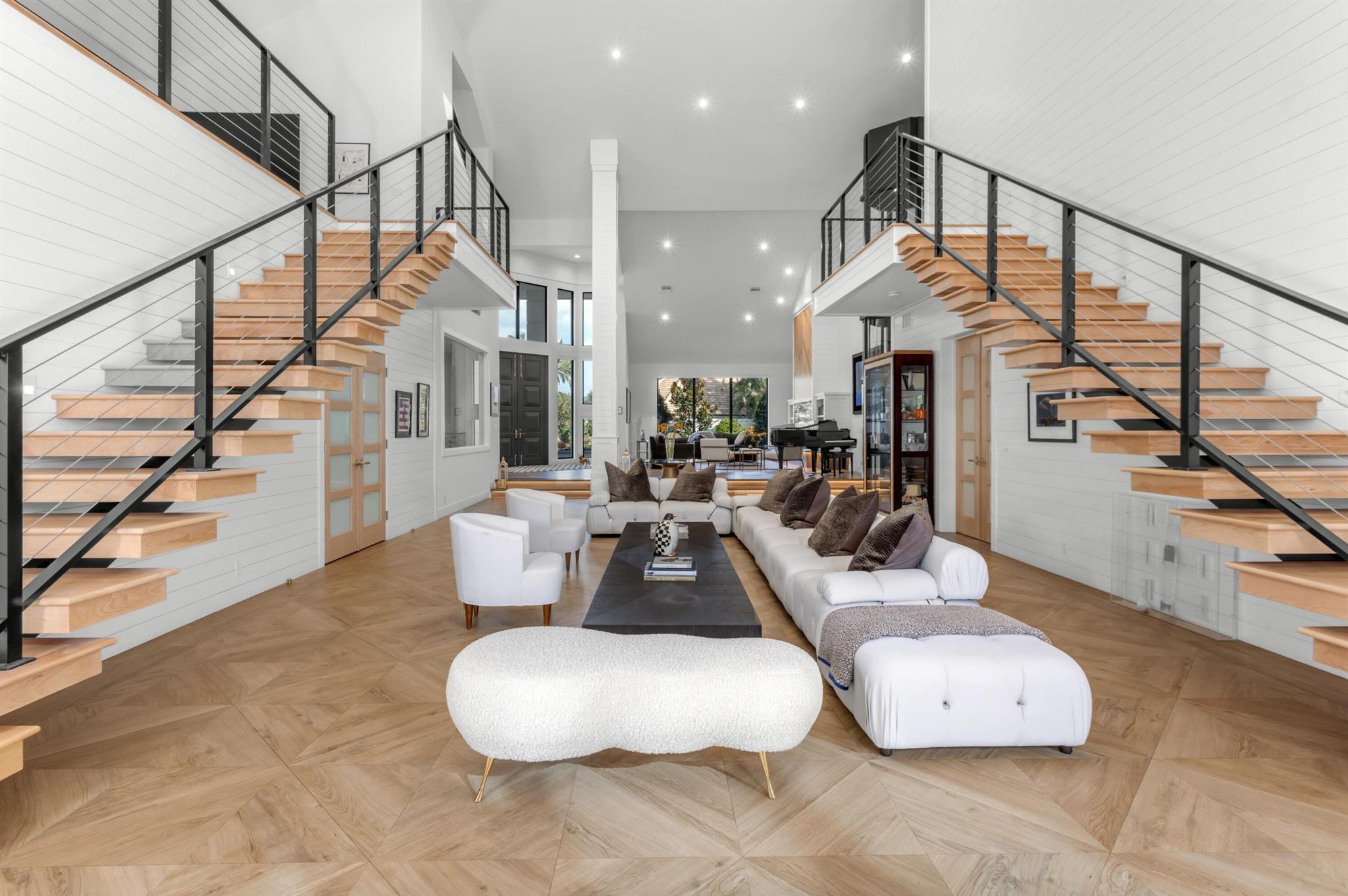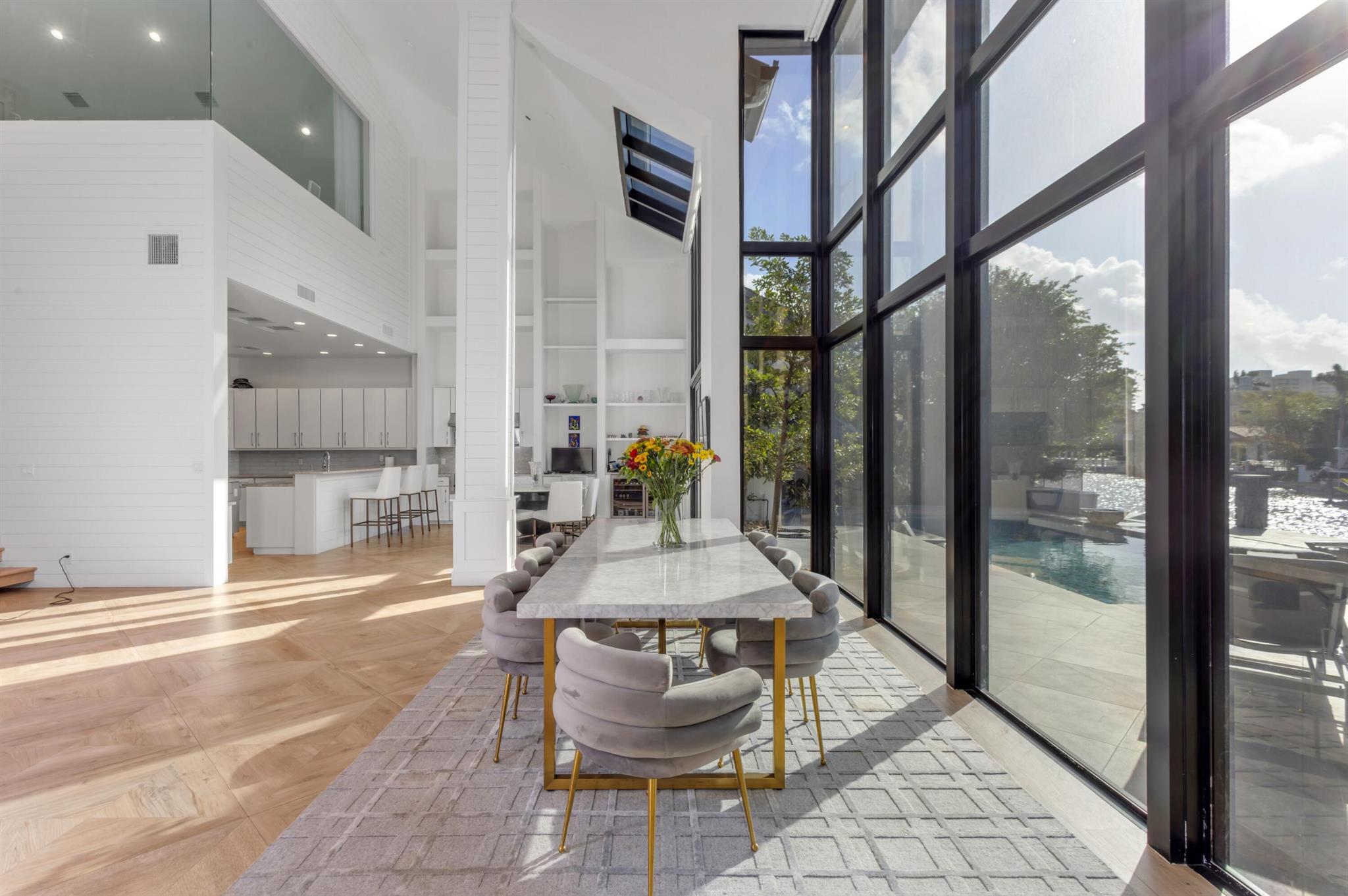 Blending contemporary architecture with lofty urban chic, this dramatic yachting estate offers a voluminous open floor plan with stunning interiors, serene water views, and direct ocean access.A massive glass grid entry with oversized custom double doors reveals a towering 30-foot foyer, which is a prelude to the voluminous expanse of this open-plan design. A skylit gallery sitting area is framed by twin suspended staircases with open cable rails and recessed stair lights. The dining area offers a floor-to-ceiling expansive grid window wall view of the sun-drenched pool and waterway. Soaring shiplap walls and bleached oak designed porcelain floors provide a modern farmhouse ambience.