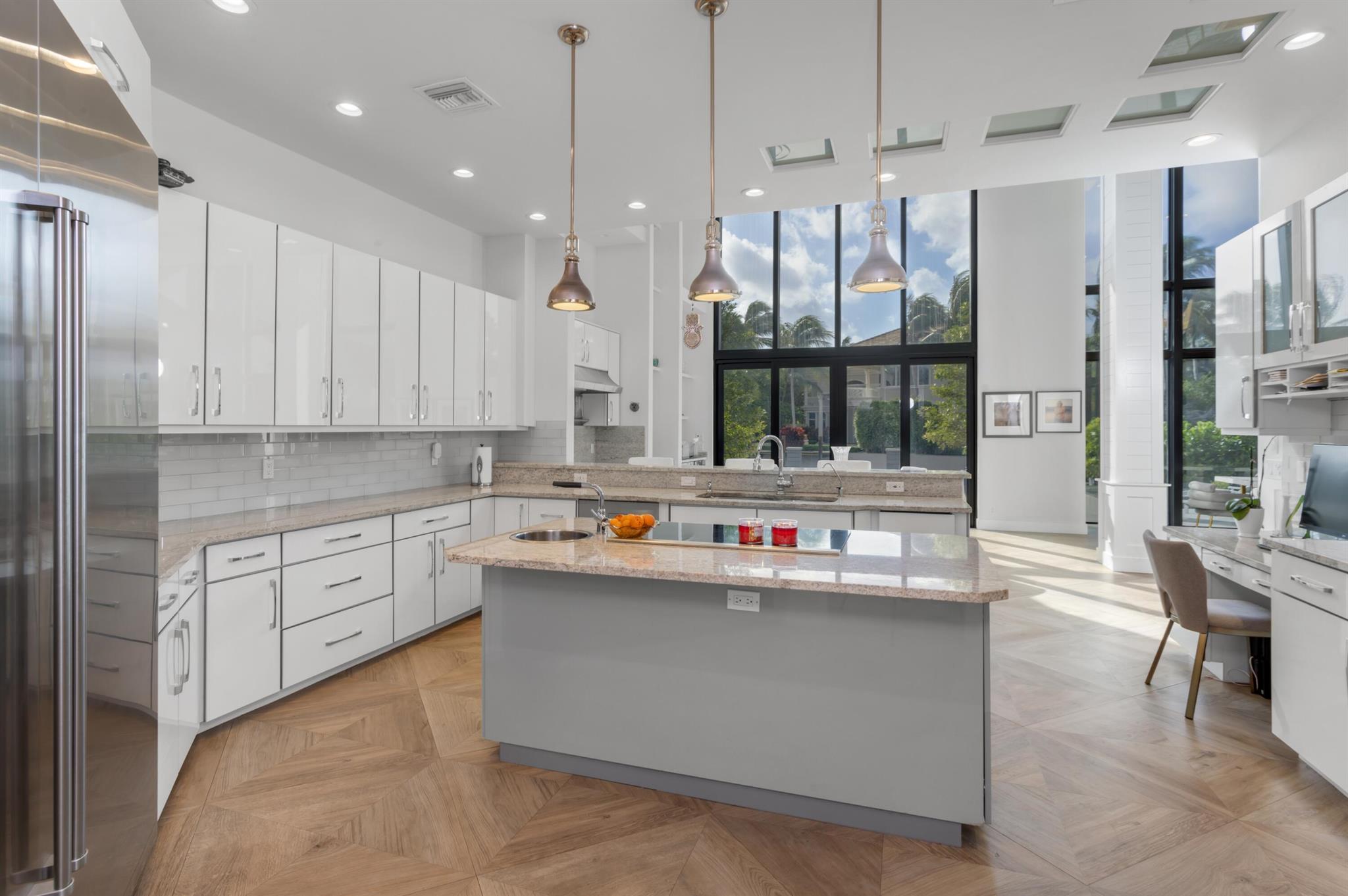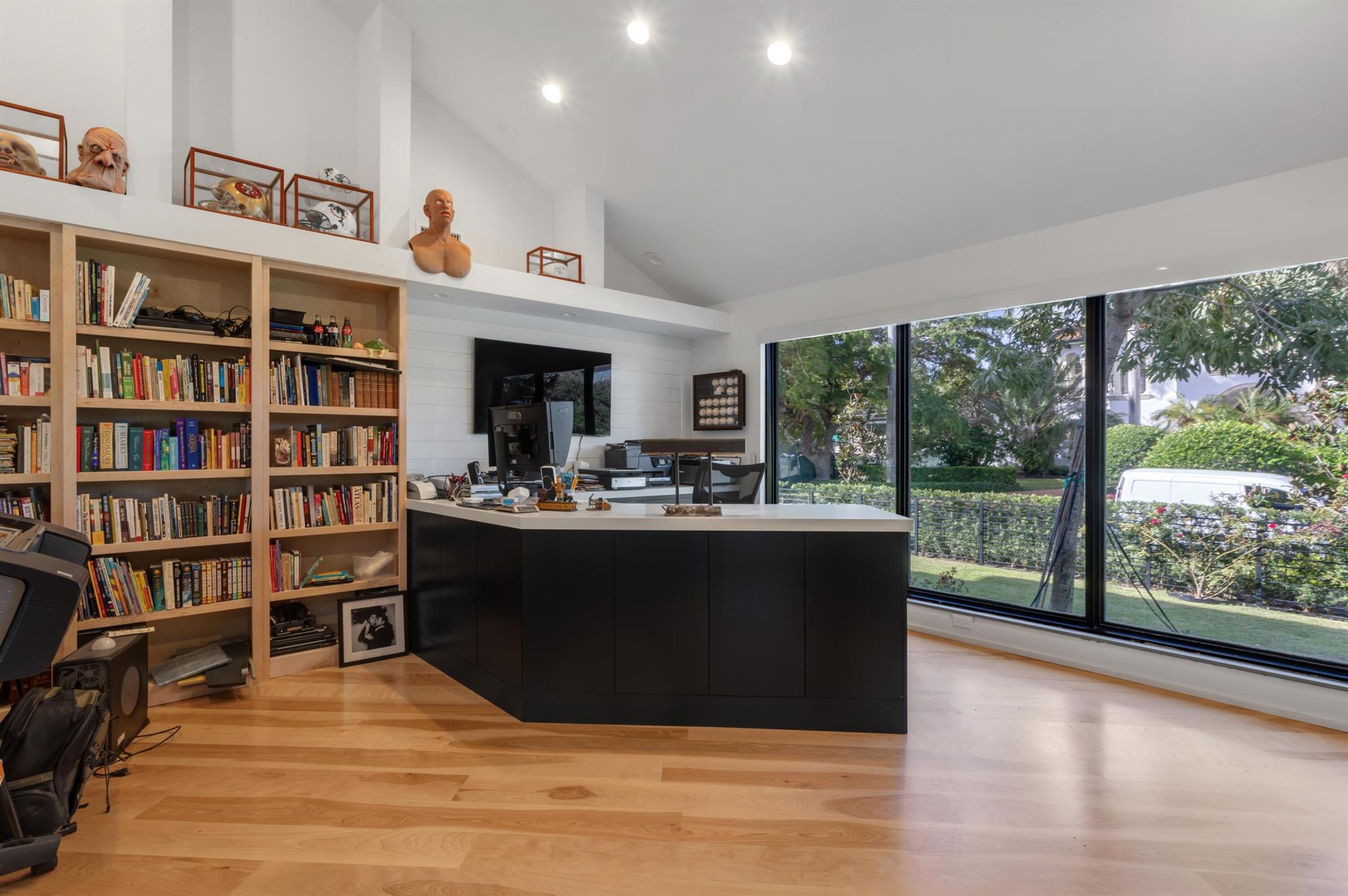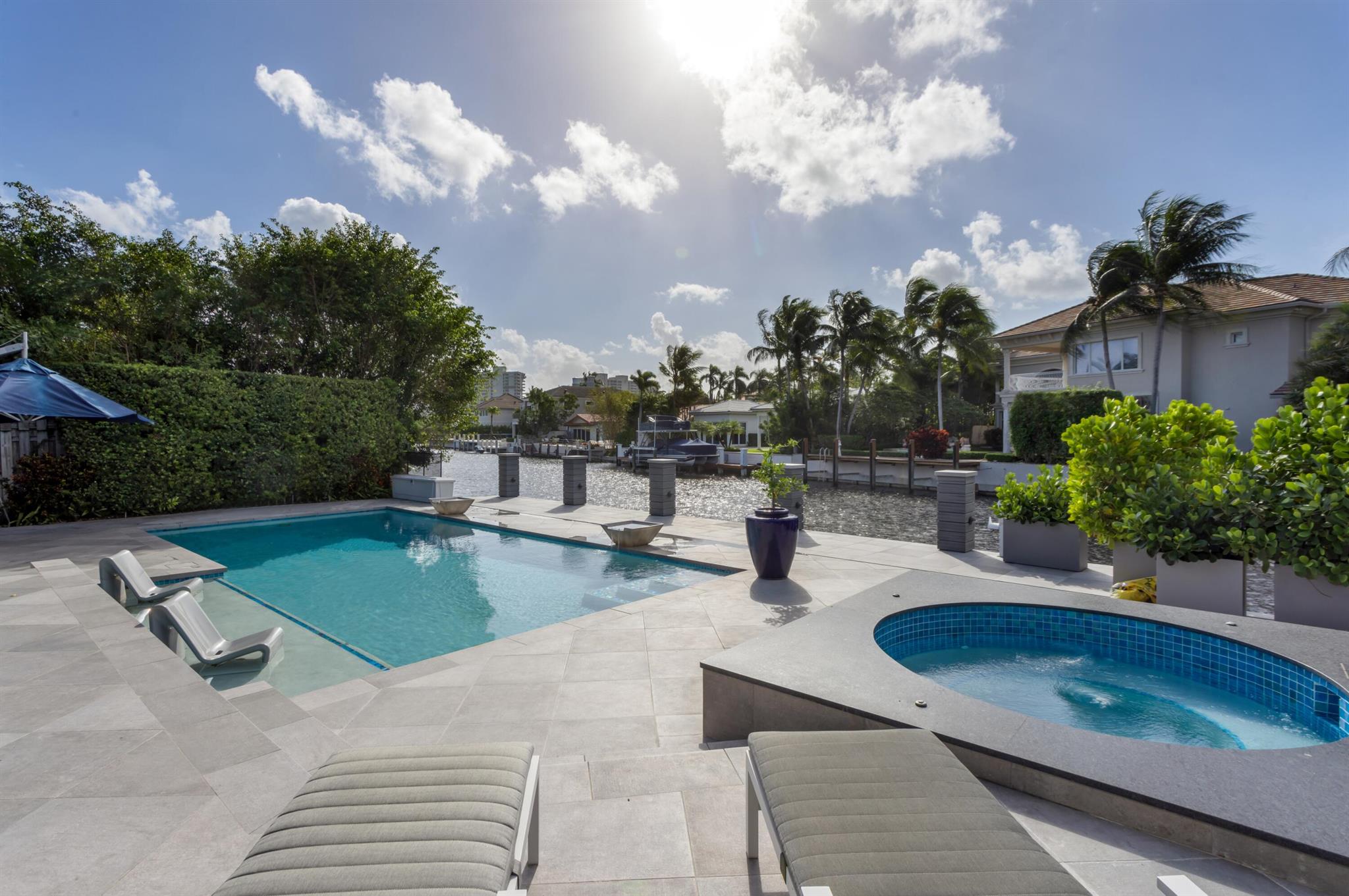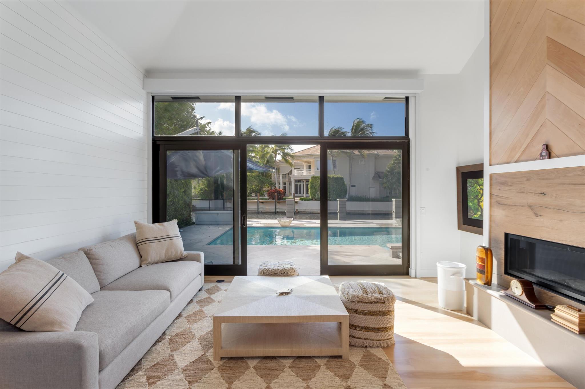 Blending contemporary architecture with lofty urban chic, this dramatic yachting estate offers a voluminous open floor plan with stunning interiors, serene water views, and direct ocean access.A massive glass grid entry with oversized custom double doors reveals a towering 30-foot foyer, which is a prelude to the voluminous expanse of this open-plan design. A skylit gallery sitting area is framed by twin suspended staircases with open cable rails and recessed stair lights. The dining area offers a floor-to-ceiling expansive grid window wall view of the sun-drenched pool and waterway. Soaring shiplap walls and bleached oak designed porcelain floors provide a modern farmhouse ambience.