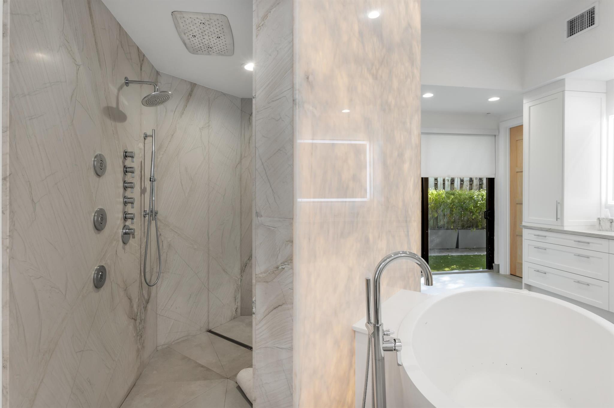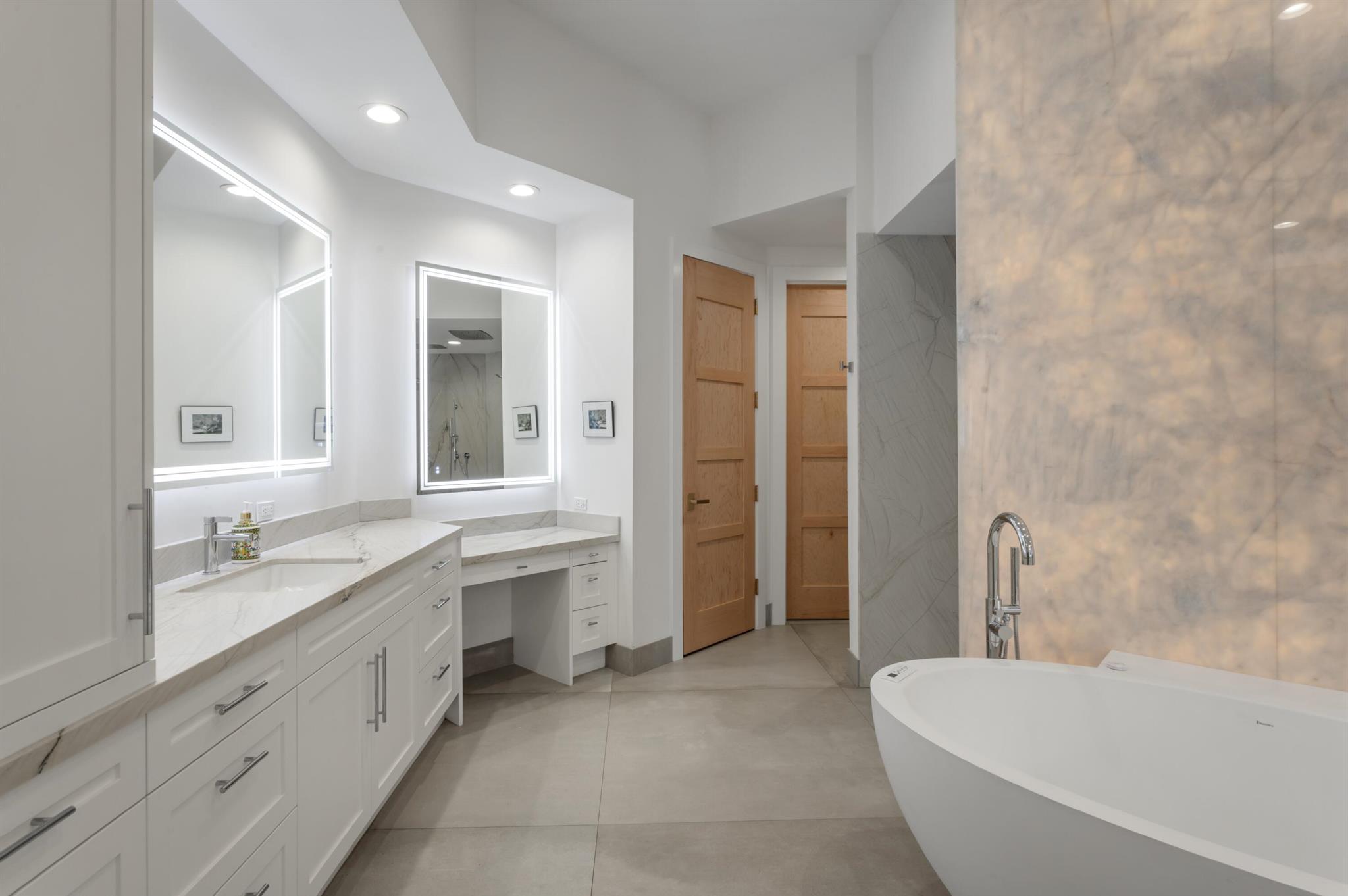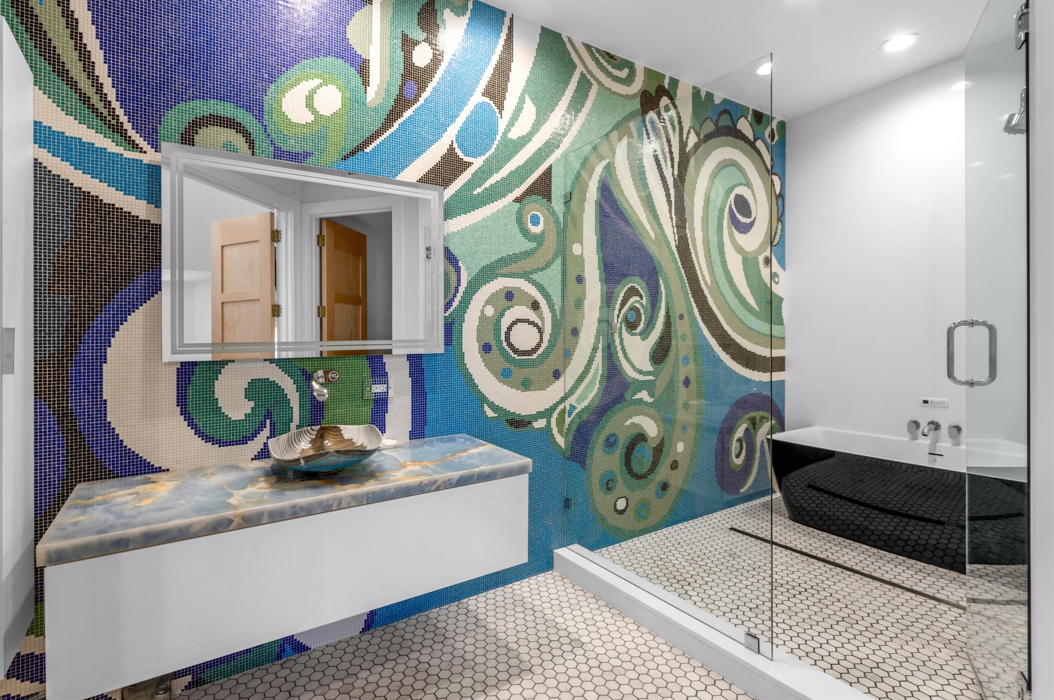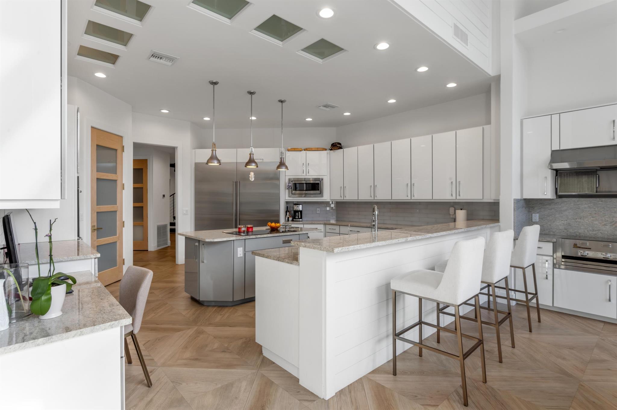 Blending contemporary architecture with lofty urban chic, this dramatic yachting estate offers a voluminous open floor plan with stunning interiors, serene water views, and direct ocean access.A massive glass grid entry with oversized custom double doors reveals a towering 30-foot foyer, which is a prelude to the voluminous expanse of this open-plan design. A skylit gallery sitting area is framed by twin suspended staircases with open cable rails and recessed stair lights. The dining area offers a floor-to-ceiling expansive grid window wall view of the sun-drenched pool and waterway. Soaring shiplap walls and bleached oak designed porcelain floors provide a modern farmhouse ambience.