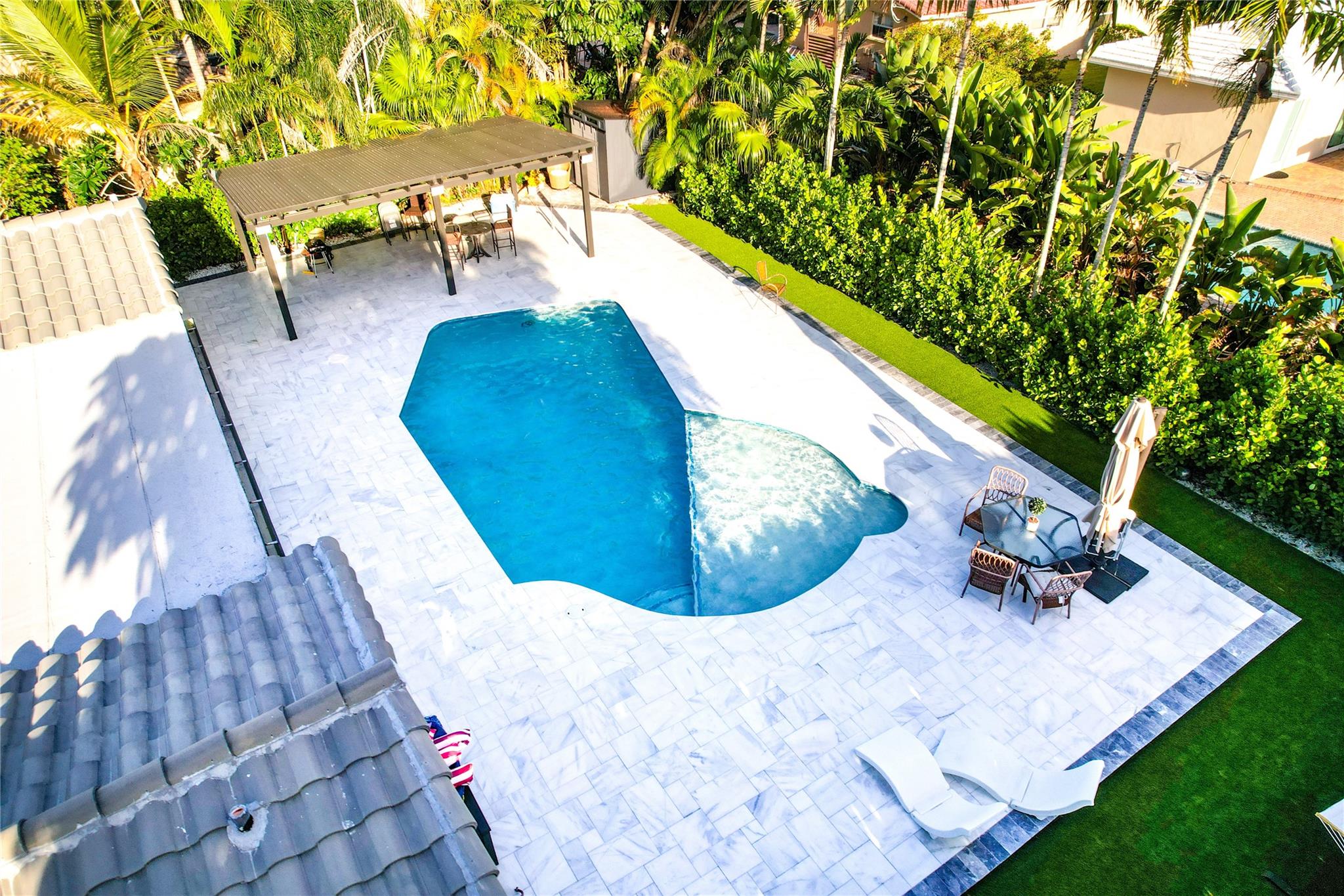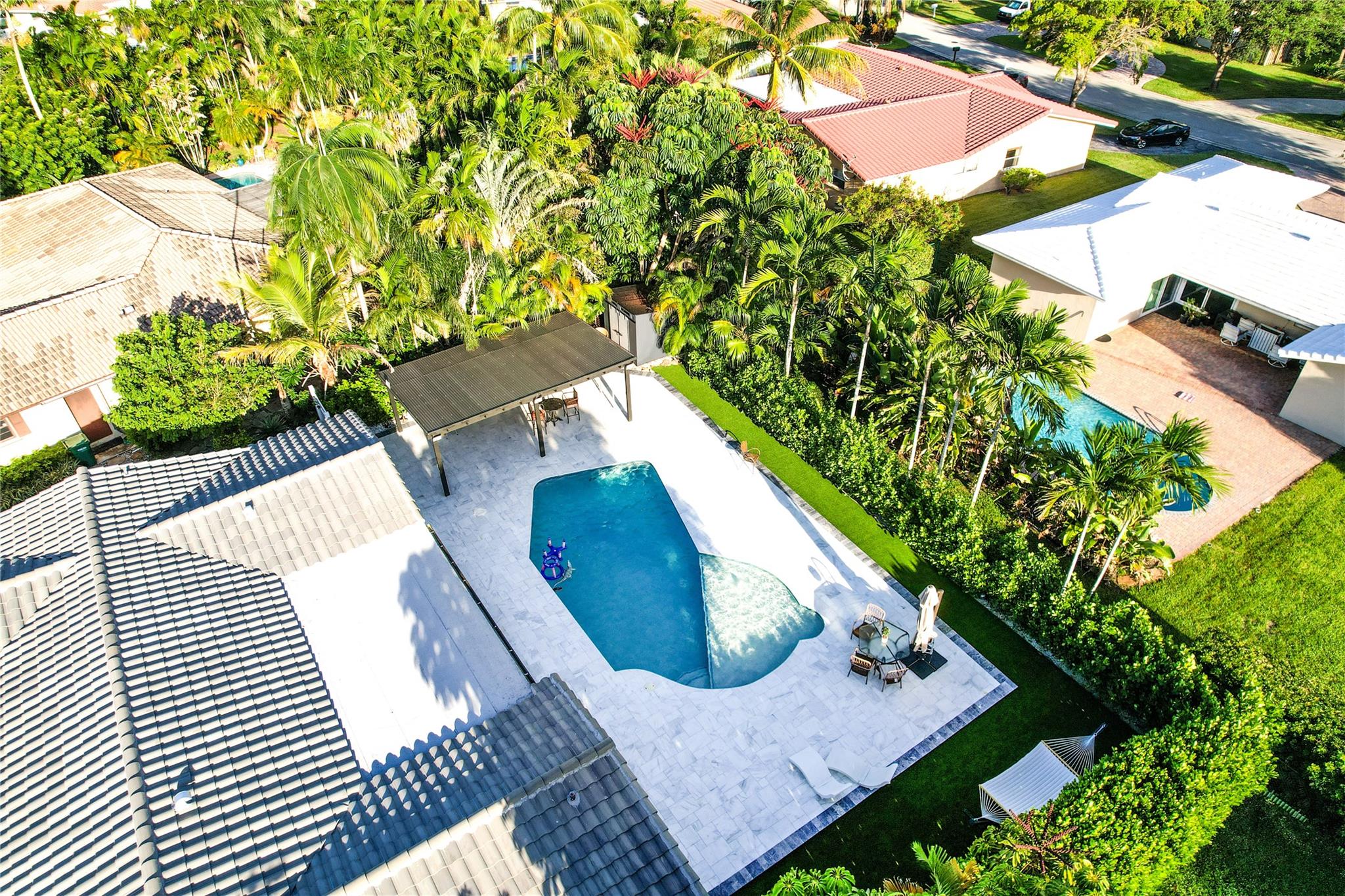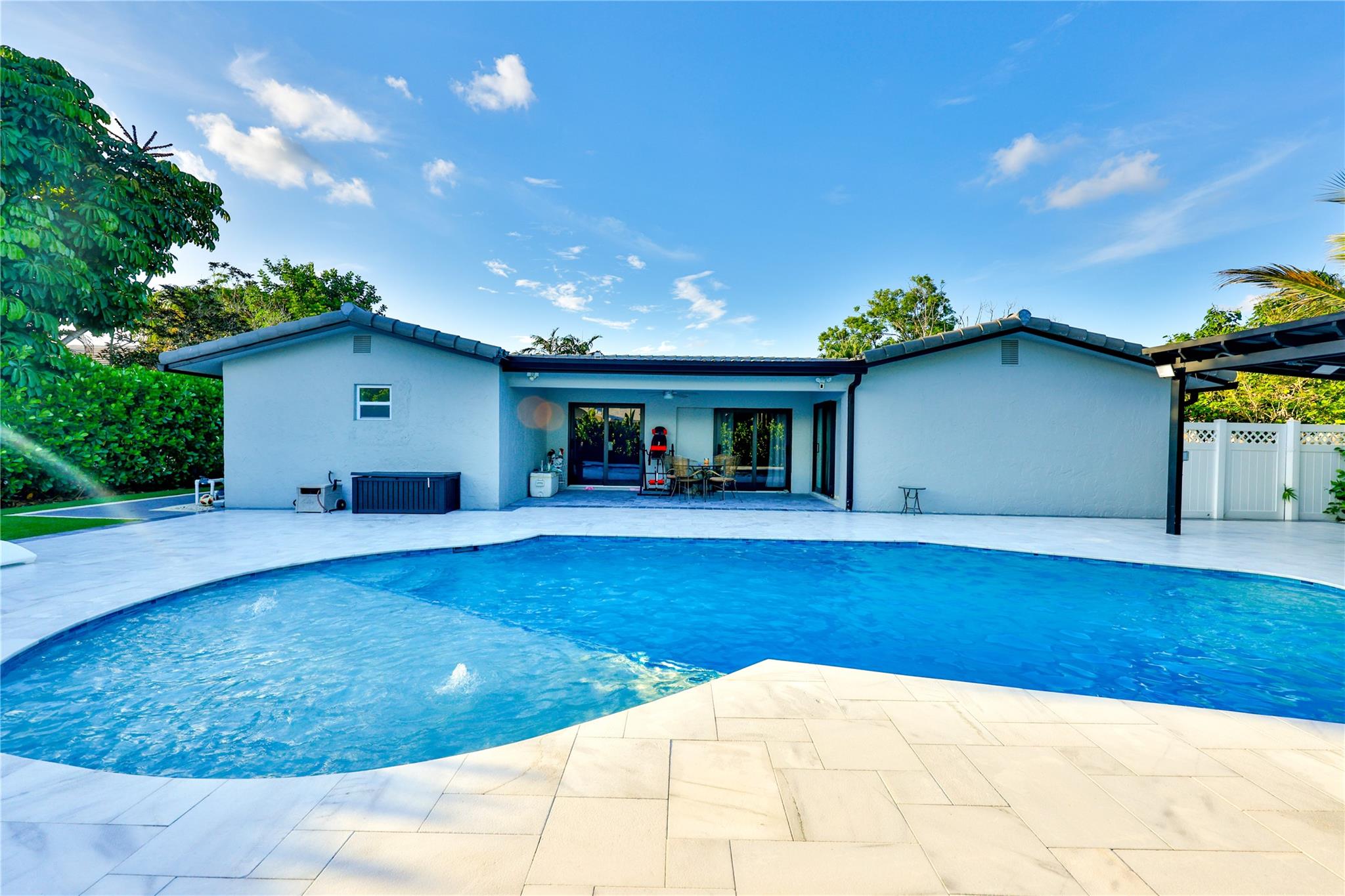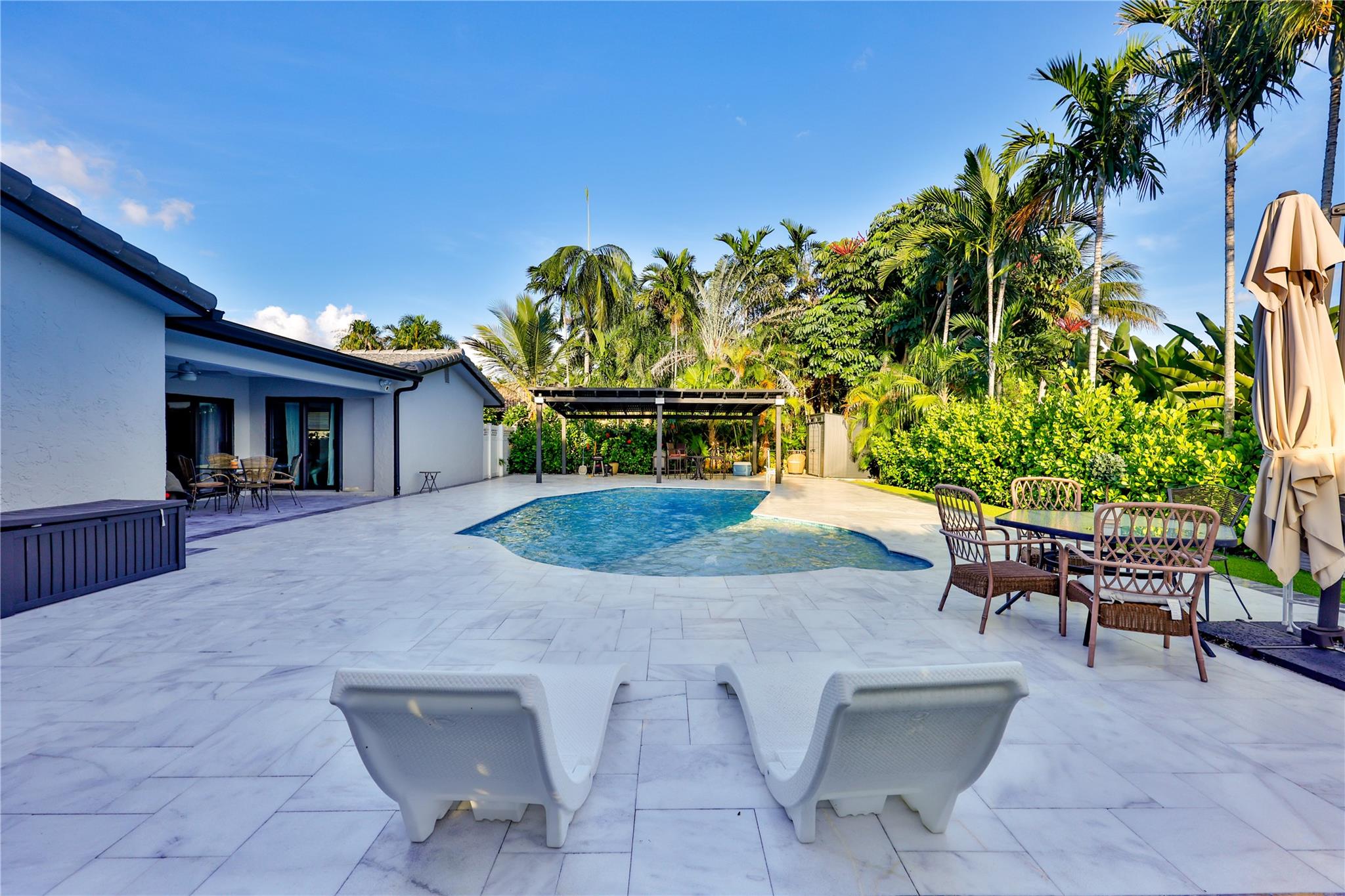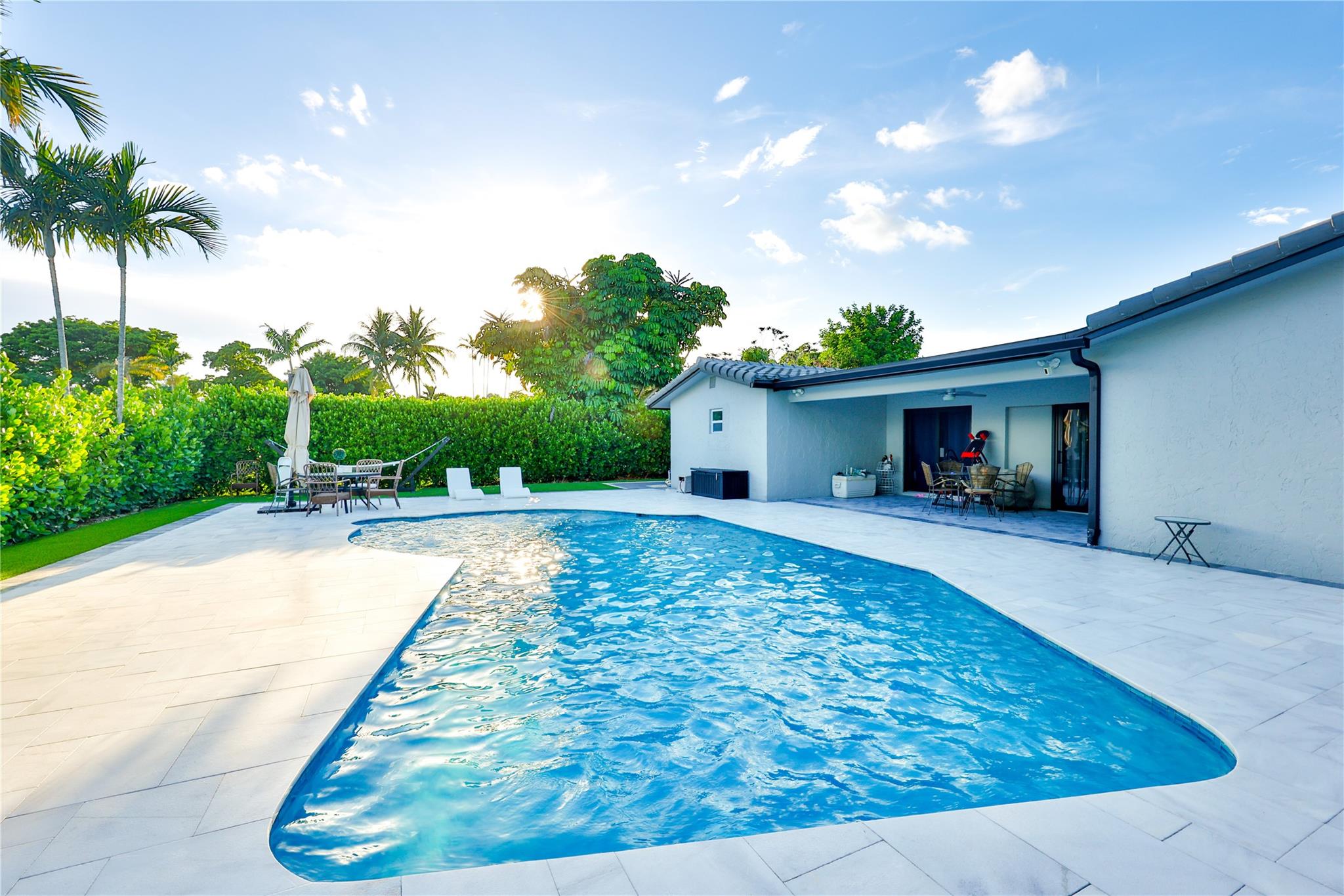 NO HOA – Gorgeous 4 bedroom, 2 bath home in a quiet cul-de-sac. Completely renovated with impact sliding doors, open-concept living area, kitchen with stainless appliances and nicely updated bathrooms. Recently painted in neutral colours. Beautiful fenced backyard with green plants for added privacy, Sprinklers with 2023 pump. The covered patio and large pool is surround by a white marble deck. There is also a garden shed for added storage. The 2-car garage with a wide driveway can accommodate 8 cars . New roof was installed on 2023, AC 2019, Driveway 2022, pool deck 2023 and Bathrooms was remodelled on 2024.