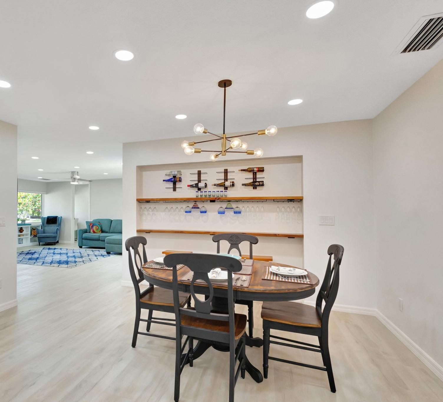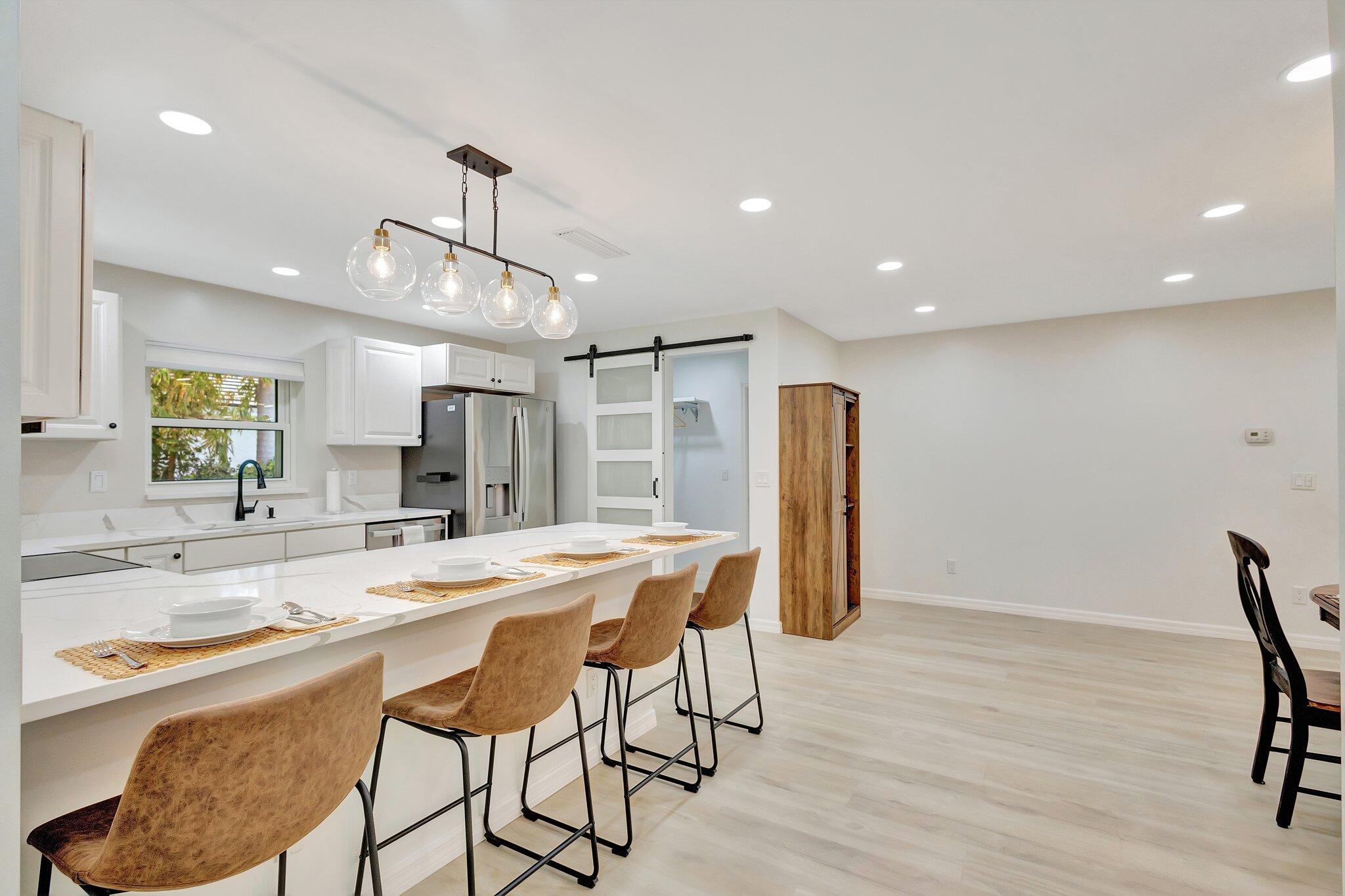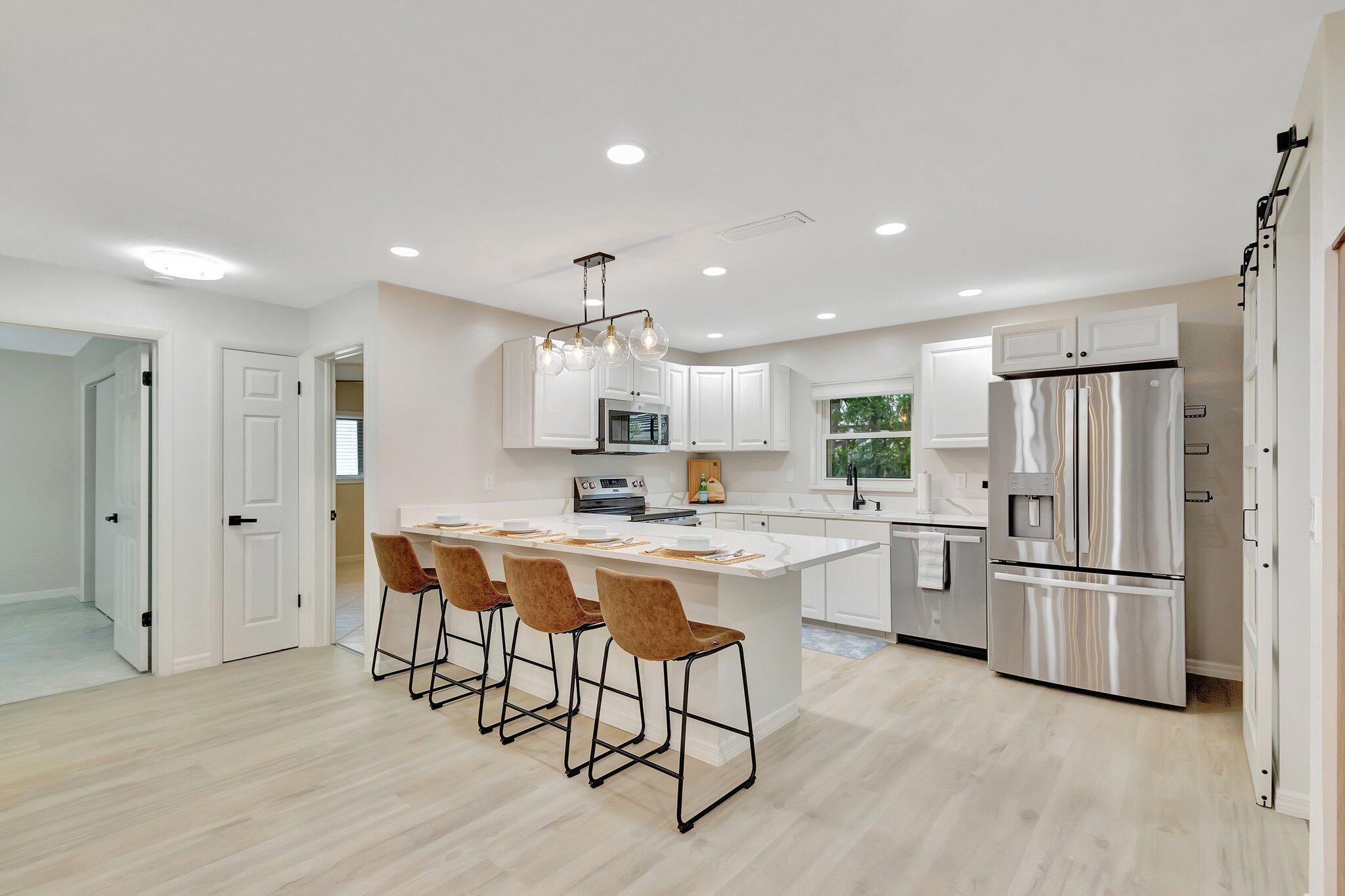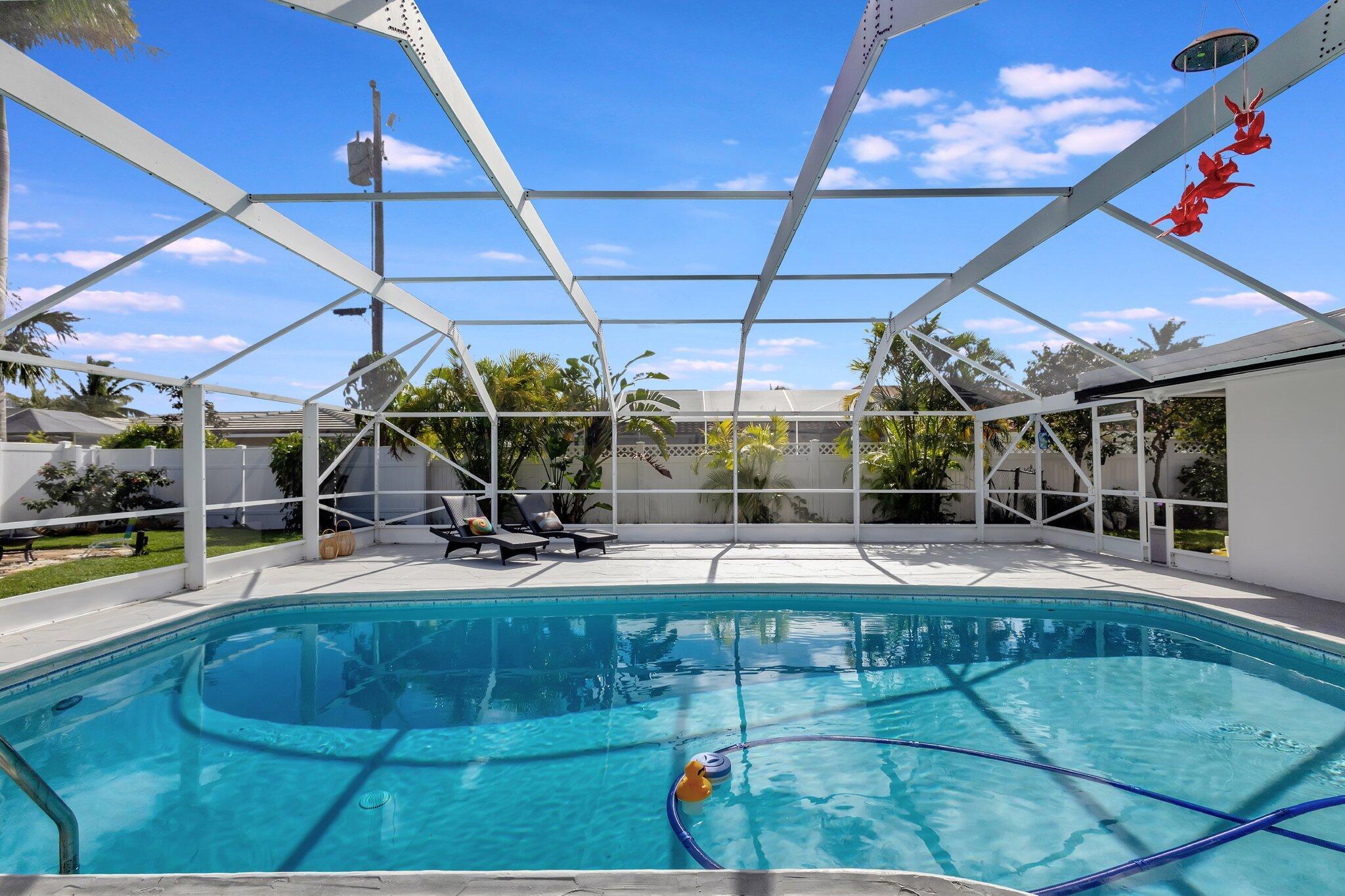 Welcome to 1081 Bimini Lane, the perfect combination of elegance, entertainment, and joyful relaxation. This beautiful 3-bedroom 2-bath open-concept home is newly renovated and located on the coveted Singer Island. Enter a bright and spacious living area, filled with natural light and new flooring throughout. The kitchen has been luxuriously remodeled to include stainless appliances, quartz countertops and an expansive peninsula, connecting seamlessly to the dining area and elegant ”wine wall”. Plenty of extras, including a touchless faucet and 2 lazy susans. An entertainer’s dream!The master bedroom is large and bright, with its own private entrance to the pool. The ensuite bathroom is an oasis of its own, with luxurious large shower, separate tub, double-sink wood cabinet with