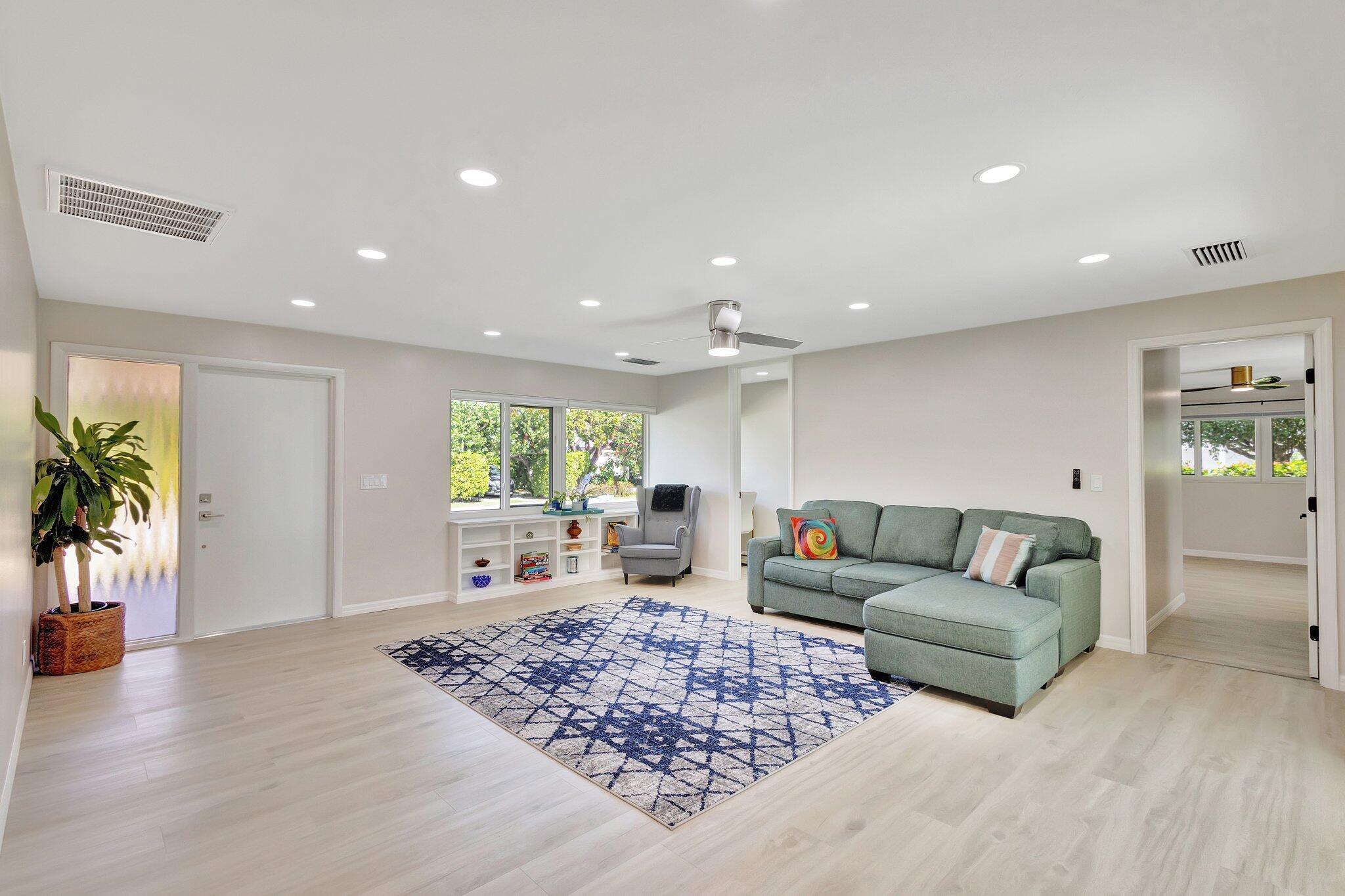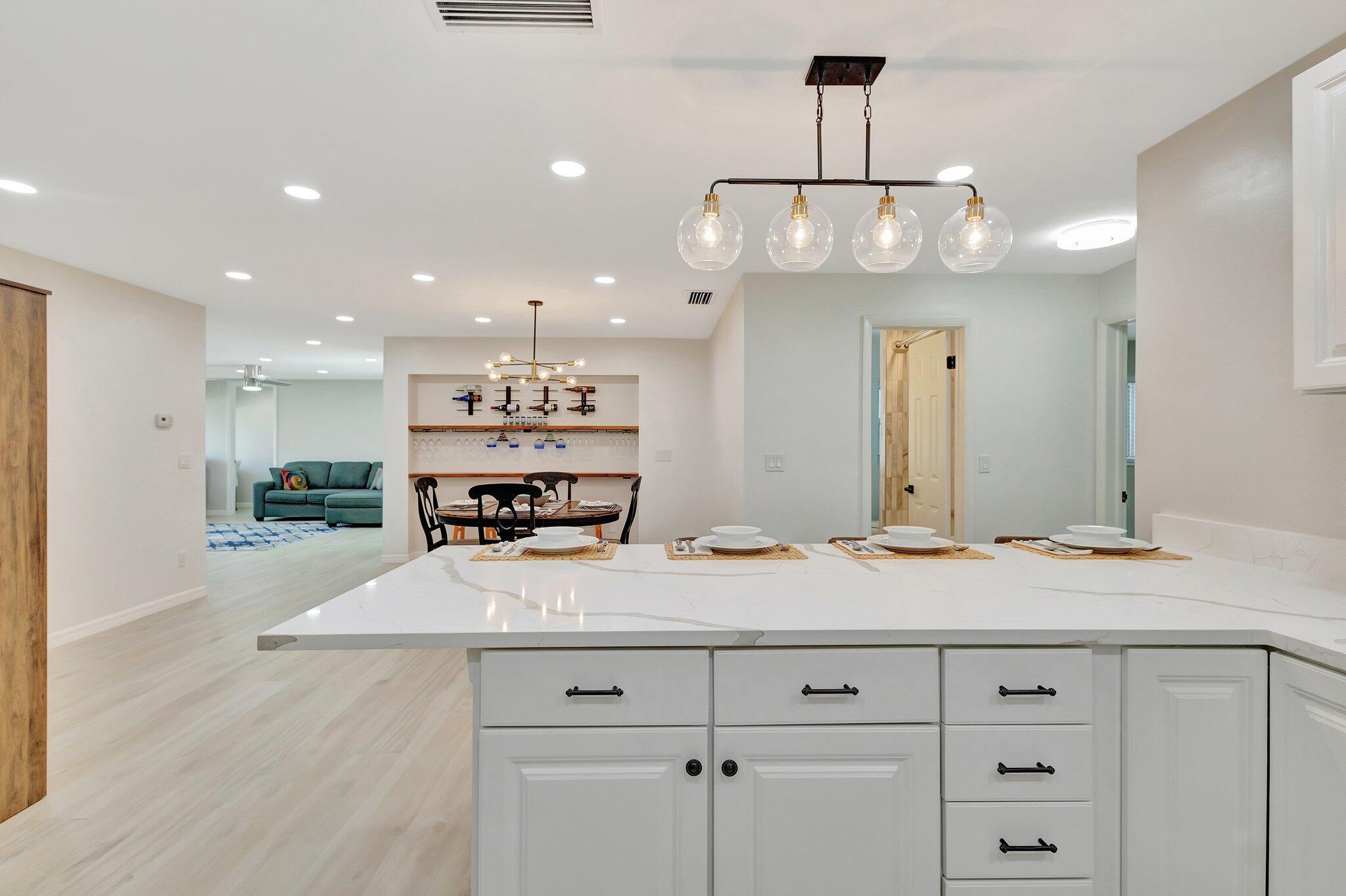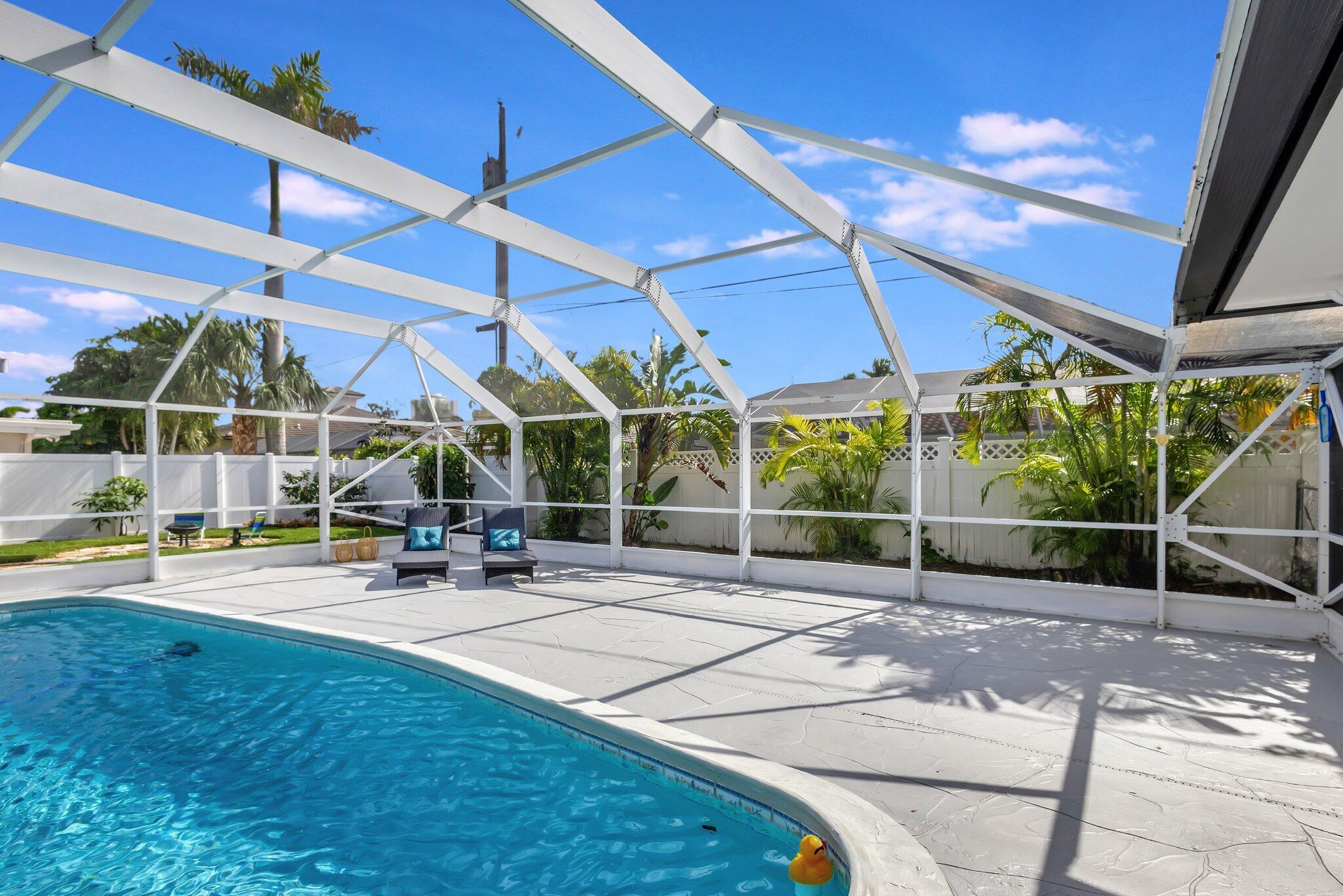 Welcome to 1081 Bimini Lane, the perfect combination of elegance, entertainment, and joyful relaxation. This beautiful 3-bedroom 2-bath open-concept home is newly renovated and located on the coveted Singer Island. Enter a bright and spacious living area, filled with natural light and new flooring throughout. The kitchen has been luxuriously remodeled to include stainless appliances, quartz countertops and an expansive peninsula, connecting seamlessly to the dining area and elegant ”wine wall”. Plenty of extras, including a touchless faucet and 2 lazy susans. An entertainer’s dream!The master bedroom is large and bright, with its own private entrance to the pool. The ensuite bathroom is an oasis of its own, with luxurious large shower, separate tub, double-sink wood cabinet with