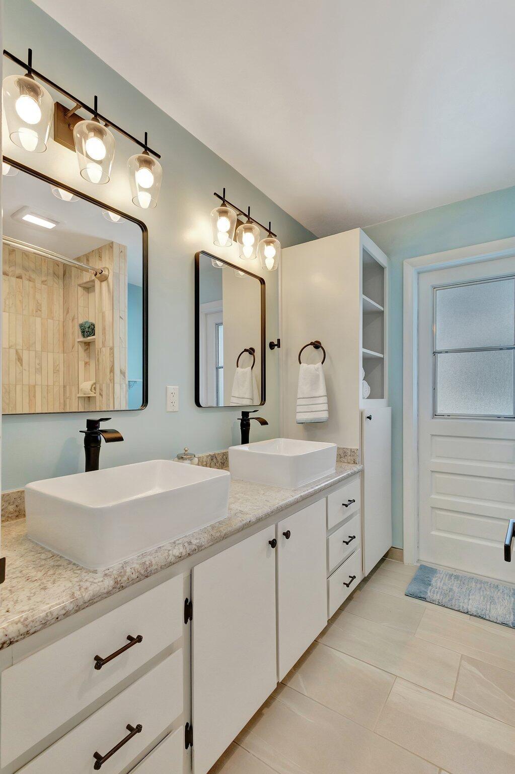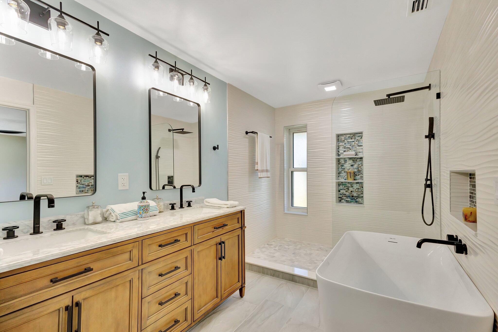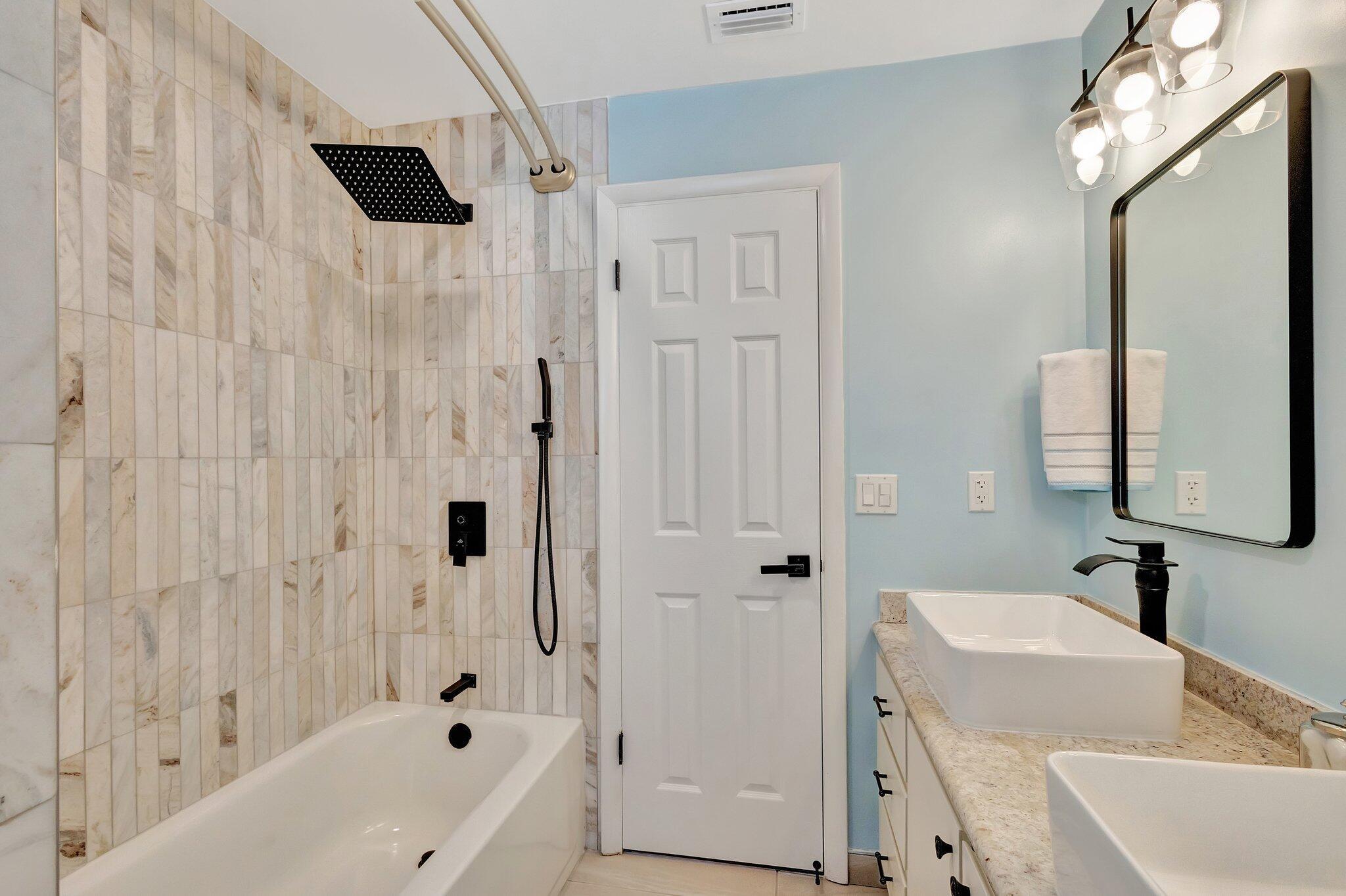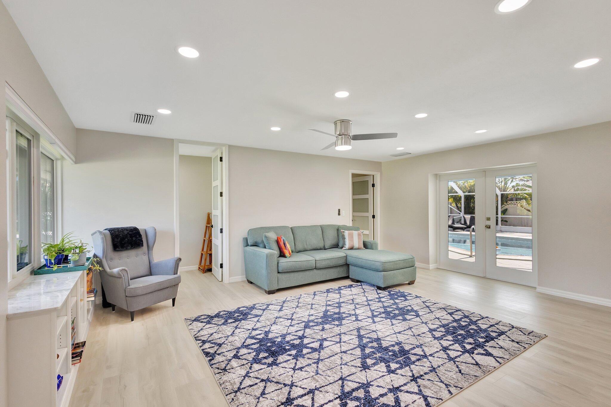 Welcome to 1081 Bimini Lane, the perfect combination of elegance, entertainment, and joyful relaxation. This beautiful 3-bedroom 2-bath open-concept home is newly renovated and located on the coveted Singer Island. Enter a bright and spacious living area, filled with natural light and new flooring throughout. The kitchen has been luxuriously remodeled to include stainless appliances, quartz countertops and an expansive peninsula, connecting seamlessly to the dining area and elegant ”wine wall”. Plenty of extras, including a touchless faucet and 2 lazy susans. An entertainer’s dream!The master bedroom is large and bright, with its own private entrance to the pool. The ensuite bathroom is an oasis of its own, with luxurious large shower, separate tub, double-sink wood cabinet with