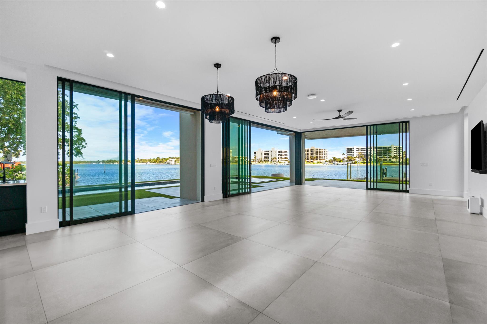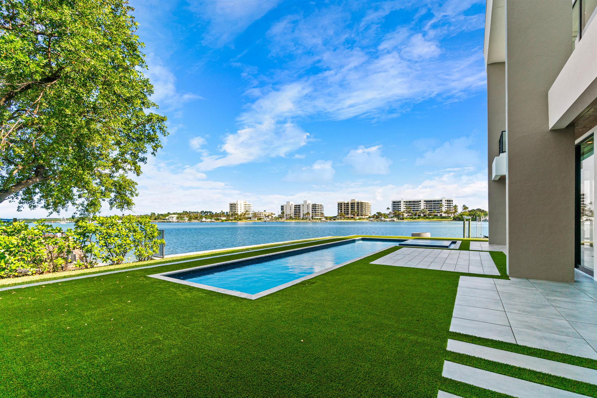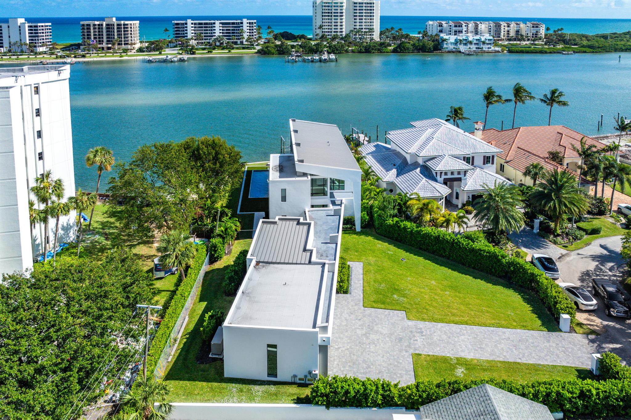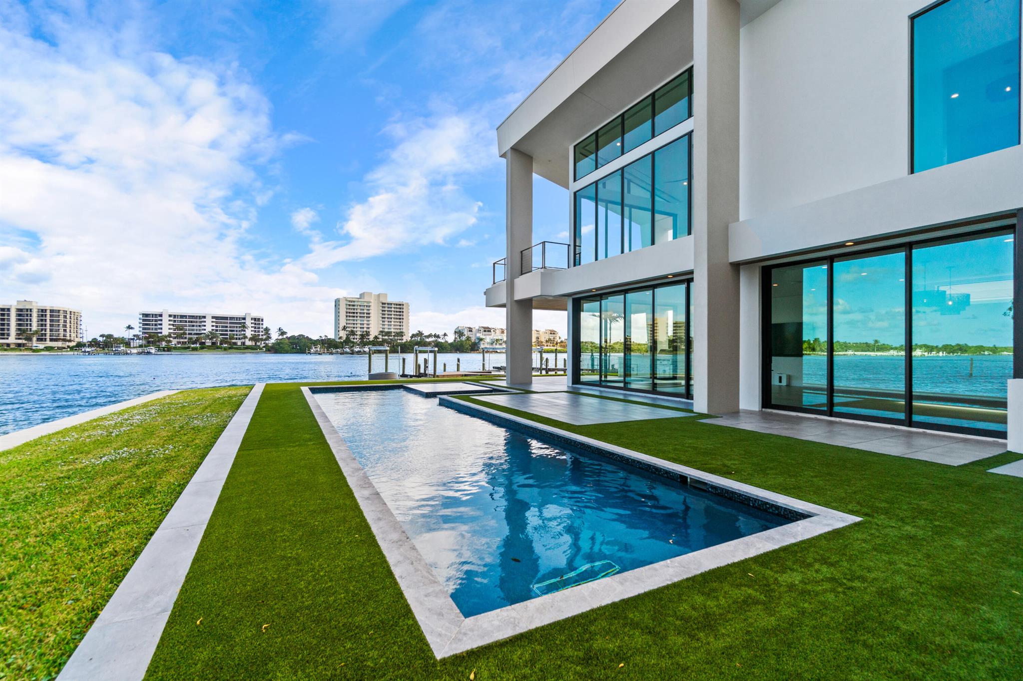 Discover the epitome of luxury waterfront living with this newly built (2022) modern estate, boasting 180 feet of Intracoastal frontage and stunning blue-water views. Designed and constructed by Rothrock Construction, this home combines impeccable craftsmanship with sleek, contemporary design. Situated on a 0.5-acre lot with no HOA, it offers privacy and sophistication.The main residence features expansive glass walls, an open-concept layout, soaring ceilings, a gas stove, and high-end finishes throughout. A separate guest house provides additional privacy and comfort for visitors.The outdoor living spaces are equally impressive, surrounded by turf landscaping for low maintenance and a lush, modern aesthetic.