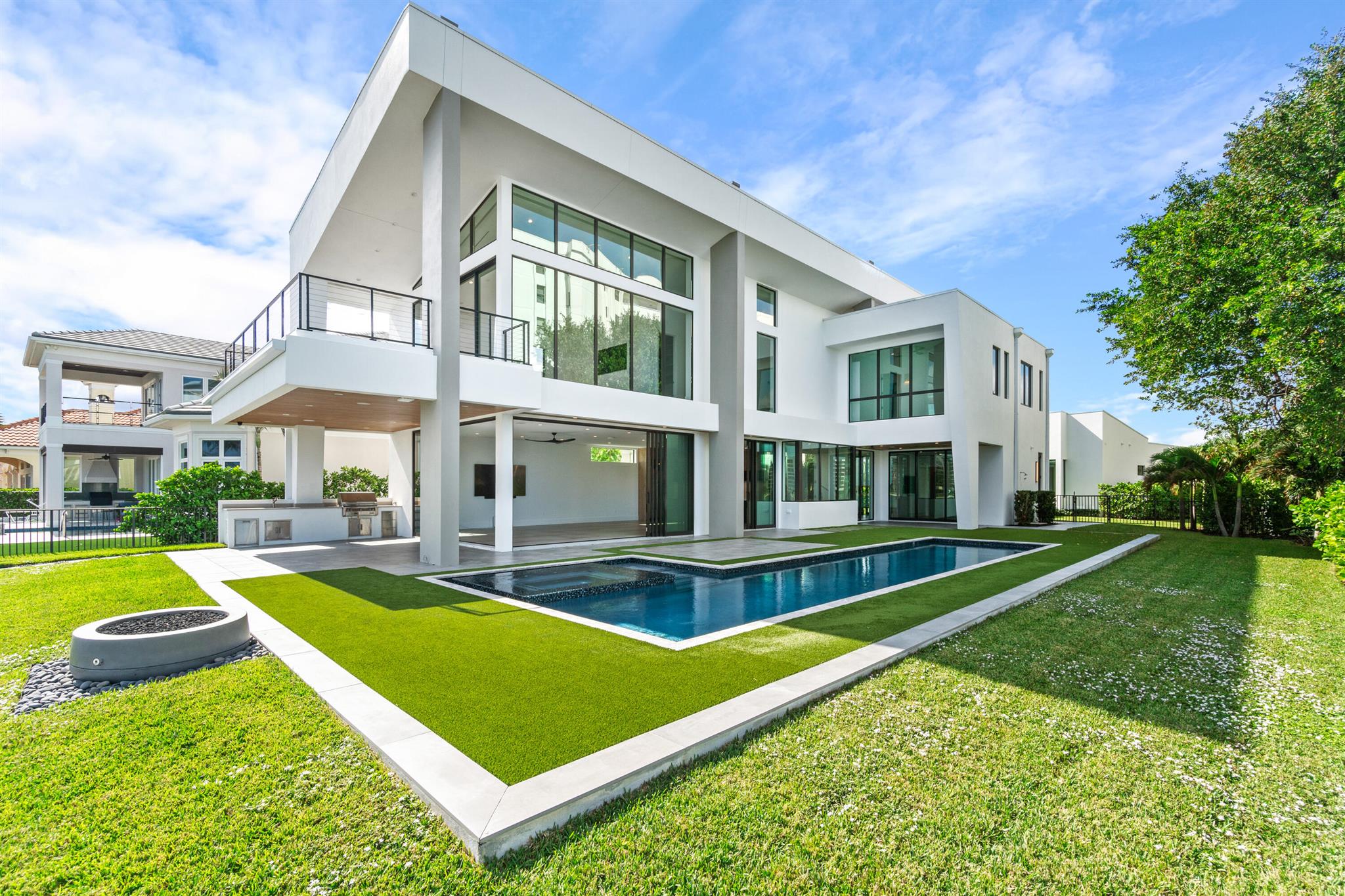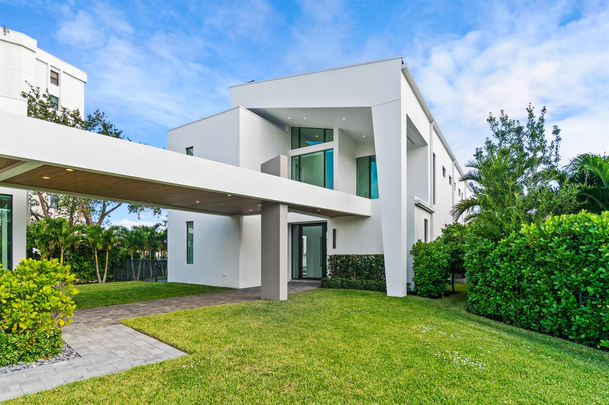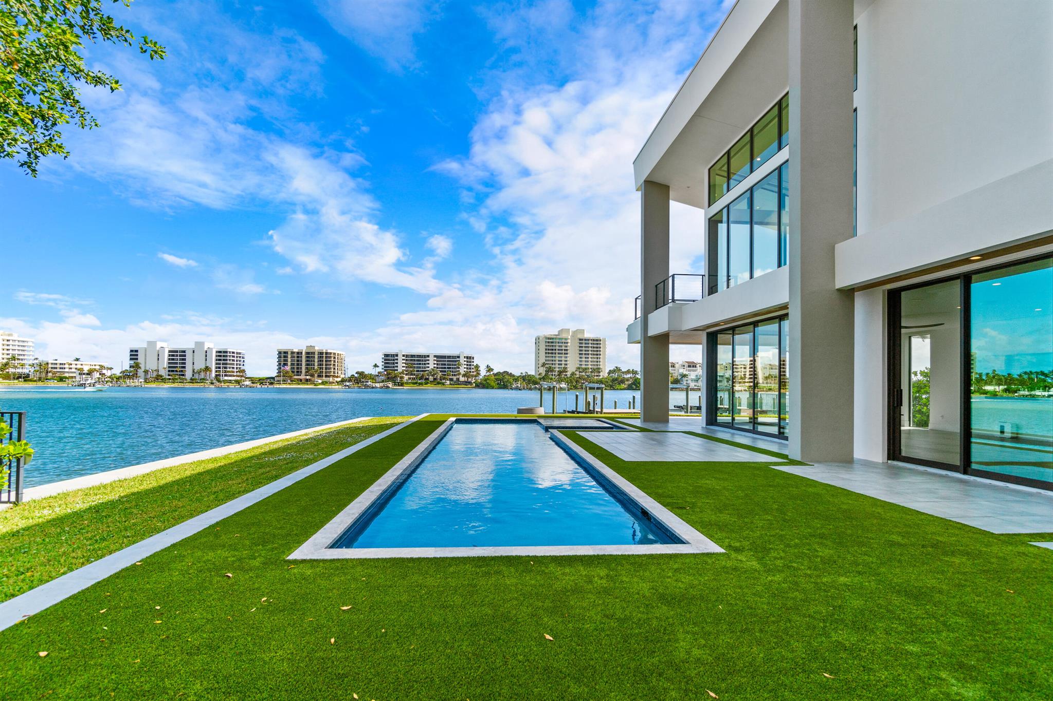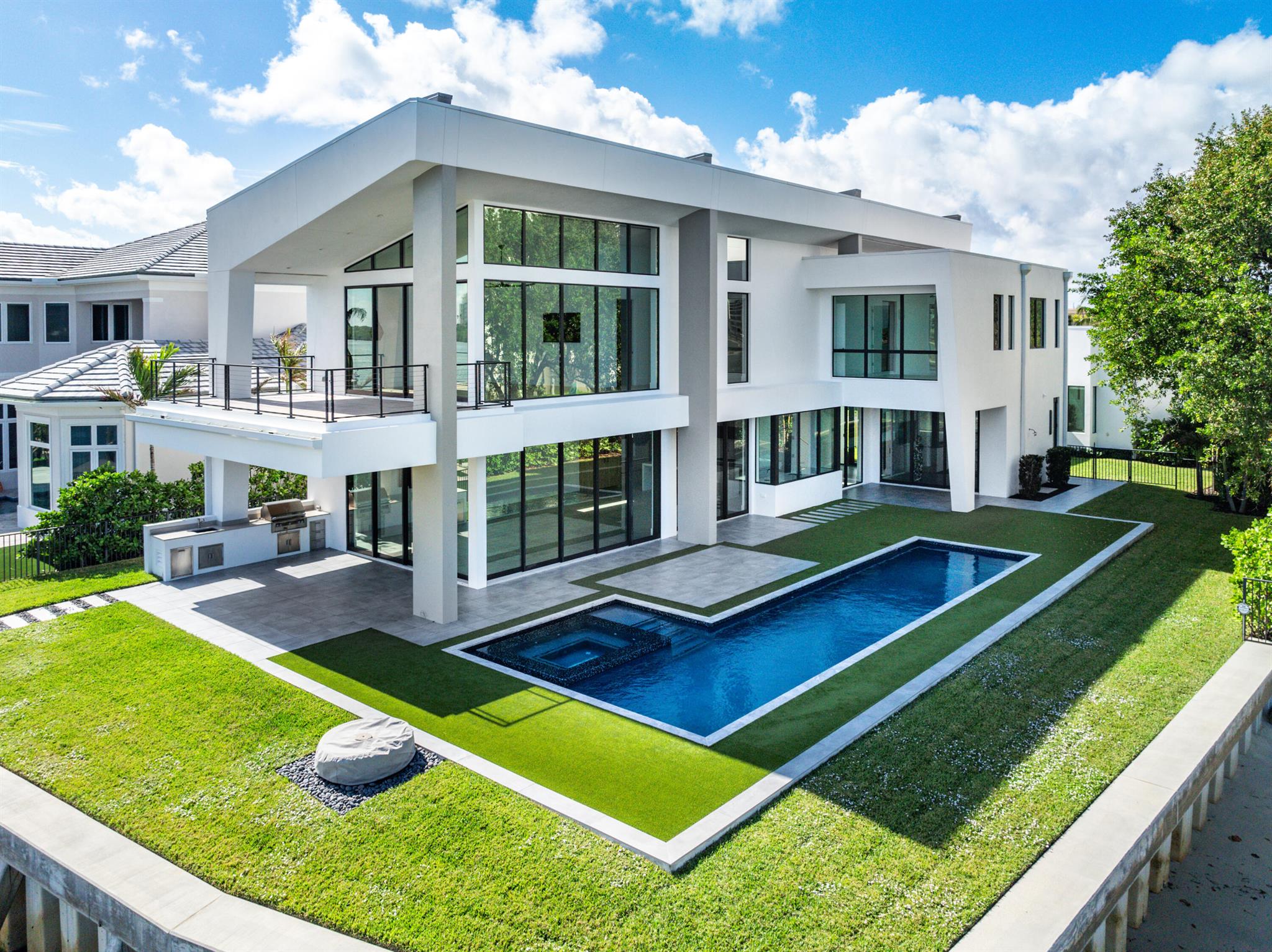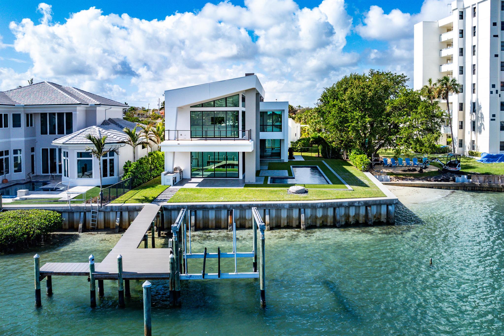 Discover the epitome of luxury waterfront living with this newly built (2022) modern estate, boasting 180 feet of Intracoastal frontage and stunning blue-water views. Designed and constructed by Rothrock Construction, this home combines impeccable craftsmanship with sleek, contemporary design. Situated on a 0.5-acre lot with no HOA, it offers privacy and sophistication.The main residence features expansive glass walls, an open-concept layout, soaring ceilings, a gas stove, and high-end finishes throughout. A separate guest house provides additional privacy and comfort for visitors.The outdoor living spaces are equally impressive, surrounded by turf landscaping for low maintenance and a lush, modern aesthetic.