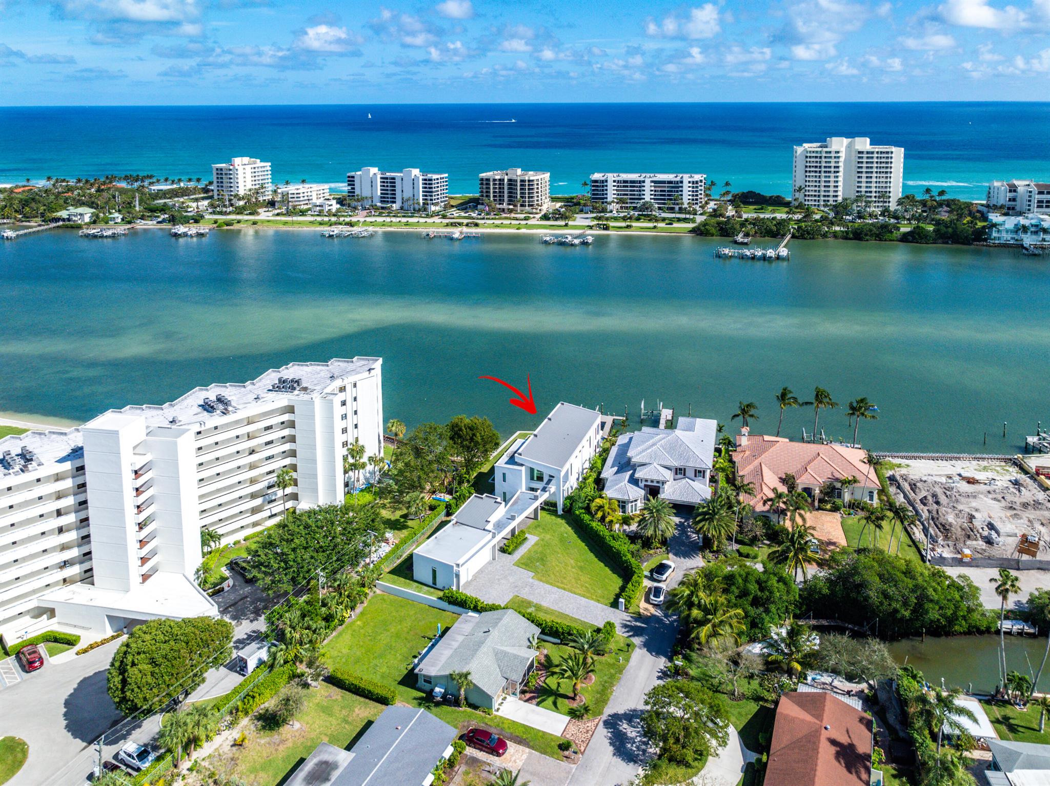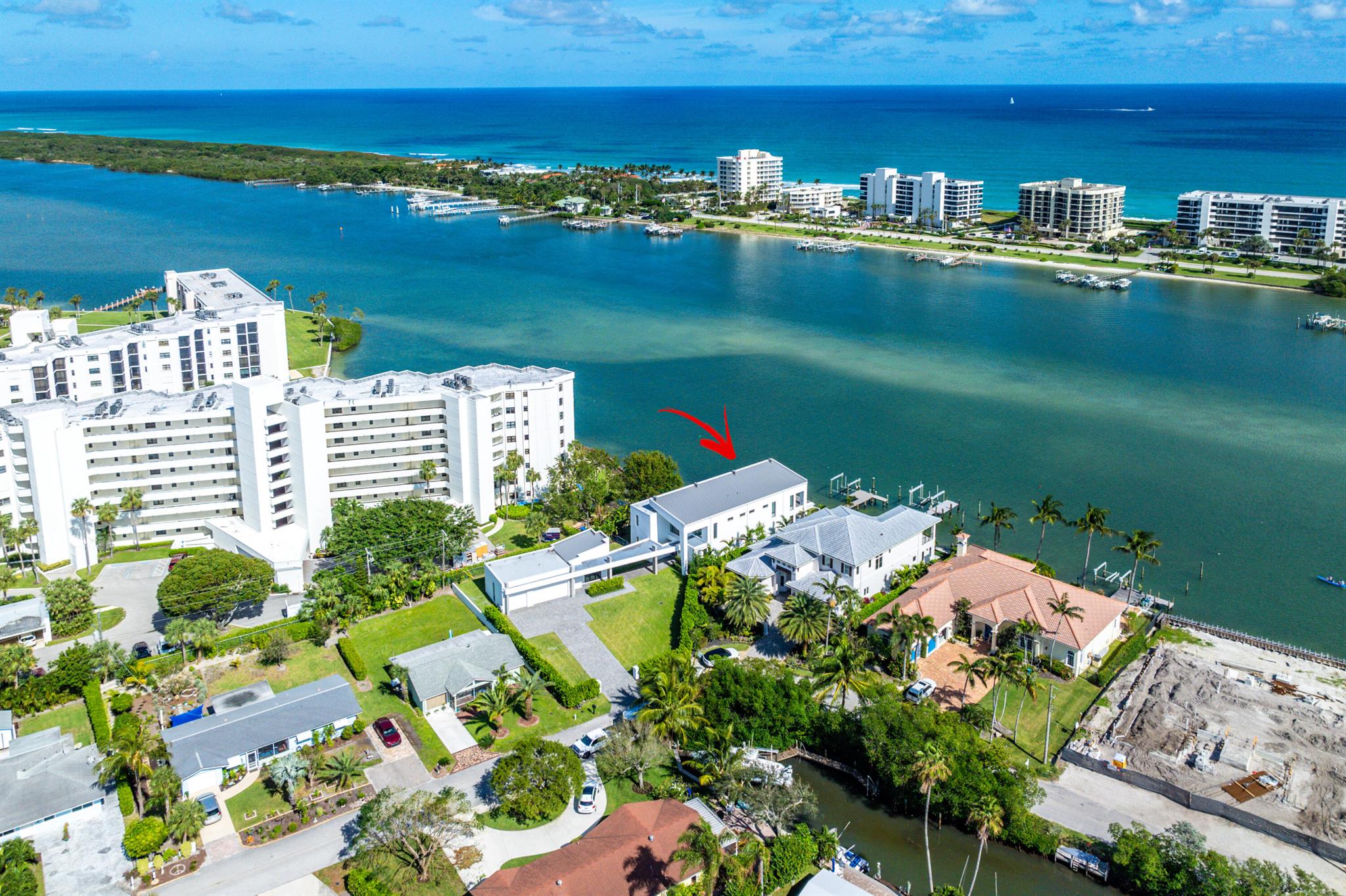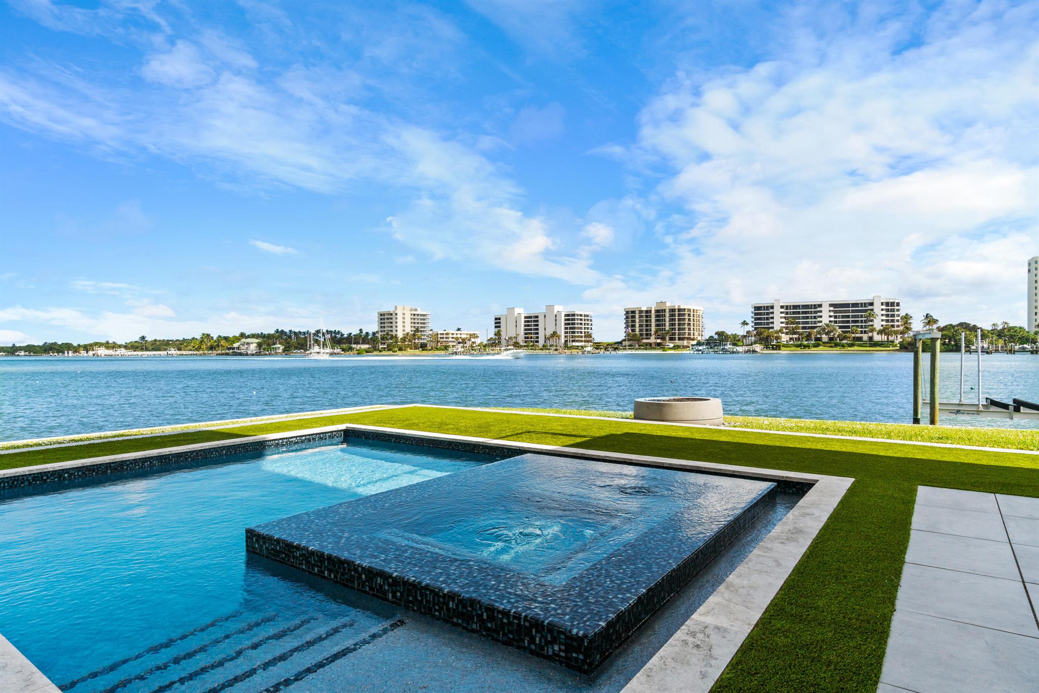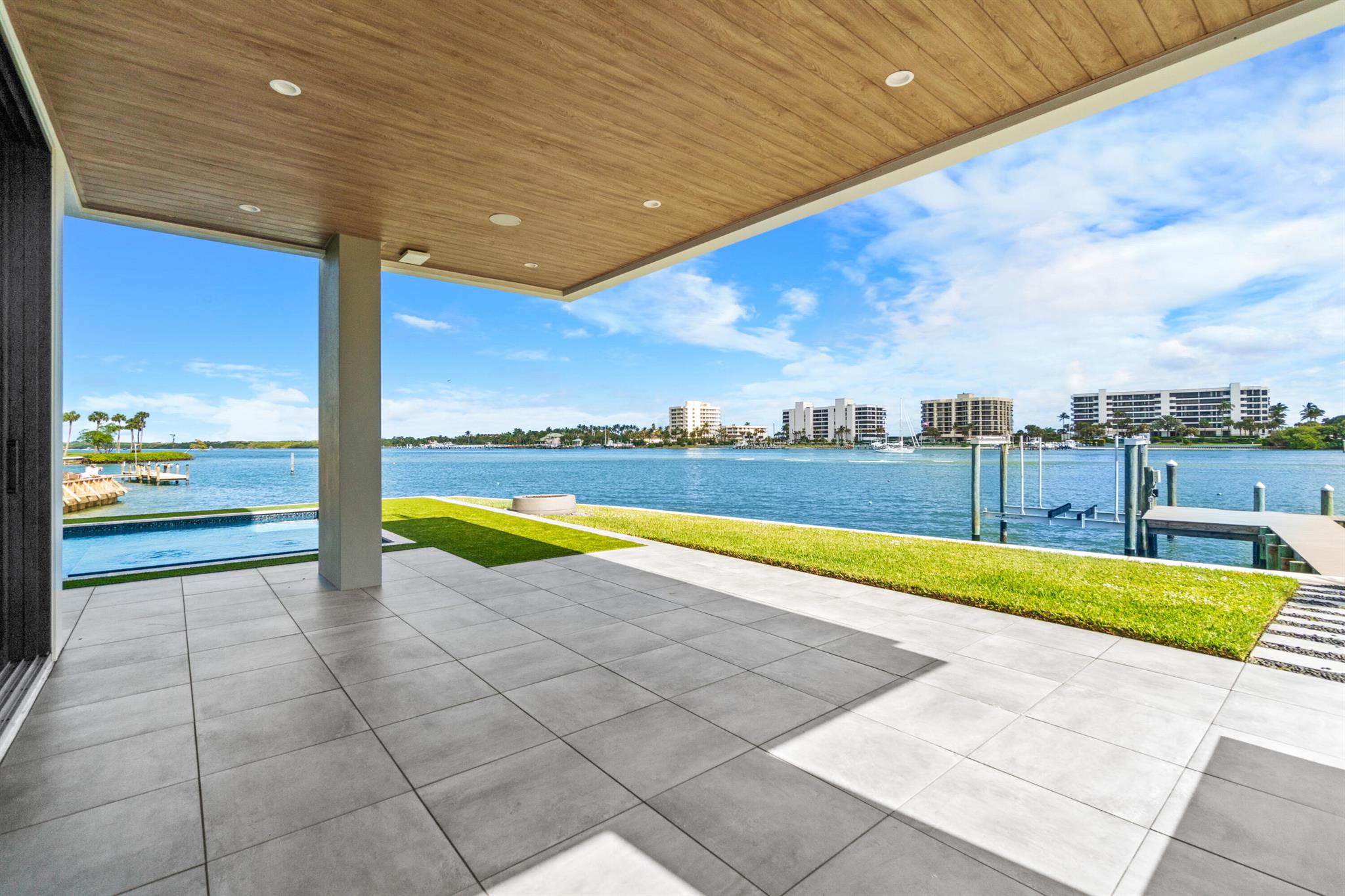 Discover the epitome of luxury waterfront living with this newly built (2022) modern estate, boasting 180 feet of Intracoastal frontage and stunning blue-water views. Designed and constructed by Rothrock Construction, this home combines impeccable craftsmanship with sleek, contemporary design. Situated on a 0.5-acre lot with no HOA, it offers privacy and sophistication.The main residence features expansive glass walls, an open-concept layout, soaring ceilings, a gas stove, and high-end finishes throughout. A separate guest house provides additional privacy and comfort for visitors.The outdoor living spaces are equally impressive, surrounded by turf landscaping for low maintenance and a lush, modern aesthetic.