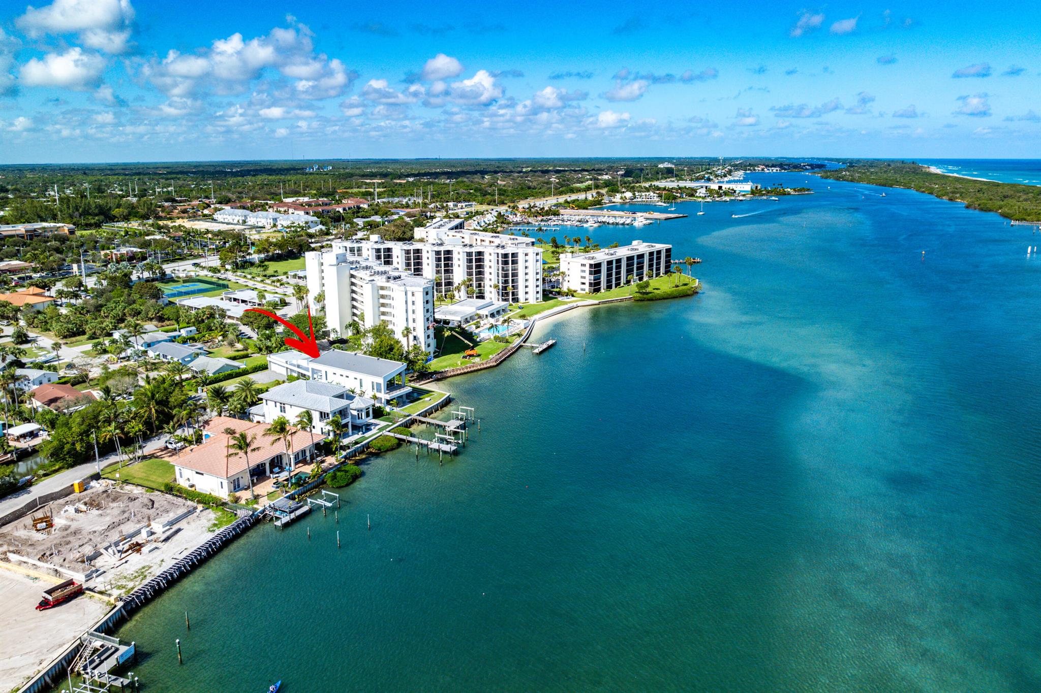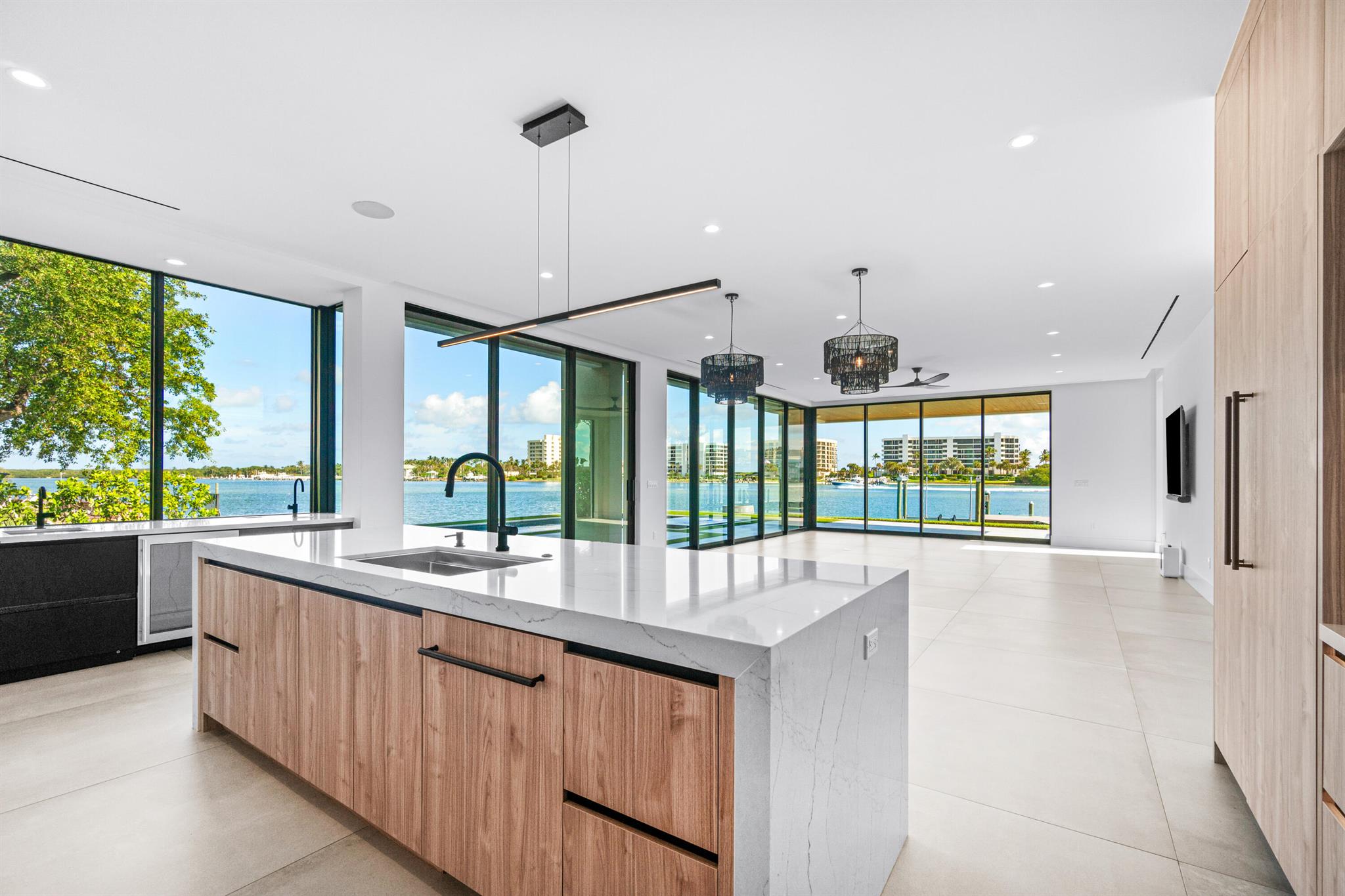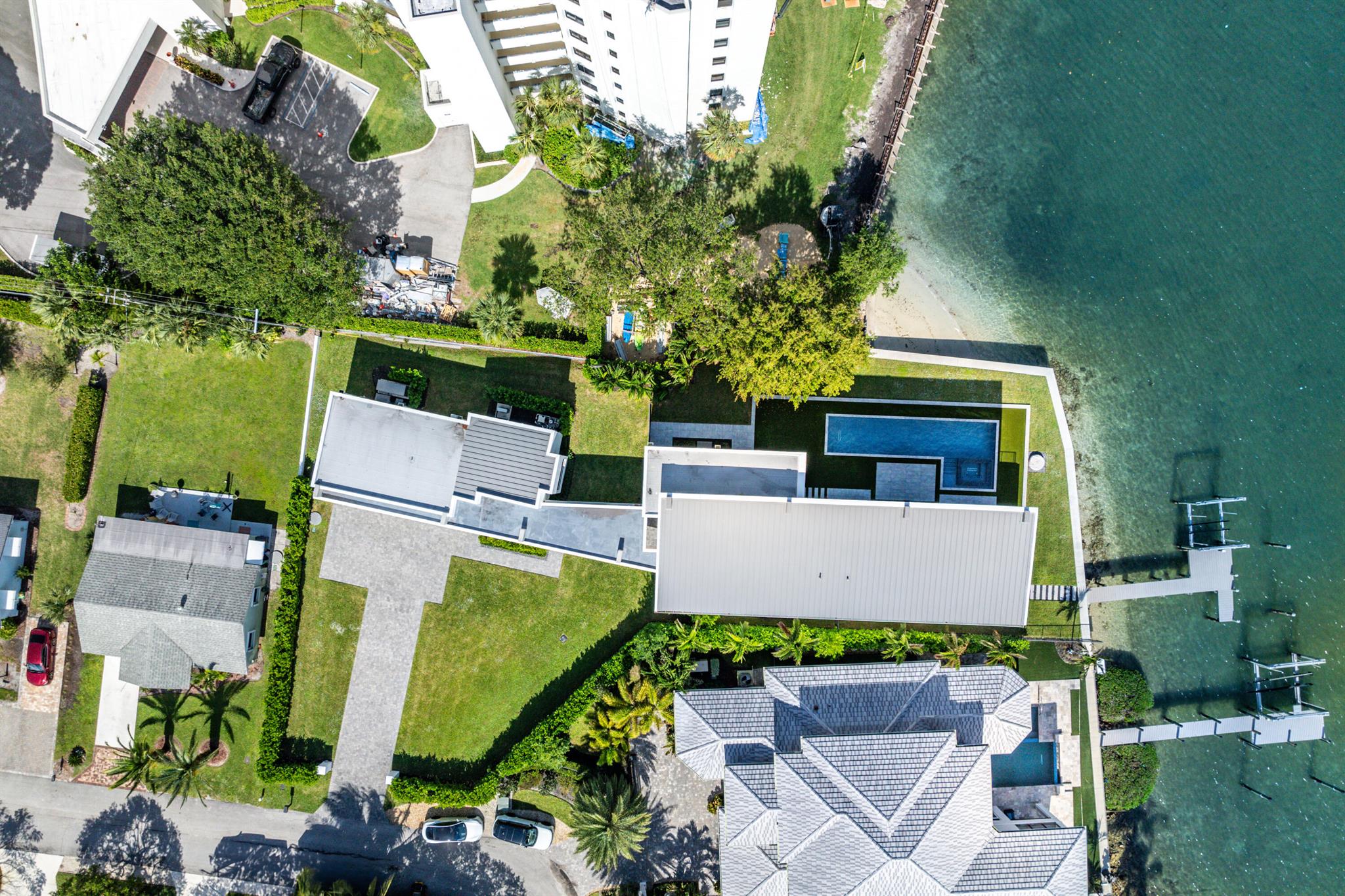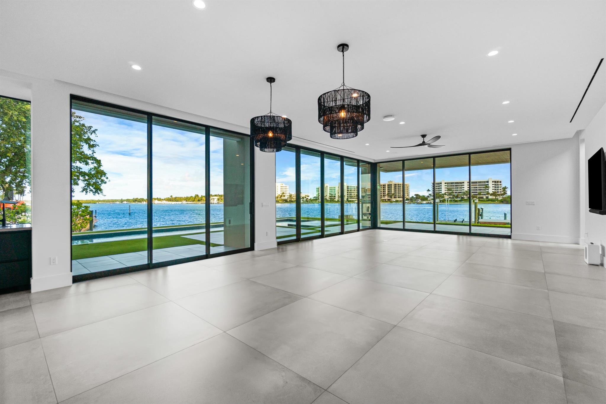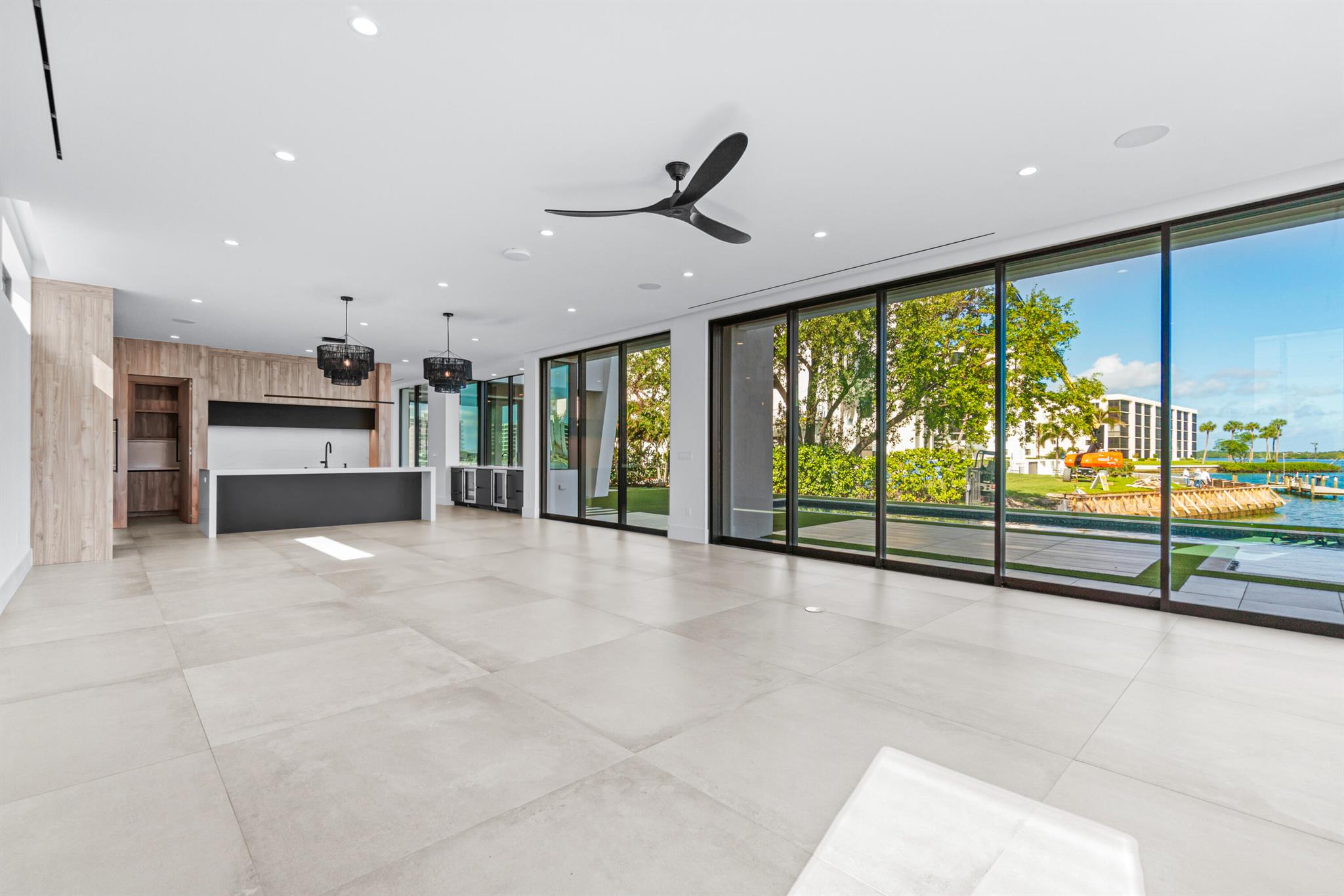 Discover the epitome of luxury waterfront living with this newly built (2022) modern estate, boasting 180 feet of Intracoastal frontage and stunning blue-water views. Designed and constructed by Rothrock Construction, this home combines impeccable craftsmanship with sleek, contemporary design. Situated on a 0.5-acre lot with no HOA, it offers privacy and sophistication.The main residence features expansive glass walls, an open-concept layout, soaring ceilings, a gas stove, and high-end finishes throughout. A separate guest house provides additional privacy and comfort for visitors.The outdoor living spaces are equally impressive, surrounded by turf landscaping for low maintenance and a lush, modern aesthetic.
