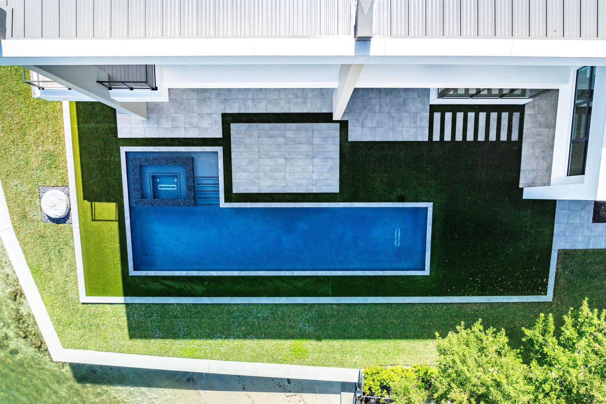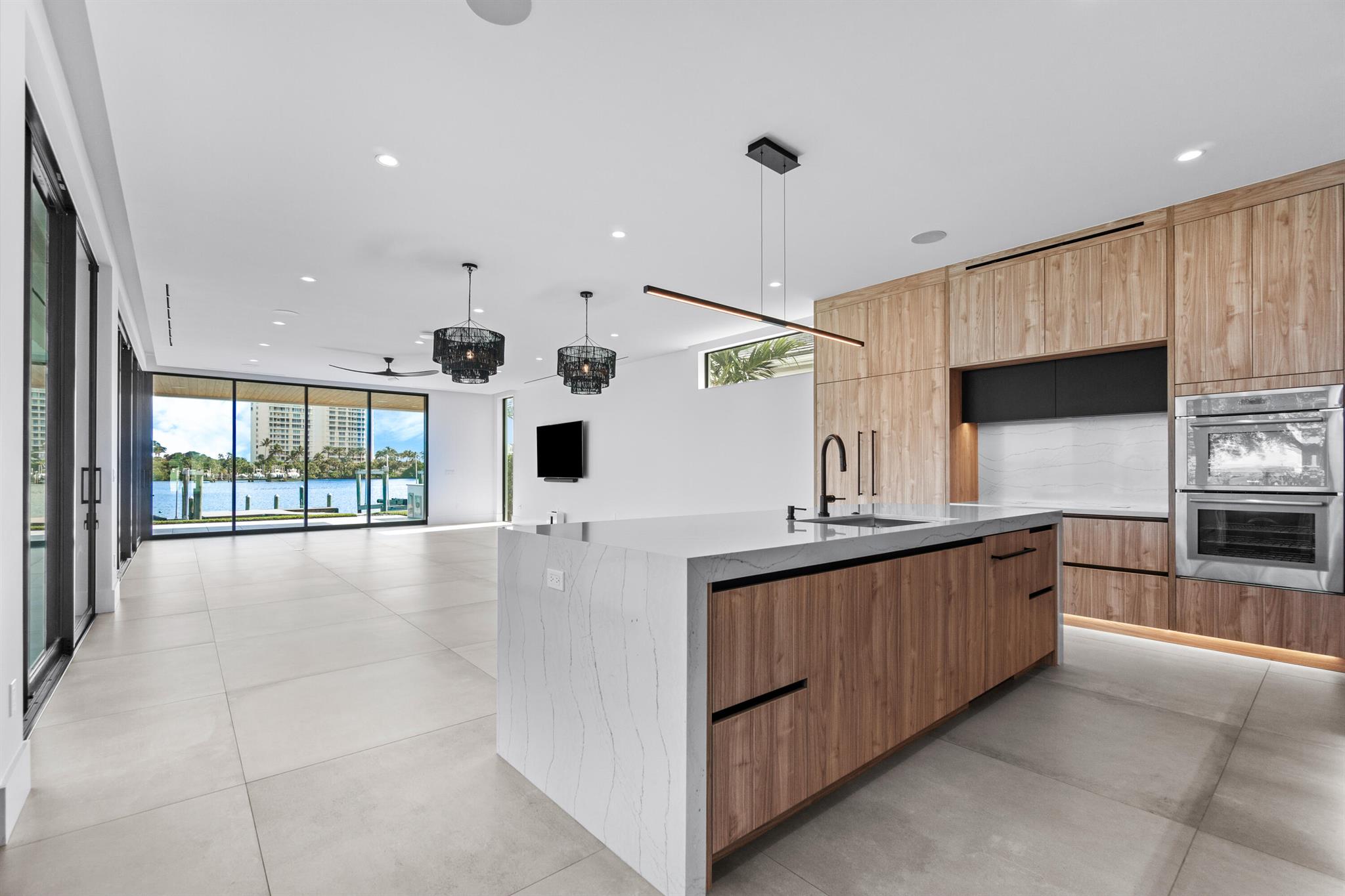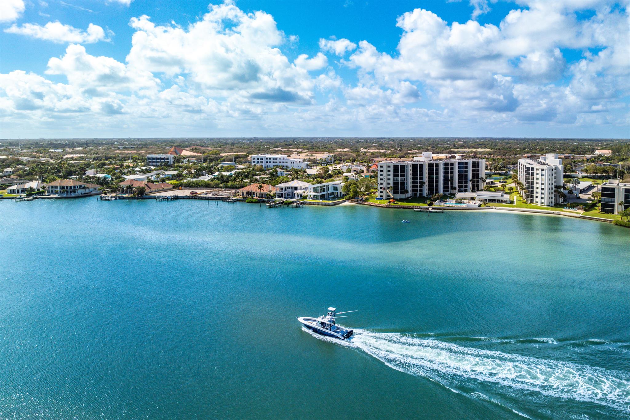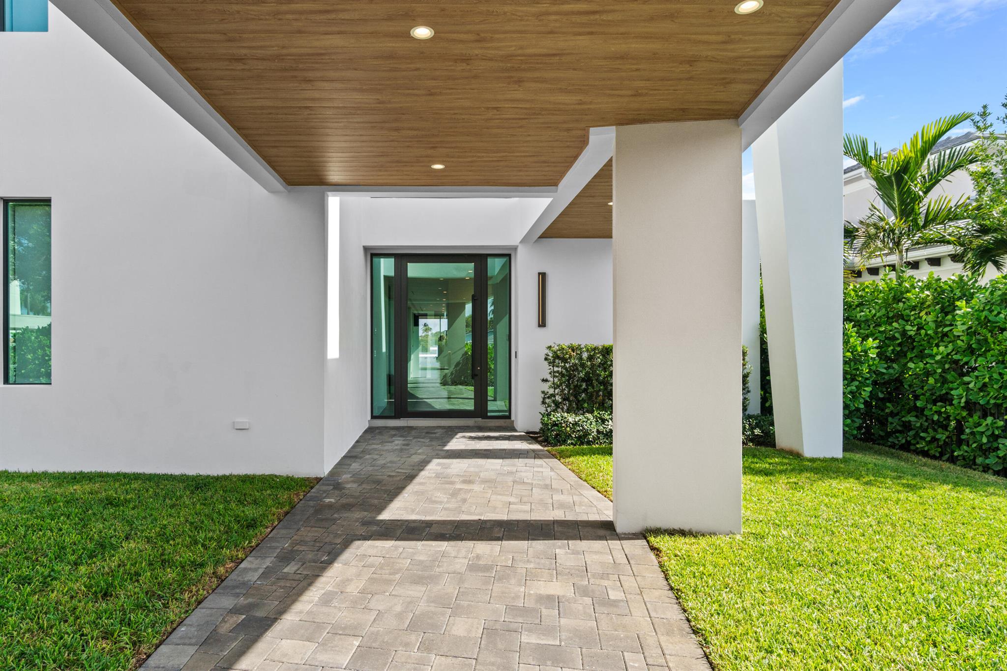 Discover the epitome of luxury waterfront living with this newly built (2022) modern estate, boasting 180 feet of Intracoastal frontage and stunning blue-water views. Designed and constructed by Rothrock Construction, this home combines impeccable craftsmanship with sleek, contemporary design. Situated on a 0.5-acre lot with no HOA, it offers privacy and sophistication.The main residence features expansive glass walls, an open-concept layout, soaring ceilings, a gas stove, and high-end finishes throughout. A separate guest house provides additional privacy and comfort for visitors.The outdoor living spaces are equally impressive, surrounded by turf landscaping for low maintenance and a lush, modern aesthetic.