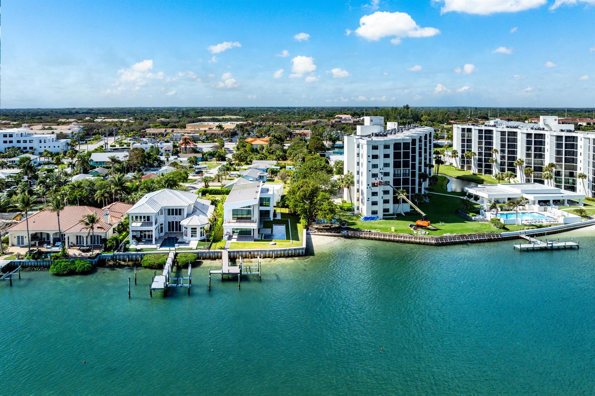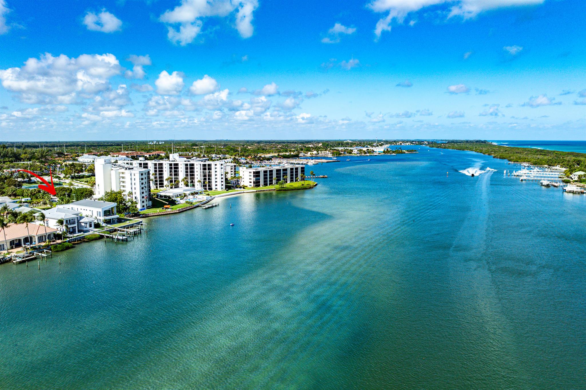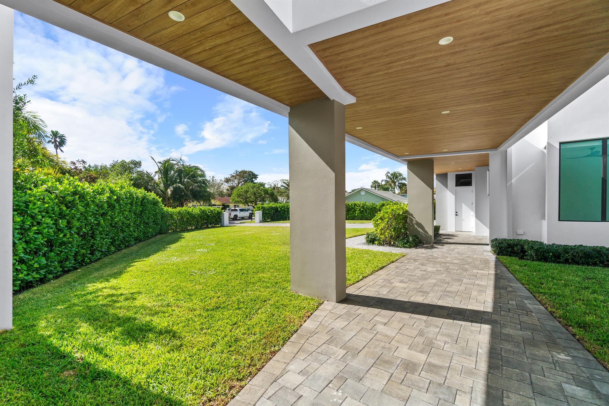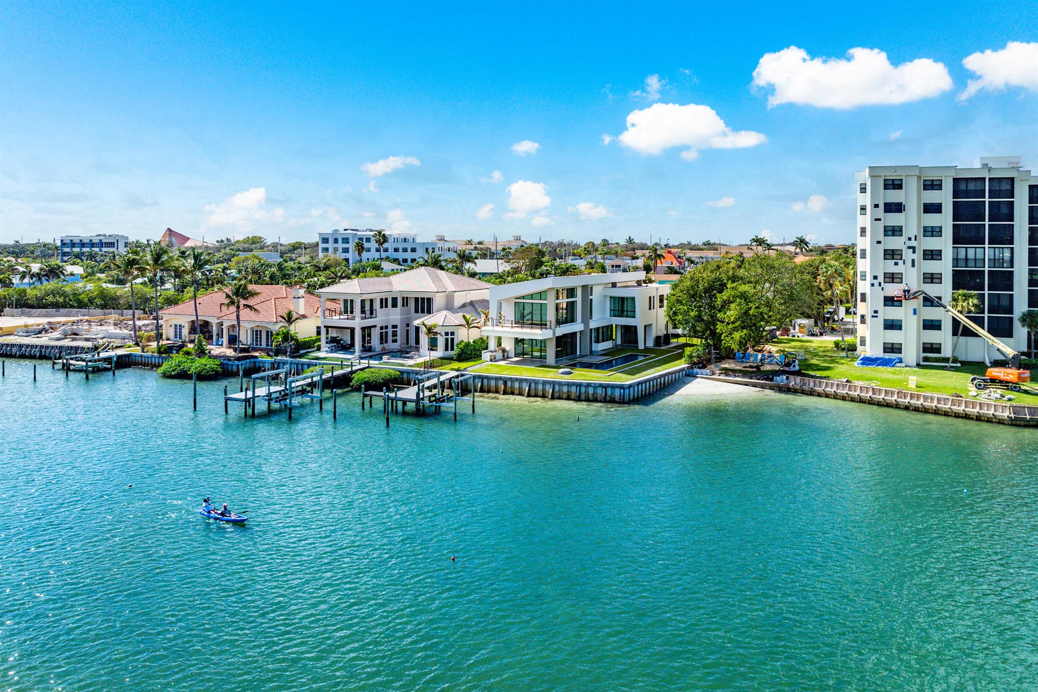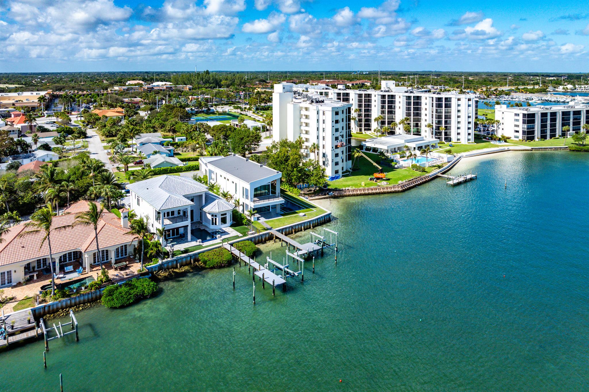 Discover the epitome of luxury waterfront living with this newly built (2022) modern estate, boasting 180 feet of Intracoastal frontage and stunning blue-water views. Designed and constructed by Rothrock Construction, this home combines impeccable craftsmanship with sleek, contemporary design. Situated on a 0.5-acre lot with no HOA, it offers privacy and sophistication.The main residence features expansive glass walls, an open-concept layout, soaring ceilings, a gas stove, and high-end finishes throughout. A separate guest house provides additional privacy and comfort for visitors.The outdoor living spaces are equally impressive, surrounded by turf landscaping for low maintenance and a lush, modern aesthetic.