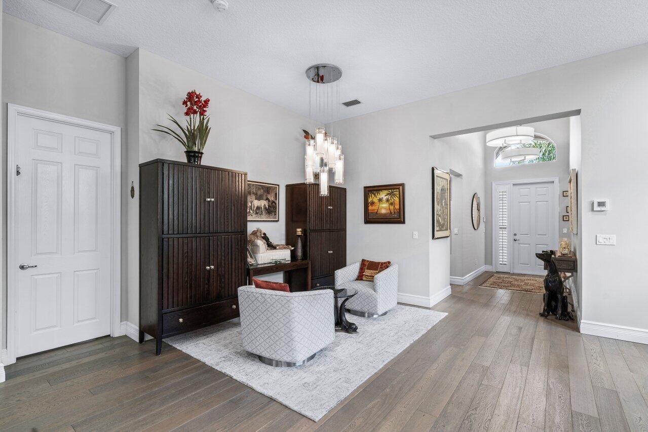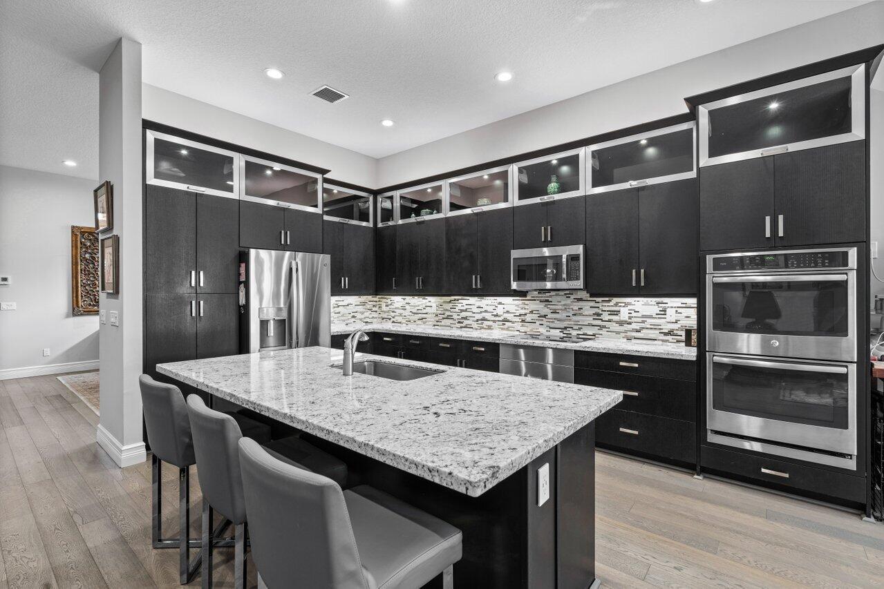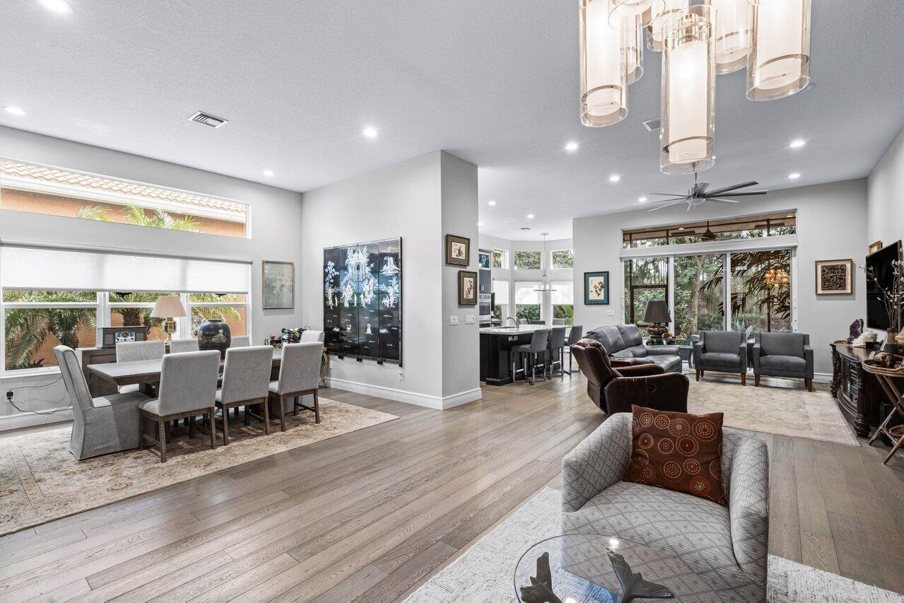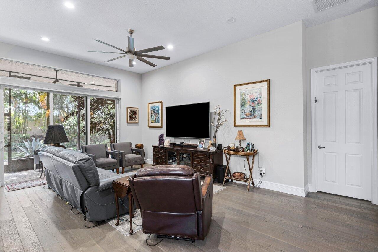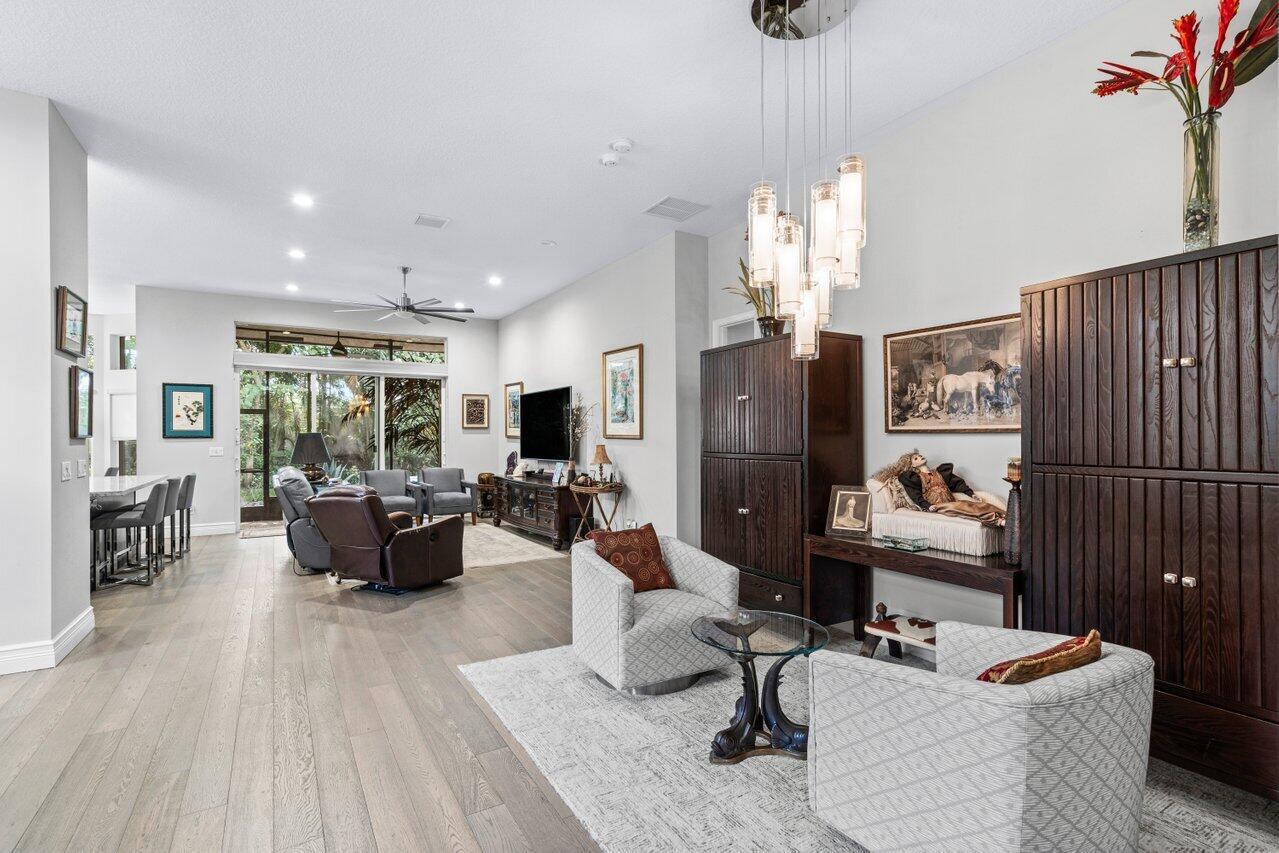 This stunning, open, and light-filled three-bedroom plus den home, featuring two and a half baths, is perfectly designed for entertaining. Elegant wood floors flow throughout, complementing the high ceilings and thoughtfully designed spaces. The impressive gourmet kitchen boasts extended cabinetry, granite countertops, stainless steel appliances, a wall oven, and a spacious seated island. Hurricane impact glass, designer window treatments, plantation shutters, premium fitted closets, custom built-ins, and LED lighting enhance the home’s beauty and functionality. Two well-appointed guest rooms and upgraded bathrooms add to its appeal. Nestled on a lushly landscaped private lot, this home is truly a must-see. Located in Valencia Cove, an exceptional 55+ community. A must see!