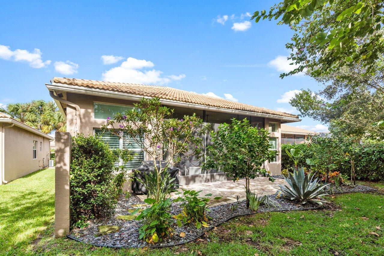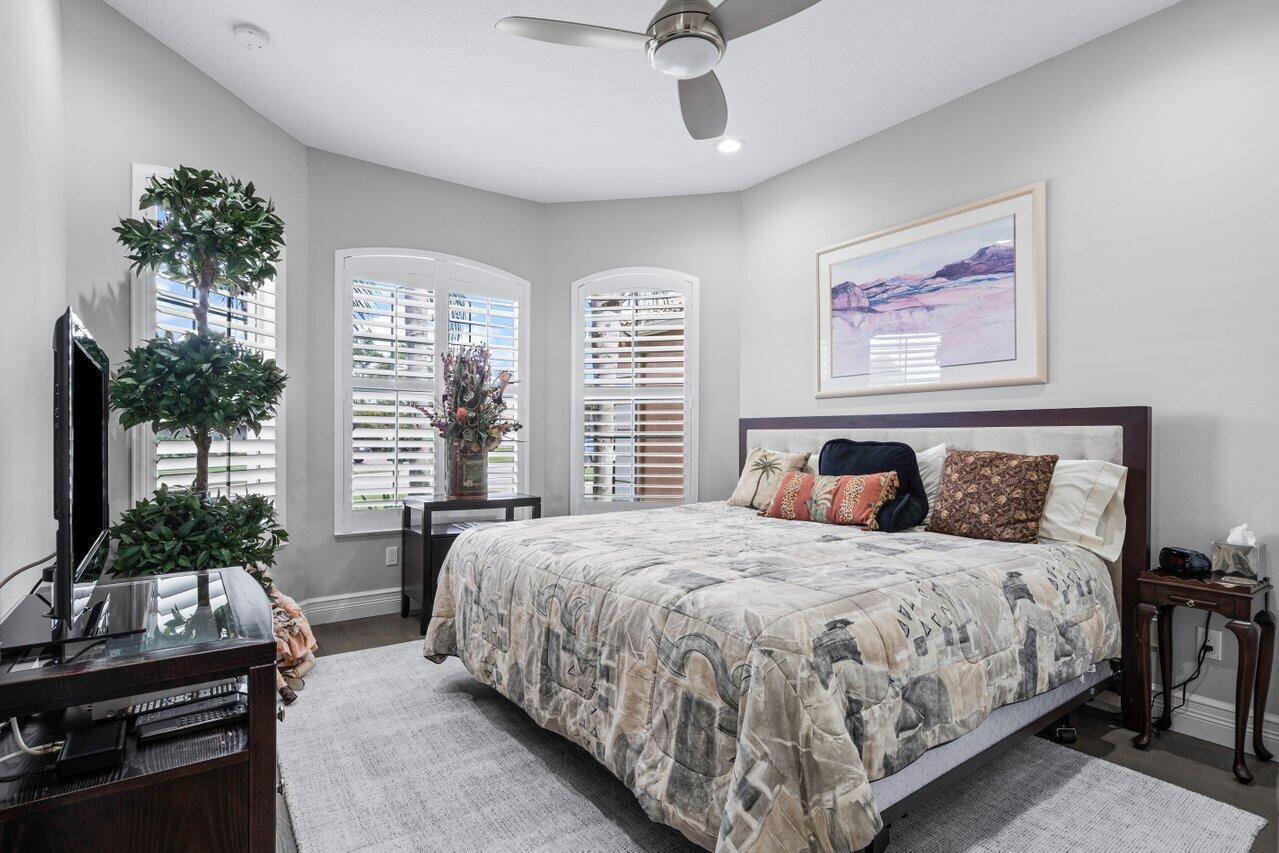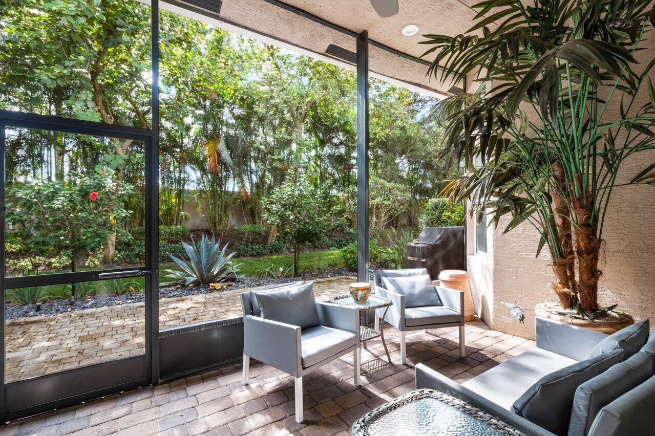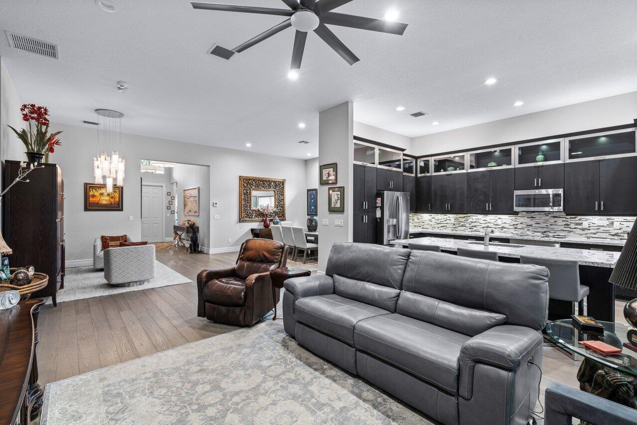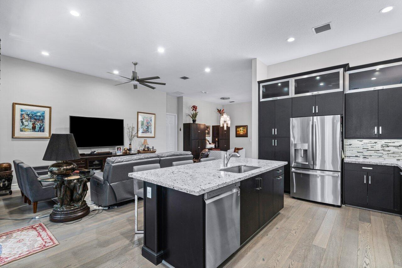 This stunning, open, and light-filled three-bedroom plus den home, featuring two and a half baths, is perfectly designed for entertaining. Elegant wood floors flow throughout, complementing the high ceilings and thoughtfully designed spaces. The impressive gourmet kitchen boasts extended cabinetry, granite countertops, stainless steel appliances, a wall oven, and a spacious seated island. Hurricane impact glass, designer window treatments, plantation shutters, premium fitted closets, custom built-ins, and LED lighting enhance the home’s beauty and functionality. Two well-appointed guest rooms and upgraded bathrooms add to its appeal. Nestled on a lushly landscaped private lot, this home is truly a must-see. Located in Valencia Cove, an exceptional 55+ community. A must see!