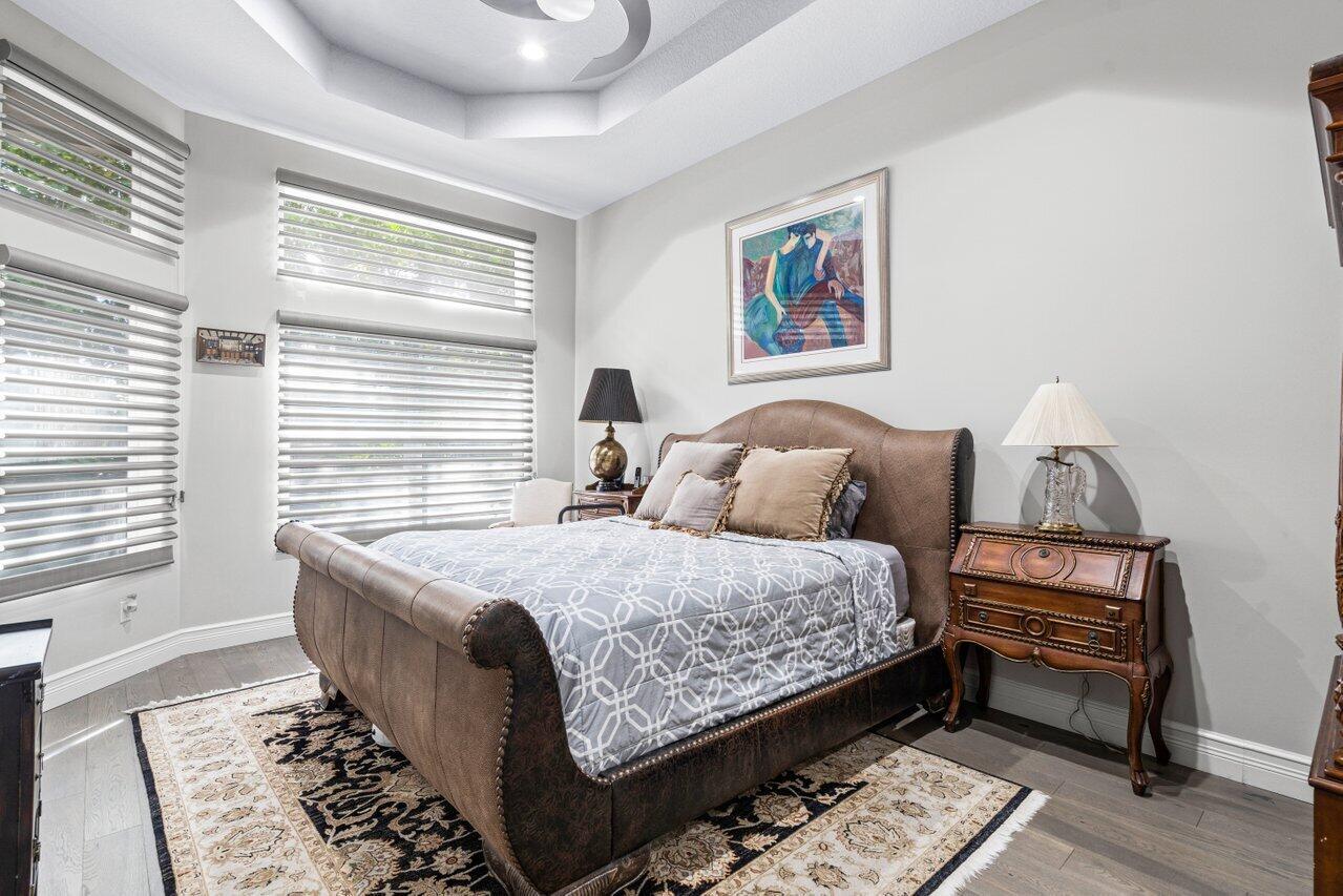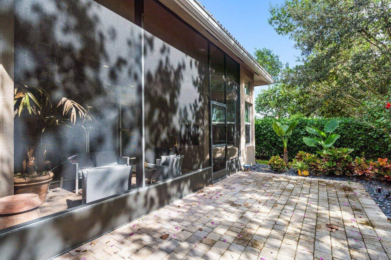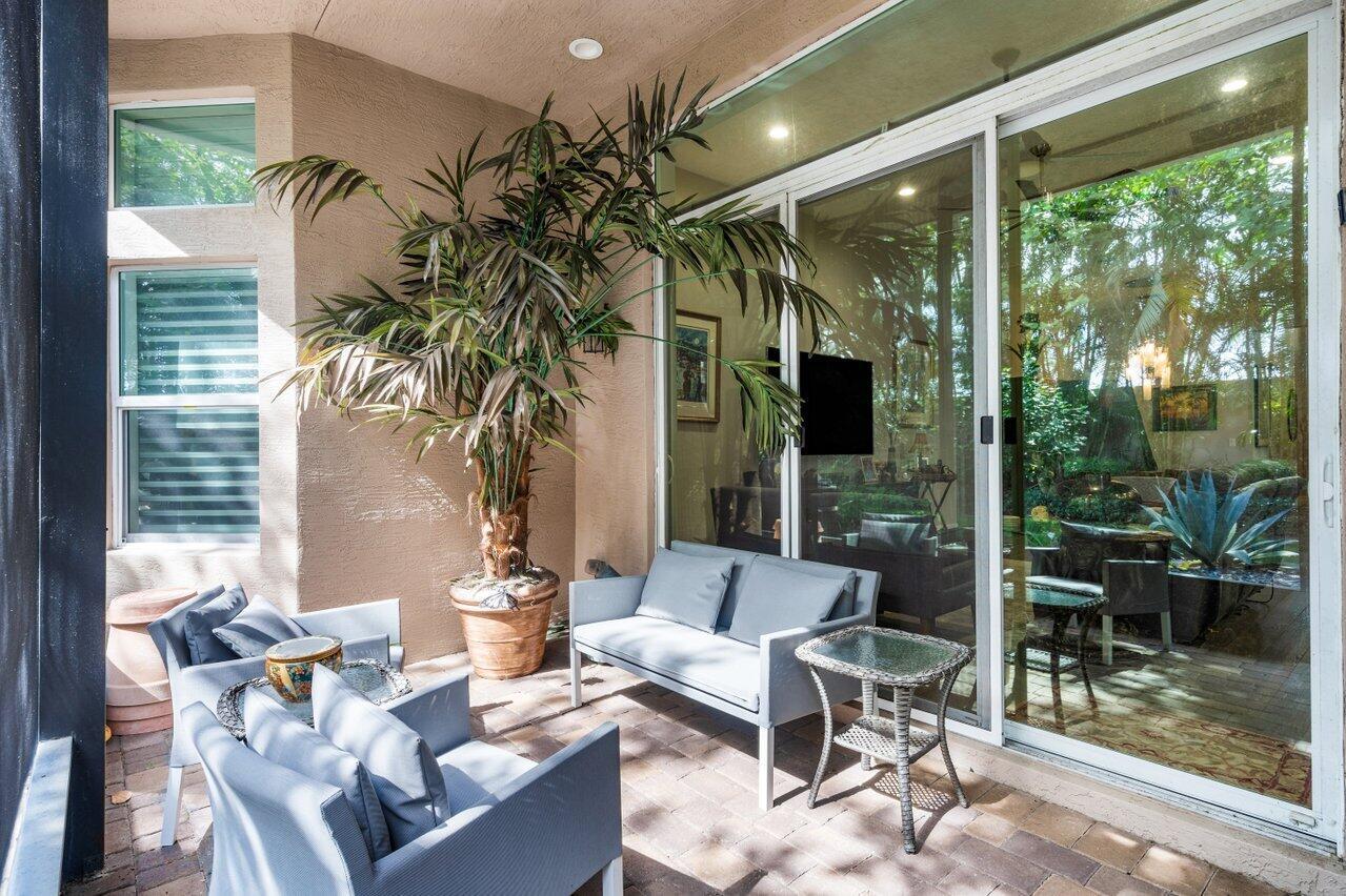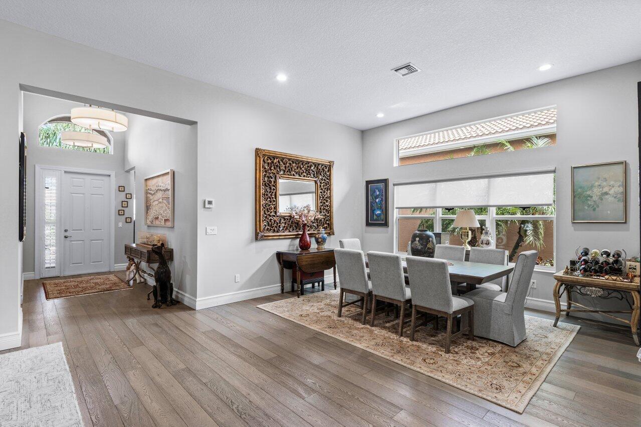 This stunning, open, and light-filled three-bedroom plus den home, featuring two and a half baths, is perfectly designed for entertaining. Elegant wood floors flow throughout, complementing the high ceilings and thoughtfully designed spaces. The impressive gourmet kitchen boasts extended cabinetry, granite countertops, stainless steel appliances, a wall oven, and a spacious seated island. Hurricane impact glass, designer window treatments, plantation shutters, premium fitted closets, custom built-ins, and LED lighting enhance the home’s beauty and functionality. Two well-appointed guest rooms and upgraded bathrooms add to its appeal. Nestled on a lushly landscaped private lot, this home is truly a must-see. Located in Valencia Cove, an exceptional 55+ community. A must see!