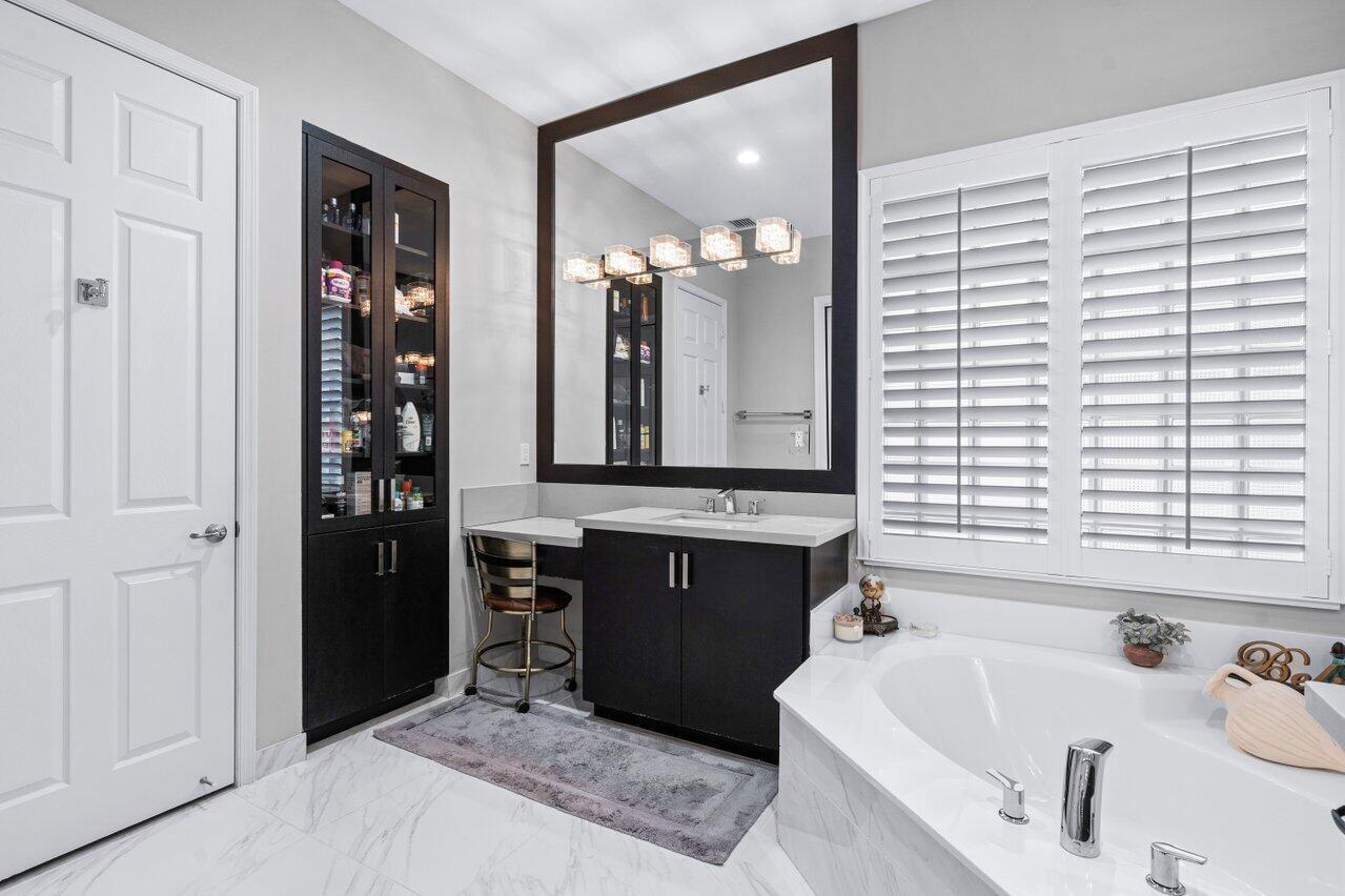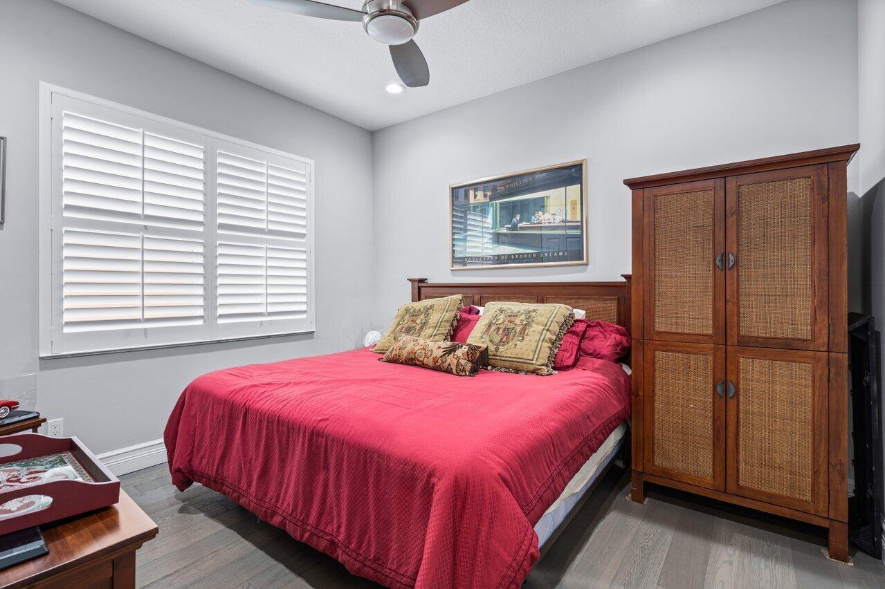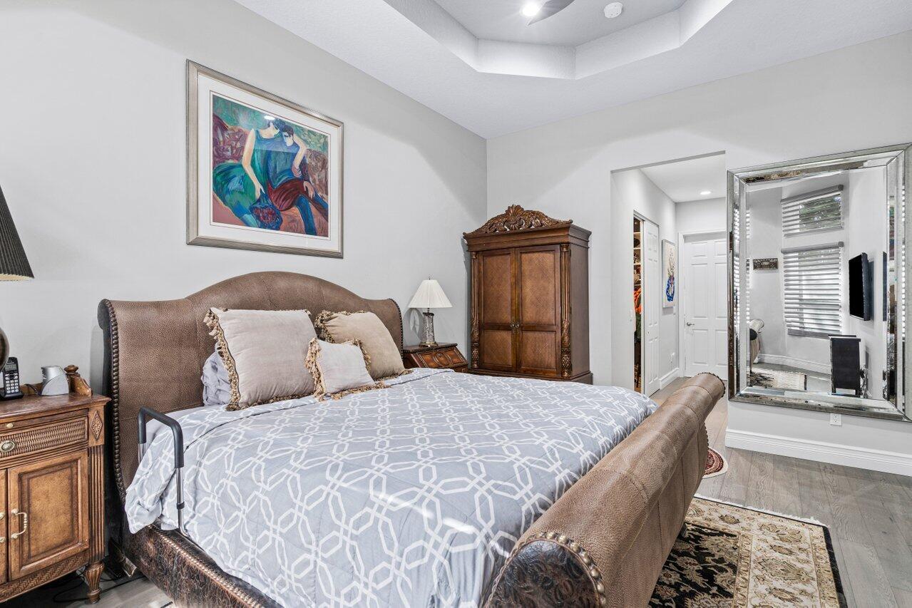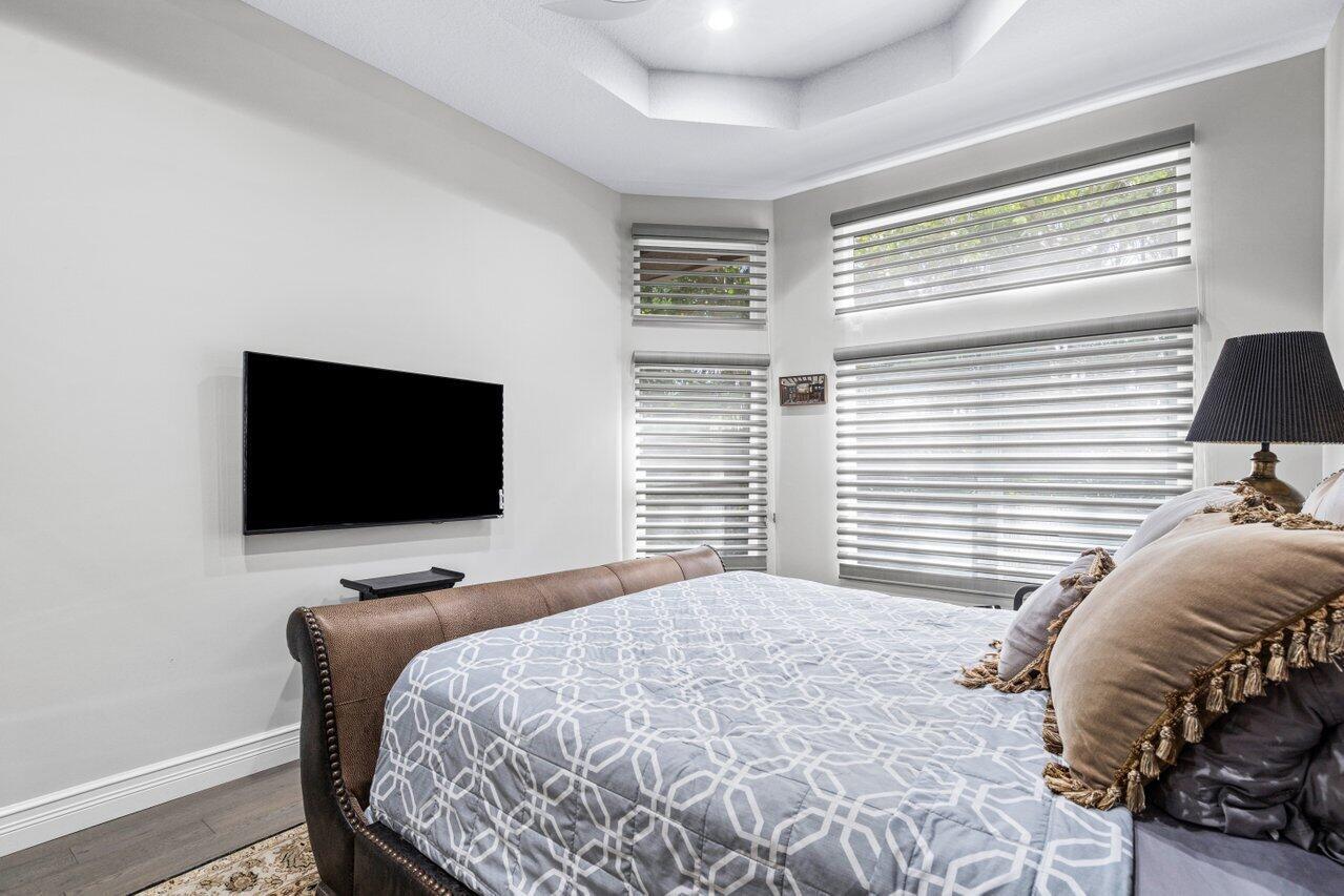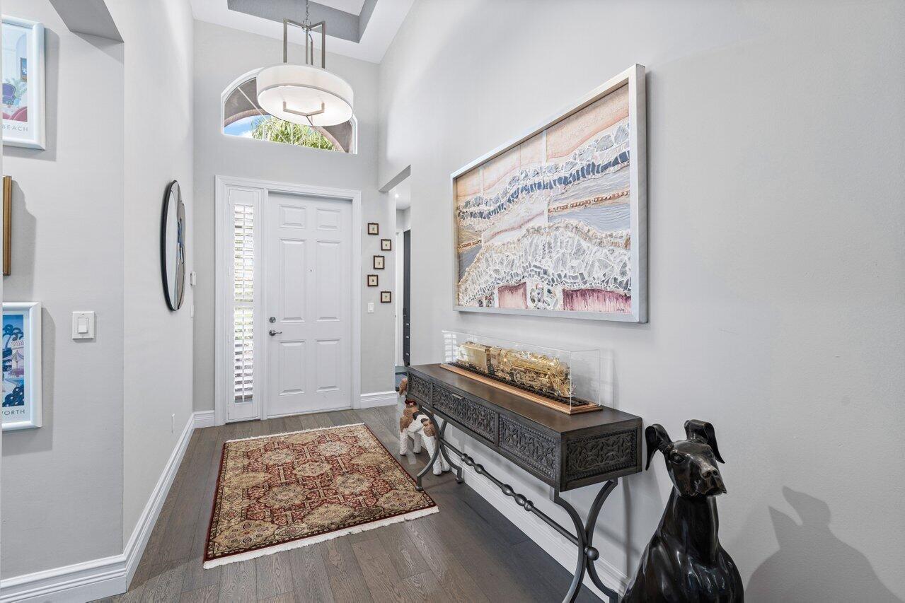 This stunning, open, and light-filled three-bedroom plus den home, featuring two and a half baths, is perfectly designed for entertaining. Elegant wood floors flow throughout, complementing the high ceilings and thoughtfully designed spaces. The impressive gourmet kitchen boasts extended cabinetry, granite countertops, stainless steel appliances, a wall oven, and a spacious seated island. Hurricane impact glass, designer window treatments, plantation shutters, premium fitted closets, custom built-ins, and LED lighting enhance the home’s beauty and functionality. Two well-appointed guest rooms and upgraded bathrooms add to its appeal. Nestled on a lushly landscaped private lot, this home is truly a must-see. Located in Valencia Cove, an exceptional 55+ community. A must see!