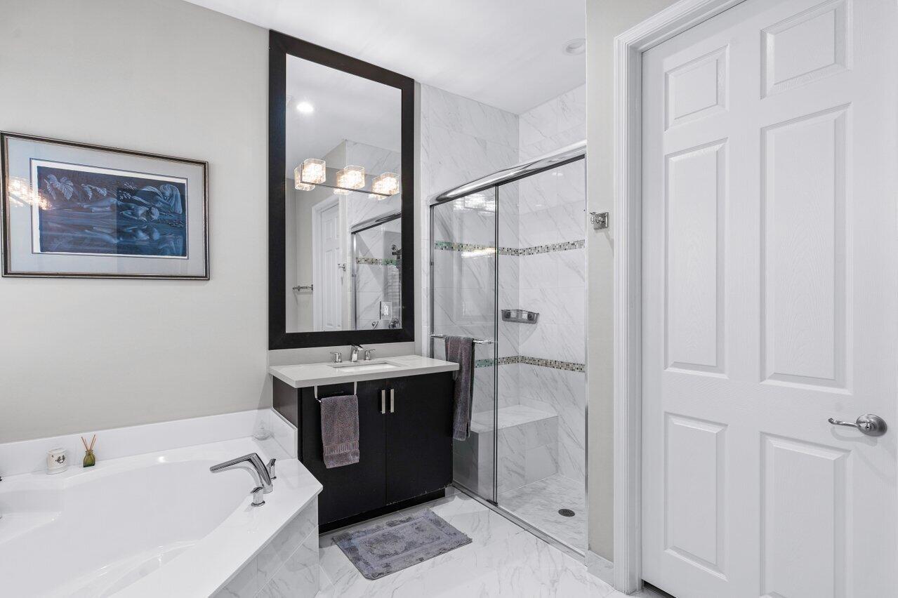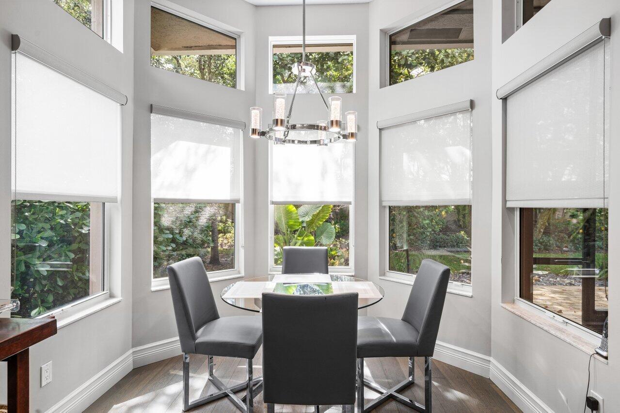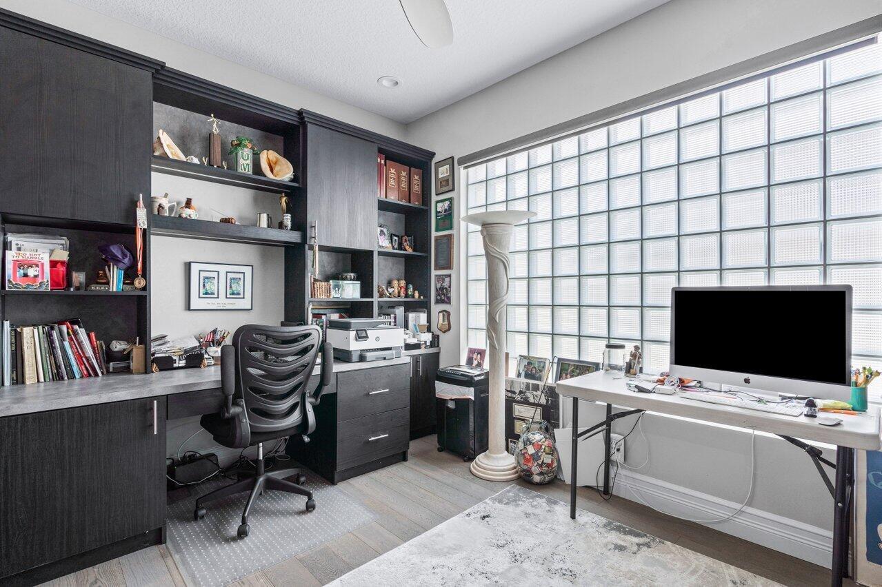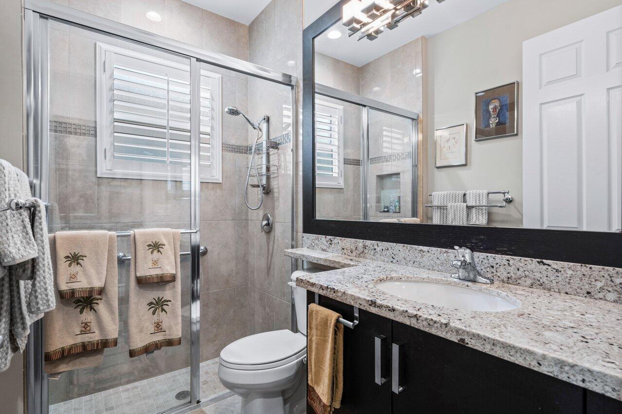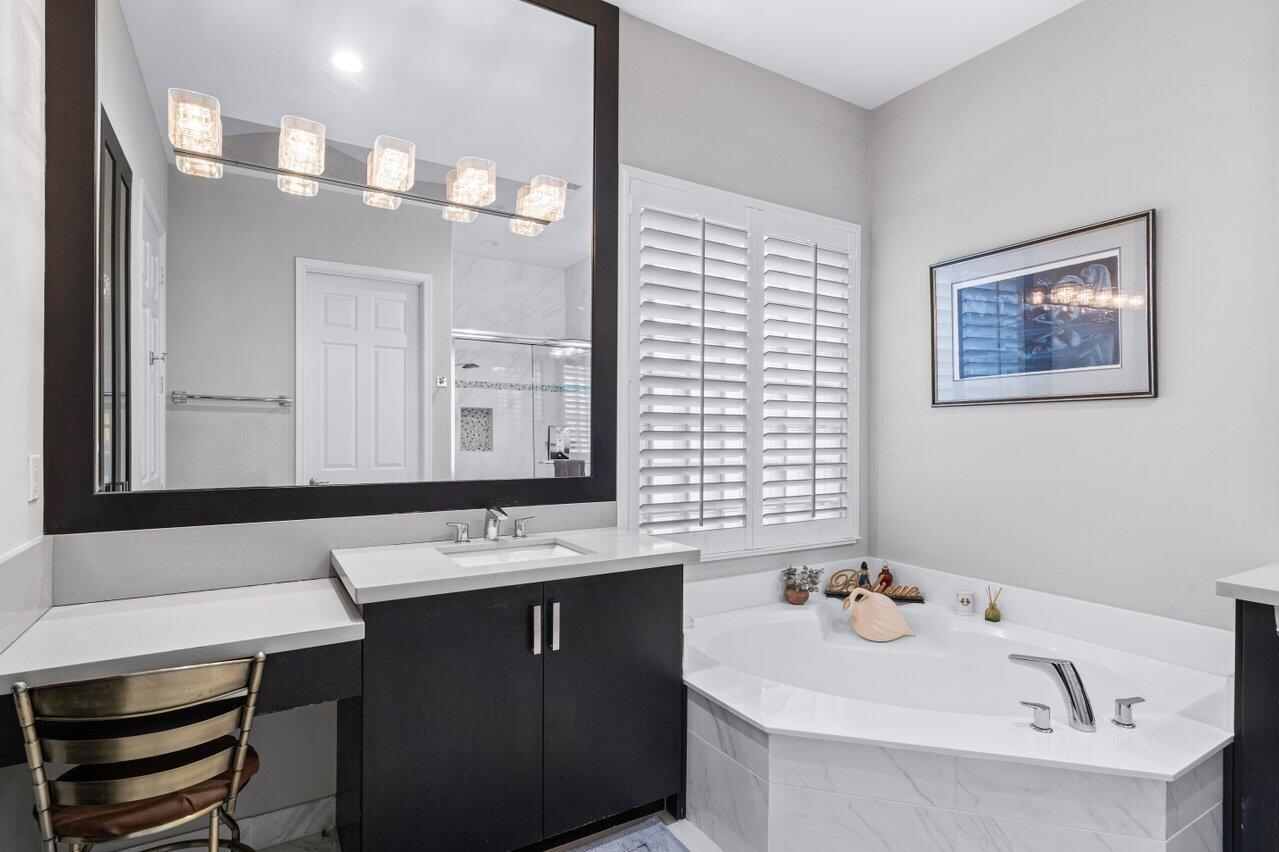 This stunning, open, and light-filled three-bedroom plus den home, featuring two and a half baths, is perfectly designed for entertaining. Elegant wood floors flow throughout, complementing the high ceilings and thoughtfully designed spaces. The impressive gourmet kitchen boasts extended cabinetry, granite countertops, stainless steel appliances, a wall oven, and a spacious seated island. Hurricane impact glass, designer window treatments, plantation shutters, premium fitted closets, custom built-ins, and LED lighting enhance the home’s beauty and functionality. Two well-appointed guest rooms and upgraded bathrooms add to its appeal. Nestled on a lushly landscaped private lot, this home is truly a must-see. Located in Valencia Cove, an exceptional 55+ community. A must see!
